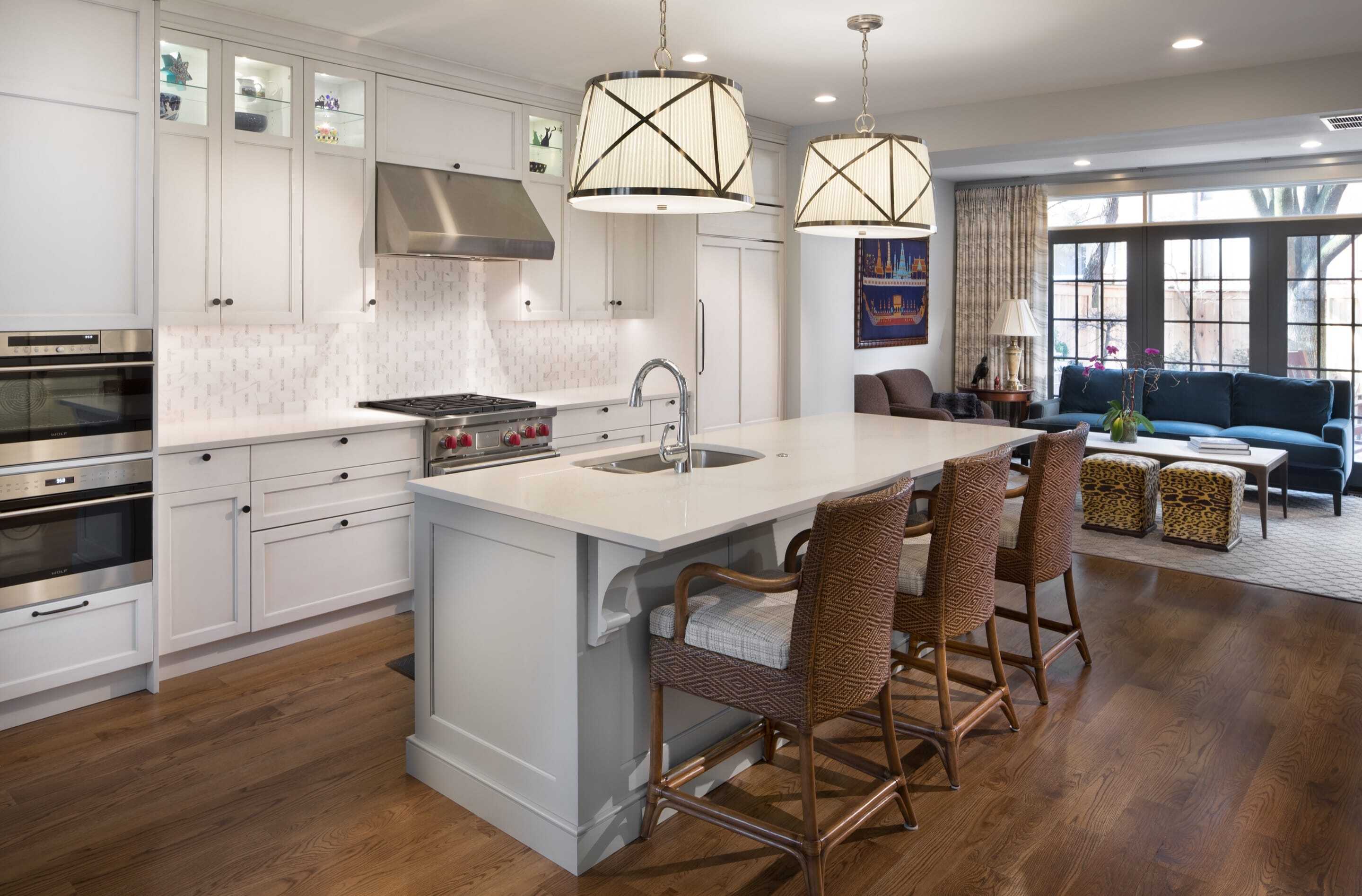 In the main bathroom, the dual highlights are the geometric accent tile in the shower, and the articulated colorful wood-framed mirrors over the double vanity. Clean white marble floor and wall tile give way to a sturdy dark vanity, with a modern custom frameless linen cabinet supplying more useful storage. The second bathroom is welcoming with soft blue glass tile in the tub/shower, and a small wicker tile pattern on the floor. For the downstairs powder room, we chose a striking wallpaper patterned with tall thin trees. The lines of the wallpaper add an illusion of height to the space, and the gilded pears give a touch of whimsy, in tandem with the lavishly ornate mirror.
