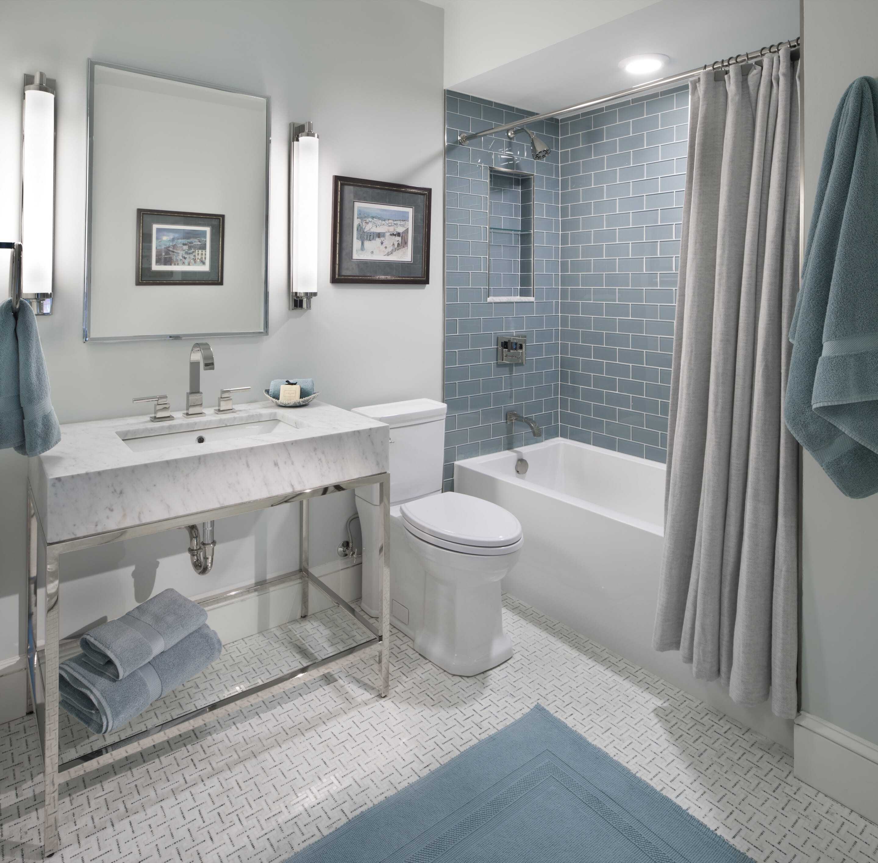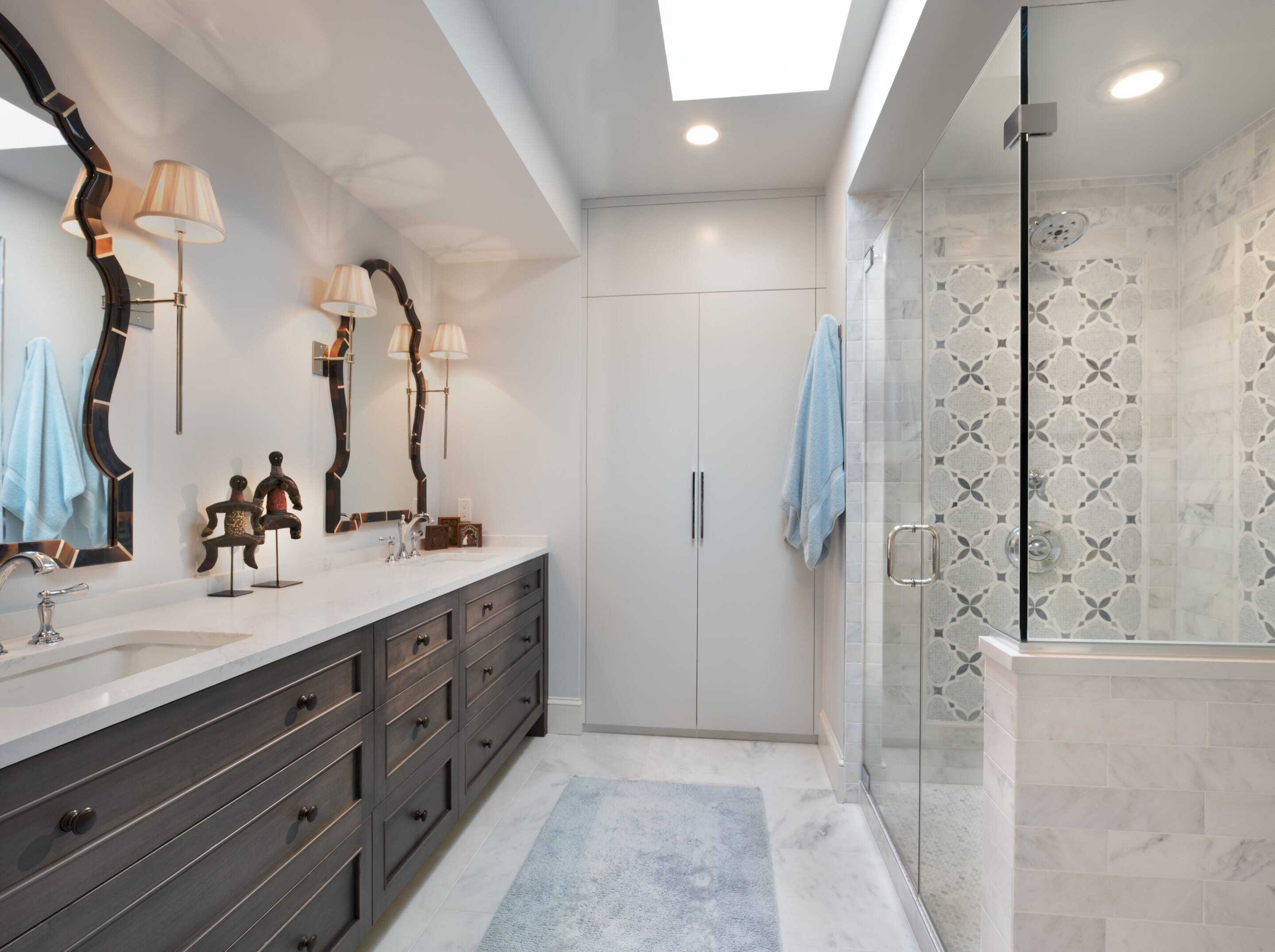We remodeled three bathrooms throughout the home. First, the main bath on the second floor, connected to the spacious primary suite, in which we opted for an elegant, elongated design with a large standing shower, double vanity, and linen closet on the far wall. For the secondary bath upstairs, we chose a traditional layout with a tub and shower, and an open vanity with a smooth marble countertop. Finally, the powder room on the first level is nestled in a small hallway. We took advantage of the narrow space with a tiny but practical wall mounted sink. A large ornate mirror further helps to extend the feel of the interior.