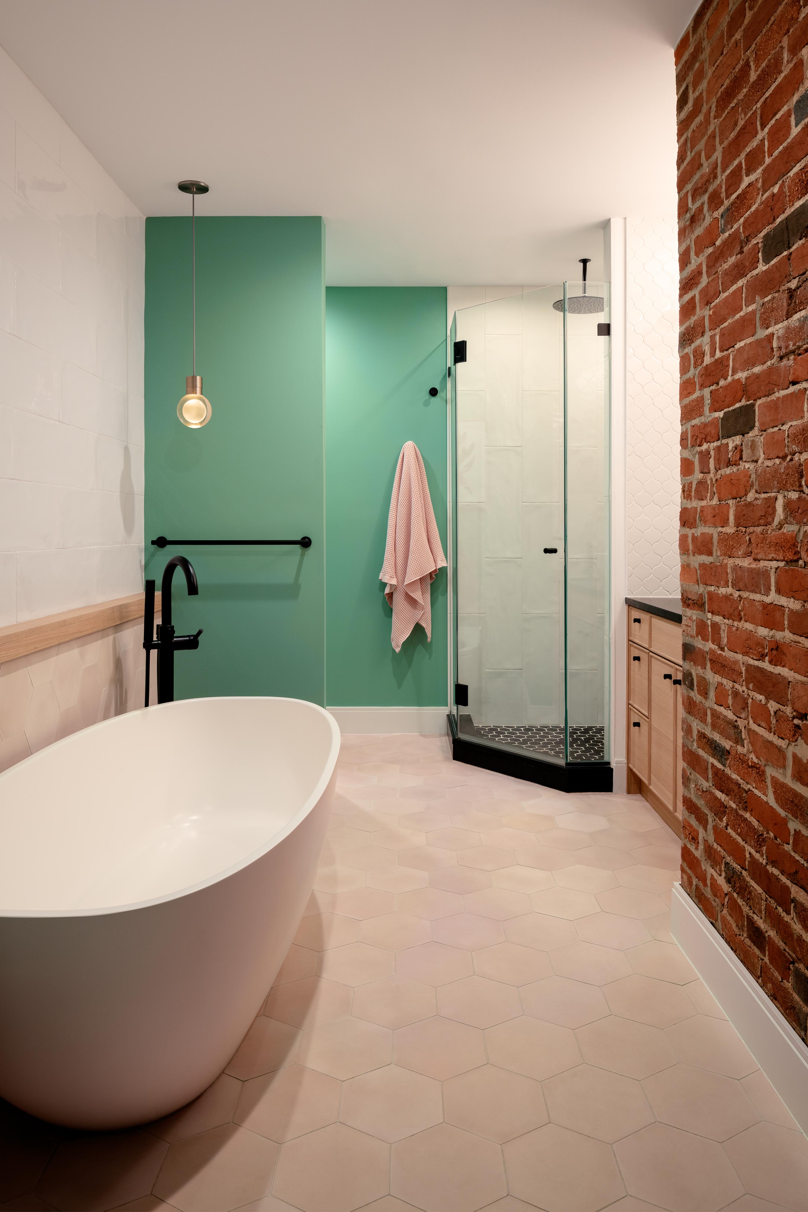 Working with limited space, we were able to achieve a clean modern bath while preserving elements of the original house. The exposed original brick opposite the soaking tub contrasts the angular lines of the rest of the bath. Tucking the vanity between the brick and shower helped keep the floor open, showcasing the hexagonal floor tile. A teal rear accent wall elegantly hides the toilet, complementing the red brick and framing in the tub.