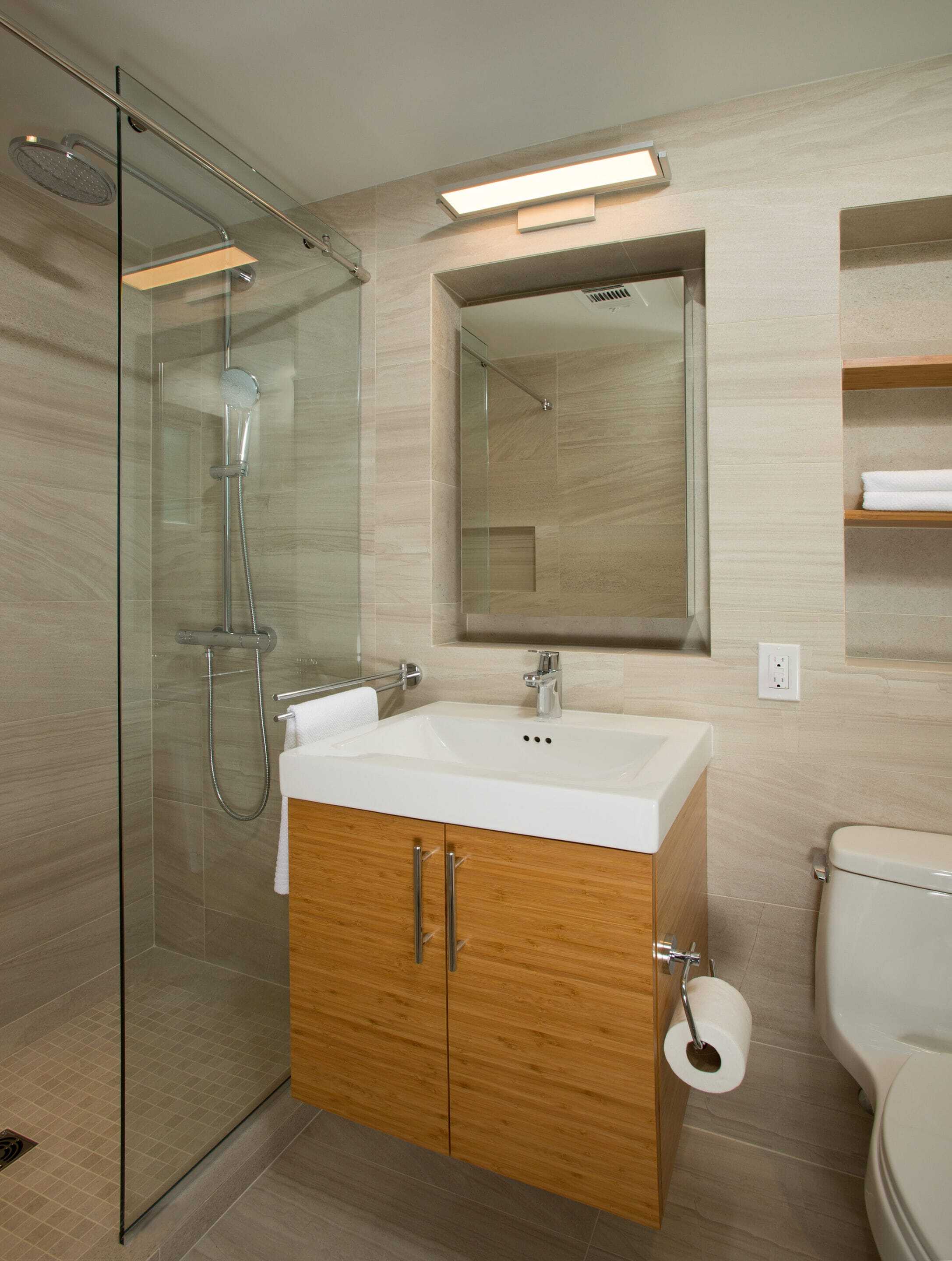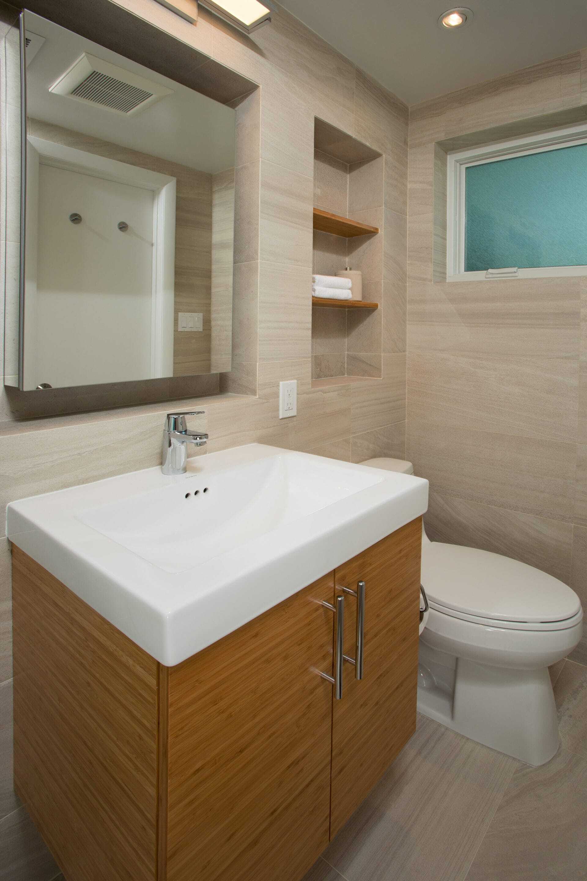 The guest suite bathroom received a fully tiled treatment to all four walls. The clients opted for a soft, warm white, large format tile that simulated the beautiful variance in natural stone. Dual niches and the window were mitered to create a clean, modern space, and bamboo cabinetry and shelving gave a nod to zen-like tranquility.