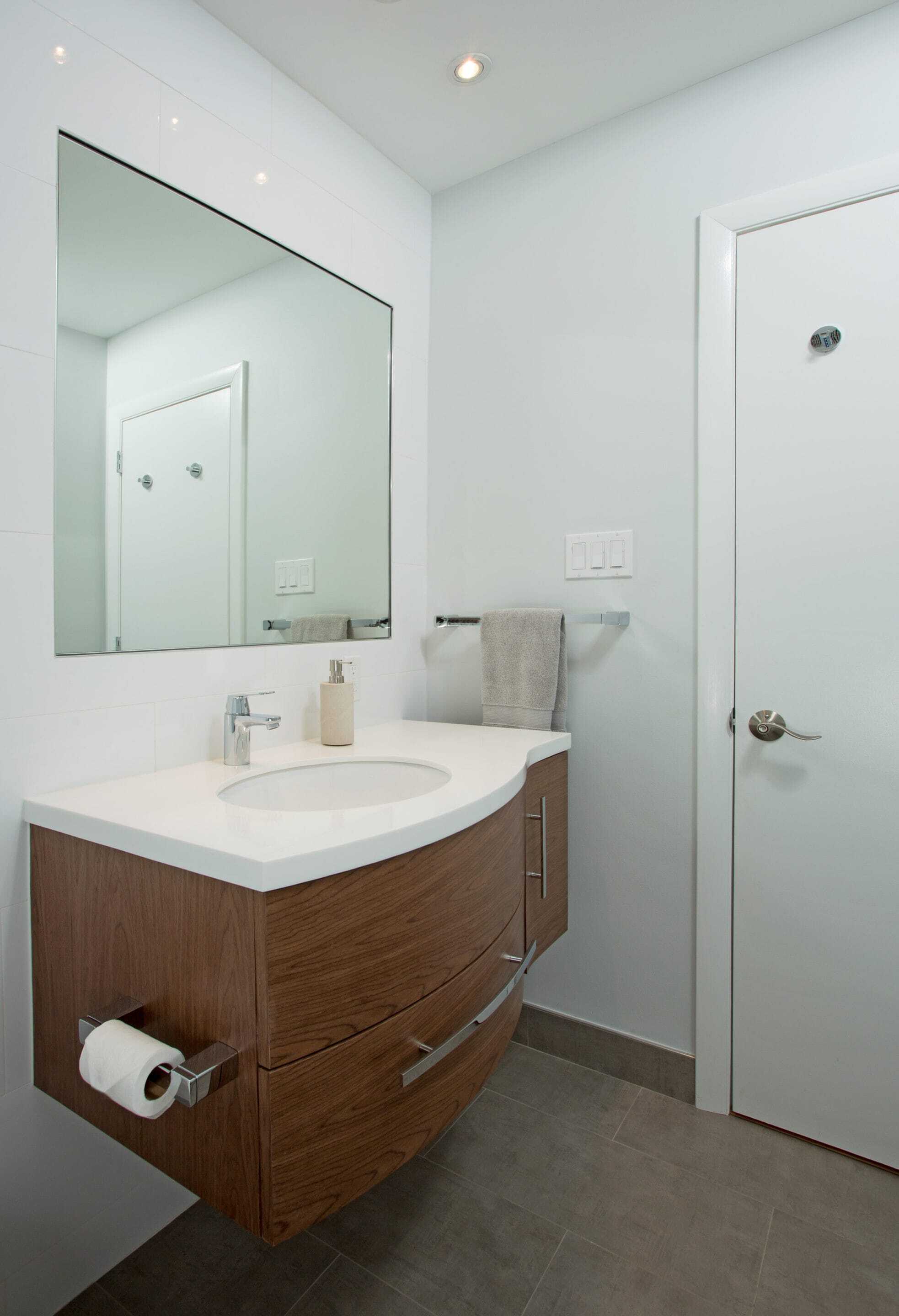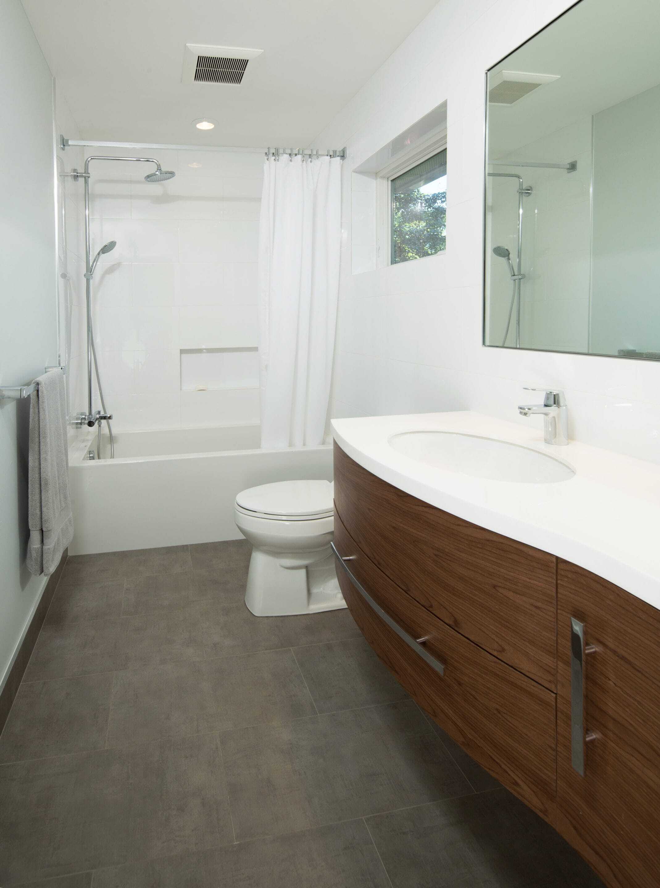 The kids’ bath received a new, deep tub and large format white tiles along the tub walls. The tile continued, floor-to-ceiling, behind the toilet and vanity wall as well. To maintain a minimalist look, we mitered the tile around the window on this wall as well and inset a large, frameless mirror into the tile itself. Foregoing a traditional lighting fixture, three small recessed puck lights were added above the vanity, and soft, grey tiling was used on the floor and as the baseboard. Finally, a curved, floating, walnut cabinet brought just the right amount of warmth and roundness to what may have otherwise been considered a stark space.