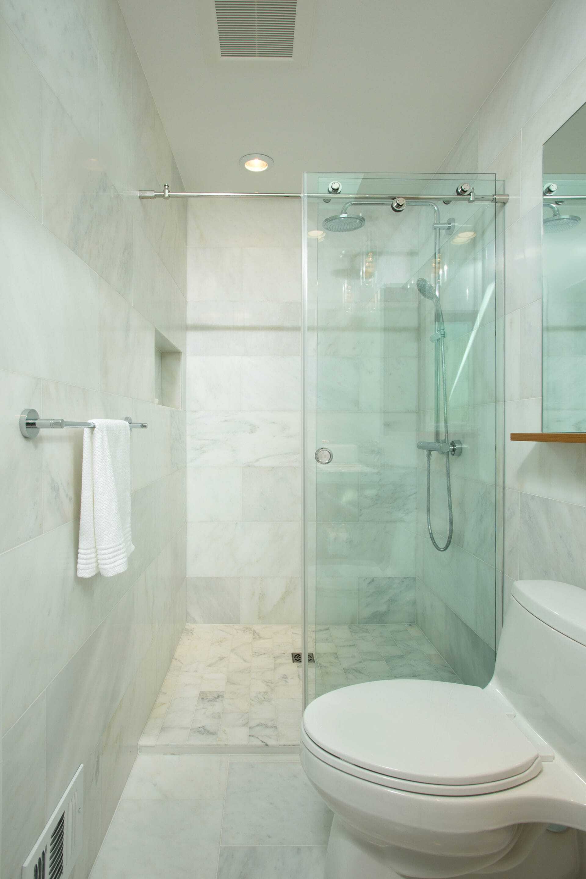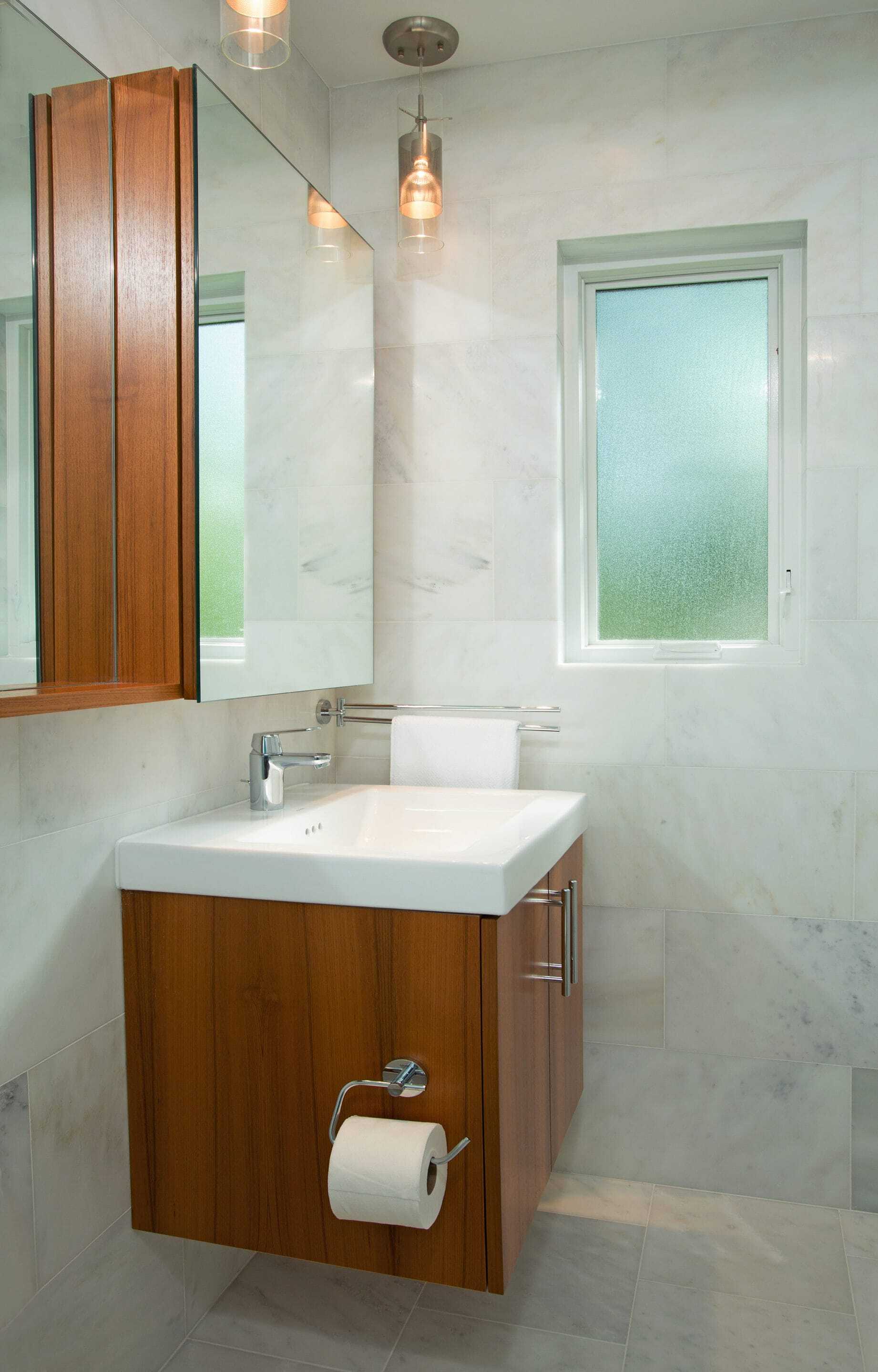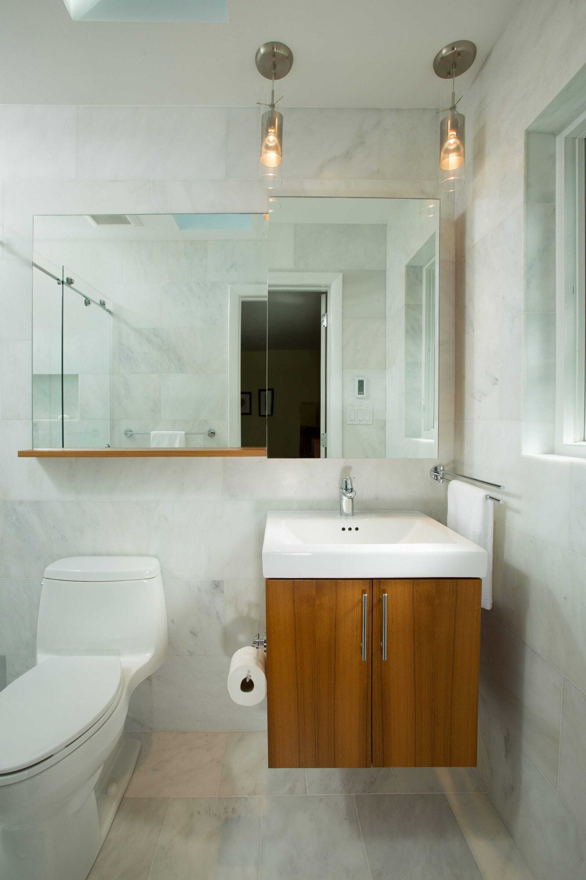 Finally, the master bath was fully tiled in a honed Calacatta marble. Large format, 12x24″ tiles were used on all four walls, 12x12″ on the main floor, and 4x4″ in the shower. Teak cabinetry picked up the faint, golden veining throughout the stone and an additional large mirror extending from the vanity above the toilet increased the feel of the size of the space. A skylight was centrally placed allowing light to flood into the shower and over the sink vanity. Two Moorish glass mini-pendants flank the vanity mirror providing an additional lighting source. And the blow dryer request? We modified a 7″ deep teak wall cabinet into a medicine cabinet by partially recessing it. An outlet was added to the interior of the cabinet thus allowing the client to leave her blow dryer plugged in and easily pulled out each morning during her daily routine.