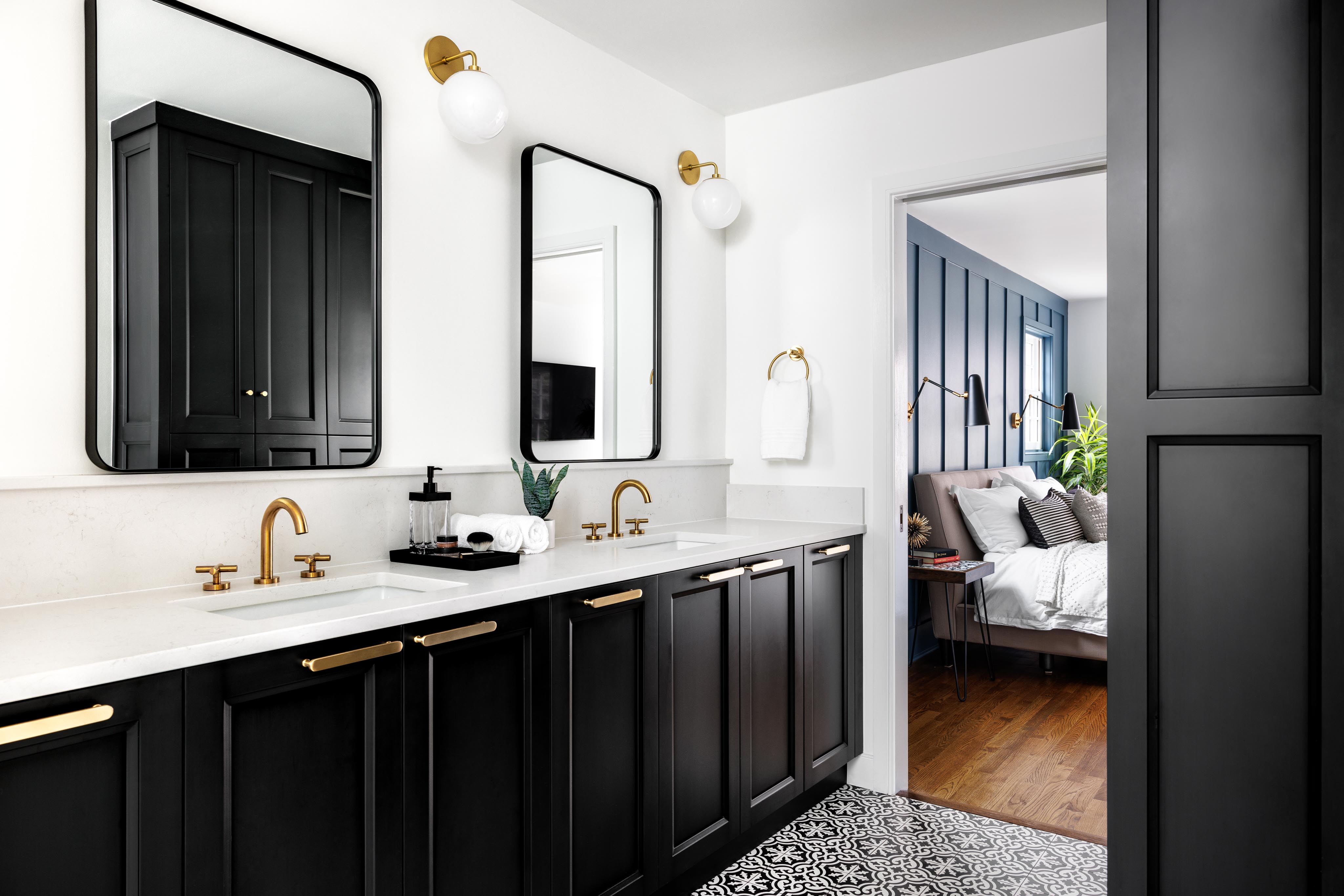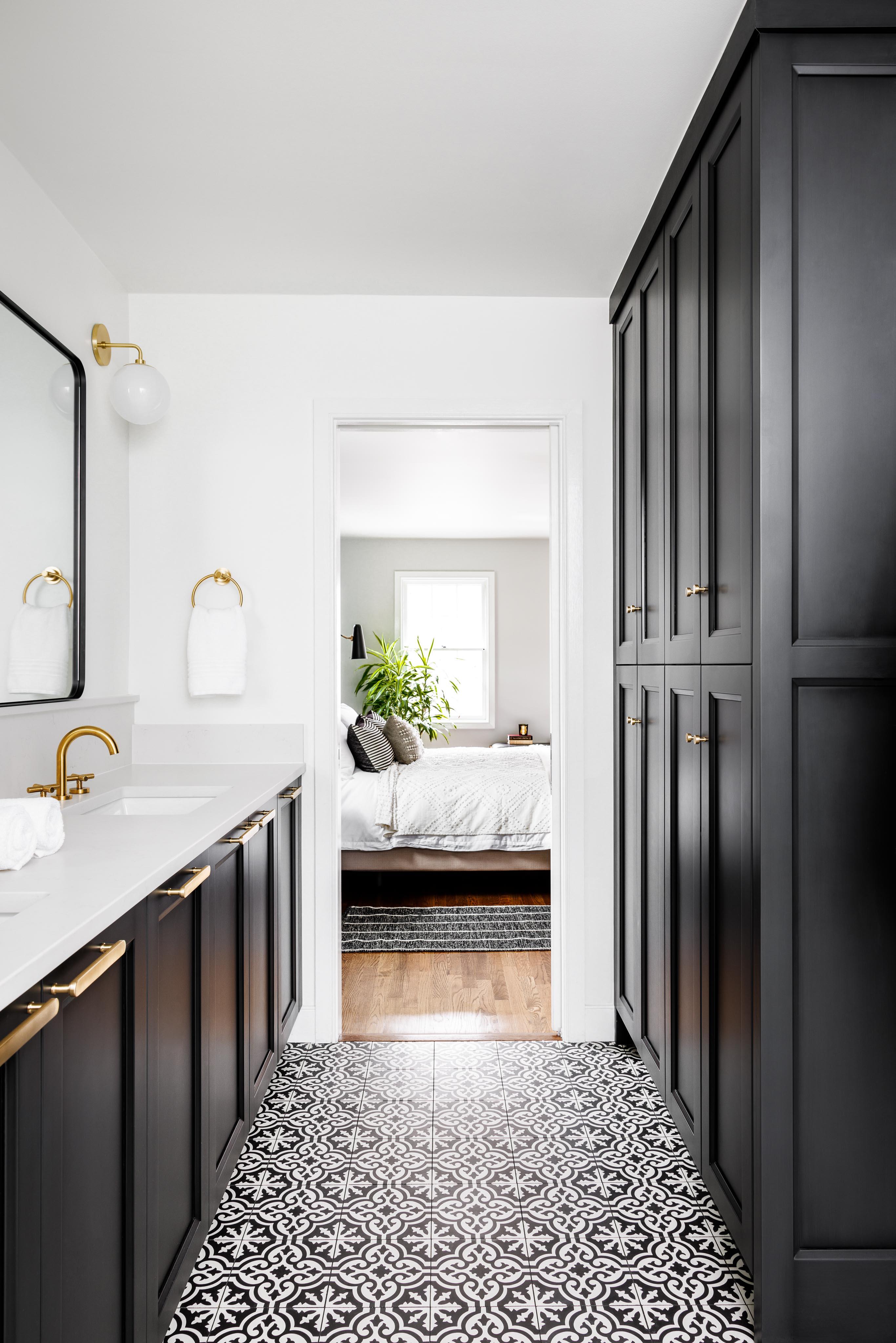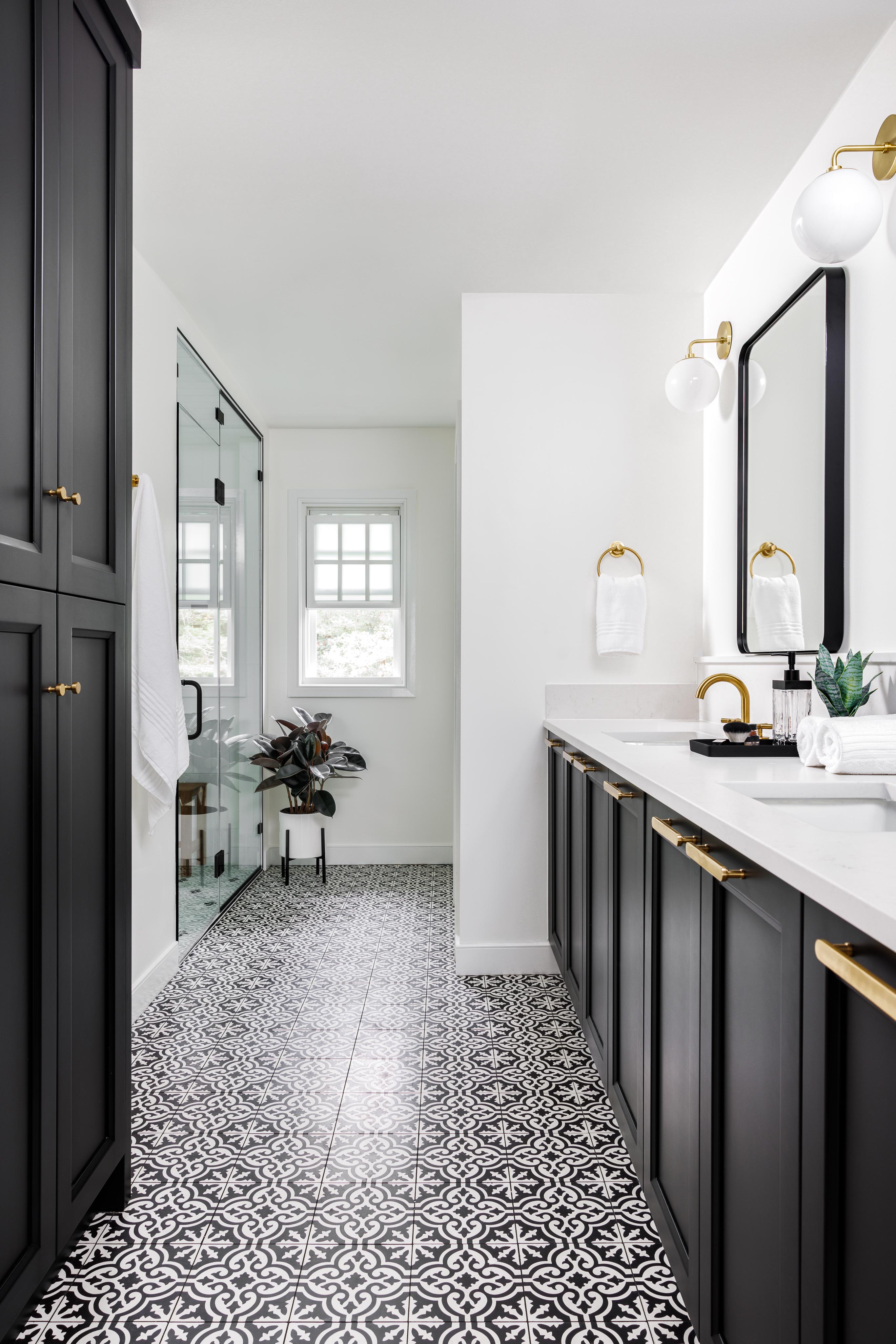 Our clients wanted a bold patterned tile to be the highlight of their bathroom–so from that tile we took the rest of our design cues. We embraced a design philosophy centered around bold, patterned tiles, which guided our selection of sleek black cabinetry, pristine white countertops, and brass fixtures to encapsulate elegance. The interior of the wet room is bathed in natural light through a strategically placed window, illuminating the intricate mosaic of black and white floor tiles and vibrant ceramic tiles on the walls. The coherence in design extends to the hallway bathroom, maintaining the black and white motif with consistent tiling, matte black accents, and a sleek floating vanity. In the master bedroom, we crafted a distinctive focal point with a deep blue accent wall, complemented by refined wainscot detailing for a layered and sophisticated look.
