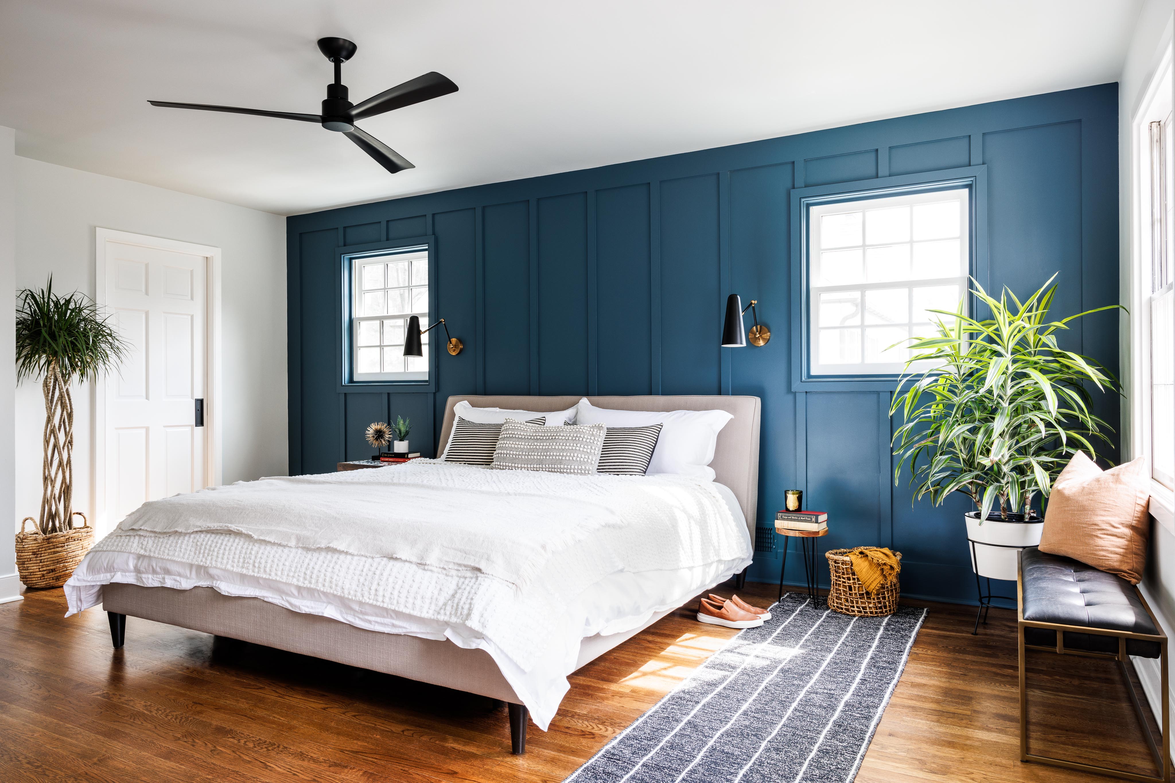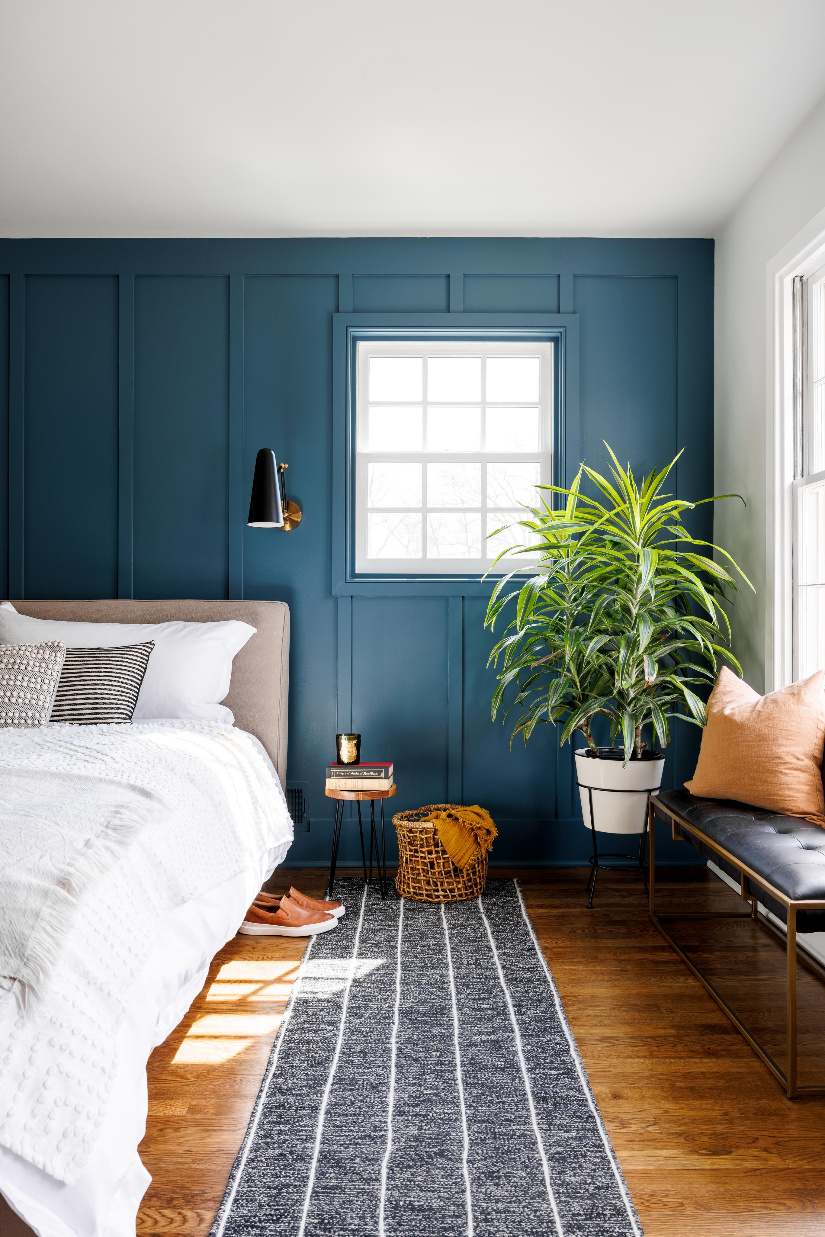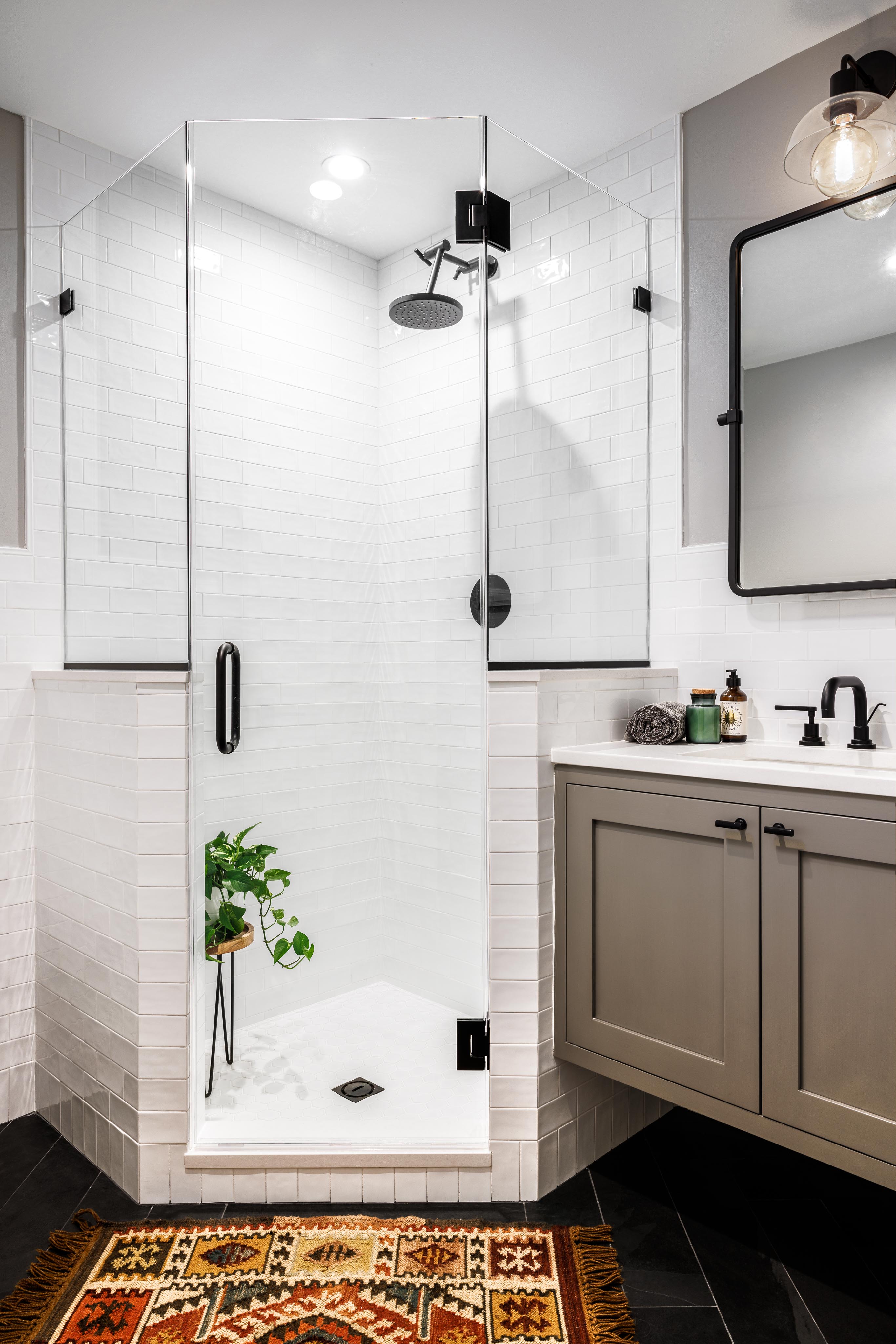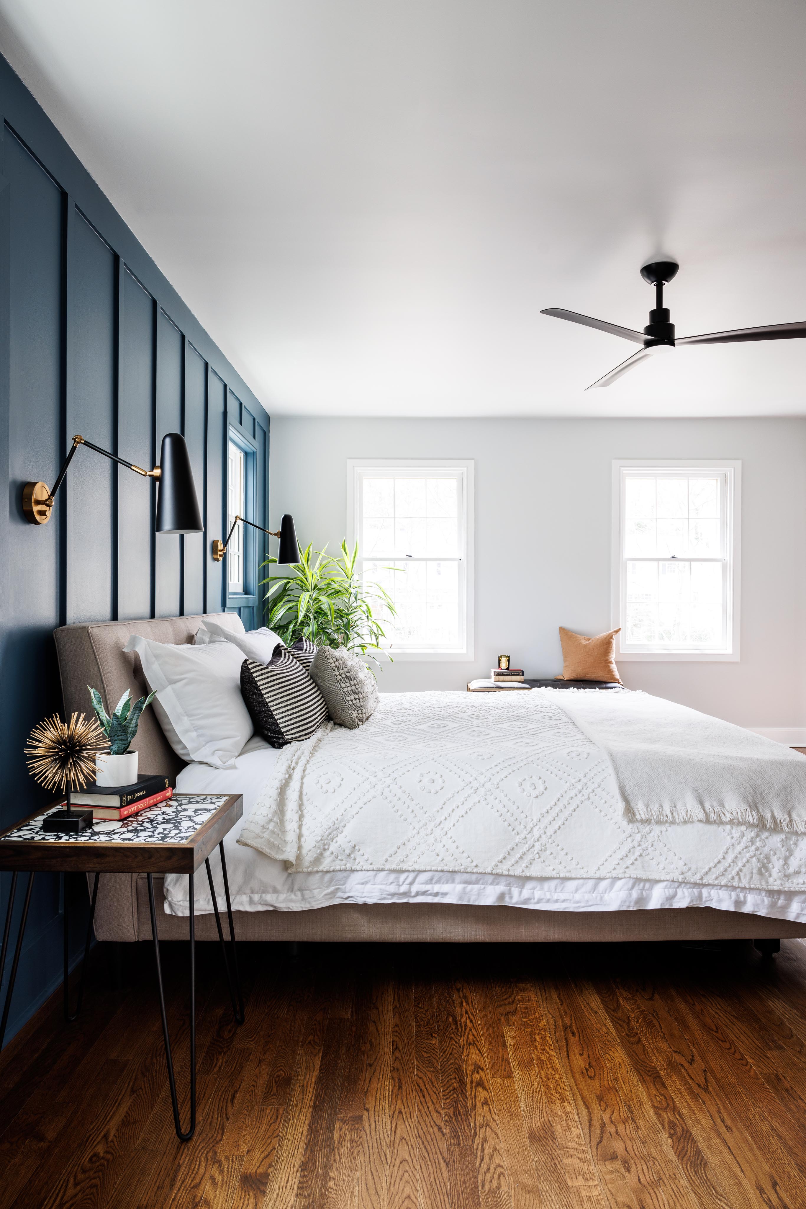 Our clients wanted a bold patterned tile to be the highlight of their bathroom–so from that tile we took the rest of our design cues. We embraced a design philosophy centered around bold, patterned tiles, which guided our selection of sleek black cabinetry, pristine white countertops, and brass fixtures to encapsulate elegance. The interior of the wet room is bathed in natural light through a strategically placed window, illuminating the intricate mosaic of black and white floor tiles and vibrant ceramic tiles on the walls. The coherence in design extends to the hallway bathroom, maintaining the black and white motif with consistent tiling, matte black accents, and a sleek floating vanity. In the master bedroom, we crafted a distinctive focal point with a deep blue accent wall, complemented by refined wainscot detailing for a layered and sophisticated look.