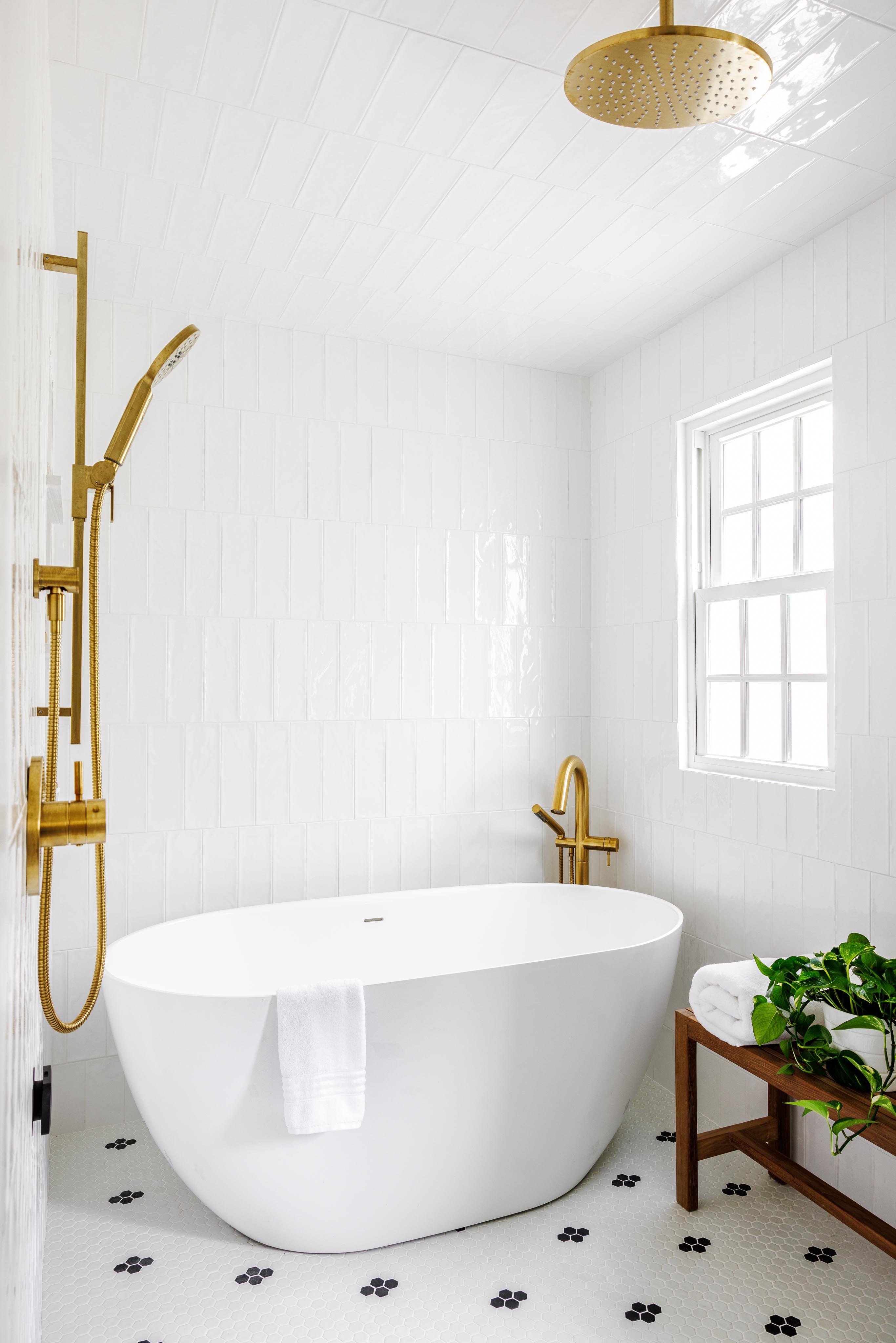 In the primary bath, removing the existing walk-in closet gave us room for floor-to-ceiling custom cabinetry, for linens and clothes. We strategically positioned a spacious wet room at the rear, featuring a generously sized soaking tub, a rain shower head along with a wall-mounted shower arm, and a steam vent to craft an indulgent retreat. For the hallway bathroom, we opted for a sleek, oblong pentagonal shower in the corner, supported by two sturdy half-walls wrapped in matching tiles for enhanced durability and visual coherence. In the master bedroom, we achieved a harmonious balance by duplicating the existing window, thus establishing a well-proportioned wall that contributes to the room’s orderly appearance.
