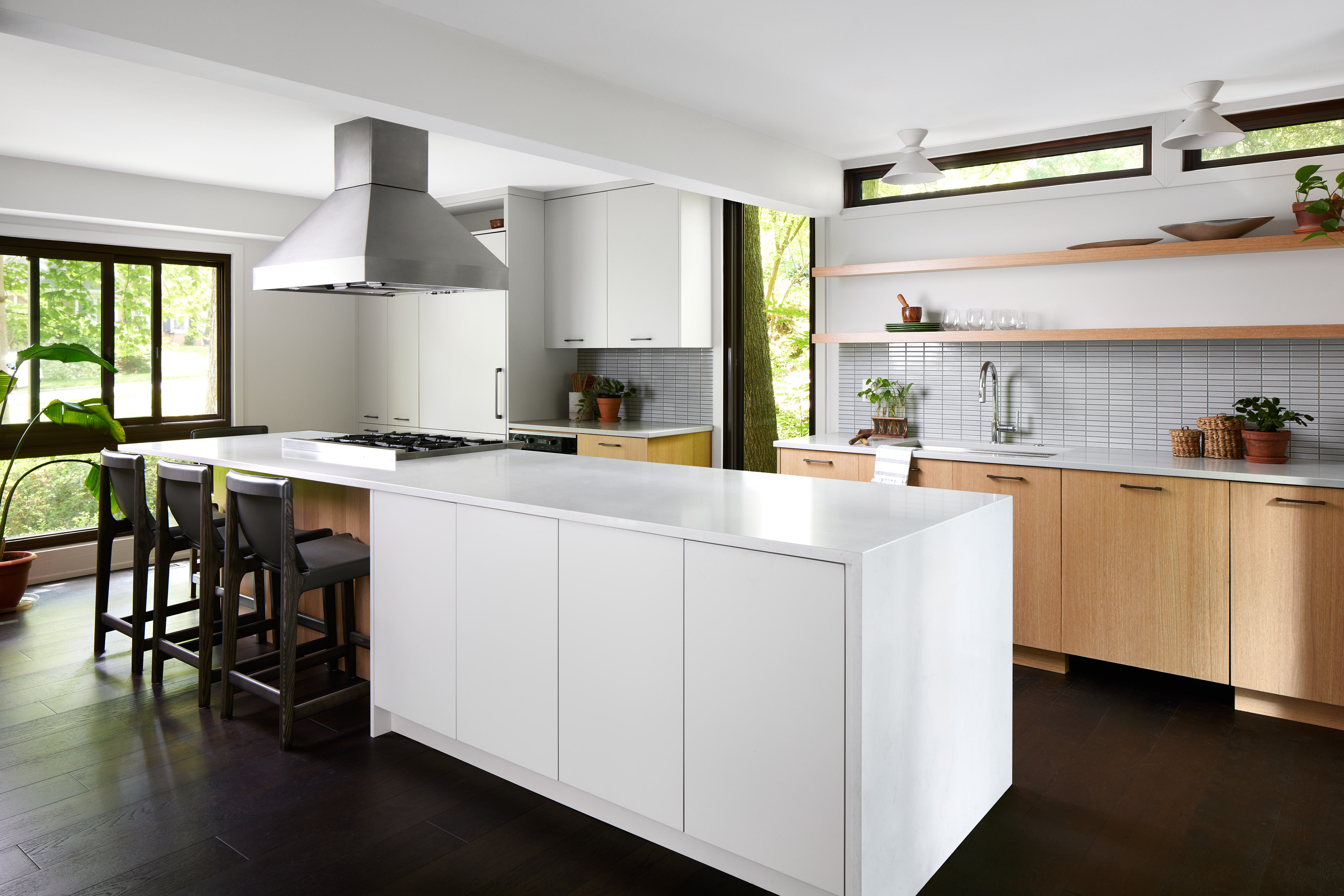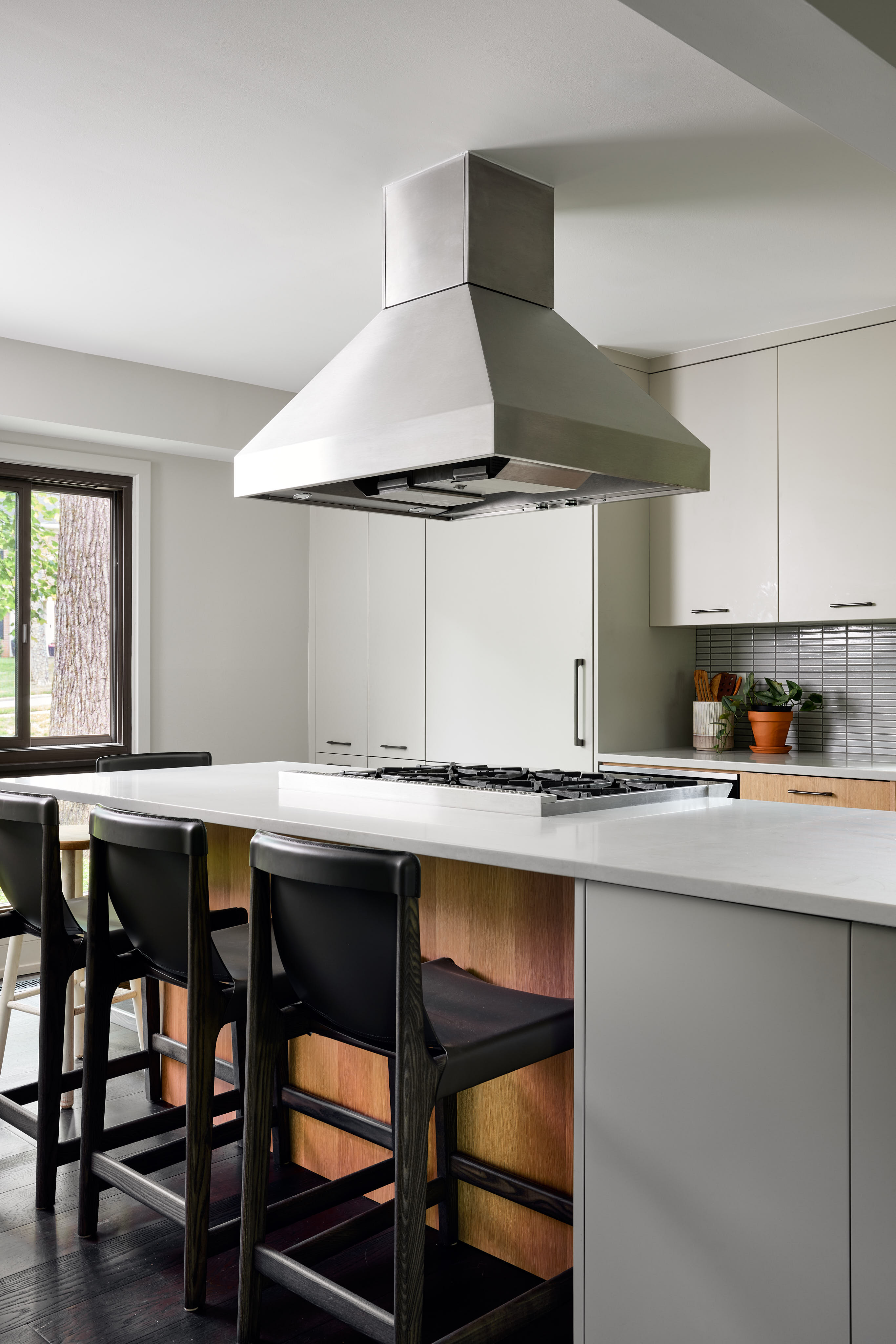 In order to achieve the larger kitchen and dining room, we relocated the kitchen from one side of the house to the other, allowing it to span the full length of the home, and open seamlessly into the dining room. We added a butler’s pantry opposite the open dining room, for easy storage of extra table settings and linens, and worked in a built-in cabinet nook for a wine bar and additional storage space. We worked in an industrial hood hanging from the ceiling, over the range installed in the island. Opposite the range, a breakfast bar made space for informal dining. Two floating oak shelves over the sink added room for extra storage, as well as acting as a complementary highlight alongside the oak cabinets.