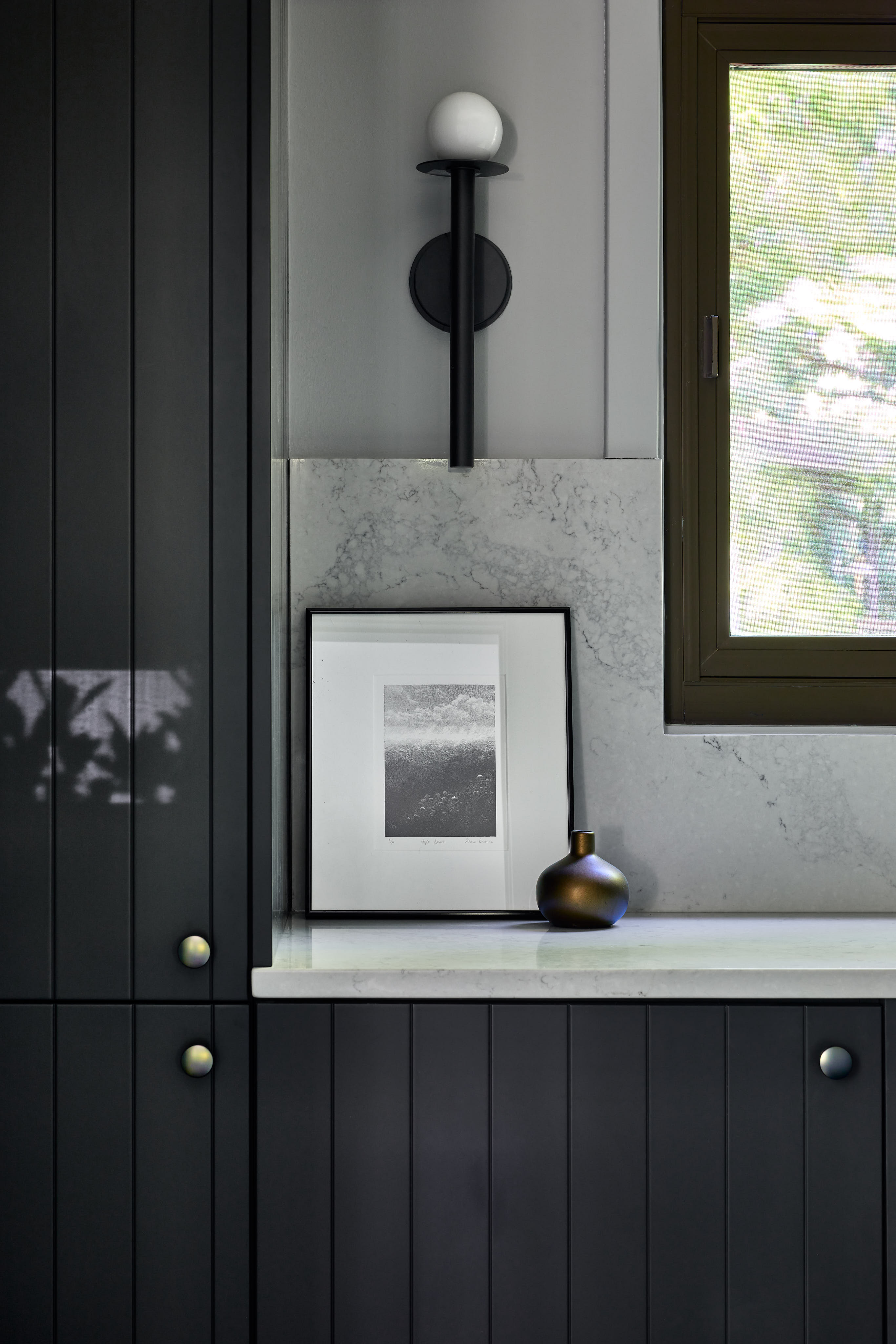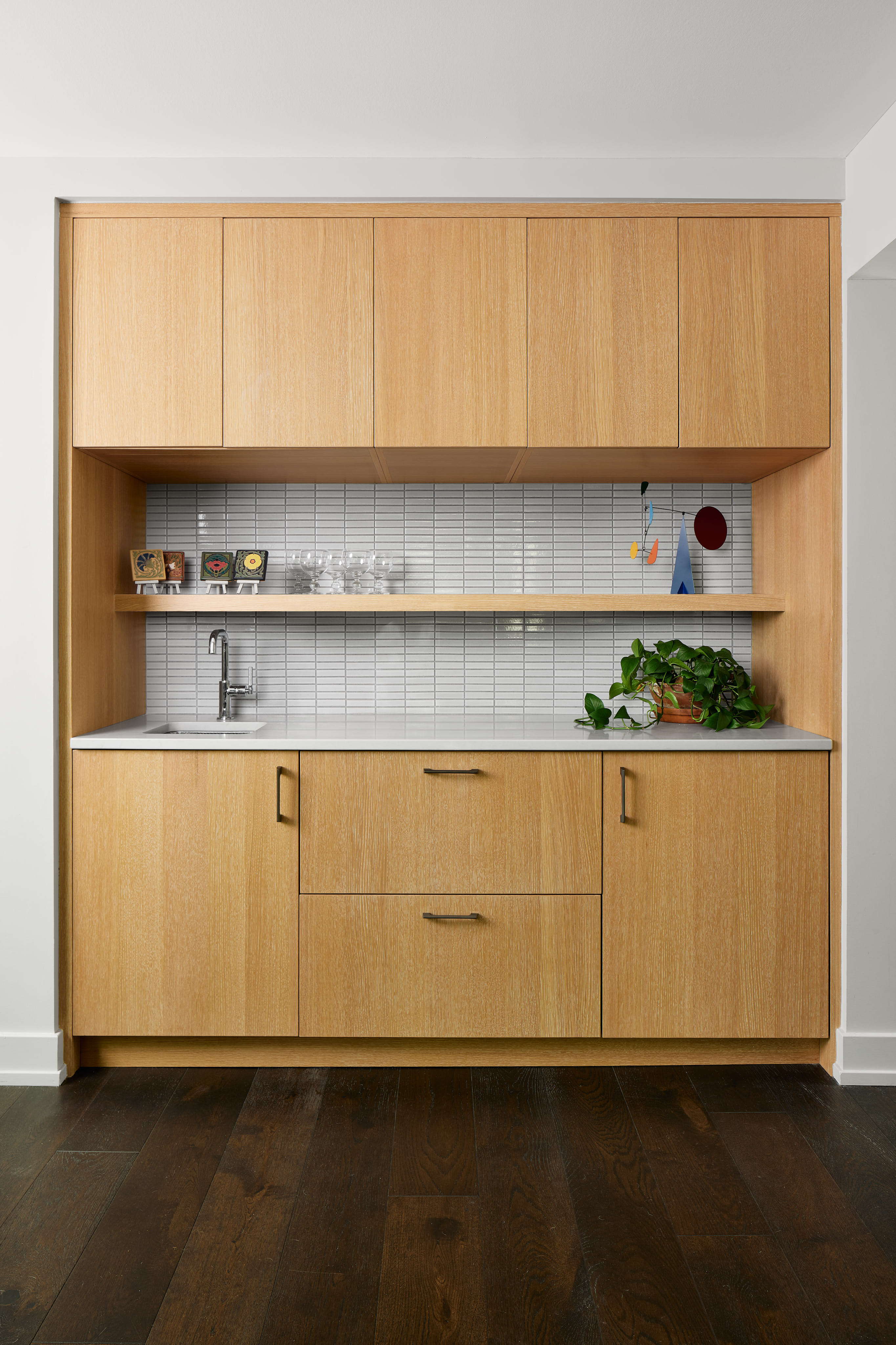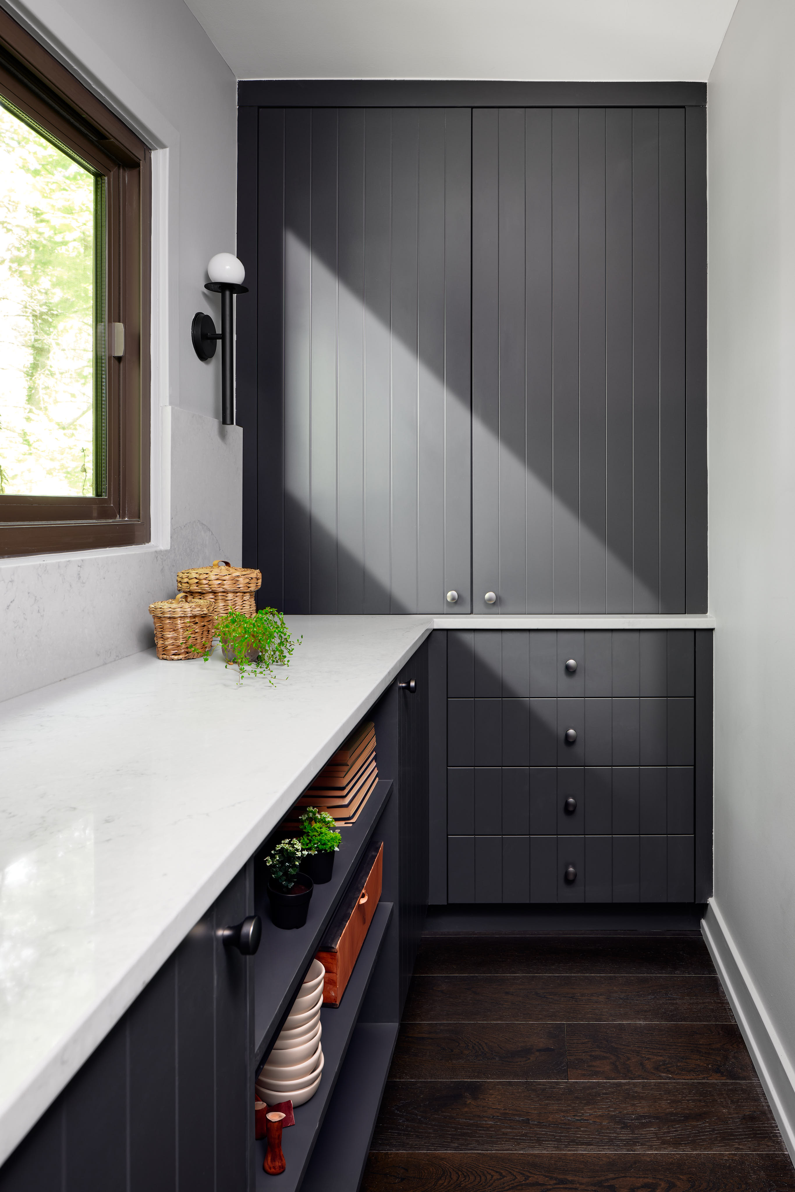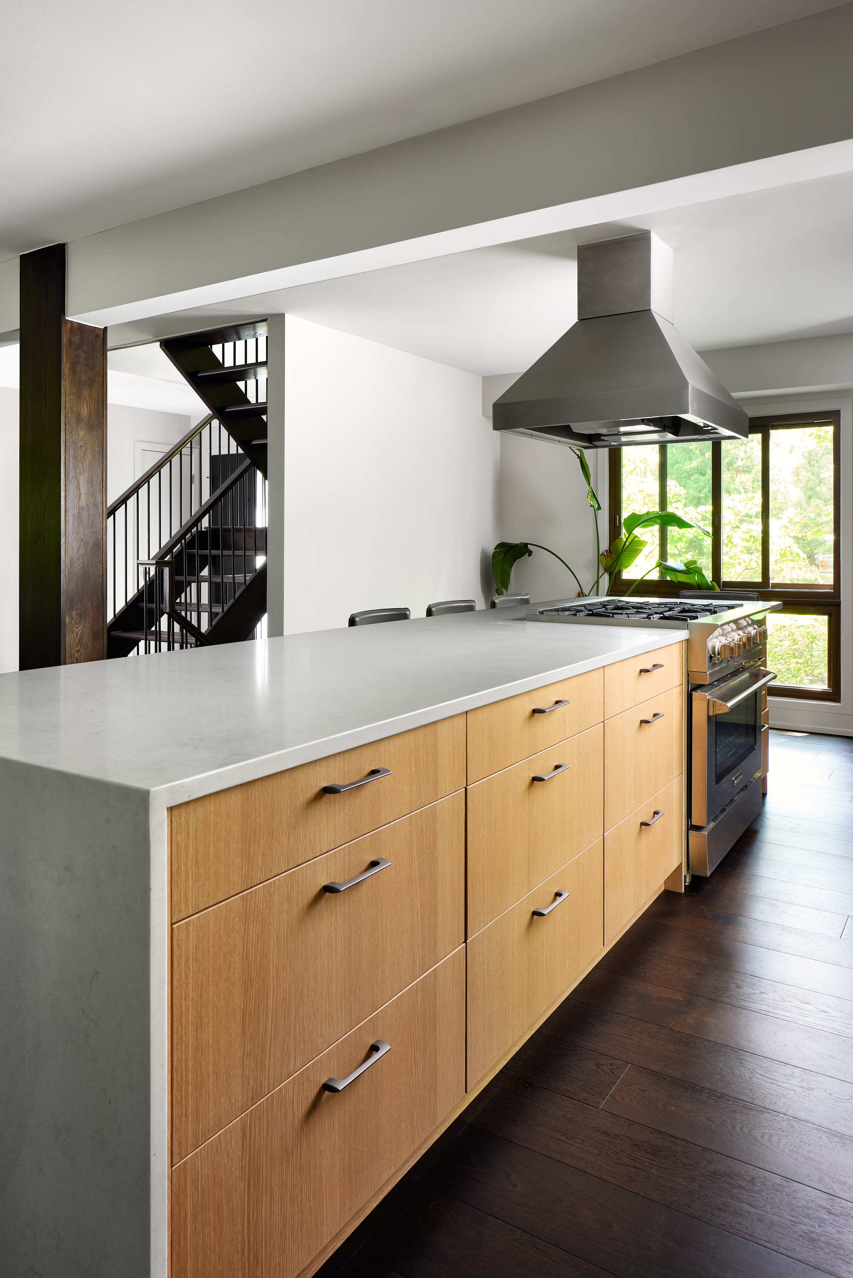 Our clients preferred a modern theme with natural finishes. We relied on natural wood throughout, from the kitchen cabinets to a clad structural pillar, to conjure warmth in the space. Other cabinetry in off-white kept the palette light, without tending towards the austerity or starkness of a sharper white. In the butler’s pantry, we opted for dark blue statement cabinets and panels. We finished the mudroom with natural soapstone, and used soft quartz for the kitchen countertops.