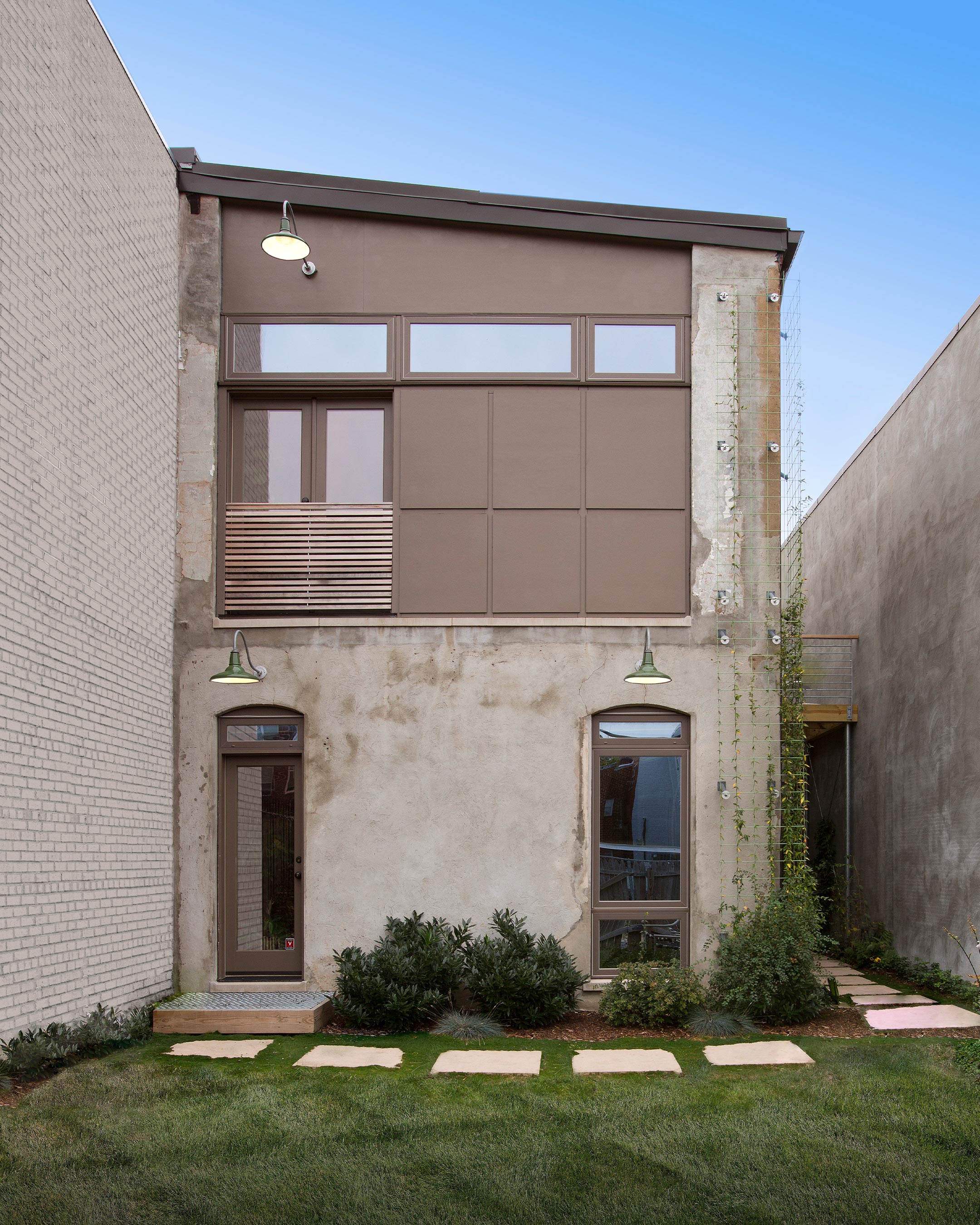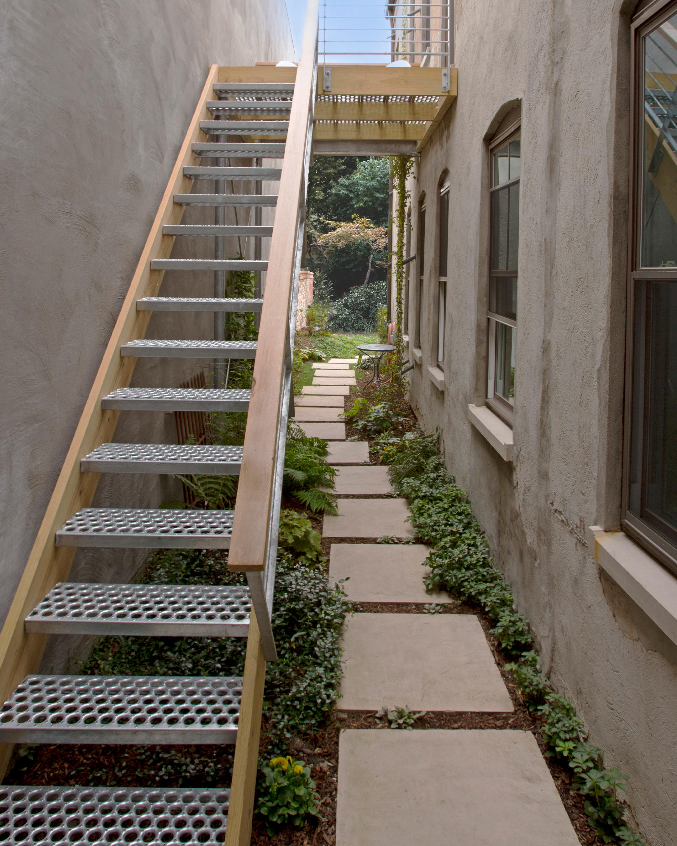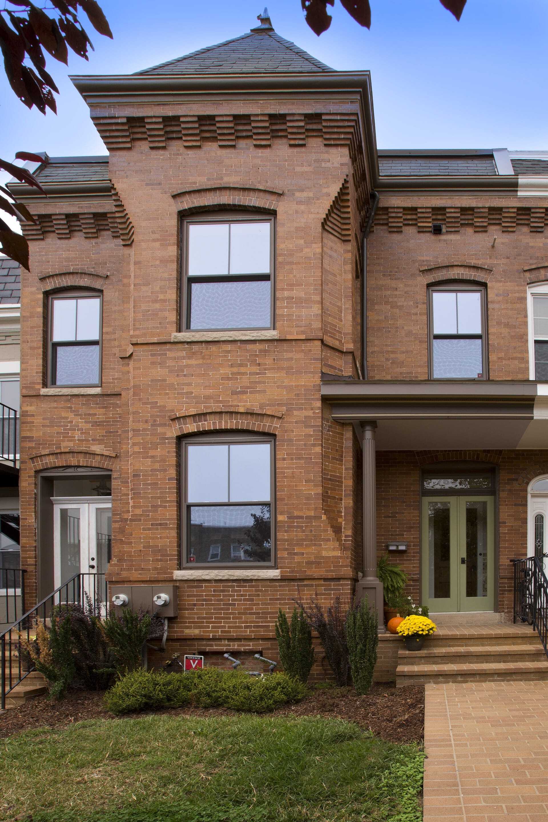 With the exception of the floor joists towards the front of the home at the second floor, the house was fully gutted to the exterior walls. The pier footings were rebuilt, exterior foundation reworked, and new floors framed at both levels. Because the existing ½”, lead water supply line was out of compliance, it was necessary to replace this with a 1” copper line from the curb stop to the home. This is never a straight forward task, and became even more complicated when the Washington, DC Water and Sewer Authority and Miss Utility were unable to locate the curb box. This left us little choice other than to systematically dig up the entire front yard until we found the box. The electrical service required a “heavy-up”, and needed to be separated for each unit. All new plumbing, electrical wiring, and HVAC ducting was installed, along with a new roof. The bricks around the entire exterior were re-pointed, new concrete-cast window sills installed, and new windows and doors installed throughout. Because this renovation involved a full gut and rebuild, we had the opportunity to create an air tight envelope (while allowing adequate ventilation for equipment) in the interest of energy conservation. This was accomplished by using a combination of open-cell and closed-cell spray foam, rigid foam and batt insulation. In addition to sealing the buildings envelope, we insulated between floors and at interior walls in the interest of sound proofing. Once the remodeling was complete, we turned our attention to the rear yard, which required a significant dig-out, and new landscaping.