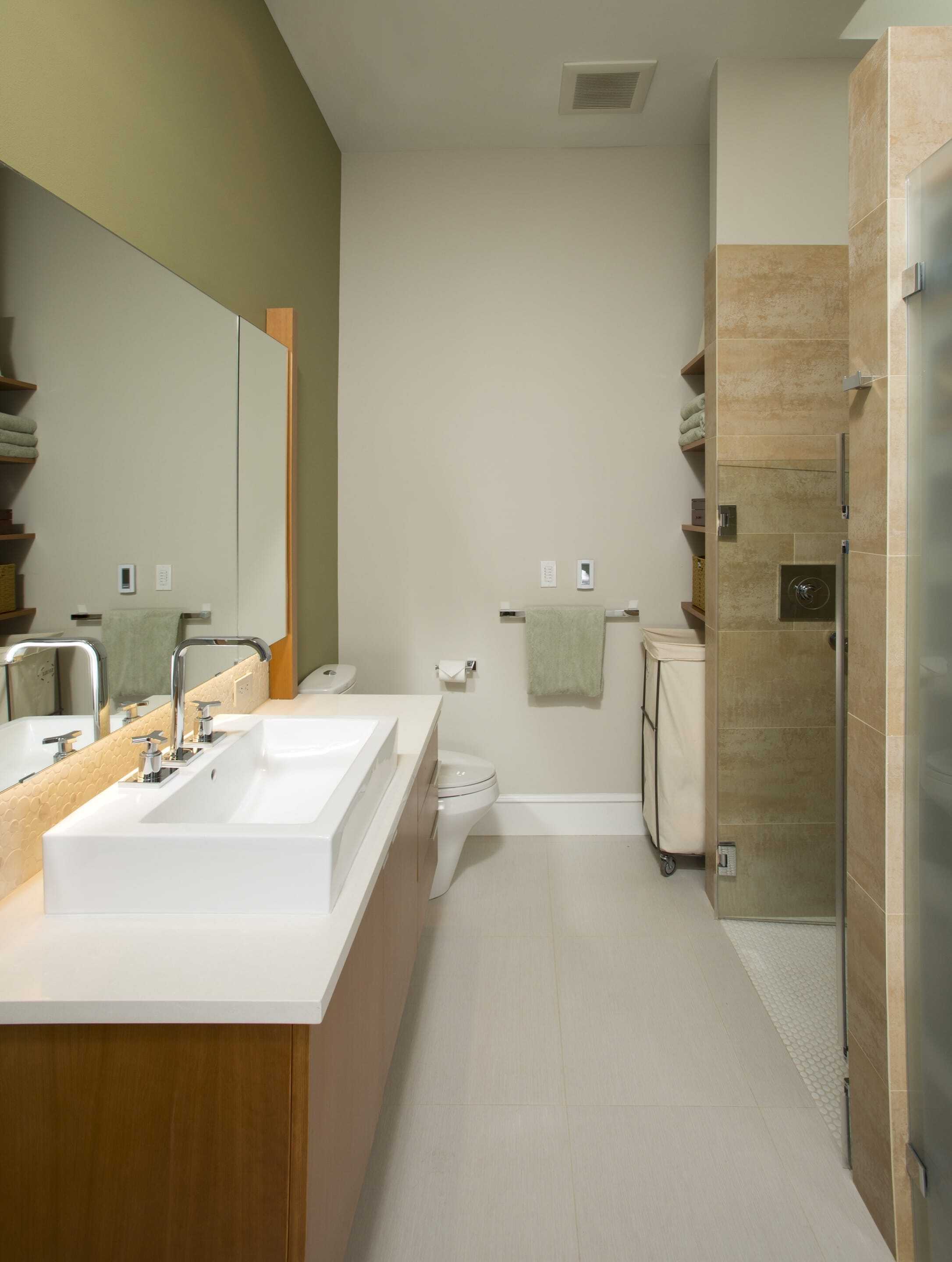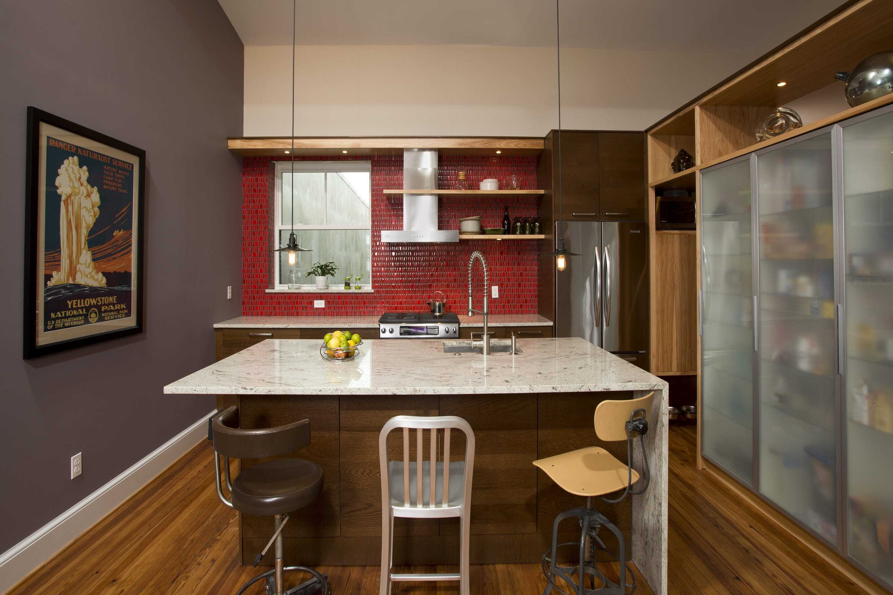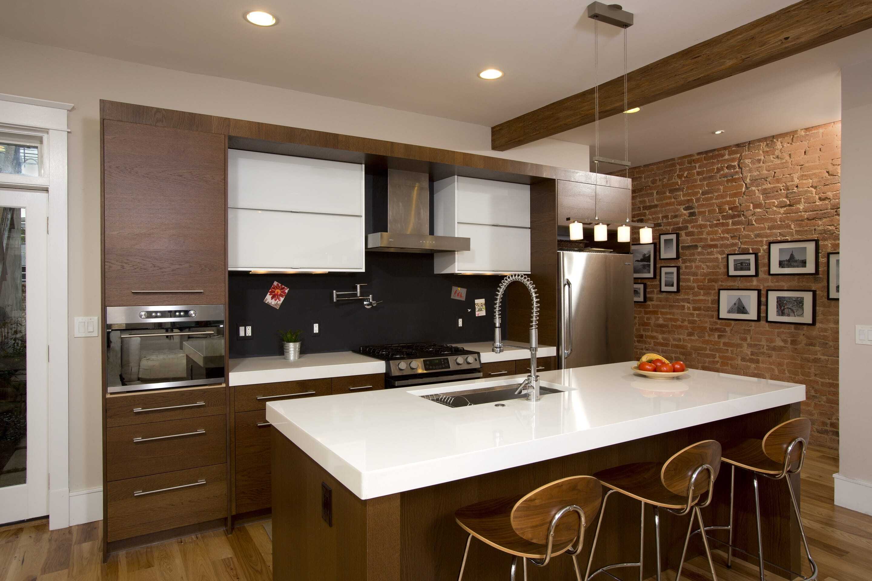 The goal of our design team was to create similar floor plans at both levels to include a kitchen, two full bathrooms, one powder room and three good sized bedrooms. The front of each unit where the kitchen and living room are located remained open, with the option of informal seating at the kitchen island, or formal dining at a large side table. The rear yard is shared, so access from both units was important. Because of the magnitude of the remodel, we were able to work in details such as curb-less shower stalls and reorient exterior door openings. Maximizing lighting at both levels (natural and artificial) was also important. Large skylights were specified at the second floor, and a tasteful combination of general, task and accent lighting were spread throughout the kitchen, living room, hallway and bedrooms. To take advantage of the high roofline at the front of the home, we vaulted the ceiling and installed an elevated loft space at the second floor.