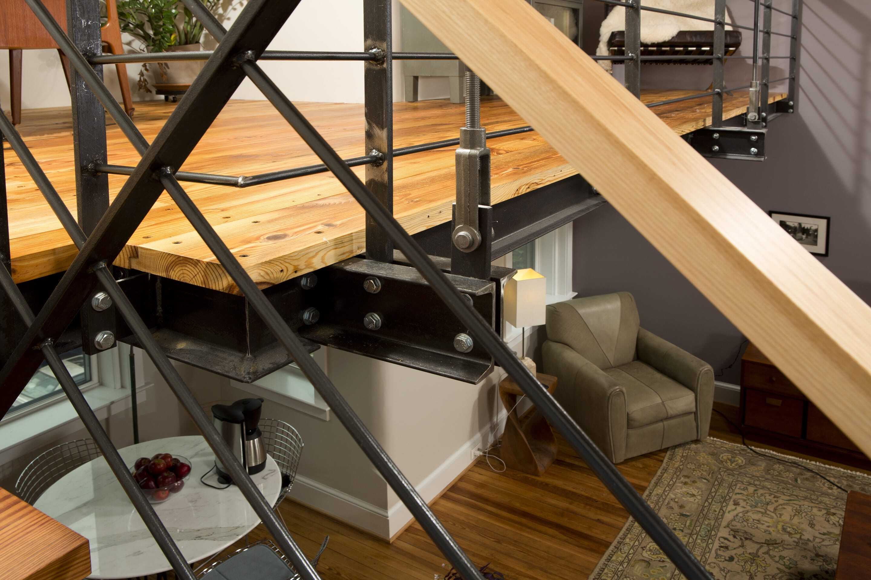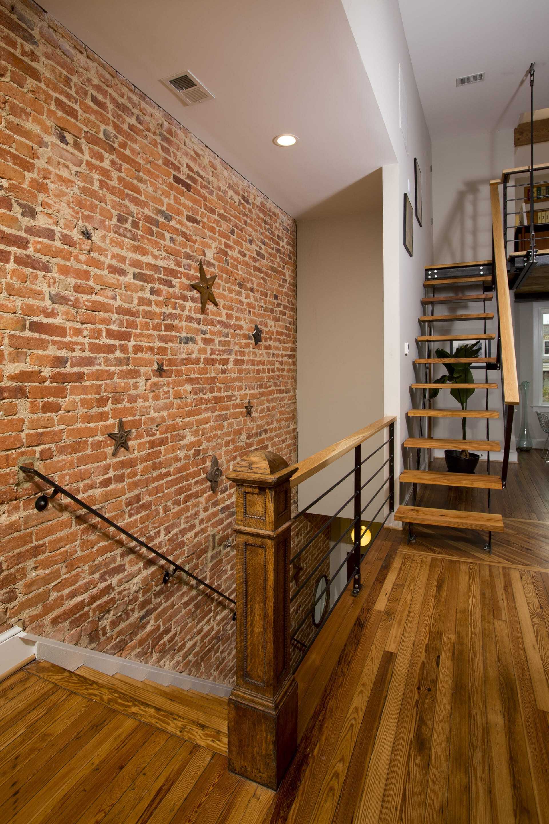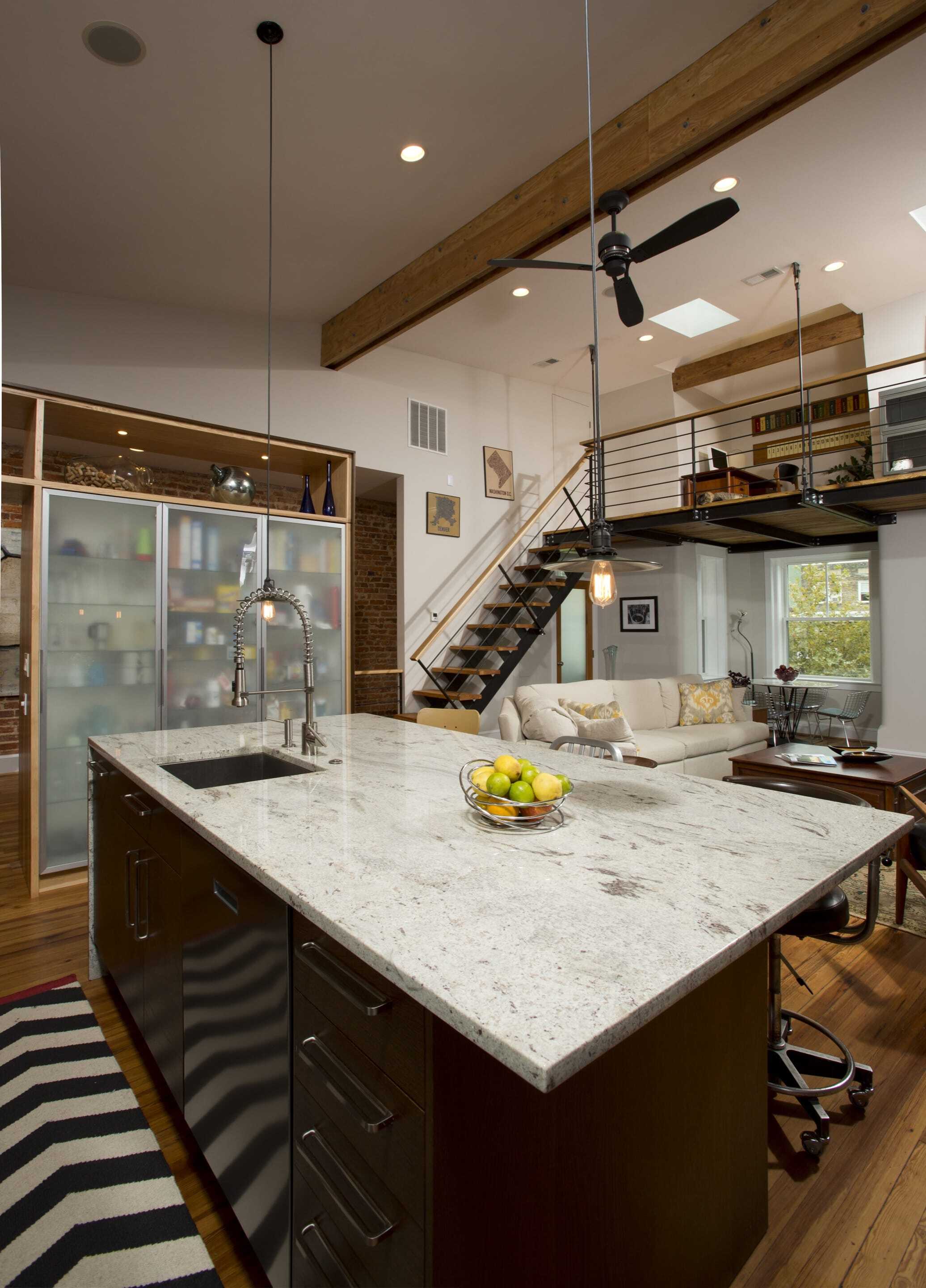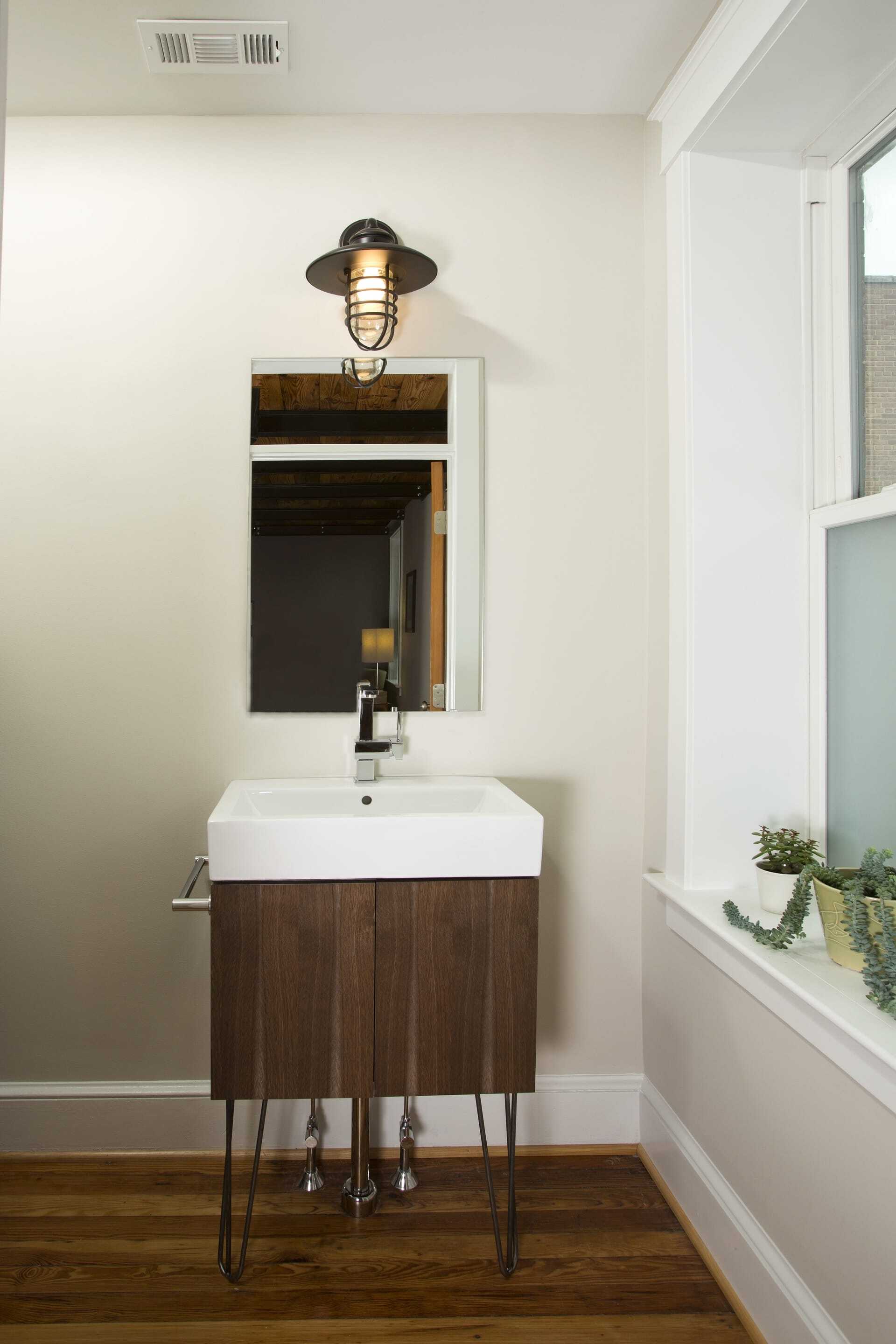 Our task was two-fold: produce an industrial design with clean lines, while recreating some of the details original to the home. Though these tasks may seem diametrically opposed, our designers incorporated more industrial elements in the rear, enclosed rooms, while recreating original details at the front and more open section of each unit. For example, the original heart pine floors were salvaged at the front of the second floor unit, and the elevated loft constructed with matching heart pine salvaged from an old barn. The brick was exposed at the party wall at both levels, the entrance ways tiled with material to match what was used when the home was built, and the original trim details rebuilt throughout. For this particular project, the budget was not unlimited so creativity was required. Both kitchens were designed and built using IKEA cabinetry, as were the bedroom wardrobes and laundry room cabinets. The kitchen backsplash at the first floor was finished using magnetic chalkboard paint, and the existing exterior wall enhanced with a rain-screen and Hardie Panel system. One nifty feature was not even in the original plans, but produced by one of our onsite carpenters. He took an off-cut from a structural beam, installed it on the powder room wall, on which the sink and faucet were then mounted.
