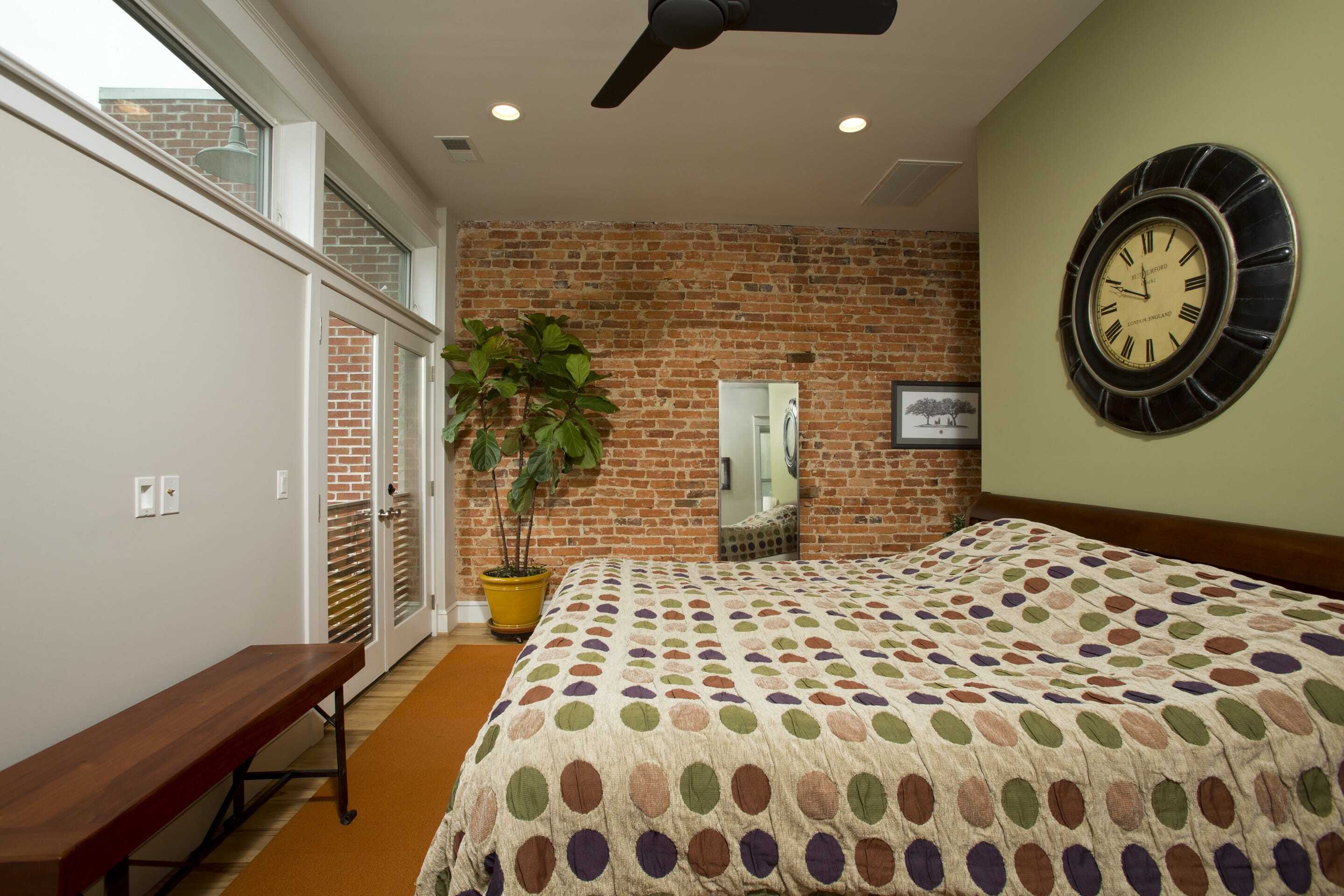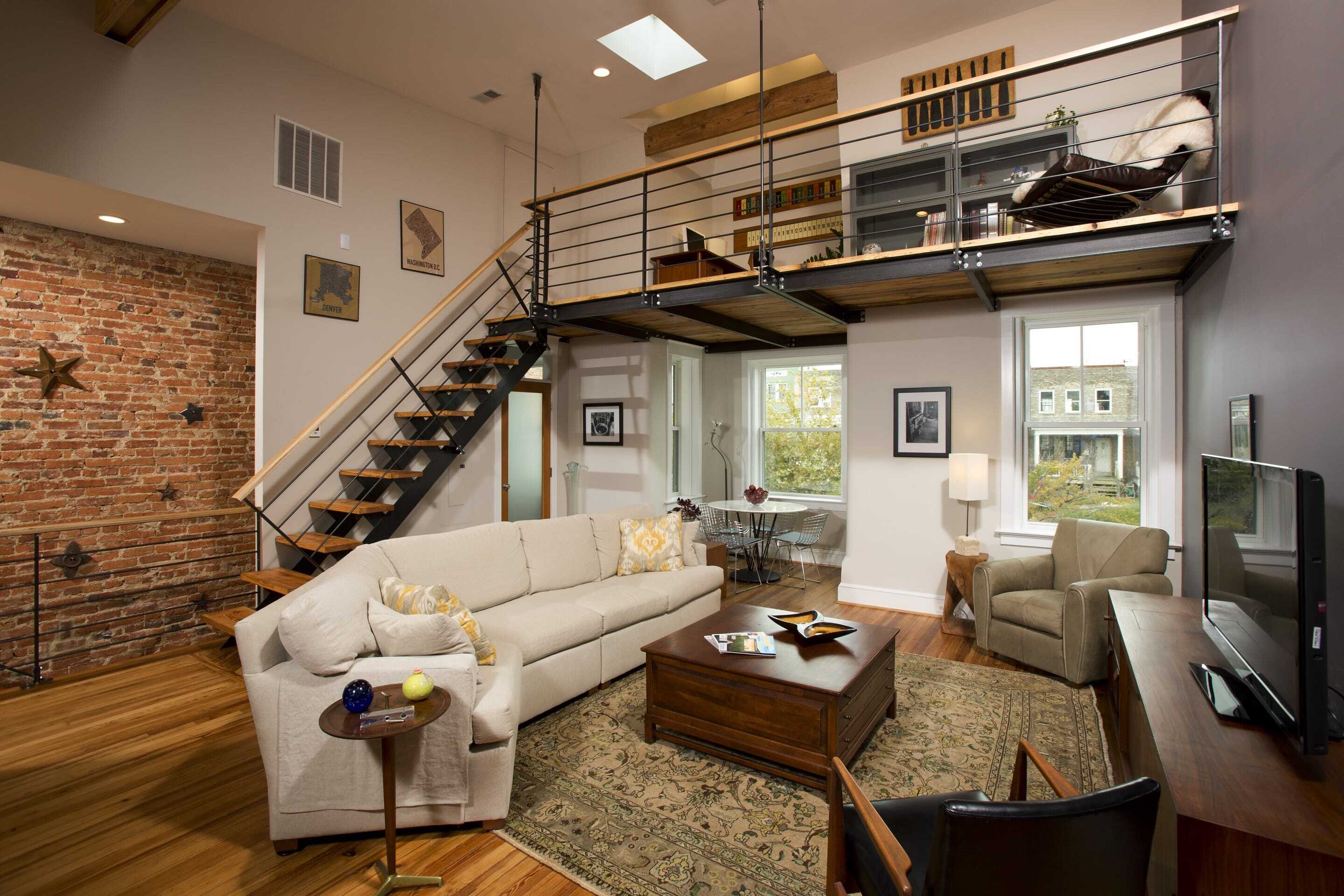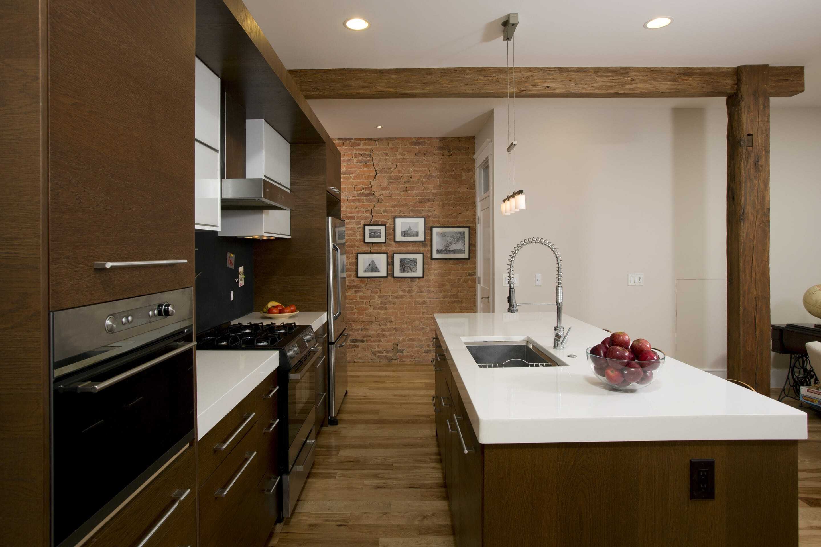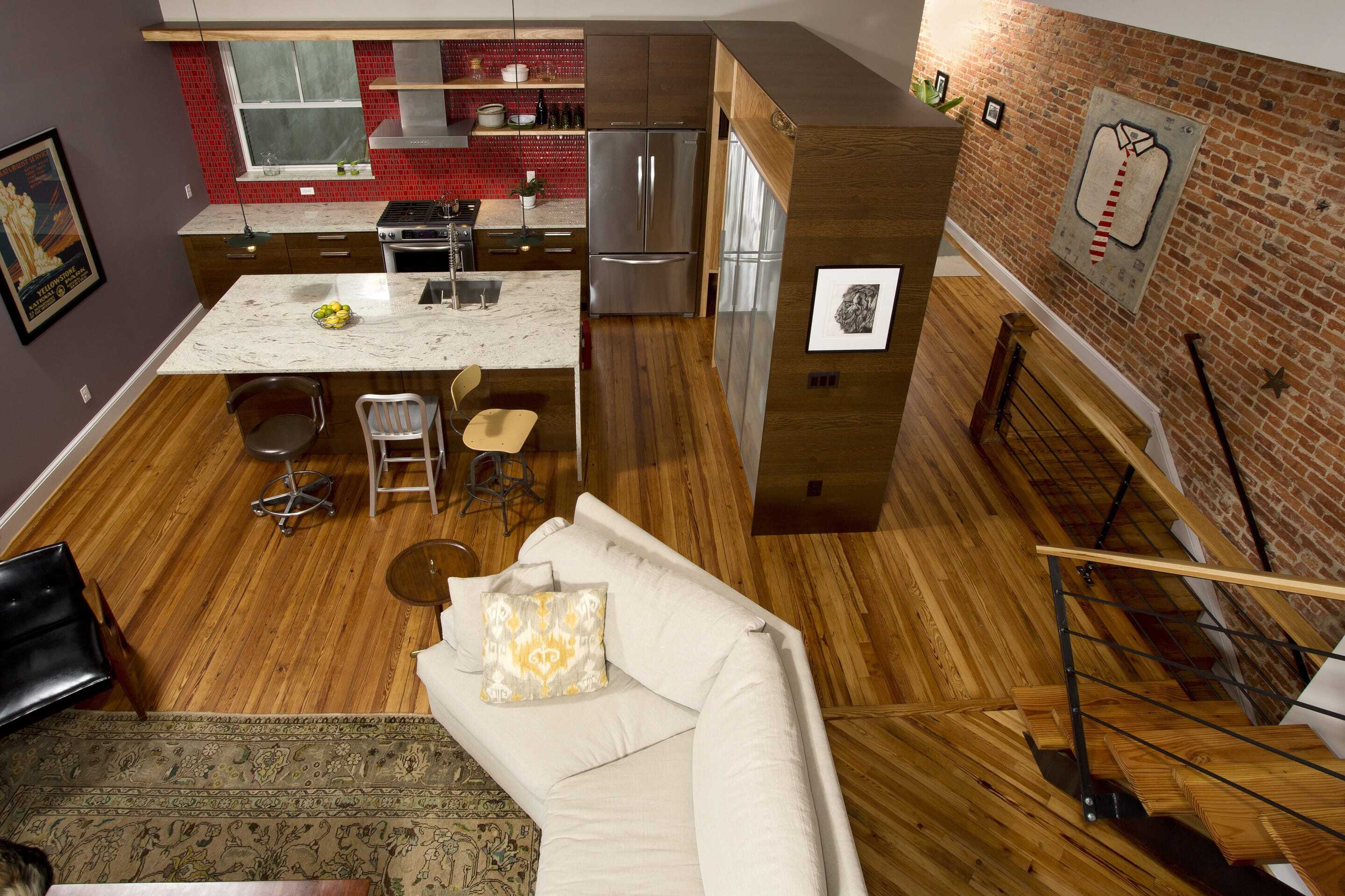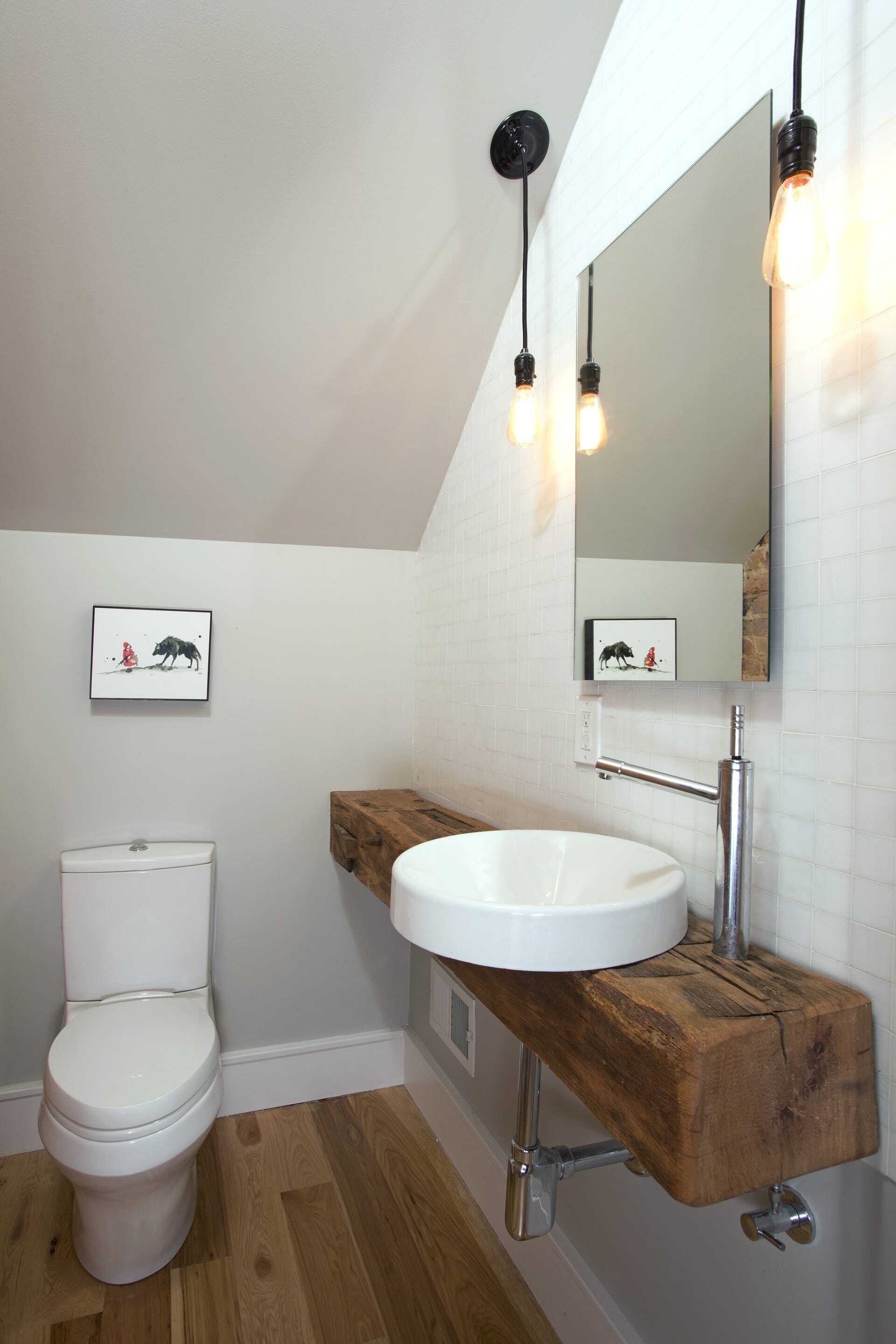 Our task was two-fold: produce an industrial design with clean lines, while recreating some of the details original to the home. Though these tasks may seem diametrically opposed, our designers incorporated more industrial elements in the rear, enclosed rooms, while recreating original details at the front and more open section of each unit. For example, the original heart pine floors were salvaged at the front of the second floor unit, and the elevated loft constructed with matching heart pine salvaged from an old barn. The brick was exposed at the party wall at both levels, the entrance ways tiled with material to match what was used when the home was built, and the original trim details rebuilt throughout. For this particular project, the budget was not unlimited so creativity was required. Both kitchens were designed and built using IKEA cabinetry, as were the bedroom wardrobes and laundry room cabinets. The kitchen backsplash at the first floor was finished using magnetic chalkboard paint, and the existing exterior wall enhanced with a rain-screen and Hardie Panel system. One nifty feature was not even in the original plans, but produced by one of our onsite carpenters. He took an off-cut from a structural beam, installed it on the powder room wall, on which the sink and faucet were then mounted.