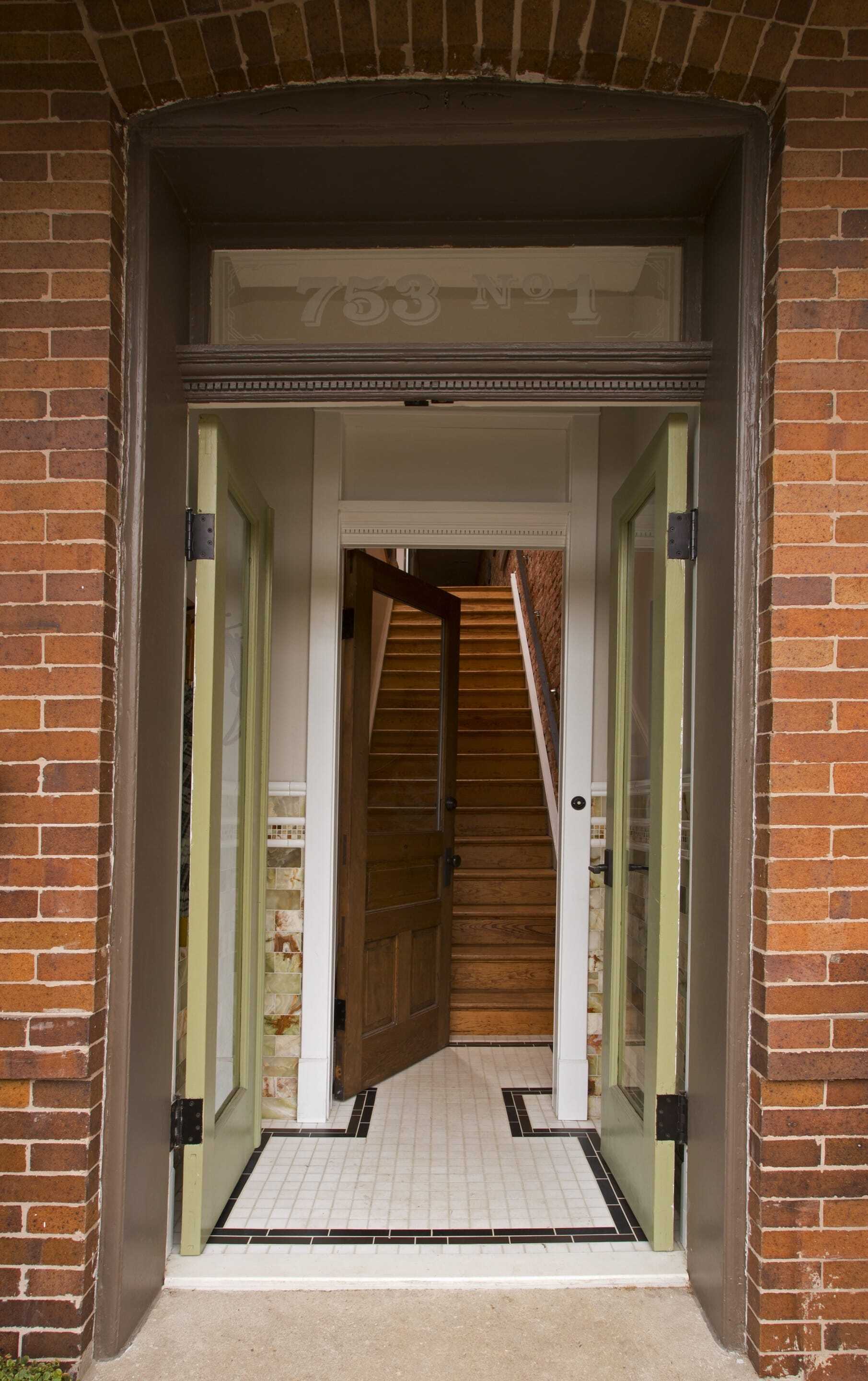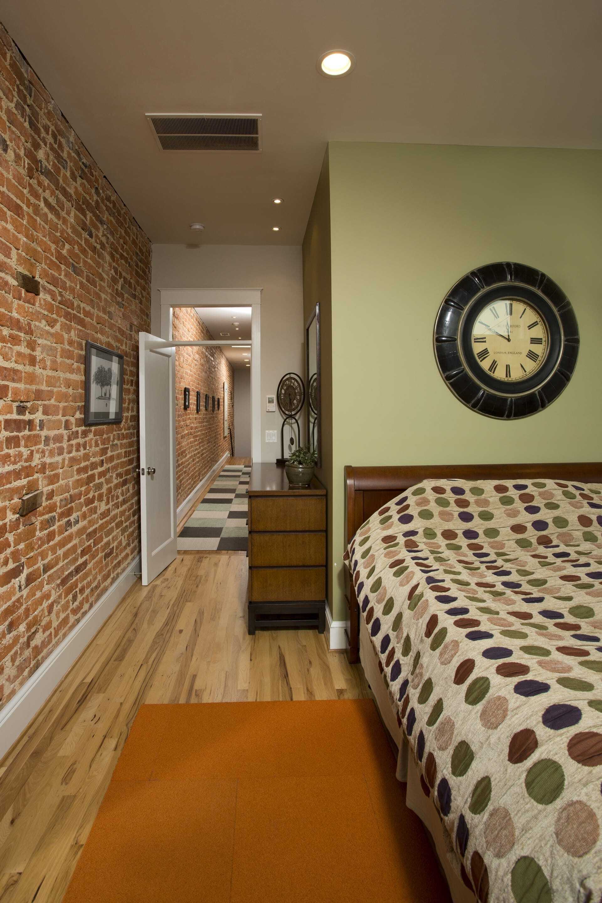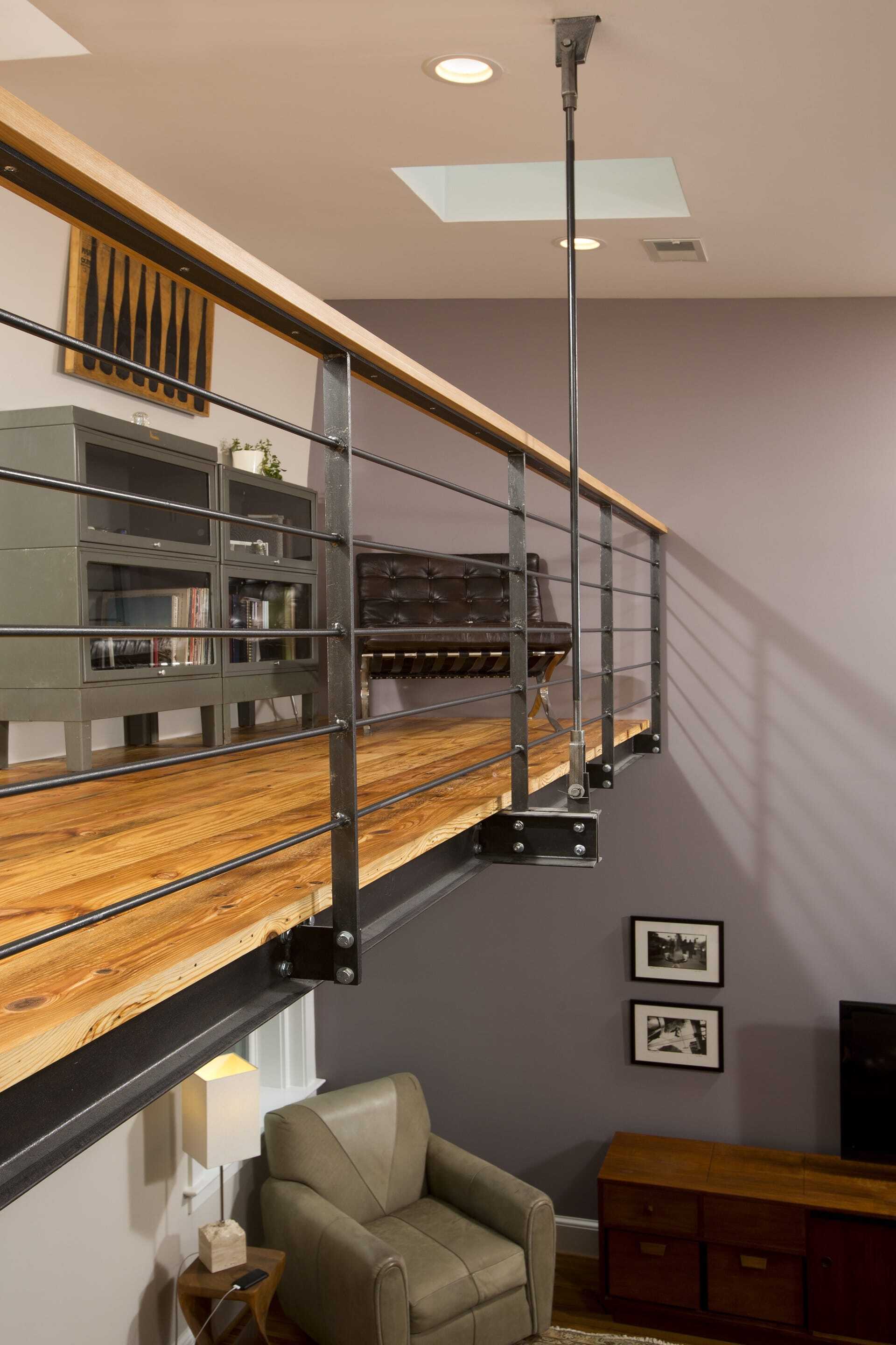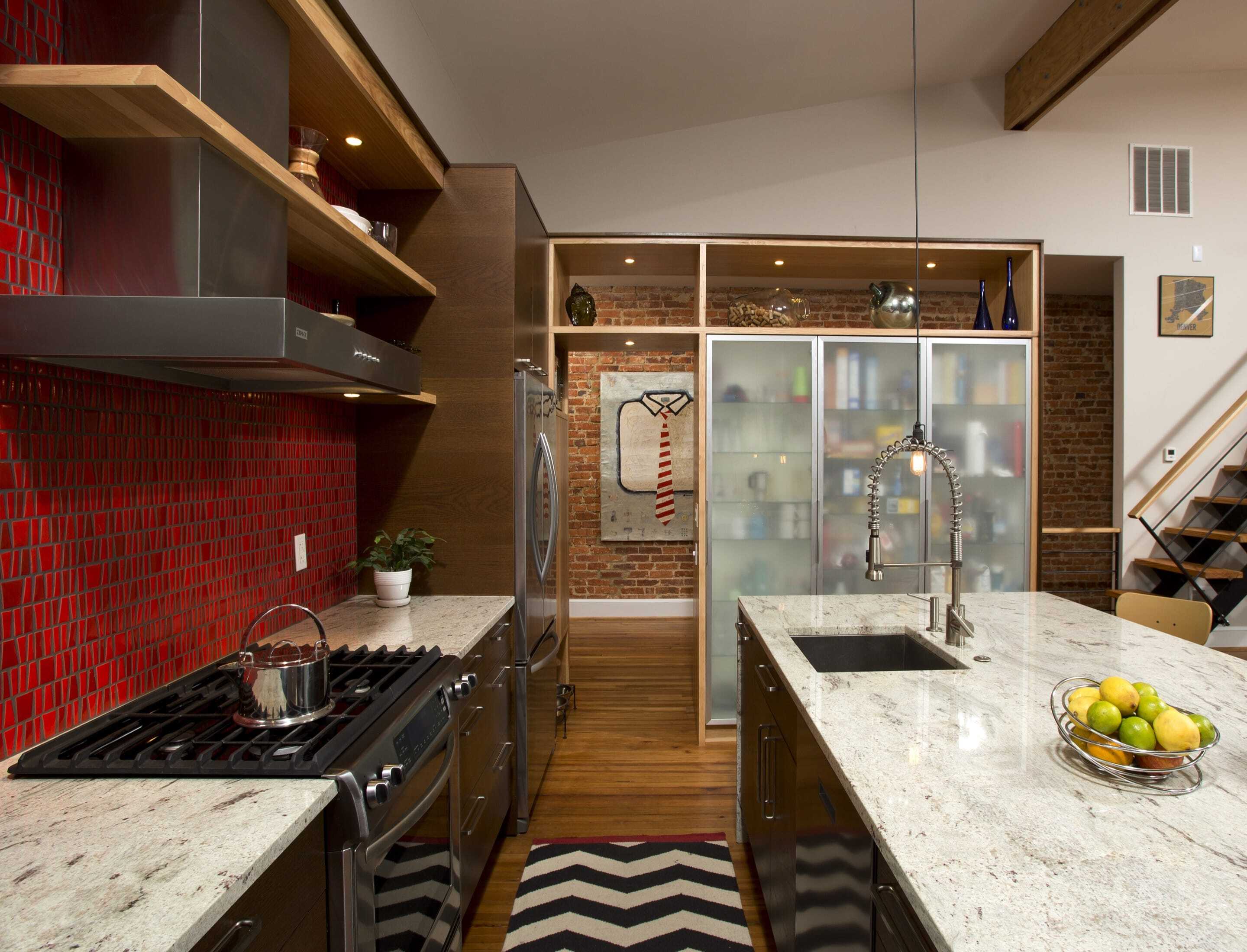 Our task was two-fold: produce an industrial design with clean lines, while recreating some of the details original to the home. Though these tasks may seem diametrically opposed, our designers incorporated more industrial elements in the rear, enclosed rooms, while recreating original details at the front and more open section of each unit. For example, the original heart pine floors were salvaged at the front of the second floor unit, and the elevated loft constructed with matching heart pine salvaged from an old barn. The brick was exposed at the party wall at both levels, the entrance ways tiled with material to match what was used when the home was built, and the original trim details rebuilt throughout. For this particular project, the budget was not unlimited so creativity was required. Both kitchens were designed and built using IKEA cabinetry, as were the bedroom wardrobes and laundry room cabinets. The kitchen backsplash at the first floor was finished using magnetic chalkboard paint, and the existing exterior wall enhanced with a rain-screen and Hardie Panel system. One nifty feature was not even in the original plans, but produced by one of our onsite carpenters. He took an off-cut from a structural beam, installed it on the powder room wall, on which the sink and faucet were then mounted.