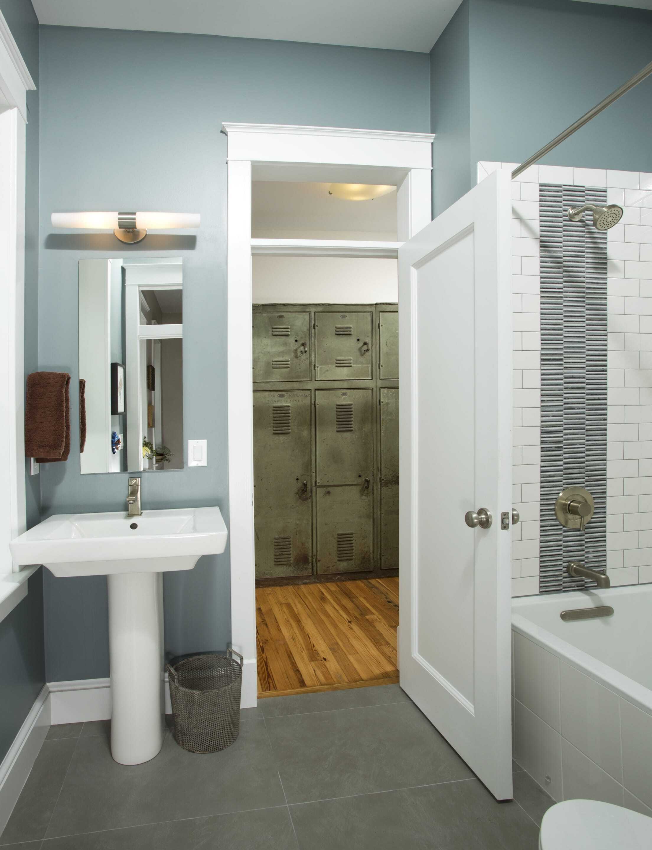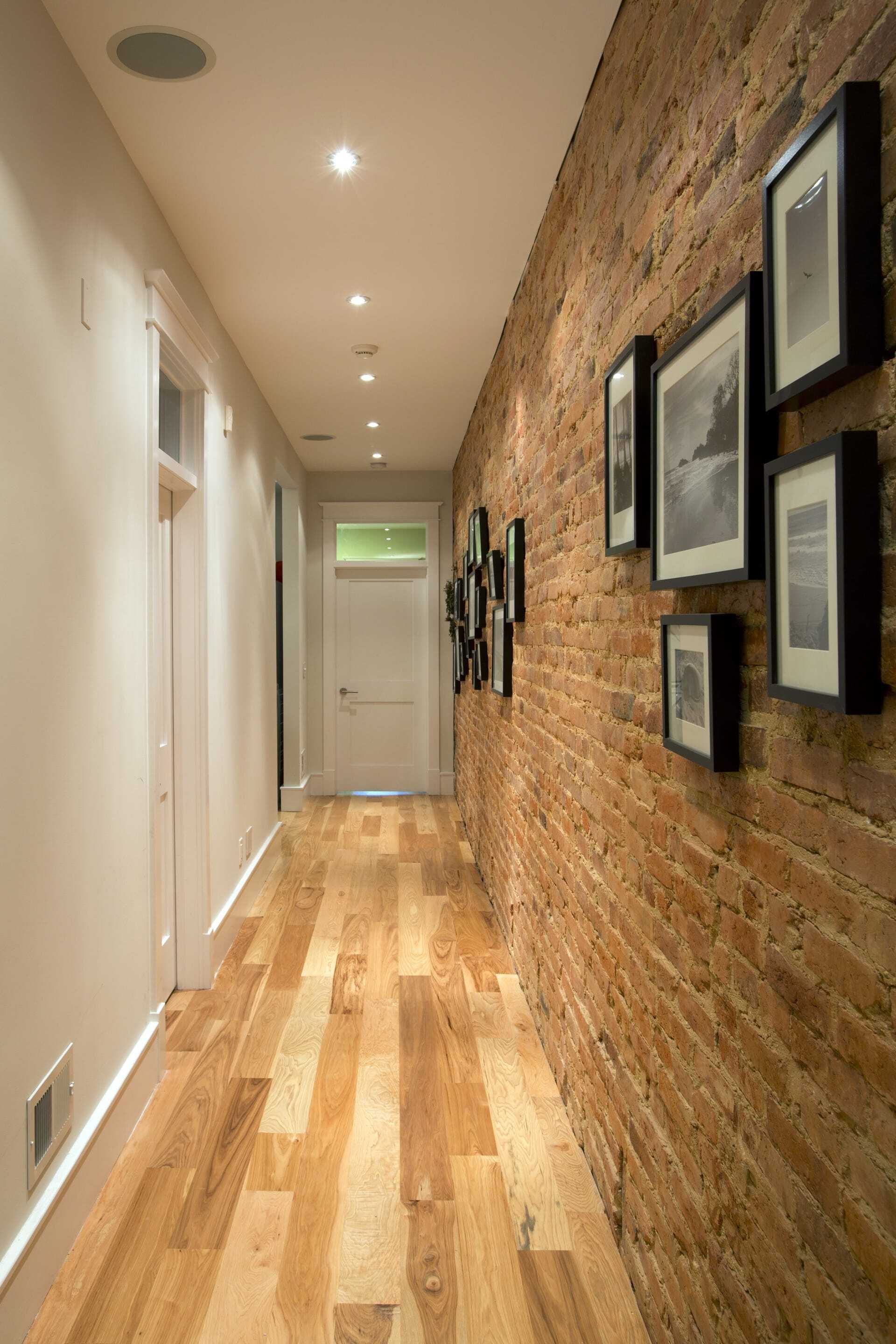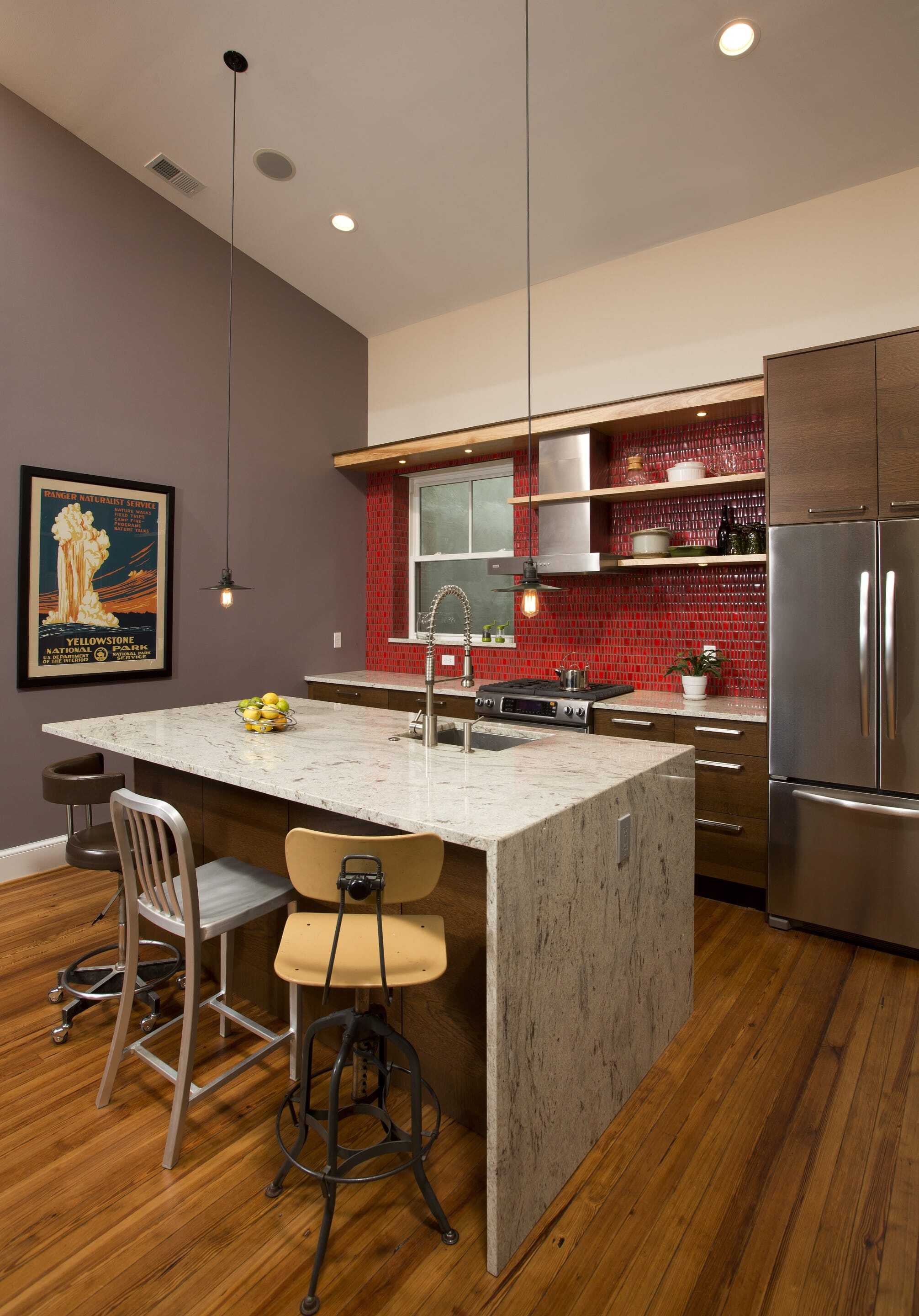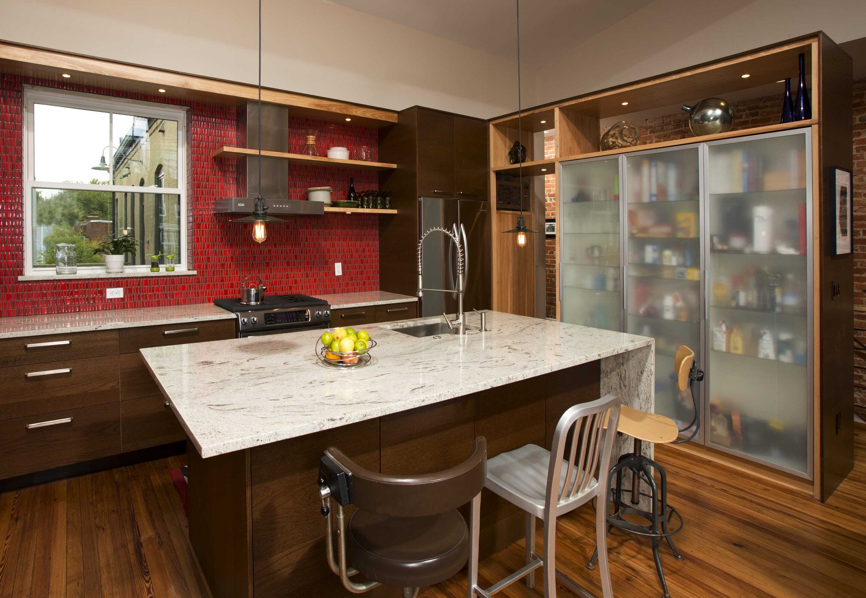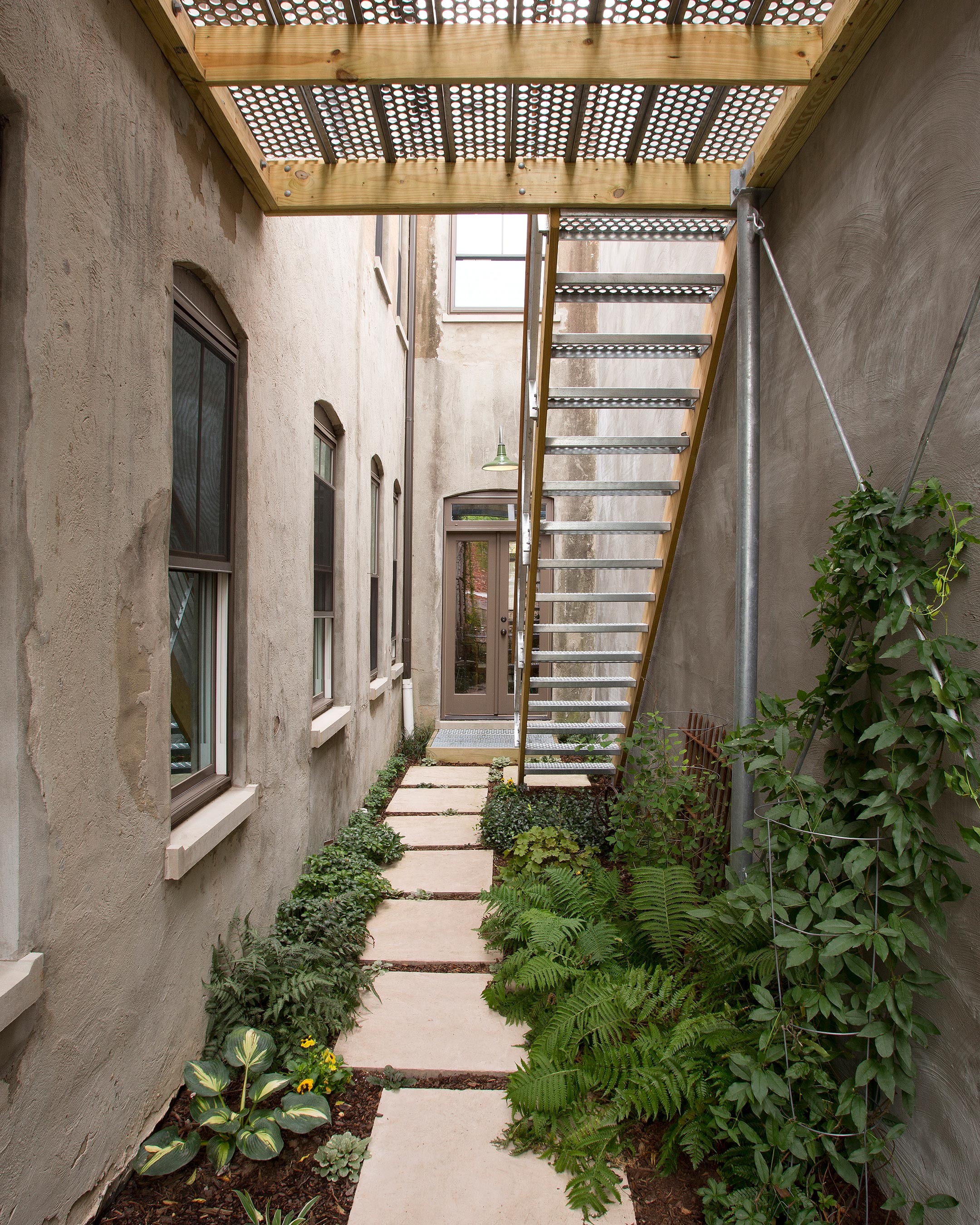 Our task was two-fold: produce an industrial design with clean lines, while recreating some of the details original to the home. Though these tasks may seem diametrically opposed, our designers incorporated more industrial elements in the rear, enclosed rooms, while recreating original details at the front and more open section of each unit. For example, the original heart pine floors were salvaged at the front of the second floor unit, and the elevated loft constructed with matching heart pine salvaged from an old barn. The brick was exposed at the party wall at both levels, the entrance ways tiled with material to match what was used when the home was built, and the original trim details rebuilt throughout. For this particular project, the budget was not unlimited so creativity was required. Both kitchens were designed and built using IKEA cabinetry, as were the bedroom wardrobes and laundry room cabinets. The kitchen backsplash at the first floor was finished using magnetic chalkboard paint, and the existing exterior wall enhanced with a rain-screen and Hardie Panel system. One nifty feature was not even in the original plans, but produced by one of our onsite carpenters. He took an off-cut from a structural beam, installed it on the powder room wall, on which the sink and faucet were then mounted.