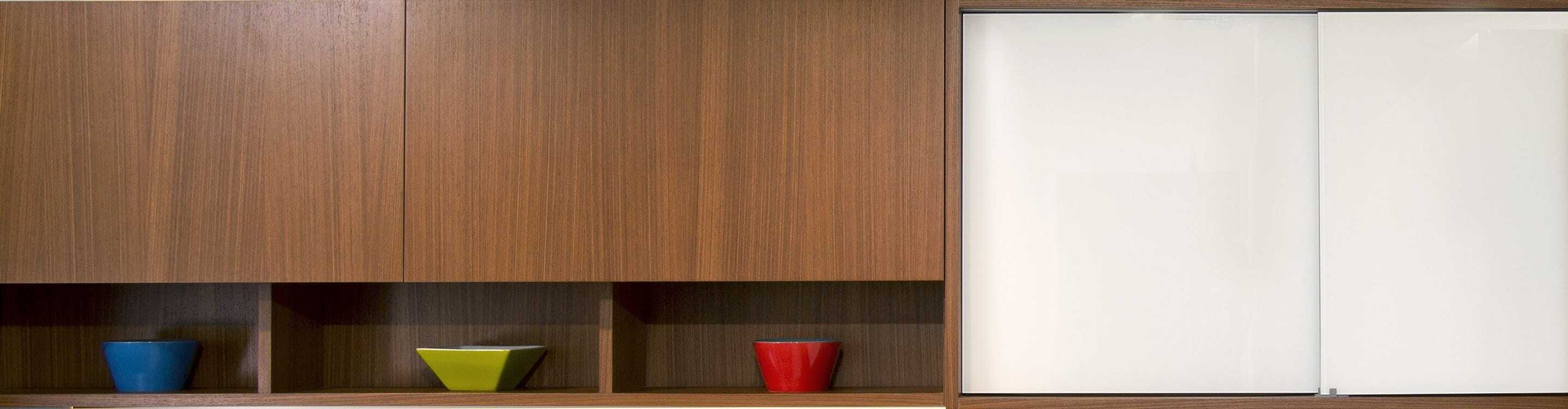 The kitchen countertops are quartz in Snow White by Corian. The stainless steel sink is from the Kubus line by Franke and is a perfect fit for this Grohe faucet from their Concetto collection. The cabinets are custom made quarter sawn golden teak wood with a natural finish. The dark accents are maple with an ebony stain. The white doors are back-painted glass.