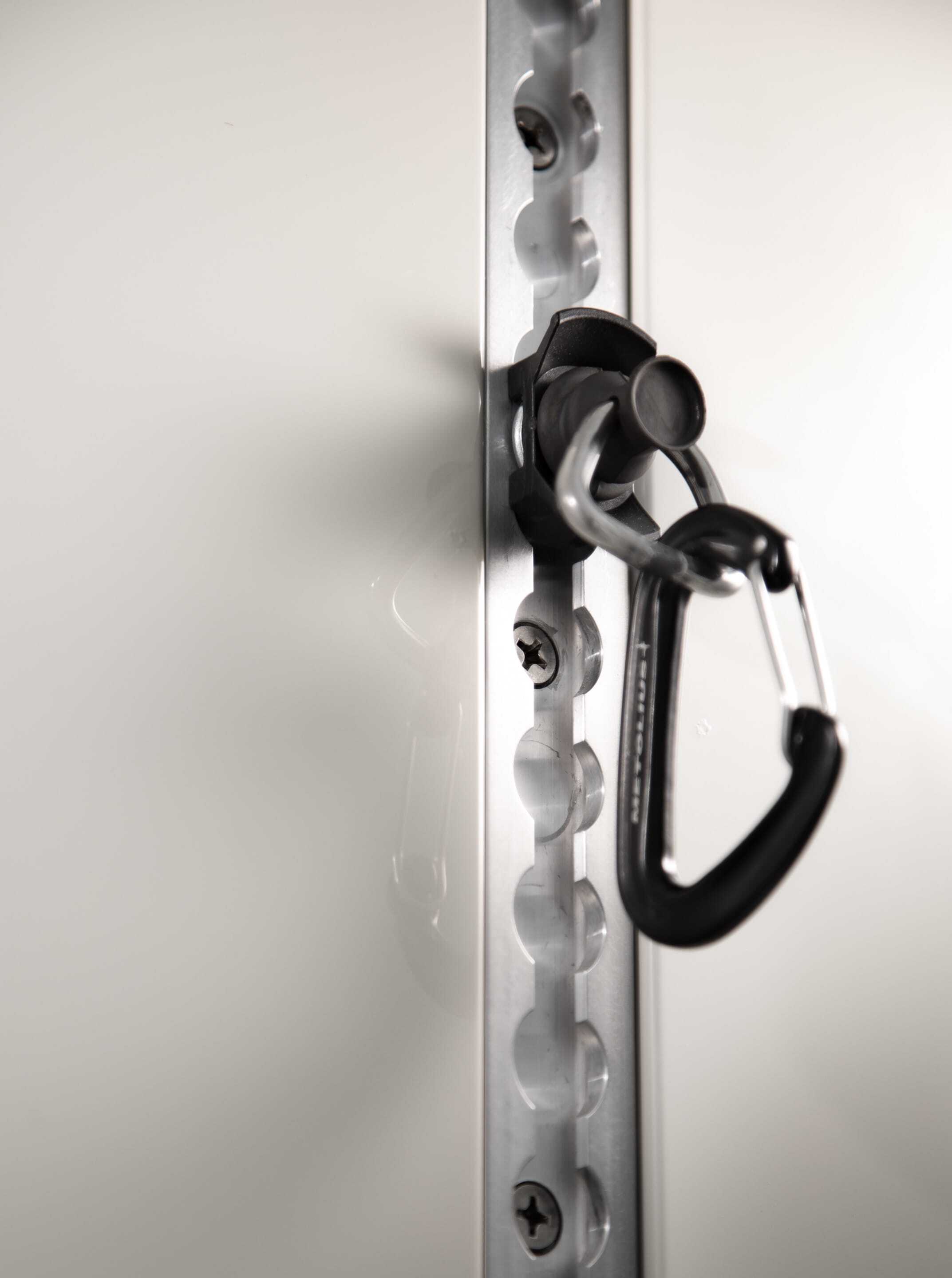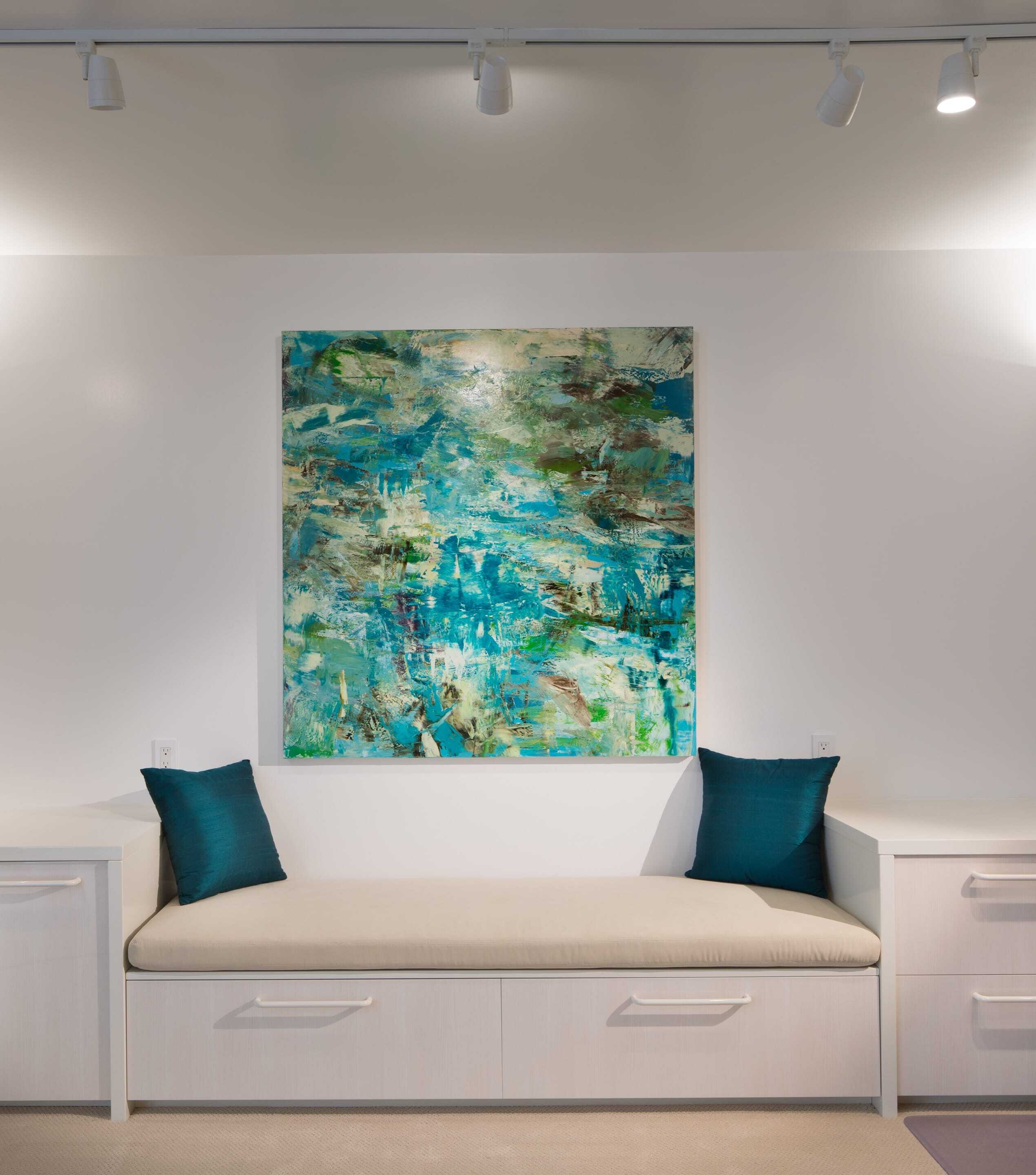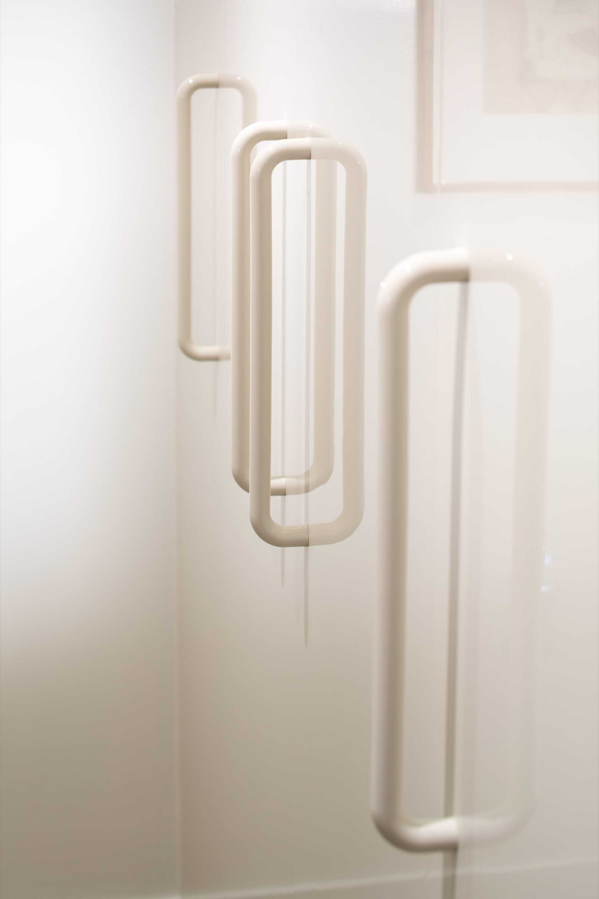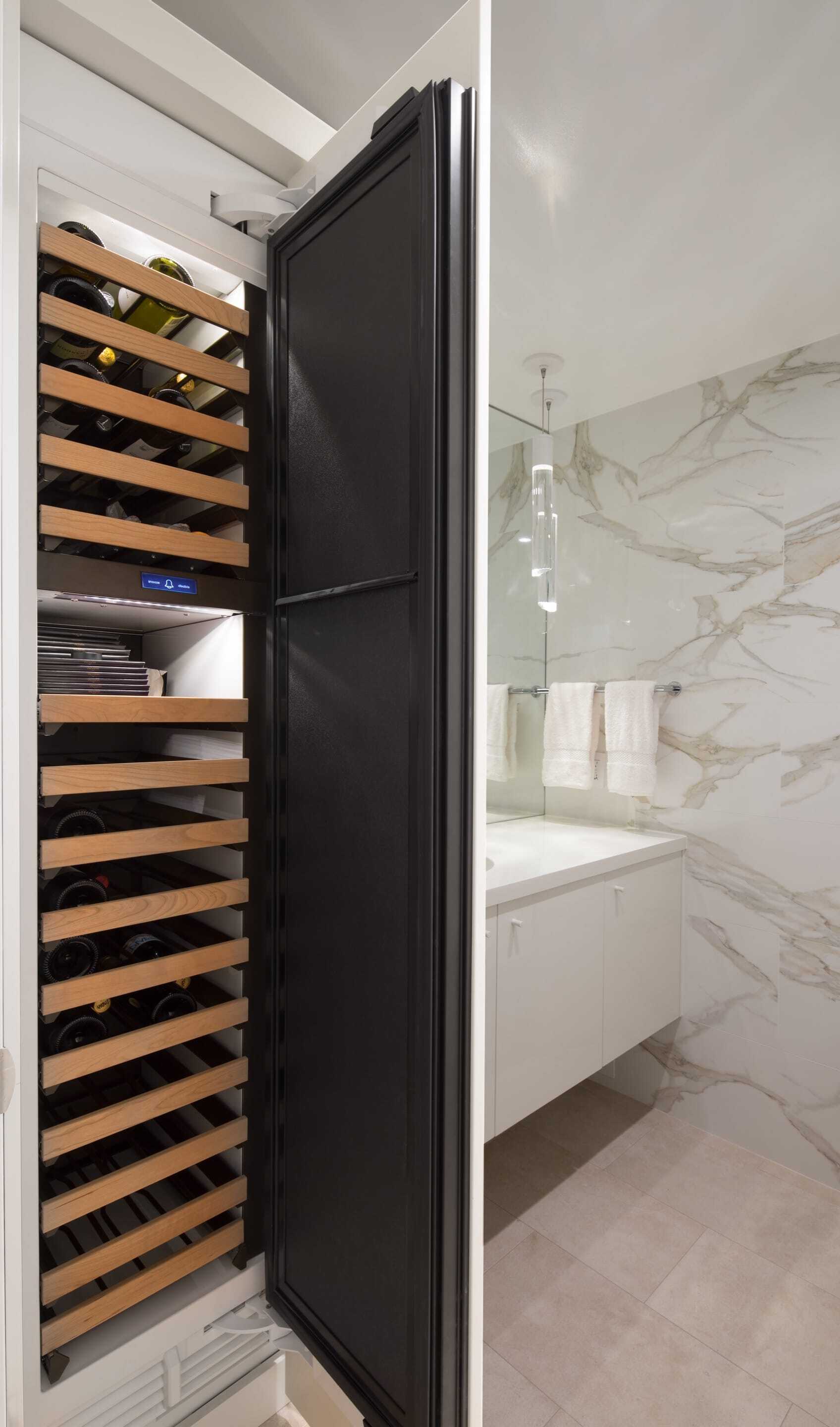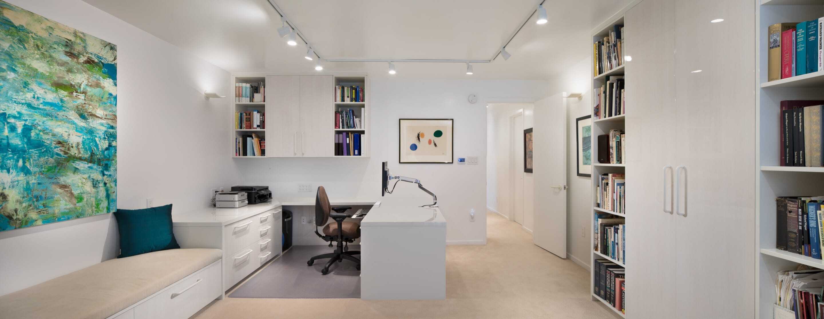 Our clients desired a bright, monotone aesthetic that would showcase their marvelous collection of contemporary paintings and sculpture. Each office includes custom wall cabinetry and a wrap-around desk solution with modern waterfall end details by Neff. The spacious desktop provides excellent cable management to eliminate wires and seamlessly integrate with the homeowner’s technology. Surprisingly, both offices also feature a vertically mounted track with adjustable carabiners that can be repositioned for various resistance training and functional strength exercises. The end result is a multi-functional workspace that is practically stunning and stunningly practical.