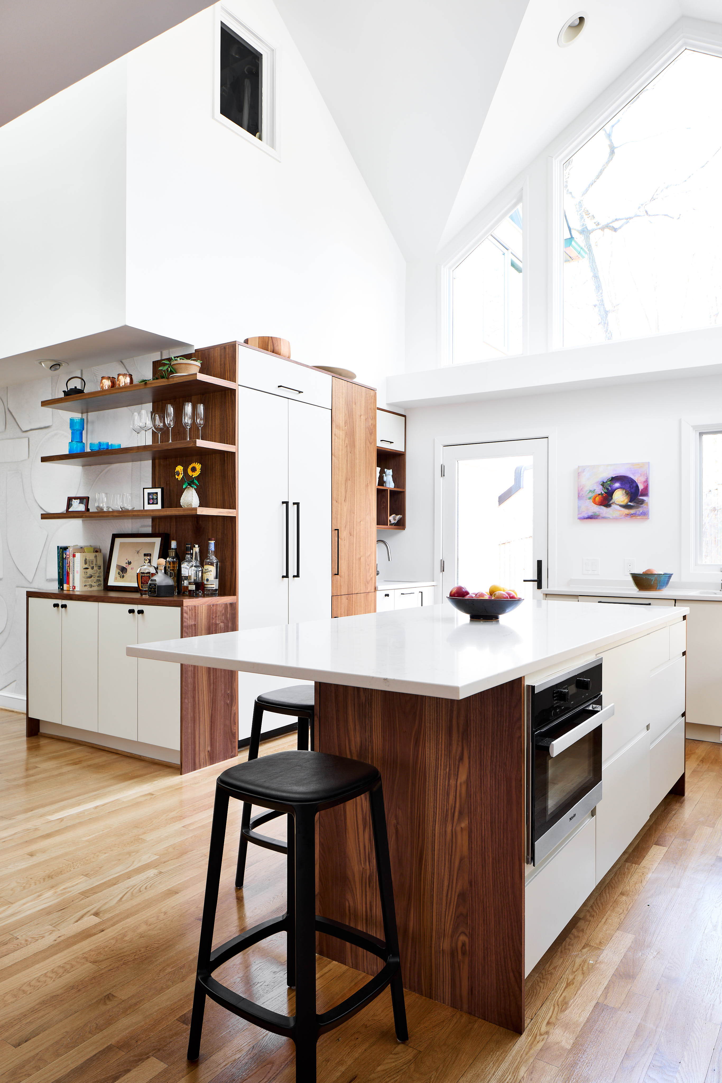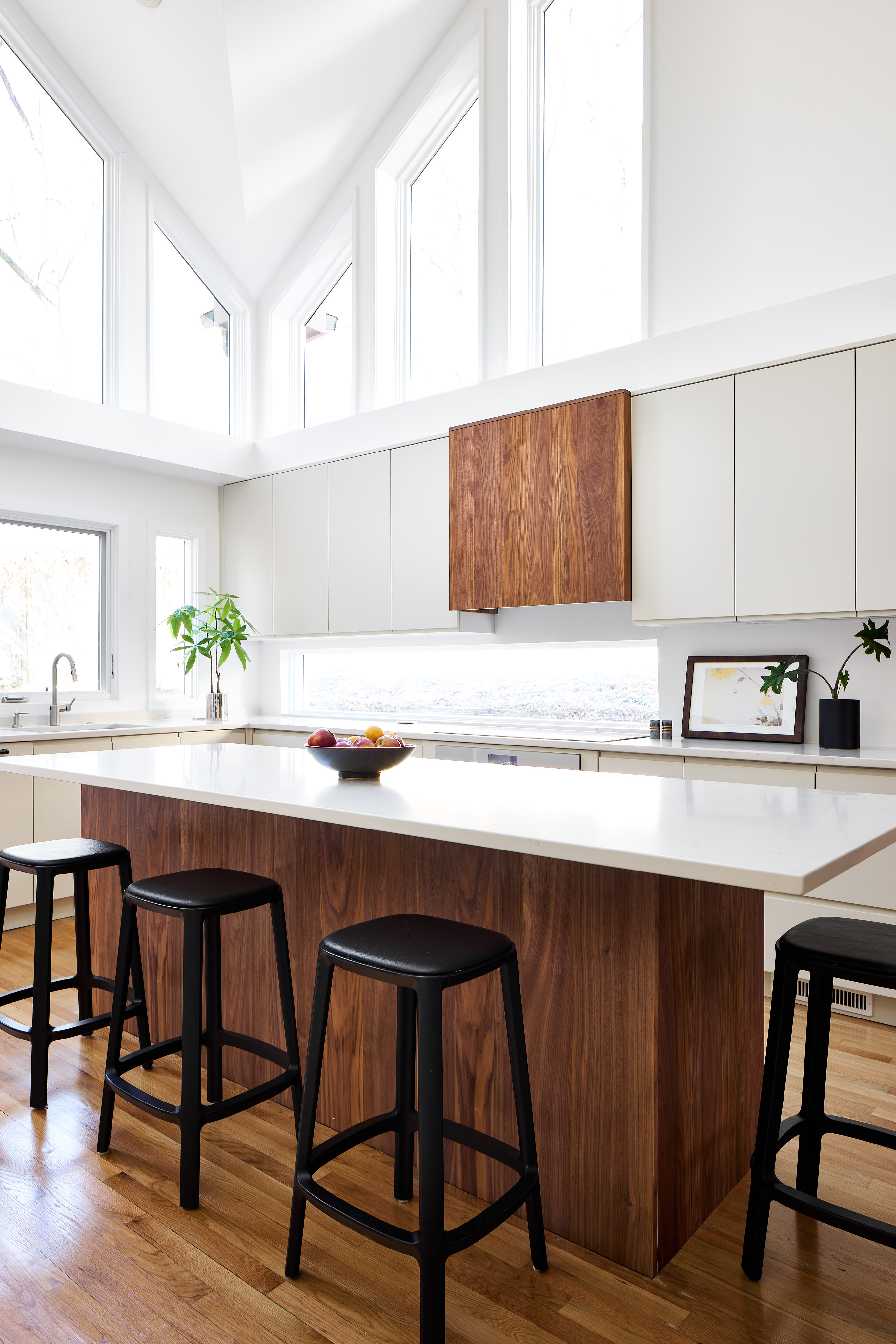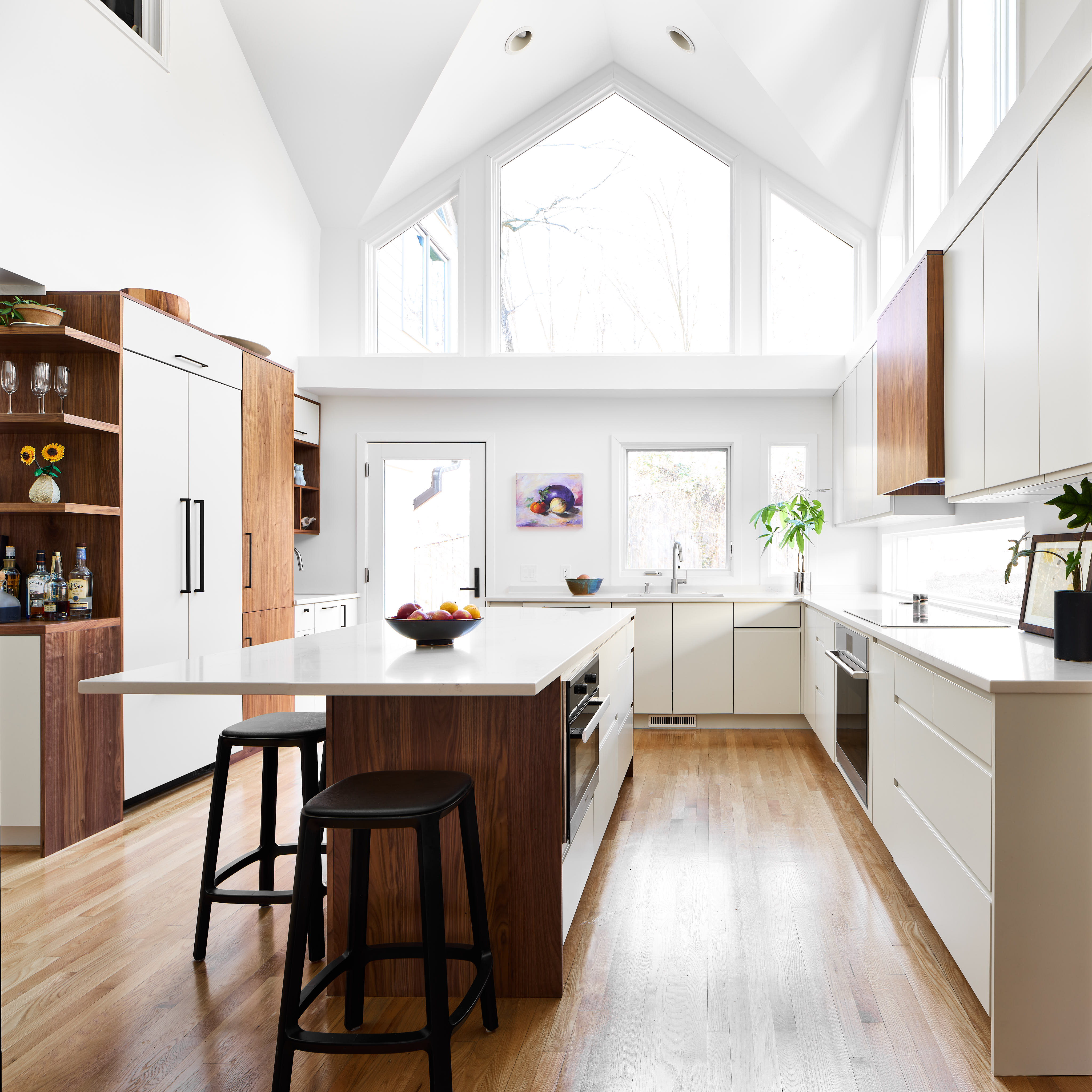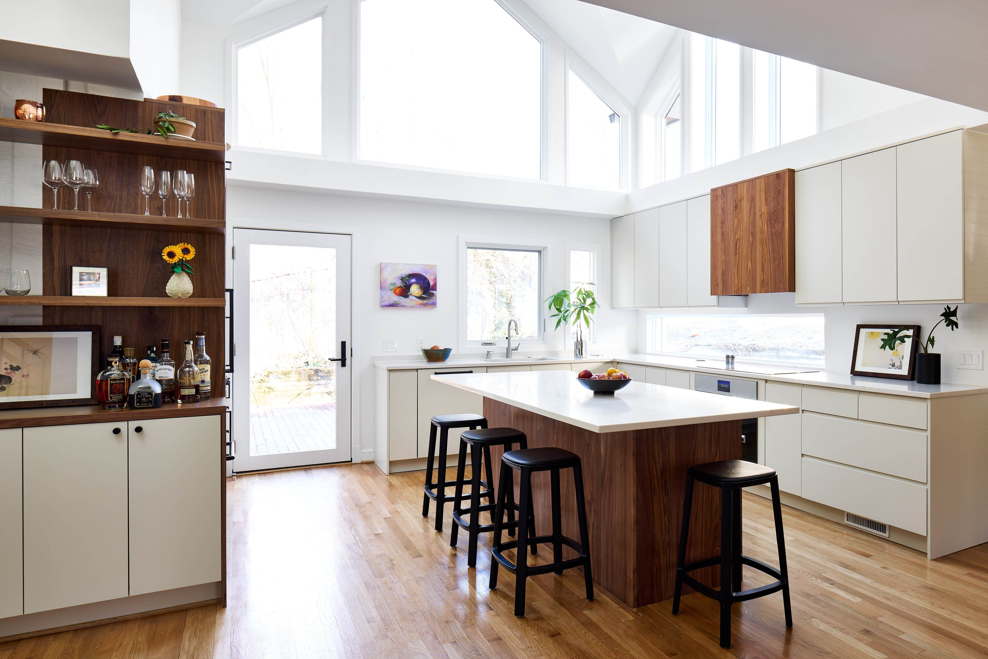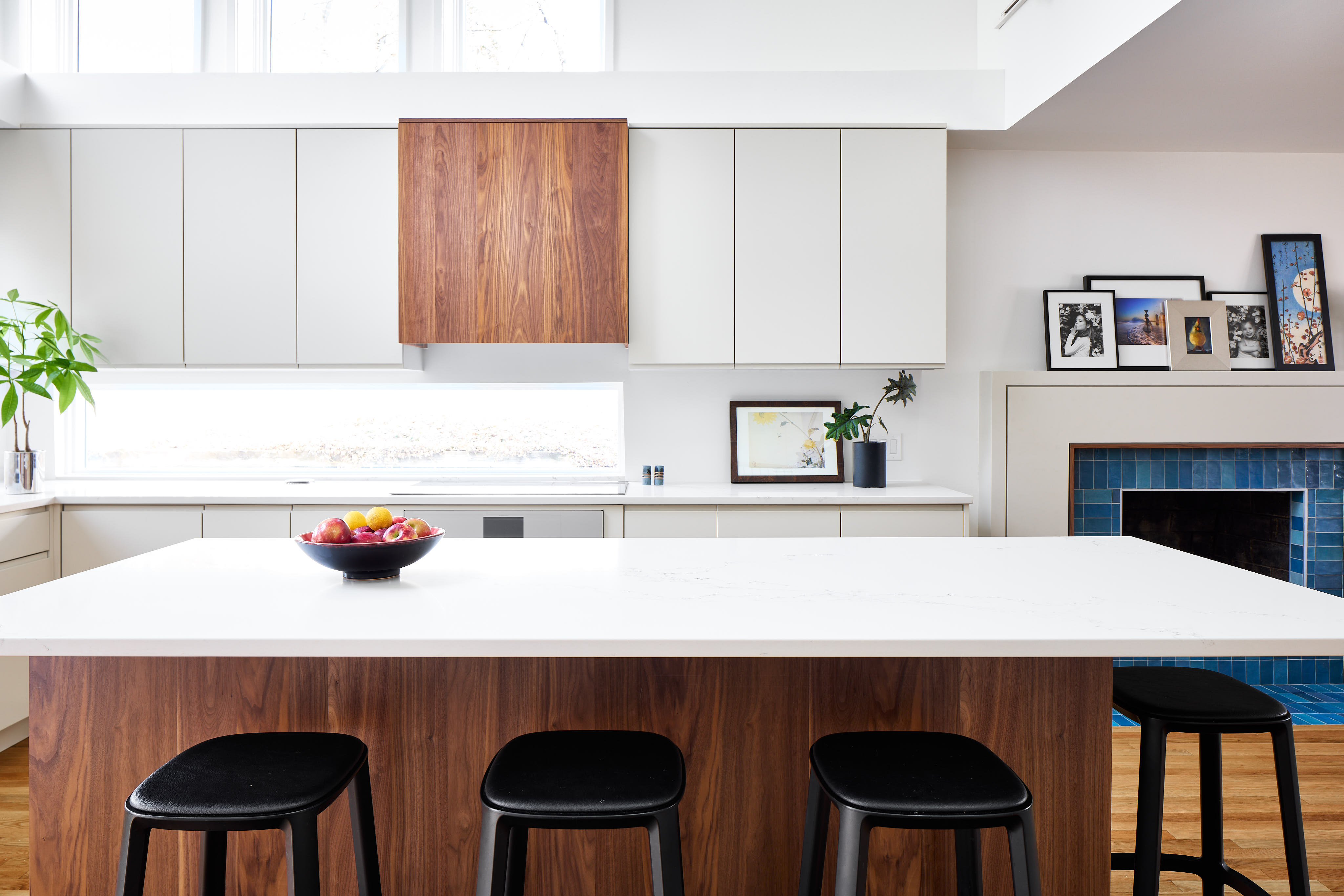 The existing structure lacked lateral bracing and relied heavily on windowed walls, posing structural challenges. We reinforced the rear wall by the kitchen, creatively integrating a large horizontal beam into the cabinetry design without sacrificing natural light. Window proportions were updated throughout, and relocating the kitchen created a more functional layout with ample space for cooking and entertaining.