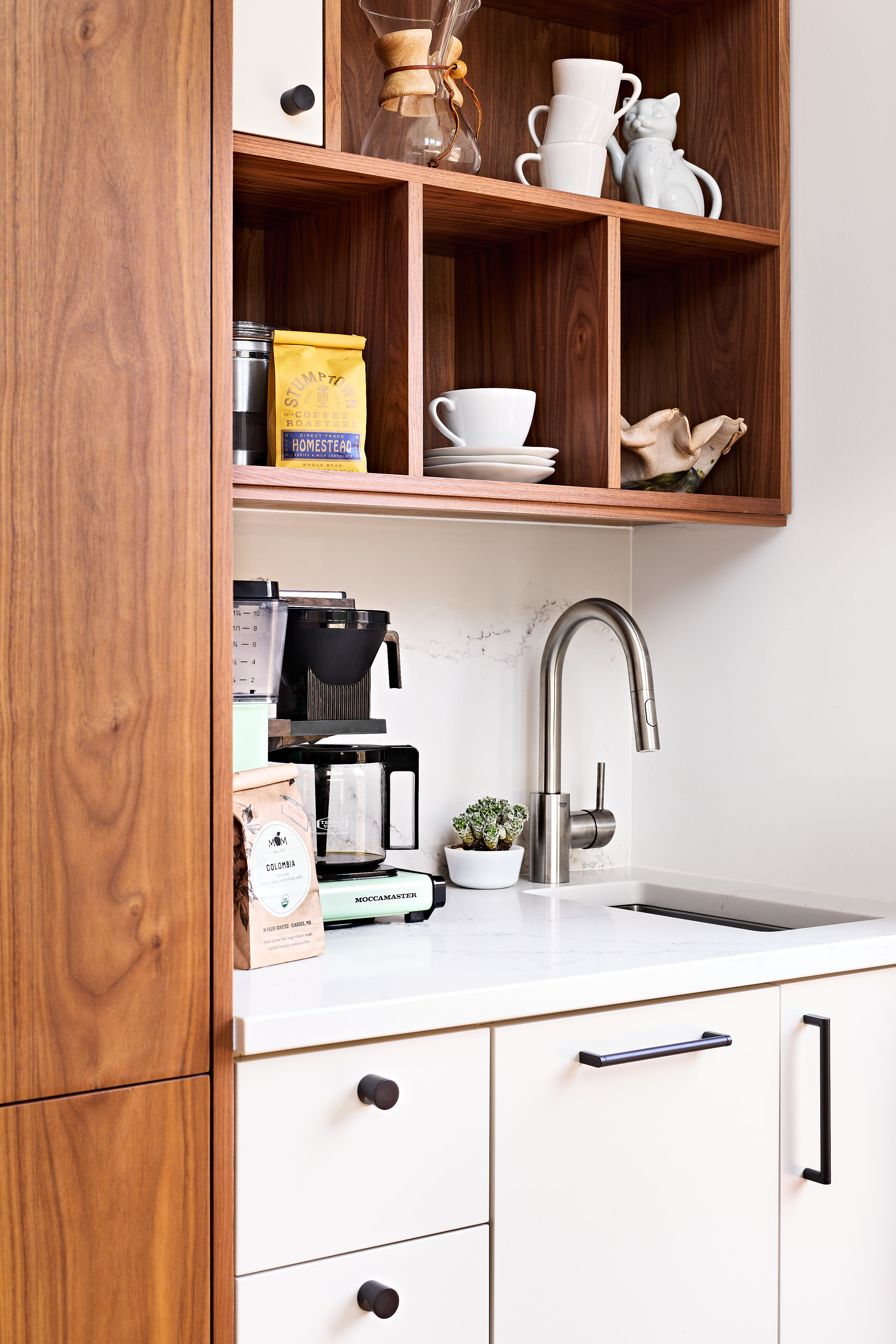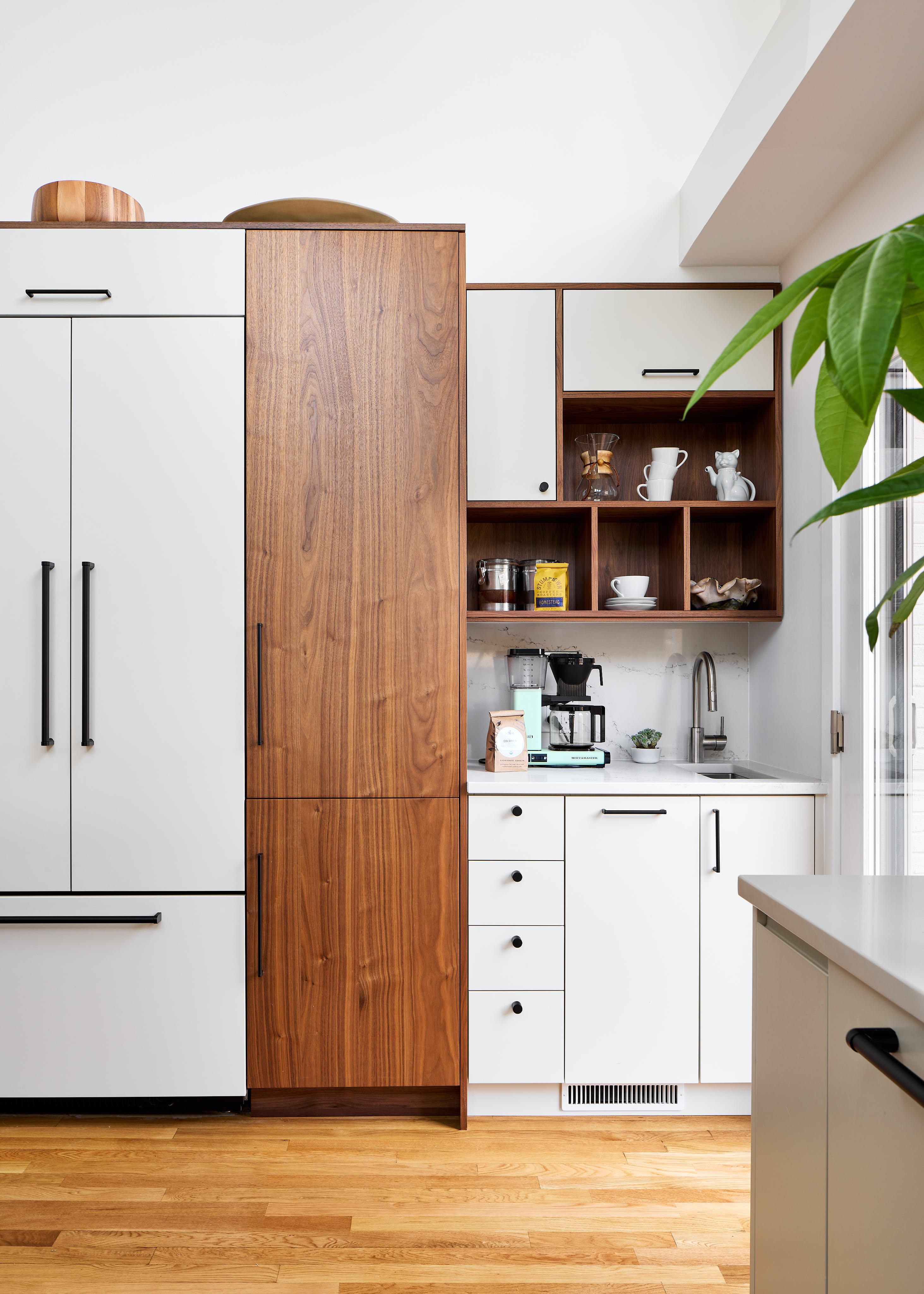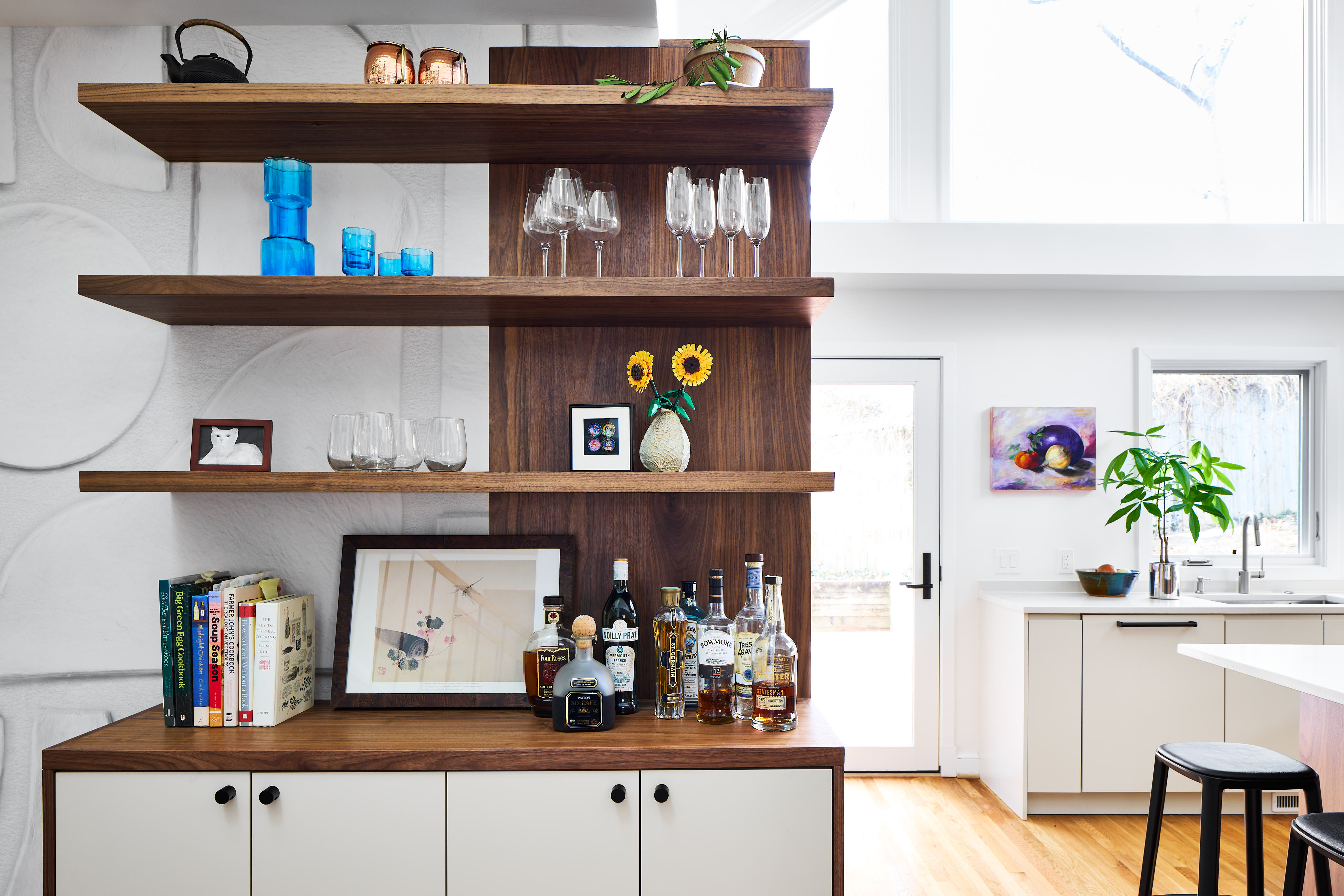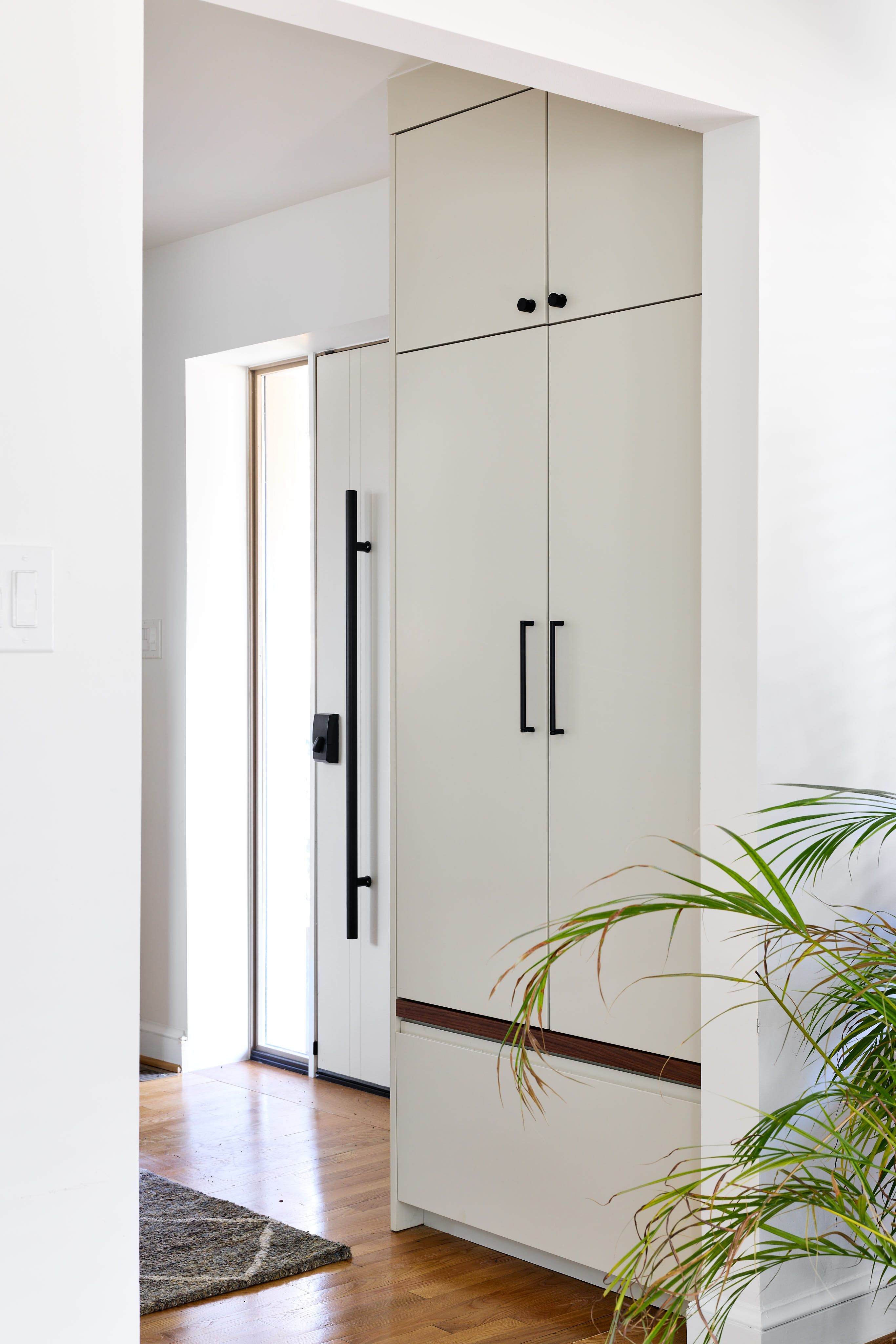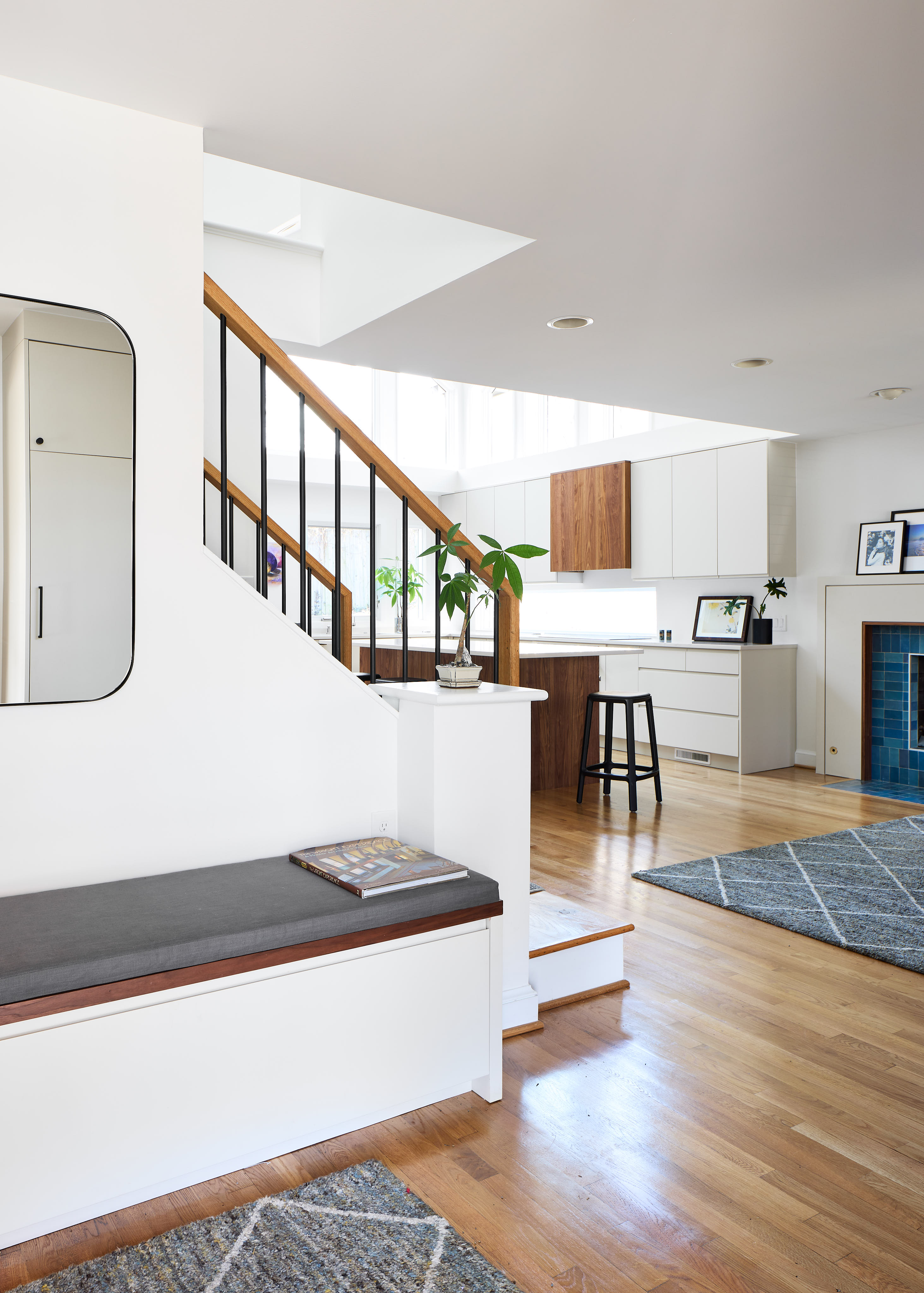 The existing structure lacked lateral bracing and relied heavily on windowed walls, posing structural challenges. We reinforced the rear wall by the kitchen, creatively integrating a large horizontal beam into the cabinetry design without sacrificing natural light. Window proportions were updated throughout, and relocating the kitchen created a more functional layout with ample space for cooking and entertaining.