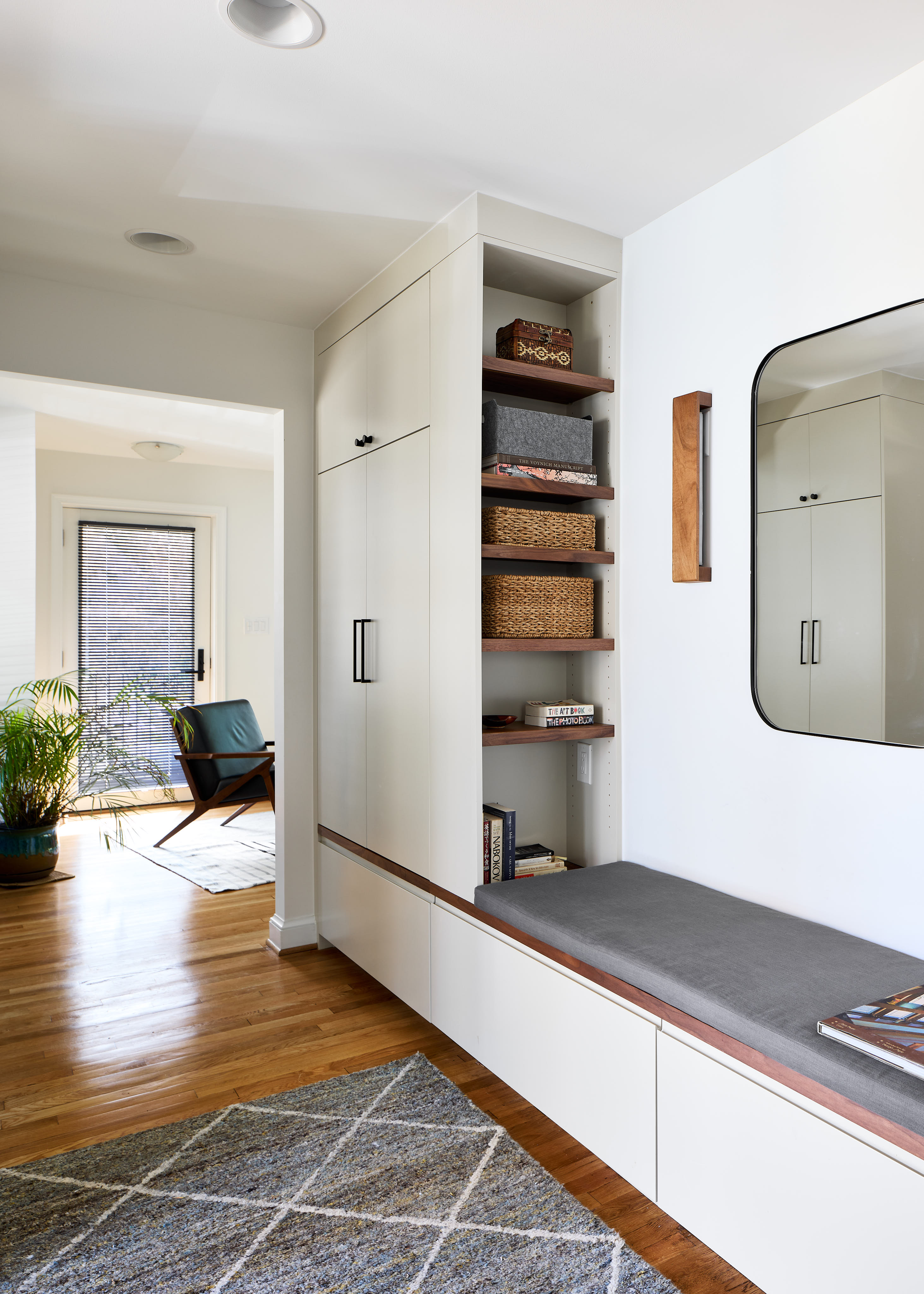 The exterior features fiber-cement siding with mitered corners, a bronze metal roof, custom stained wood siding, and a custom metal railing at the new front porch. Inside, walnut cabinetry and wood accents tie the overall interior design together. The neutral palette of beige, bone, and bronze tones along with clean lines and simplicity, create a cohesive, timeless look throughout the home.