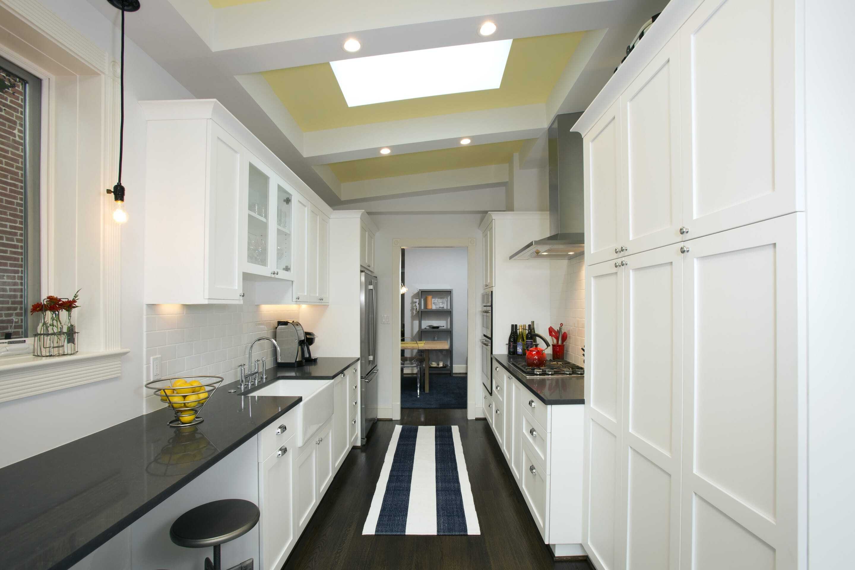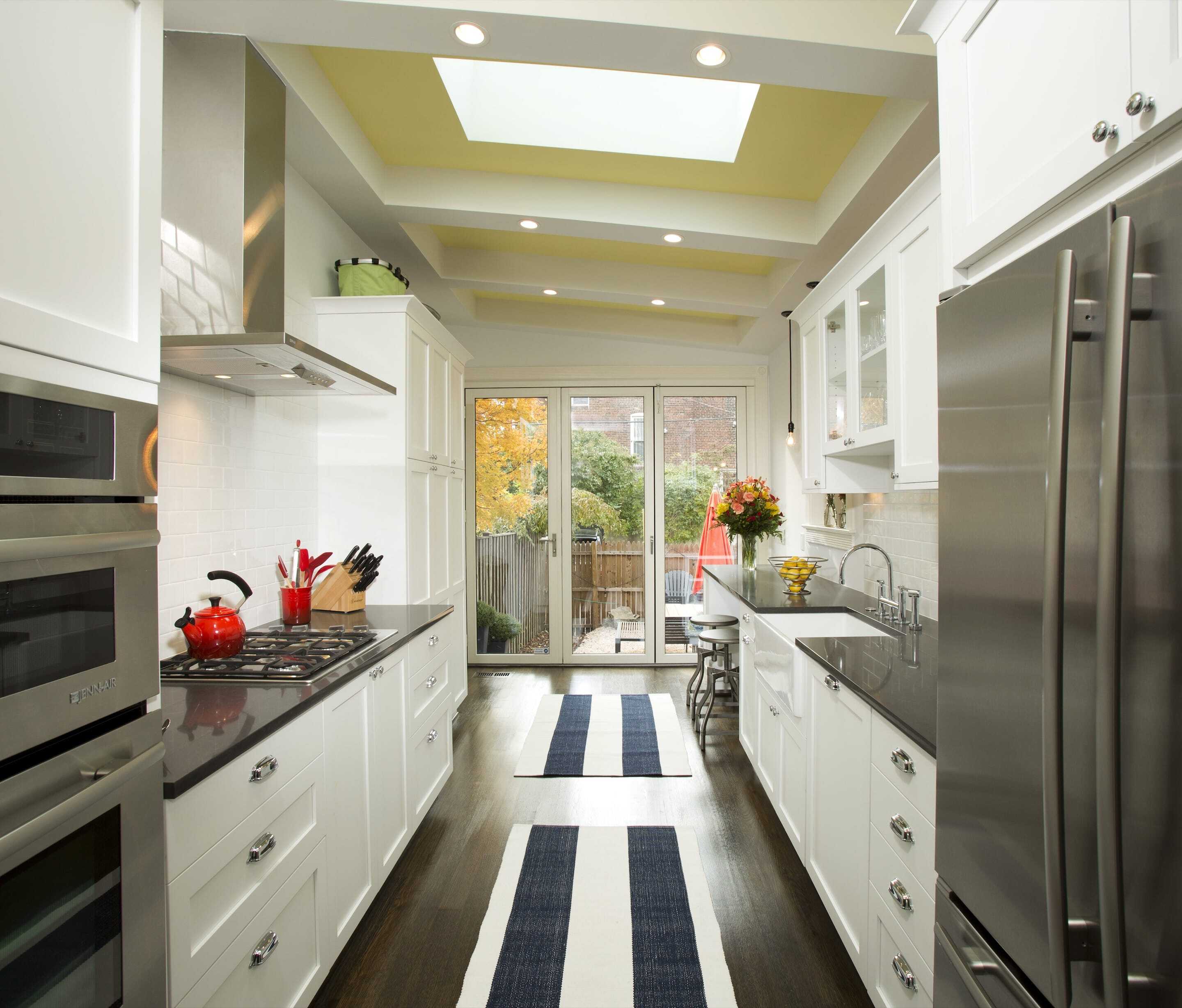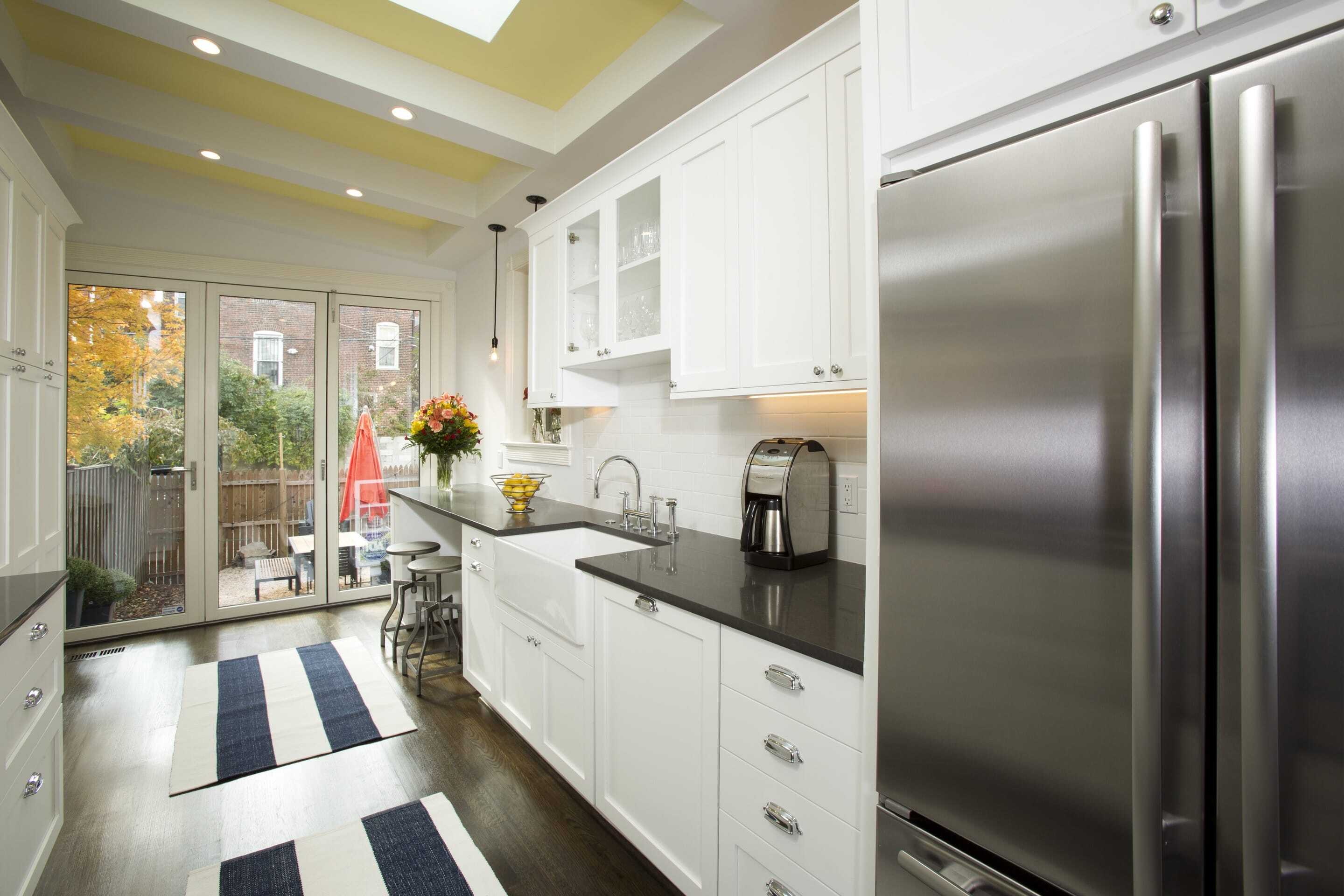 Although the whole house needed attention, our plan was to phase the full remodel. We decided to start with the first floor and systems (plumbing, electrical, HVAC), but developed a comprehensive plan so as to avoid do-overs when we moved to the floors above. There were several things that were important to the homeowners: They wanted an open floor plan, needed lots of light, and wished for a tasteful mix of classic and contemporary finishes. Our design team quickly established that it would be necessary to gut the entire first floor, raze and rebuild the rear addition and significantly reconfigure the floor plan. The only items to remain in their existing locations were the staircase and exterior walls. Our designers were thrilled for the opportunity to work with this completely blank slate, and quickly developed a number of layout options. After several rounds of revisions (directed by feedback from the clients), the new layout was finalized. It included an open front room with a new fireplace, a galley kitchen in the new addition that doubles as an eating area and entrance to the back yard. Partition walls were all but eliminated to achieve an open feeling and skylights were added in the kitchen. To further enhance the natural light, the entire back of the new addition was designed as a retractable, glass Nanawall.