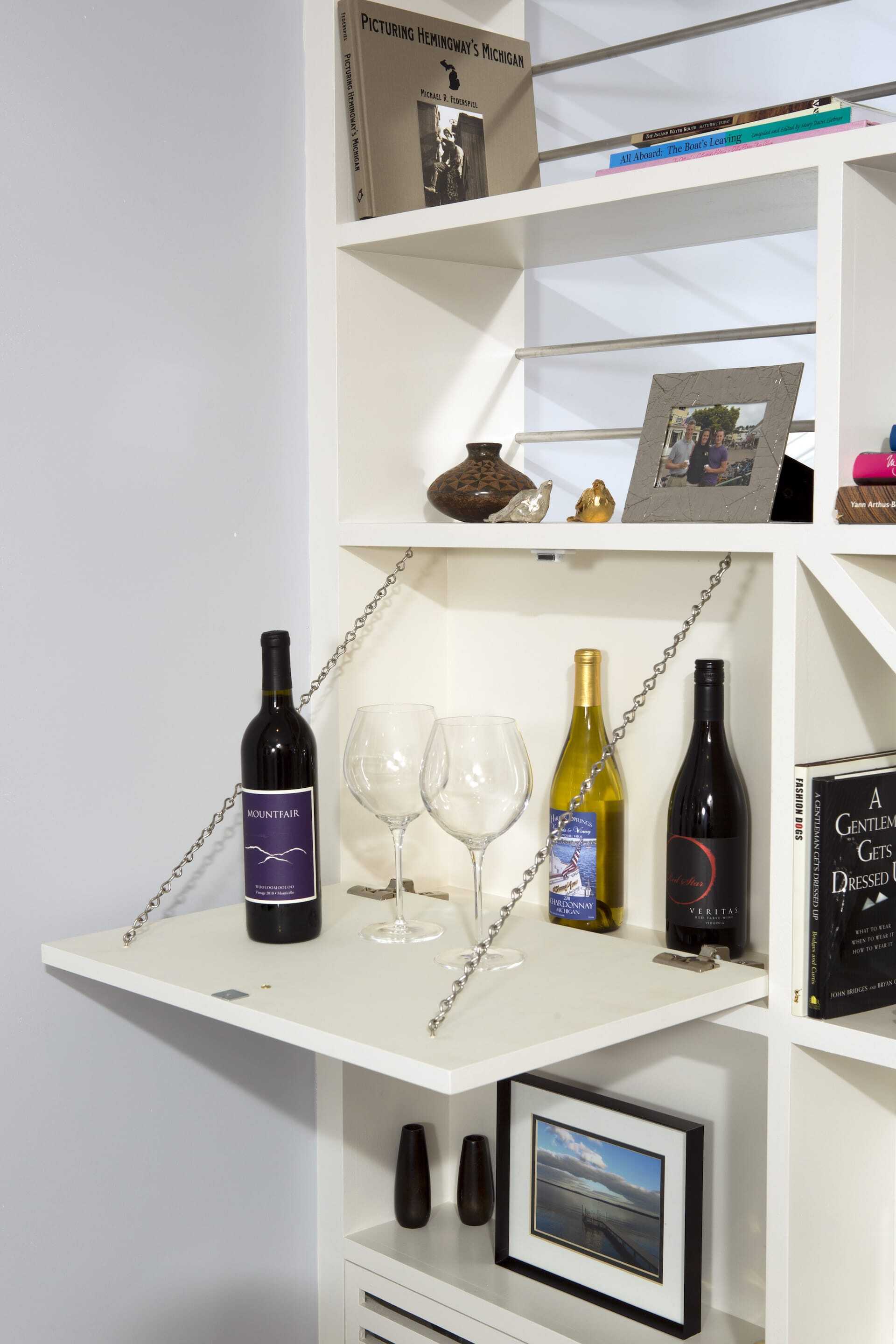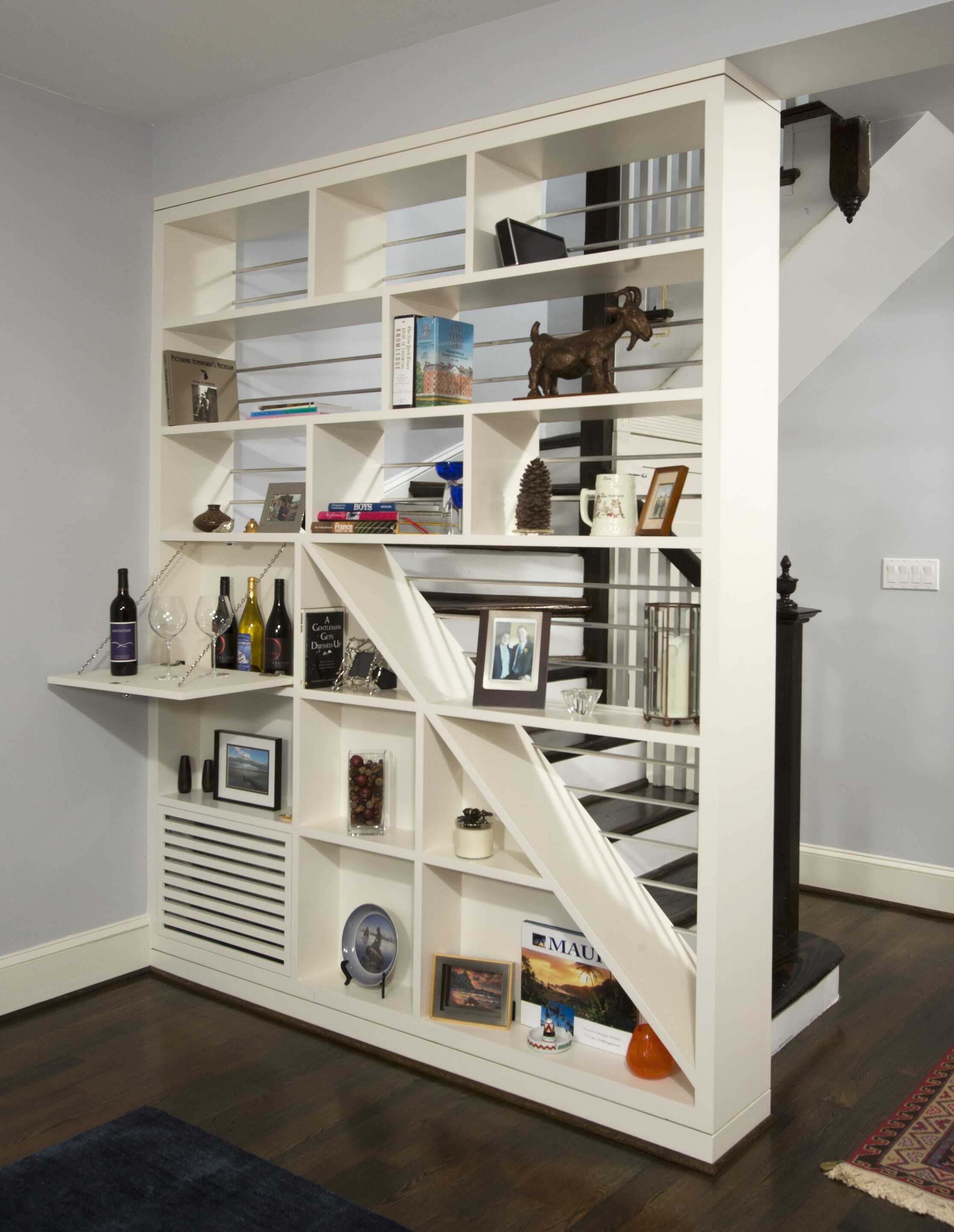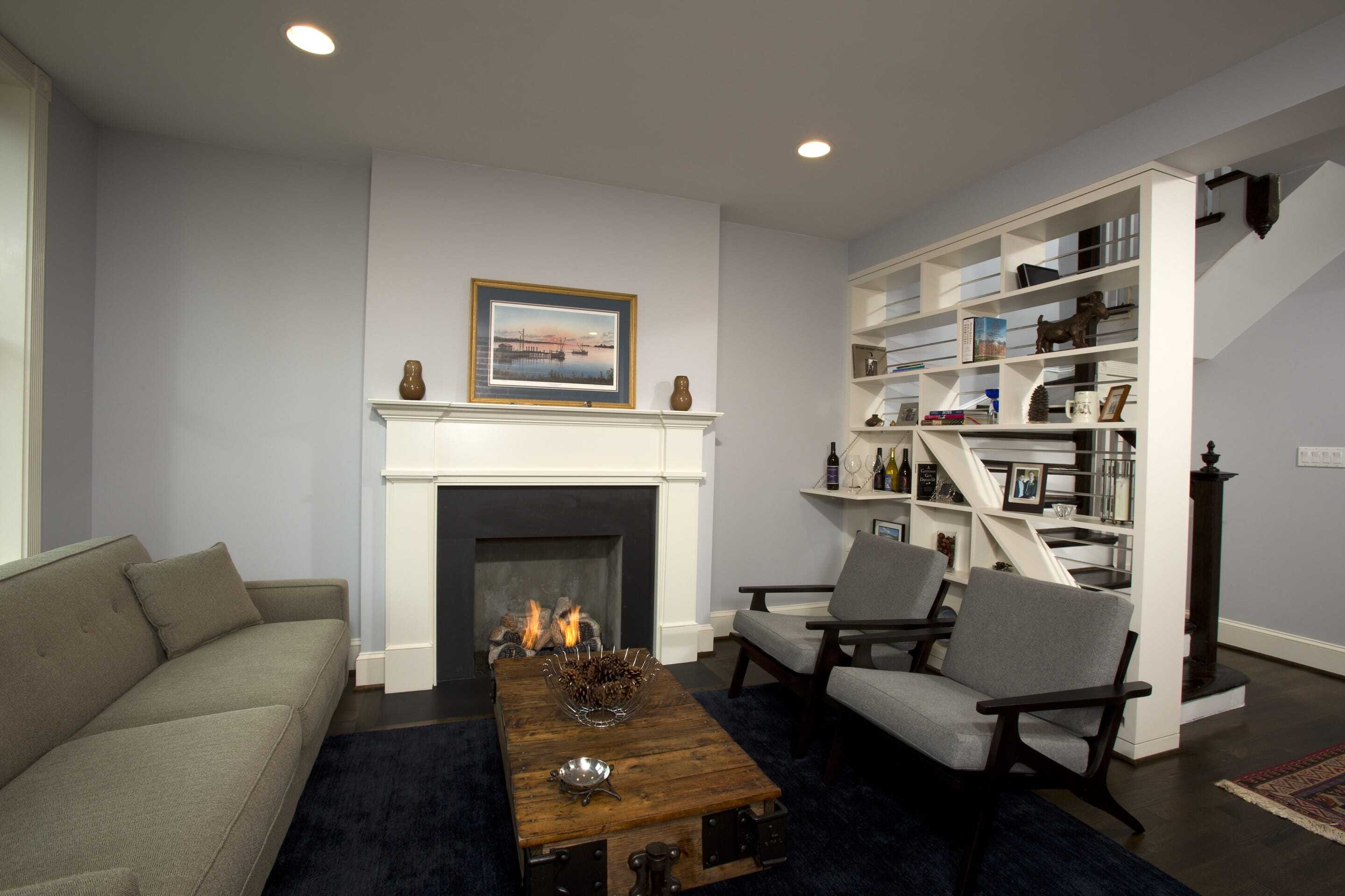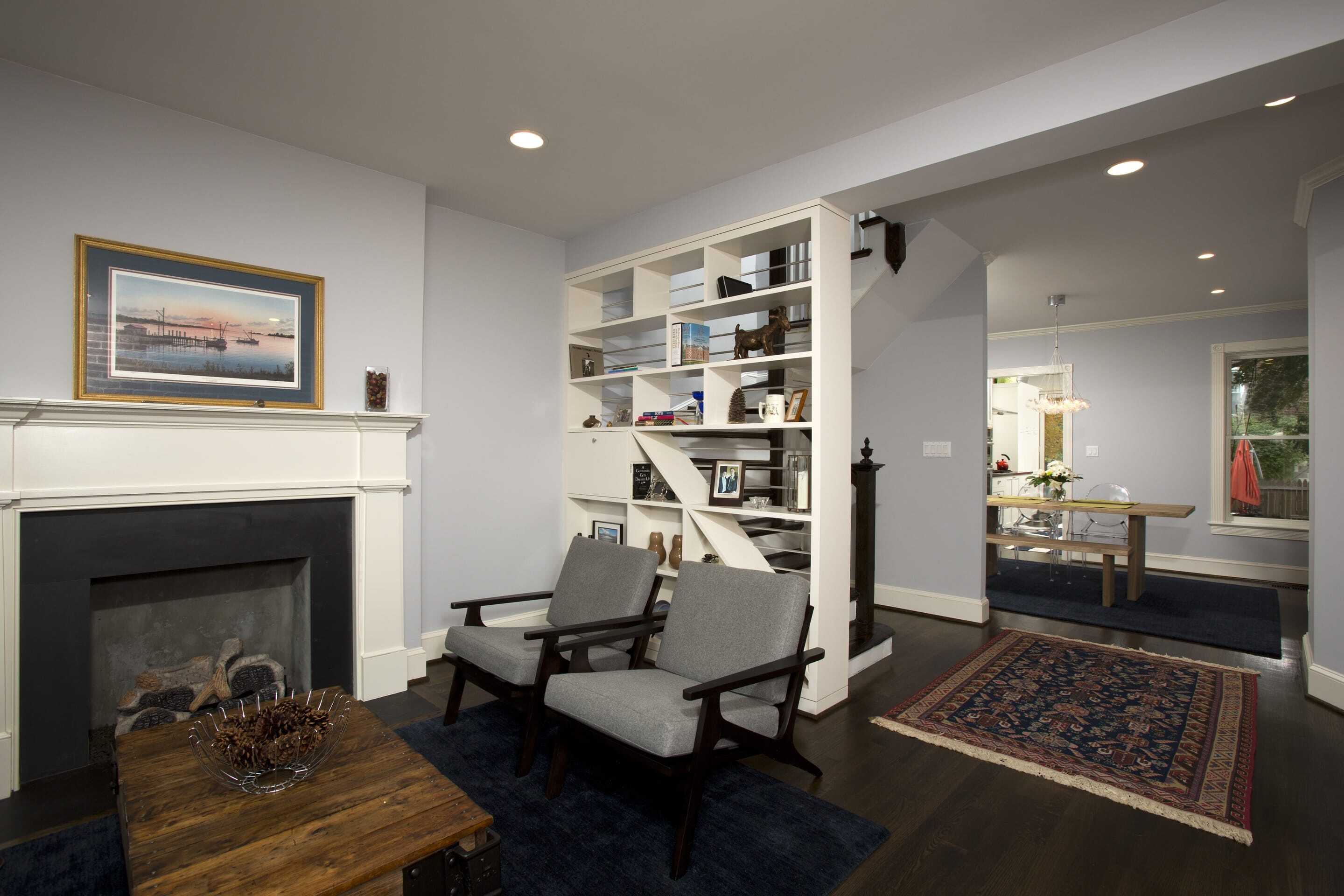 For the kitchen, we selected white Shaker style cabinetry, dark Caesarstone countertops a subway tile back splash and a large farmhouse sink. The paint colors are light and cheerful, and a stained oak floor provides consistency and ties the first level together as a continuous space. New lighting (recessed and accent) was installed in all the rooms, and vintage pendants hanging from the coffered kitchen ceiling give a nod to the classic style of the era from when the home was built. The finishing touch was the custom cabinetry piece we built and installed in place of the stair railing. This doubles as functional storage space and a decorative element that gives the home a “wow” factor as soon as you enter the front door.