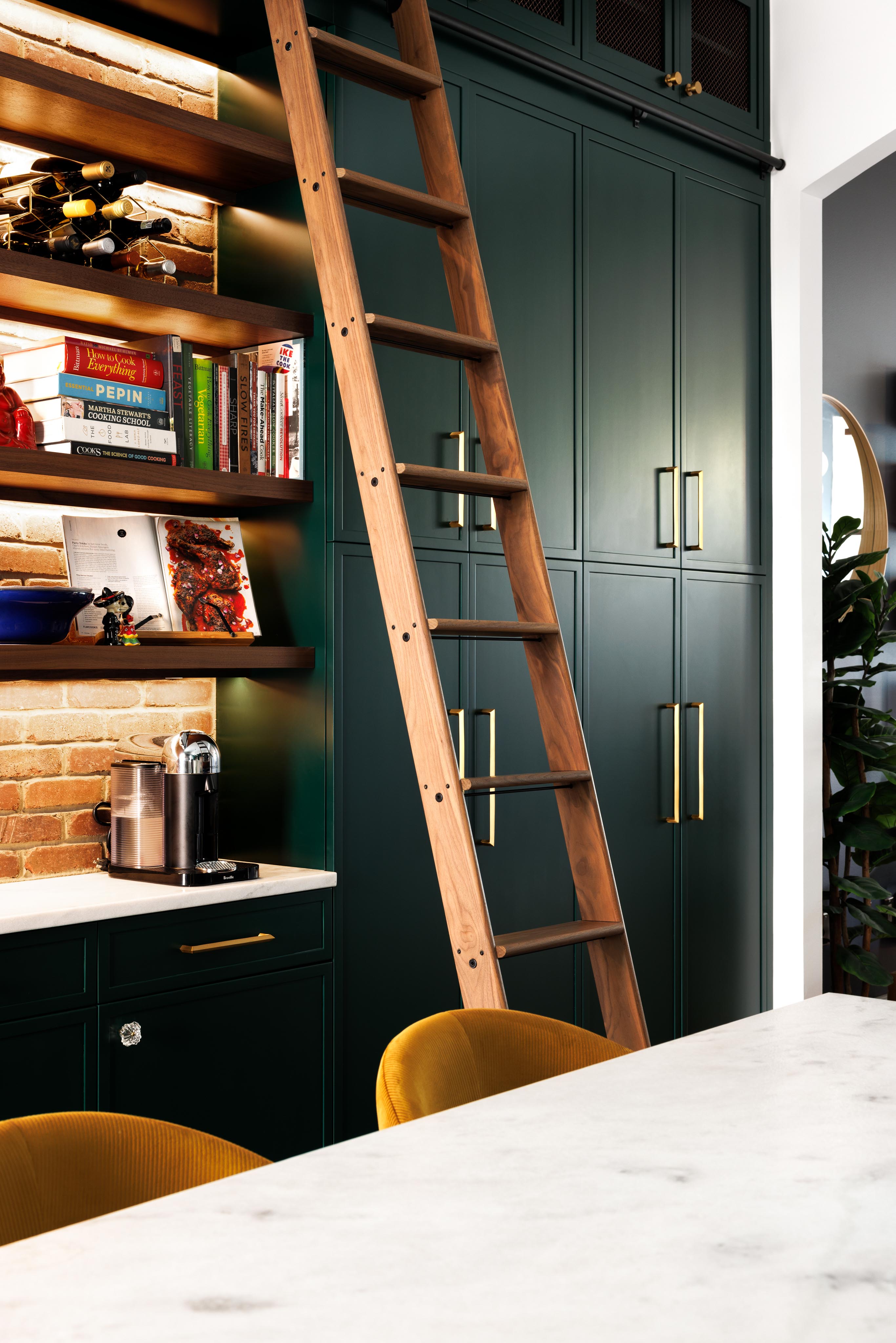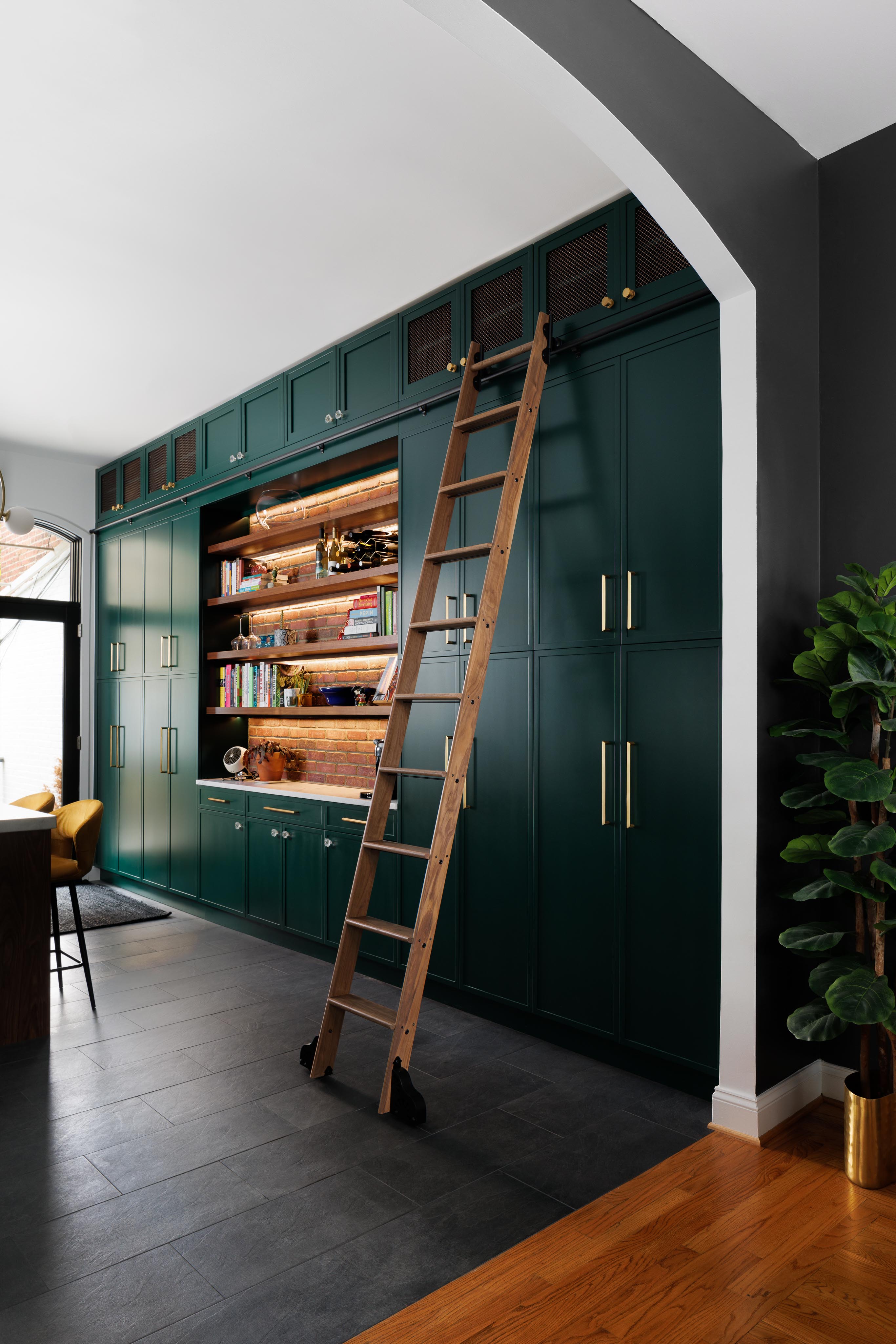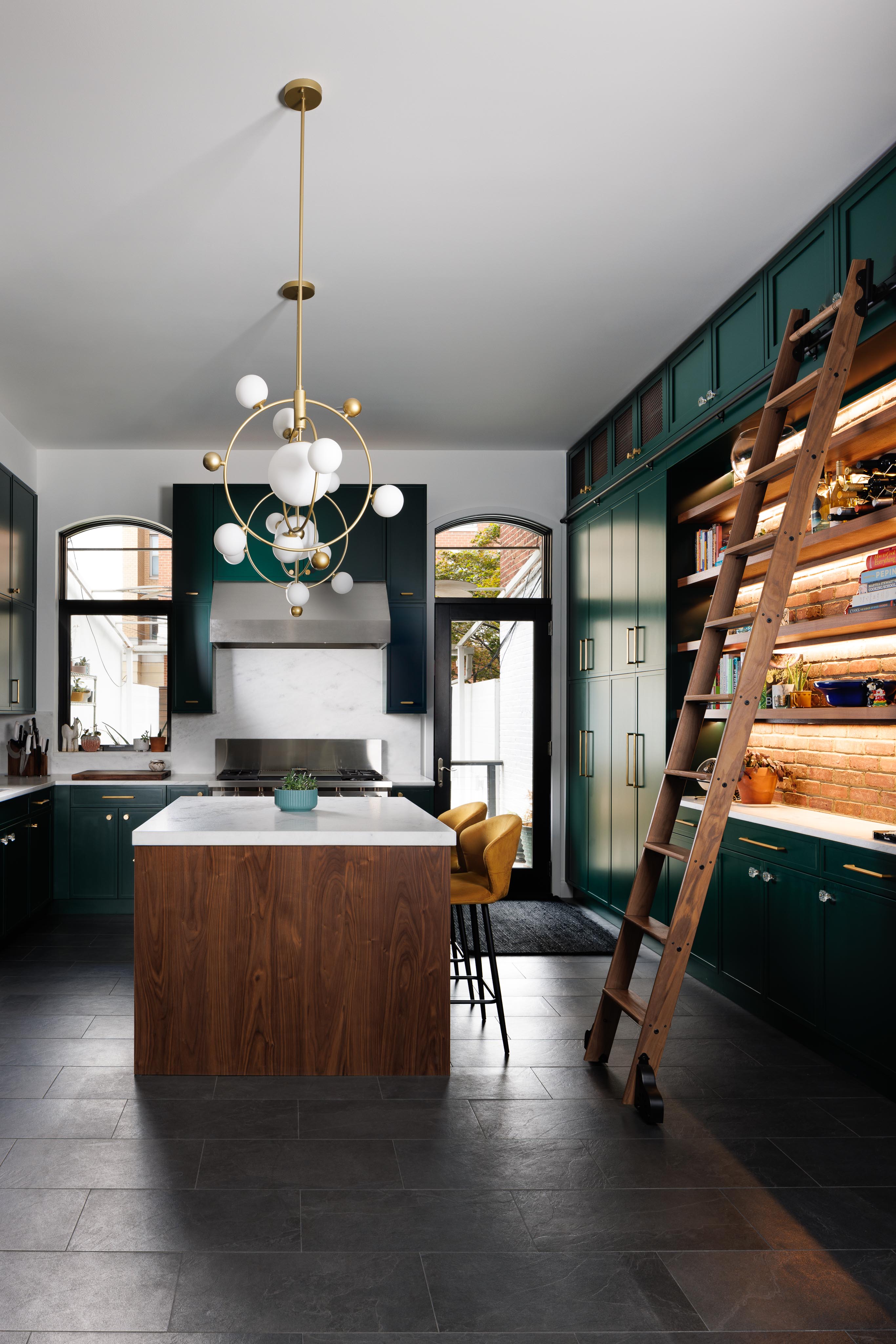 The classic black and white of the floor tile and countertops and ceiling is illuminated by the bold dark green cabinetry surrounding the room. On the wall opposite the sink, floor-to-ceiling cabinetry gives way in the center making way for stained walnut floating shelves and the exposed brick of the row home’s shared wall. Striking modern lighting and subtle shaker-esque cabinet doors update an antiquated style, situating the kitchen firmly in the present day, without compromising its historic roots.