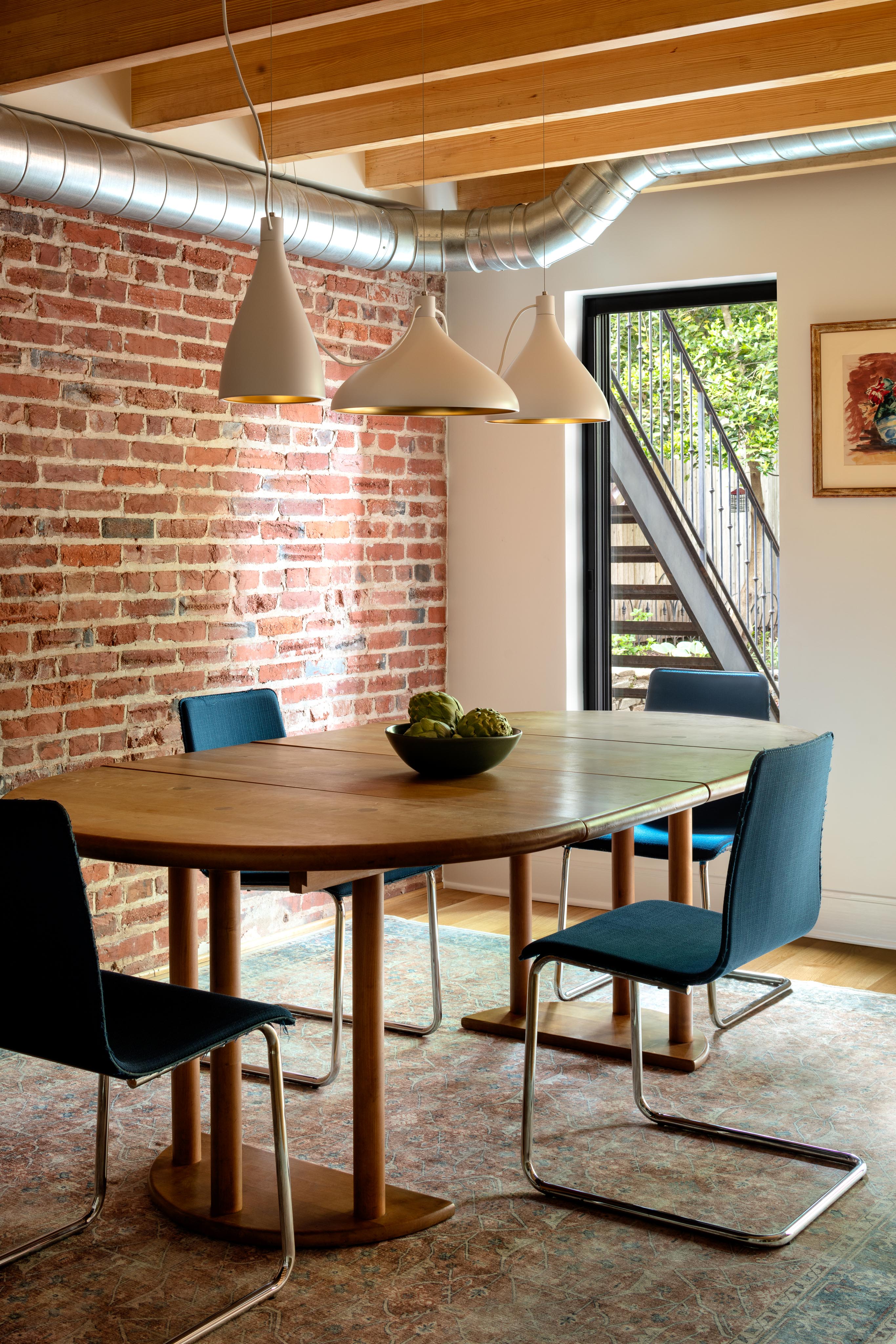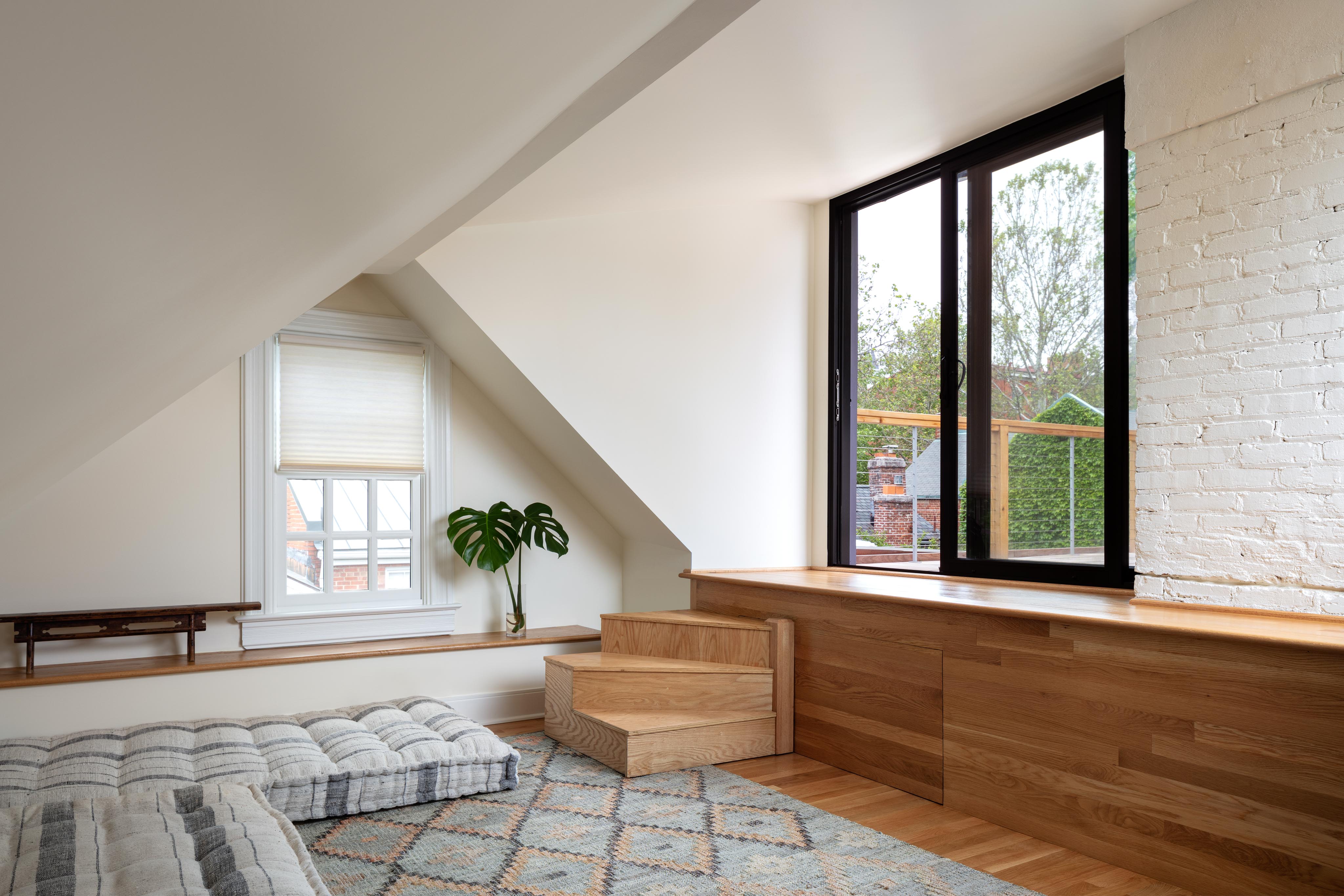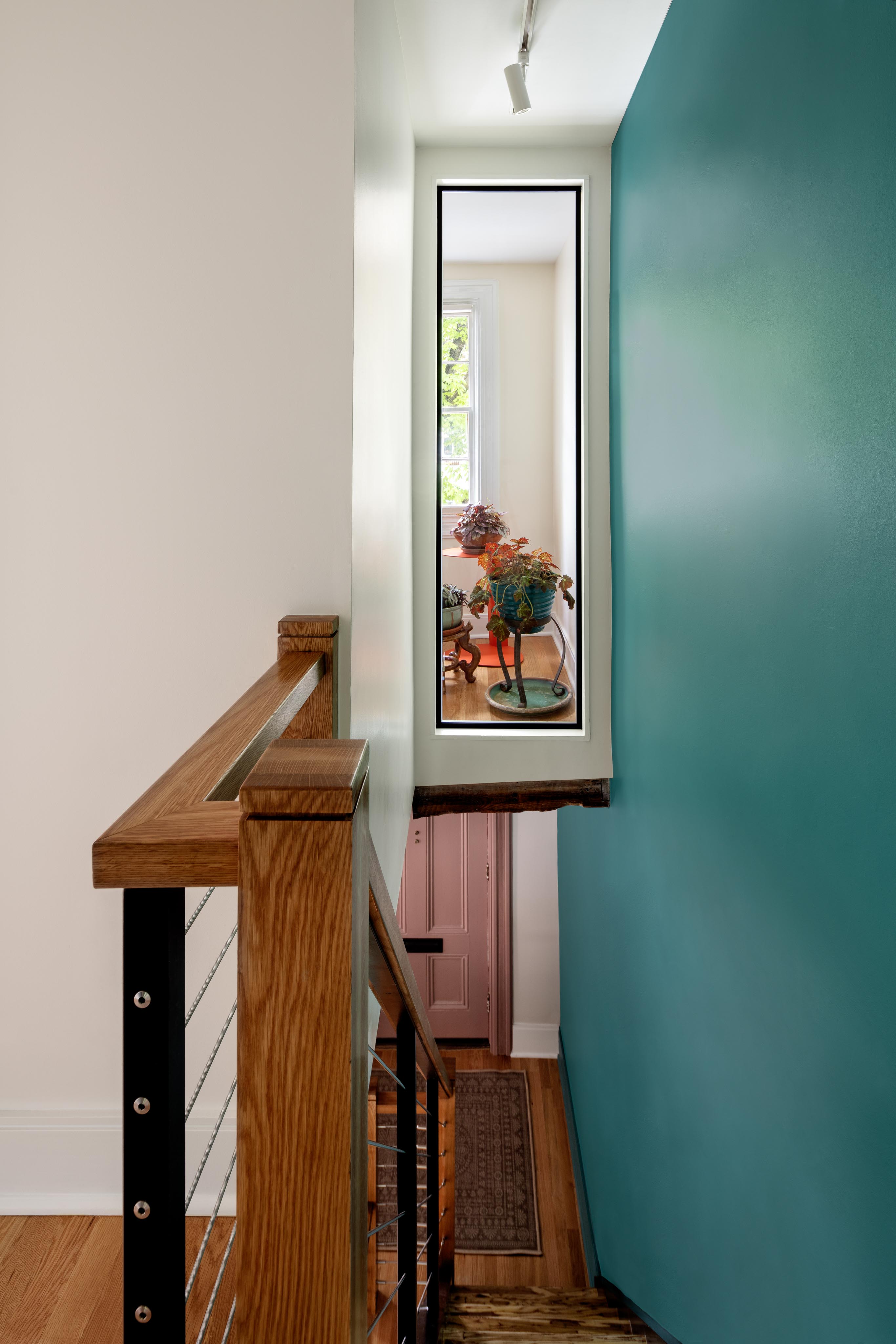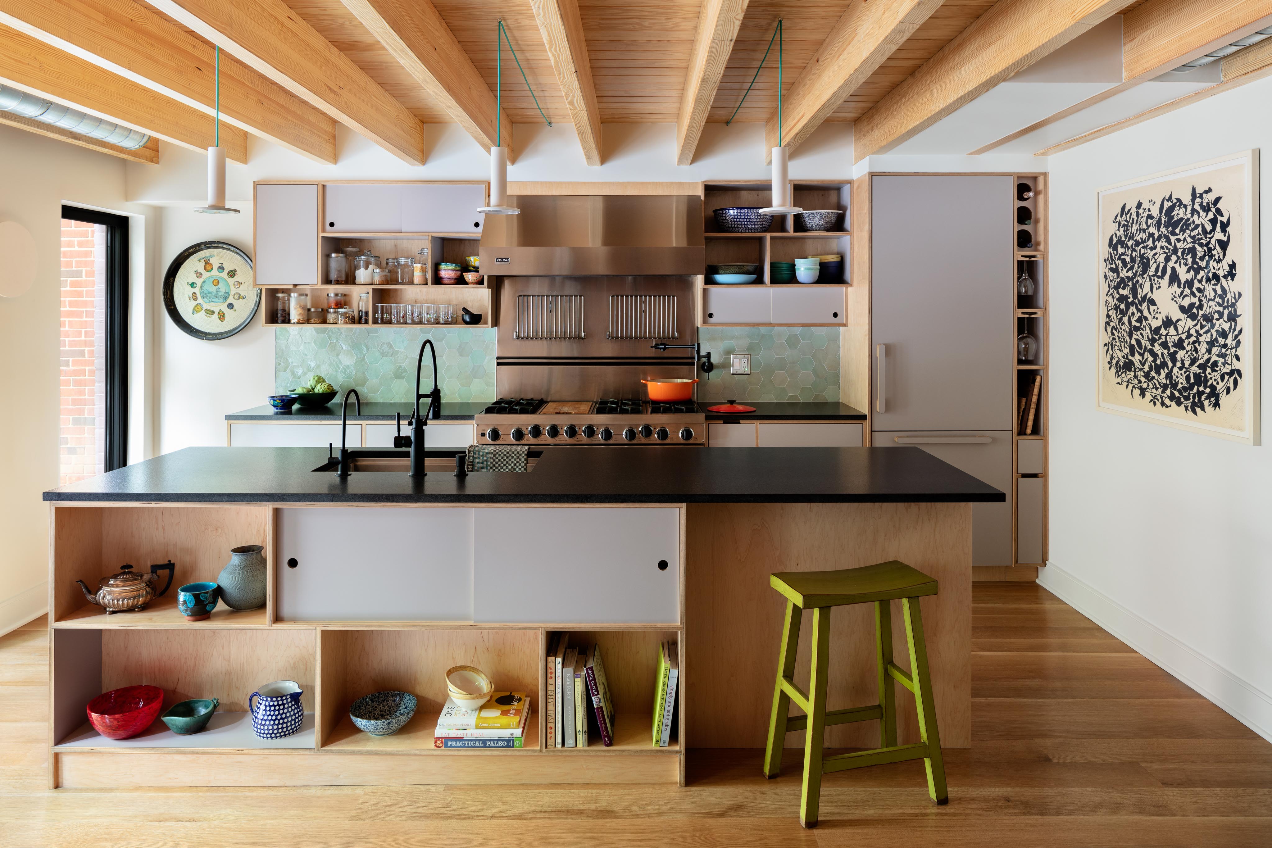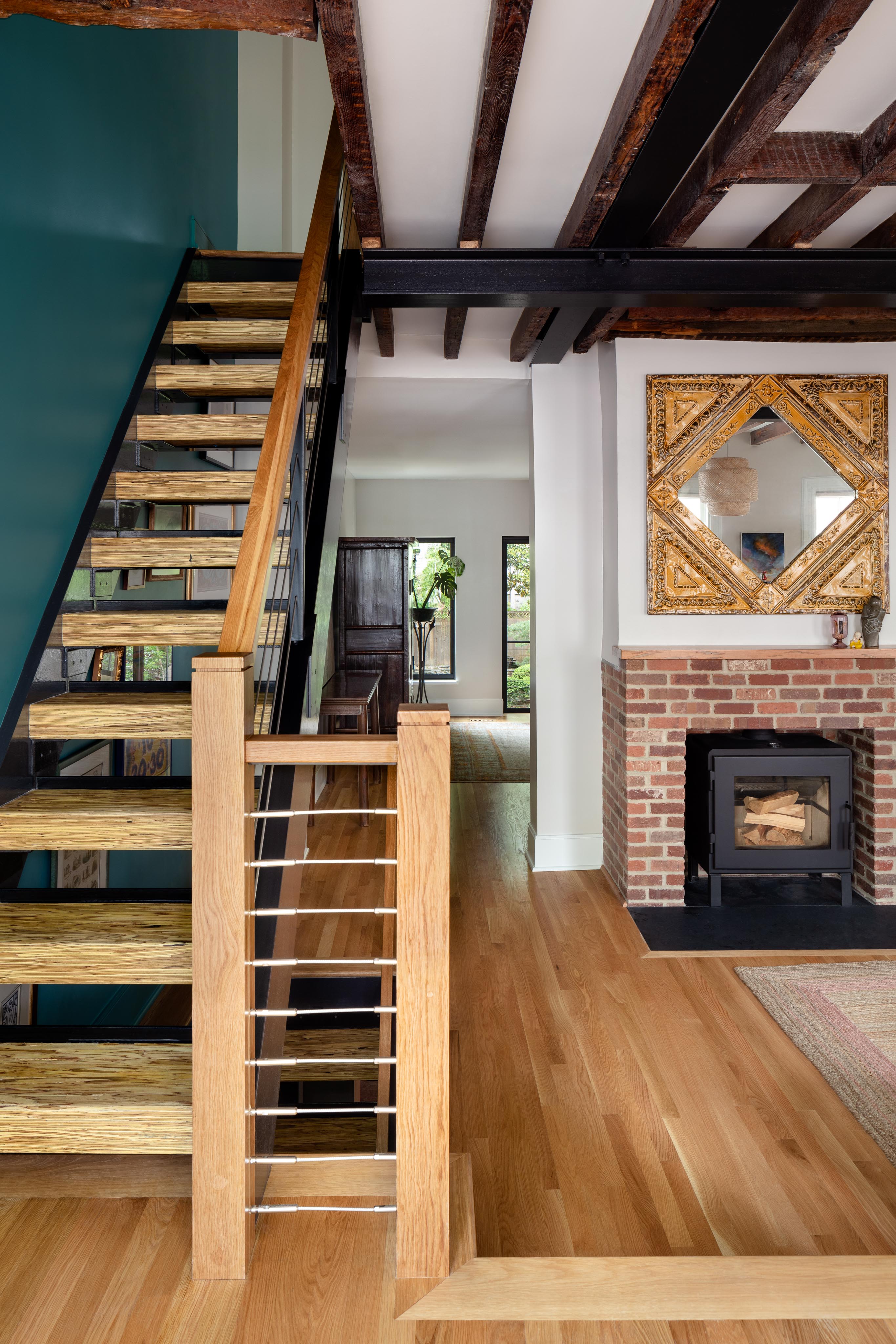 The house sits on a hill, hidden behind the row homes, and the kitchen is located at grade in the rear, one level below the entrance onto the street. Vertical space was limited by the floor above, so we elected to strip out the old joists and replace them with structural glulam timber. We were thus able to spread the joist spacing from 16” on center to 20”, and we left the subfloor exposed above, leading to an increase in perceived ceiling height. The resultant depth and rich visual texture completely transformed the room. The large island gives utility and purpose to the space, allowing for easy access to the dining area.