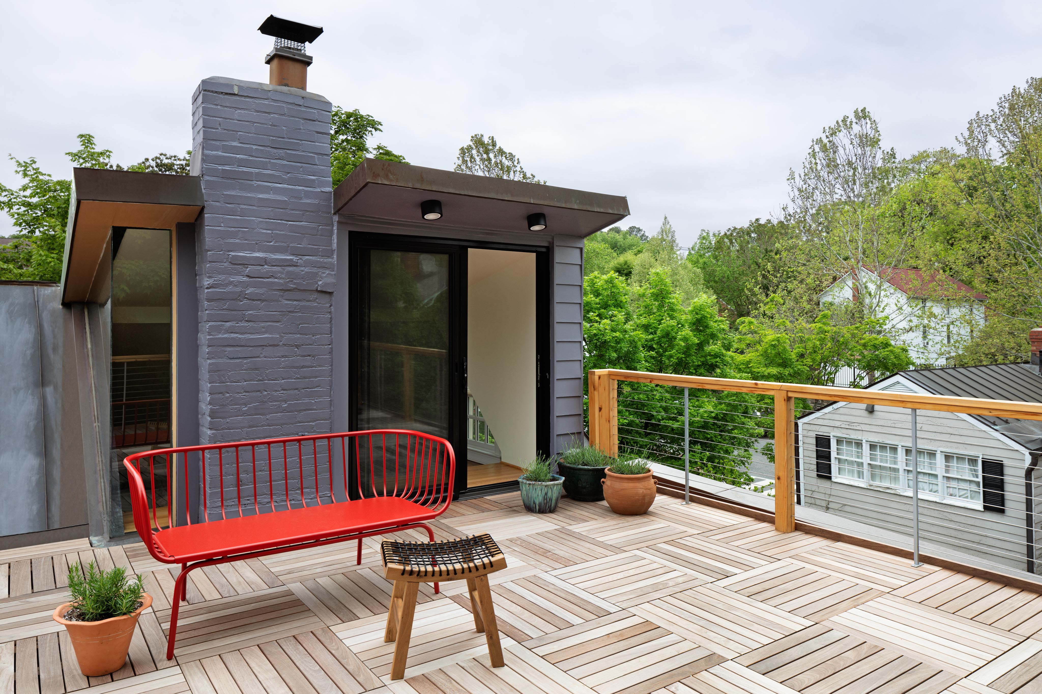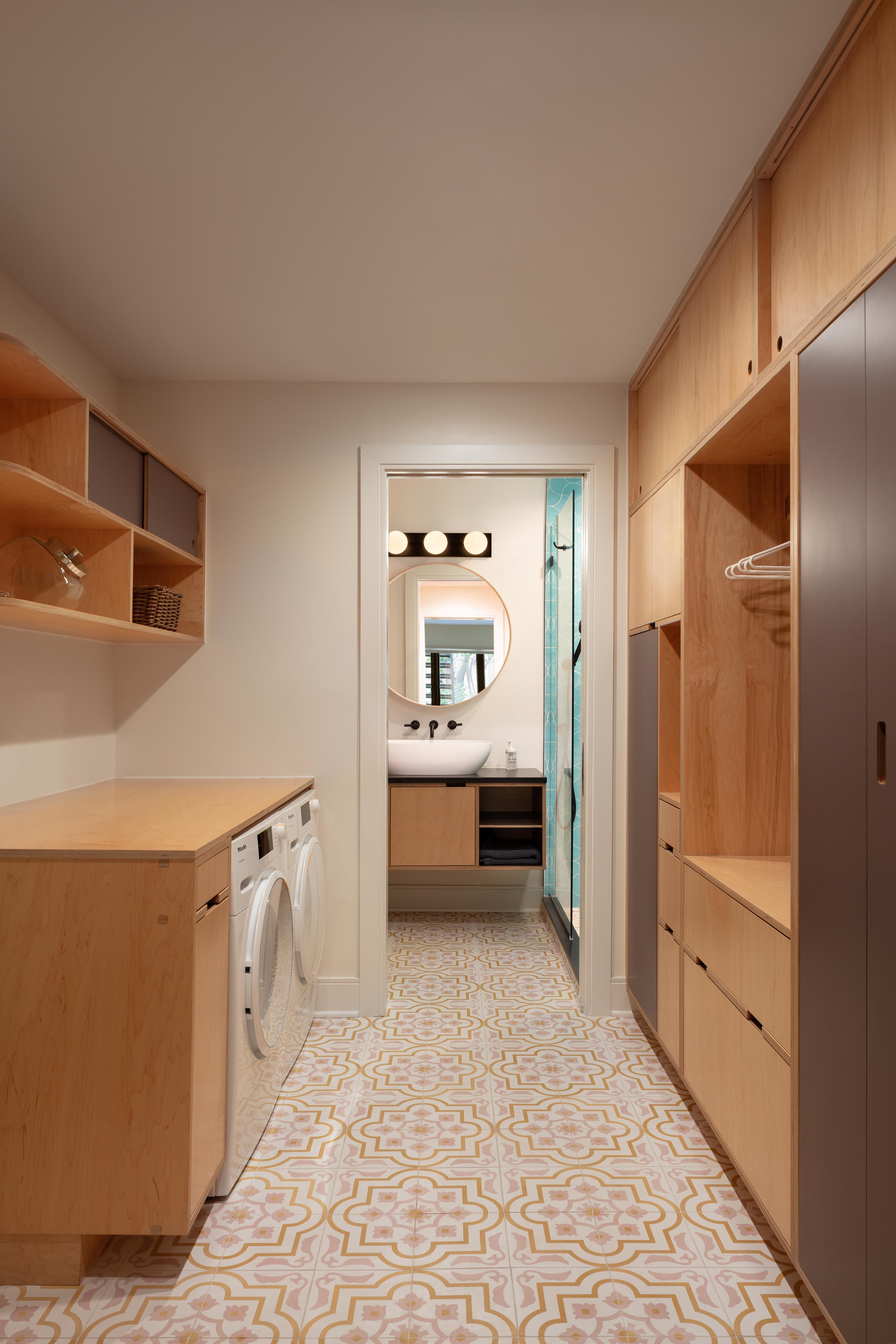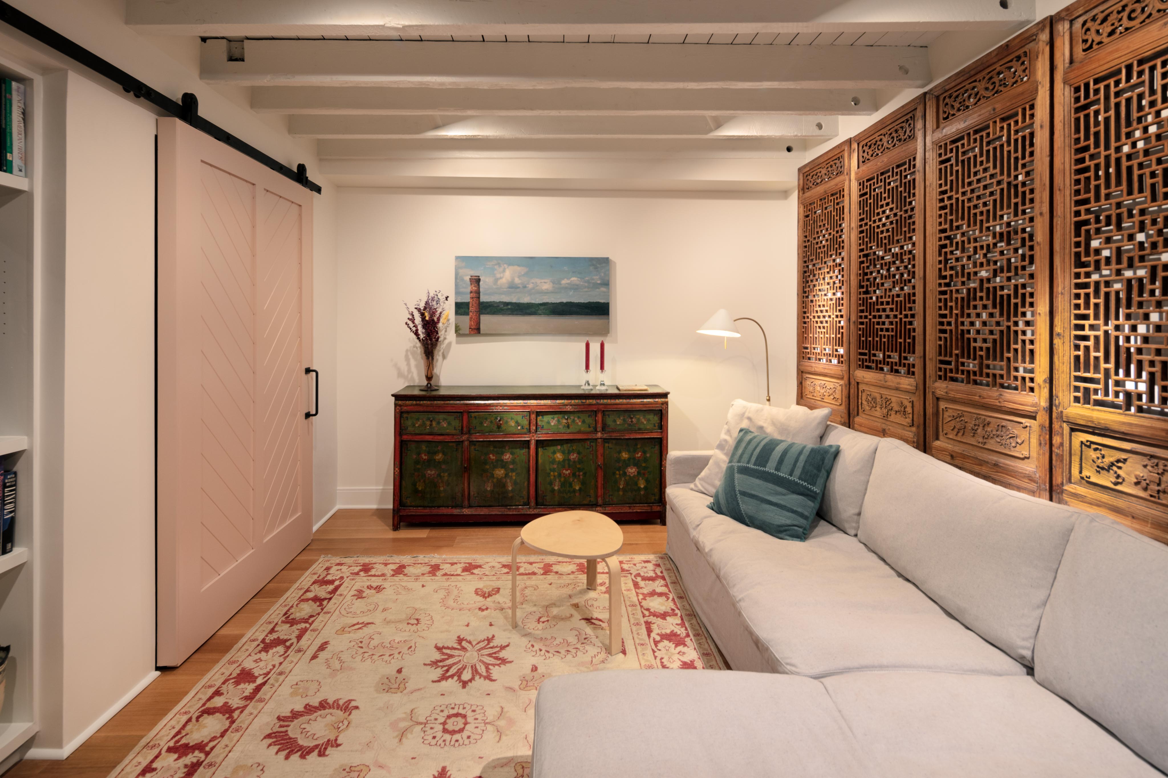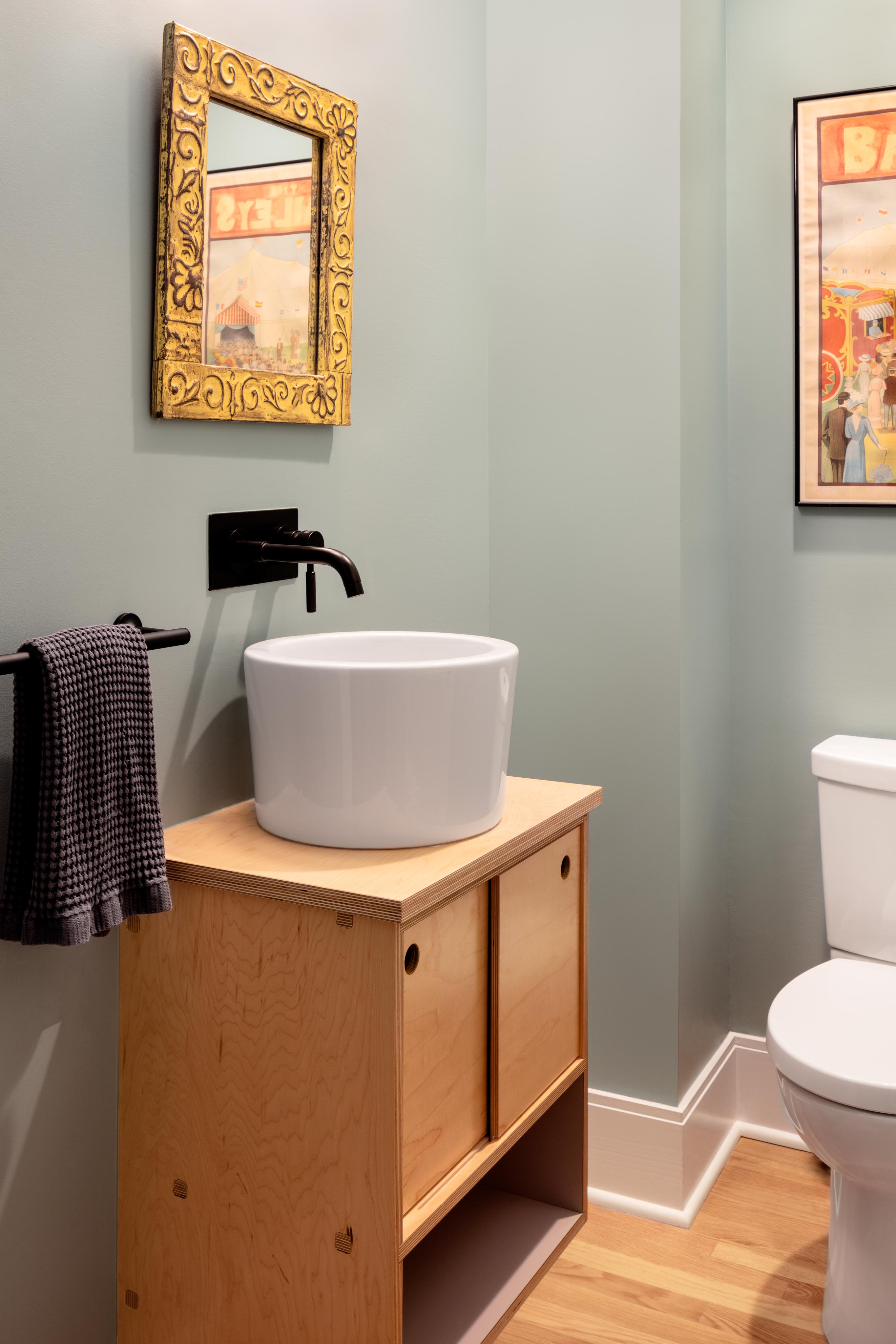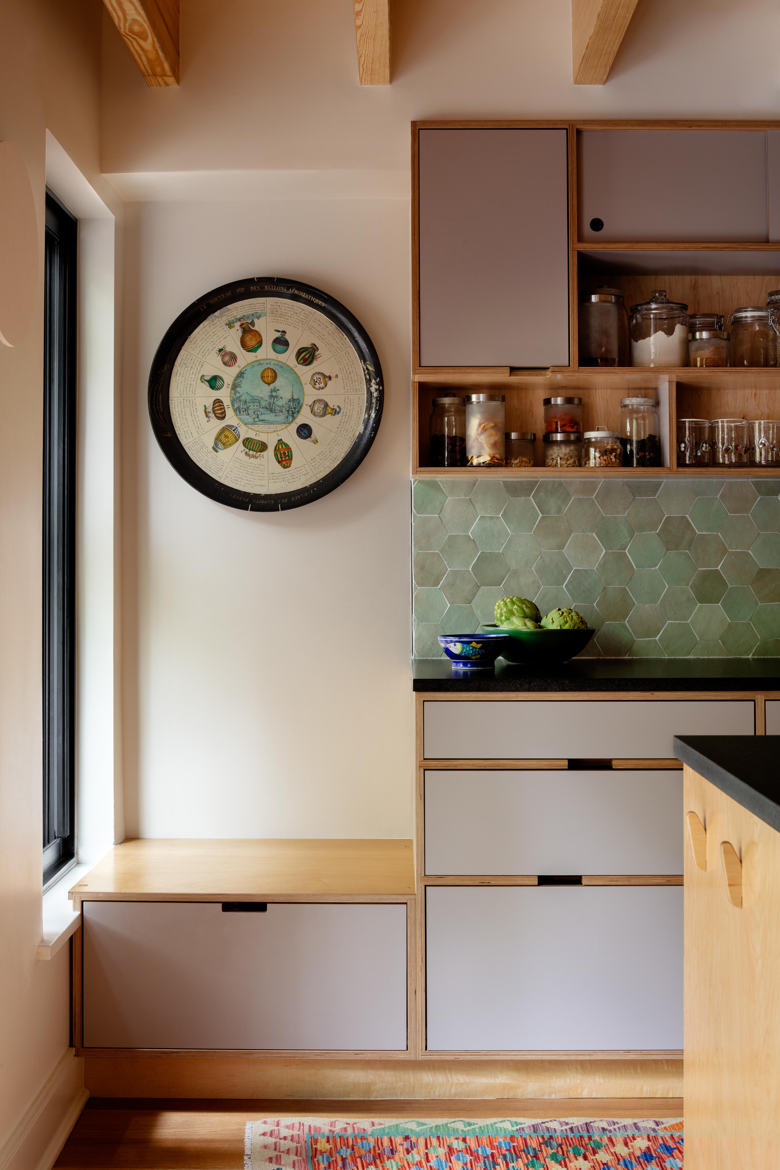 The house sits on a hill, hidden behind the row homes, and the kitchen is located at grade in the rear, one level below the entrance onto the street. Vertical space was limited by the floor above, so we elected to strip out the old joists and replace them with structural glulam timber. We were thus able to spread the joist spacing from 16” on center to 20”, and we left the subfloor exposed above, leading to an increase in perceived ceiling height. The resultant depth and rich visual texture completely transformed the room. The large island gives utility and purpose to the space, allowing for easy access to the dining area.