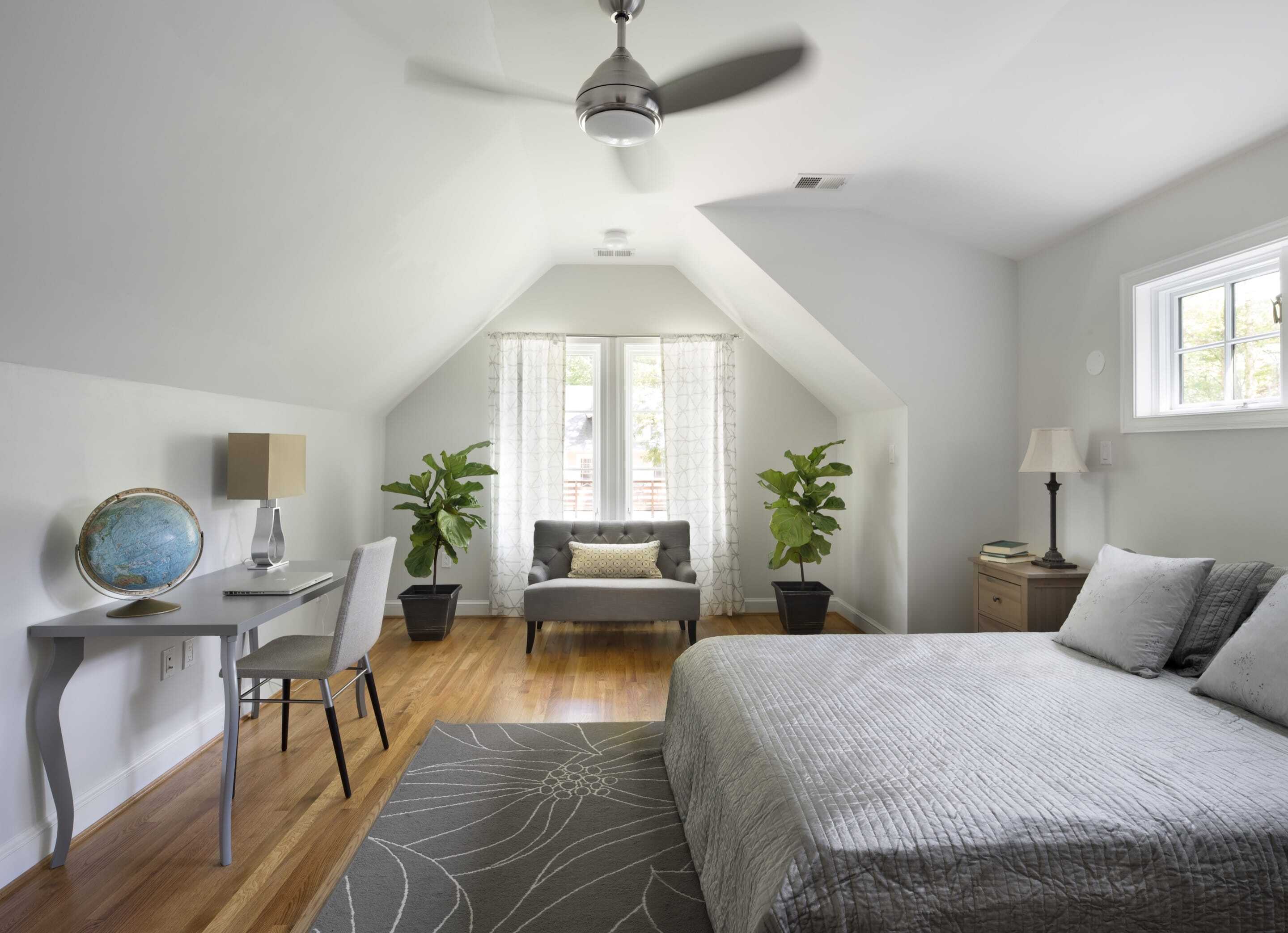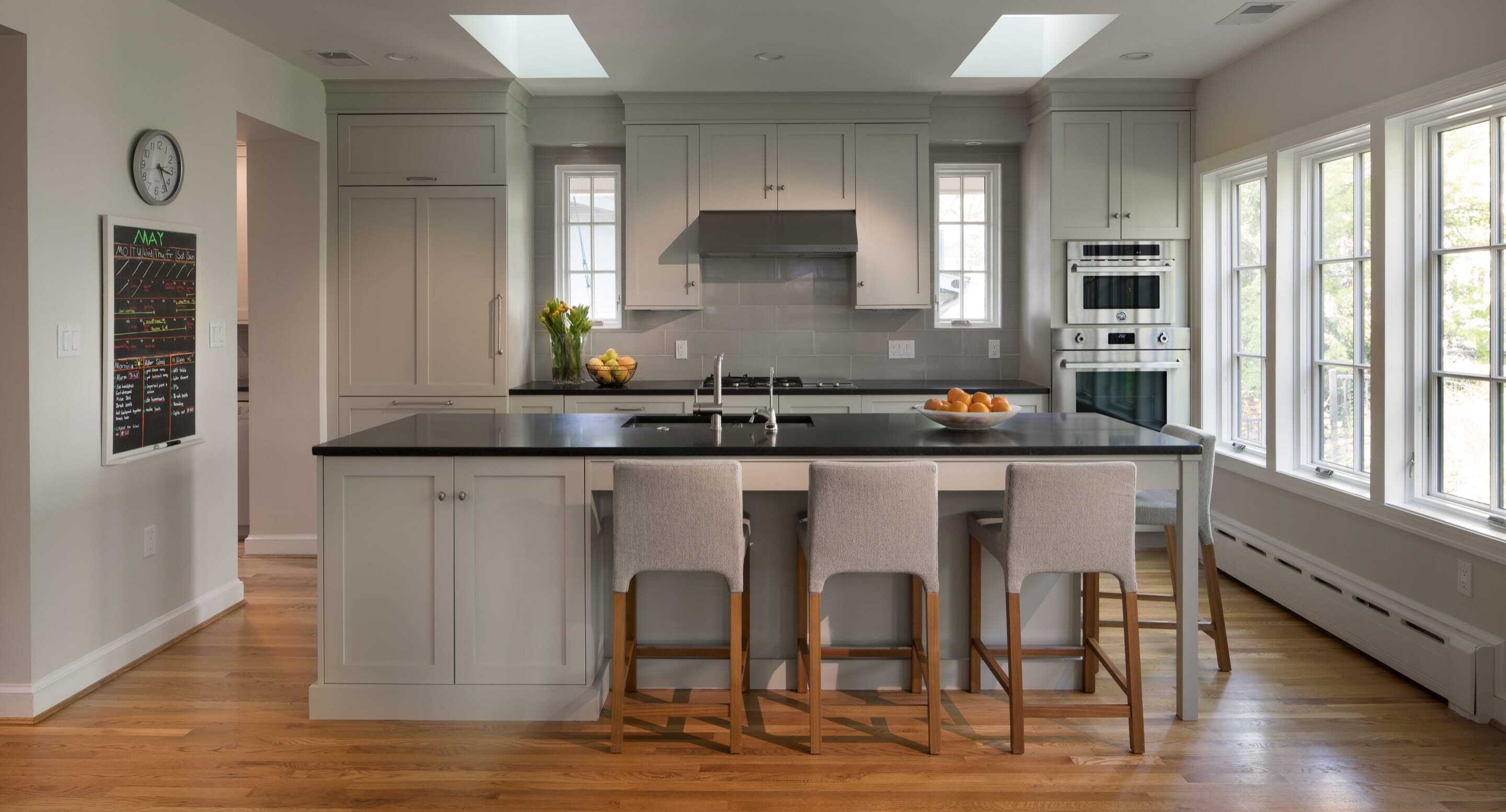 The basic solution was simple – (as it often is in the freestanding homes that cover most of the suburbs in Montgomery County) – extend the rear of the house with a remodeled kitchen on the first floor and the master bedroom and master bathroom on the second floor. More challenging was designing the home addition so as not to overshadow the existing house due to the grade change on the lot. In addition, the Town of Chevy Chase has zoning restrictions that apply and are often stricter than what is required for a remodel in Montgomery County generally. The kitchen ended up completely in the new addition with the butler’s pantry and powder room in the old house. The most efficient layout for the kitchen ended up being a single row of cabinetry against one wall with an island with seating. The second floor occupied a smaller footprint, with a gabled roof and dormers on both sides to provide adequate headroom. To achieve a connection with the rear yard, French doors and floor to ceiling windows were installed at the back of the addition.