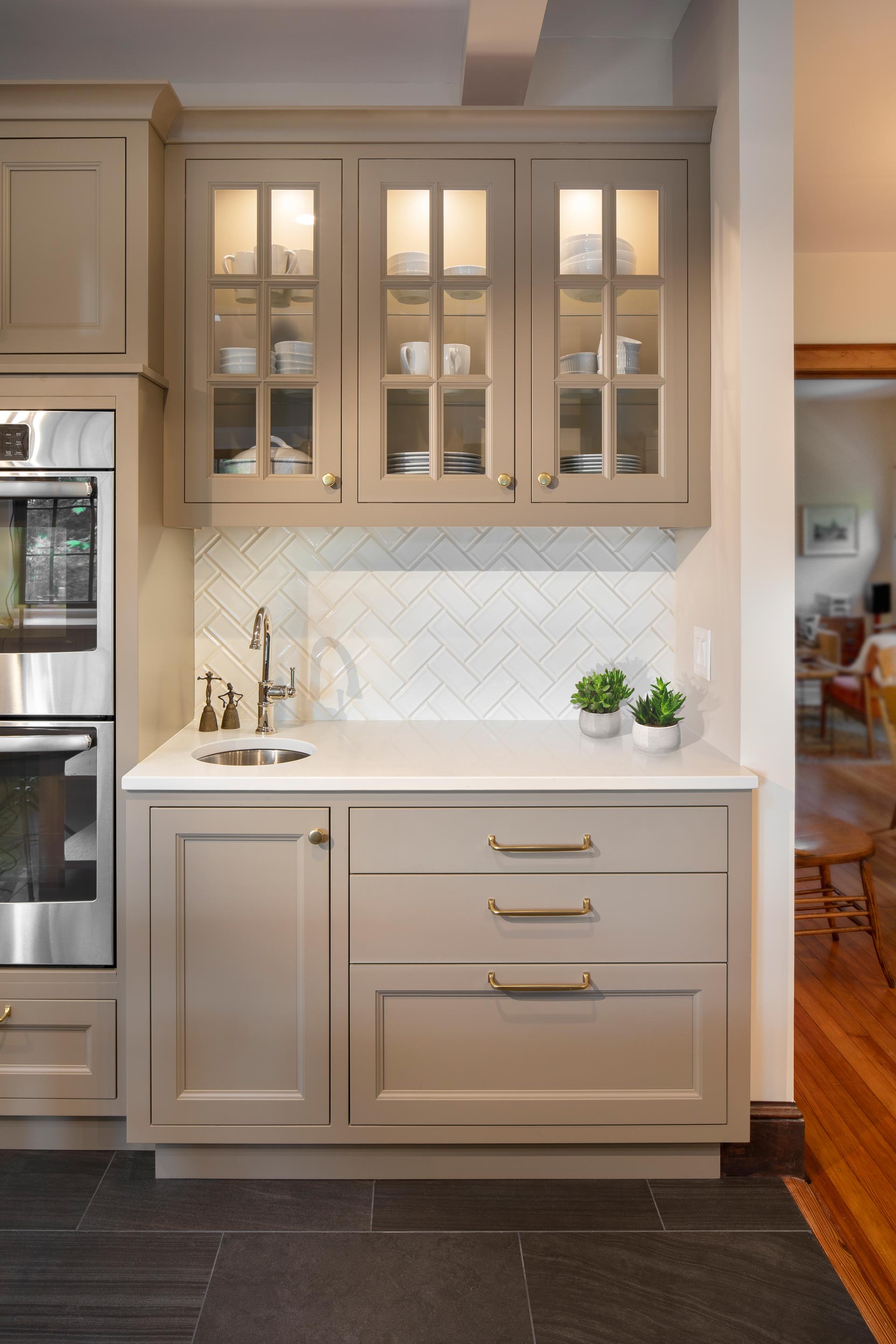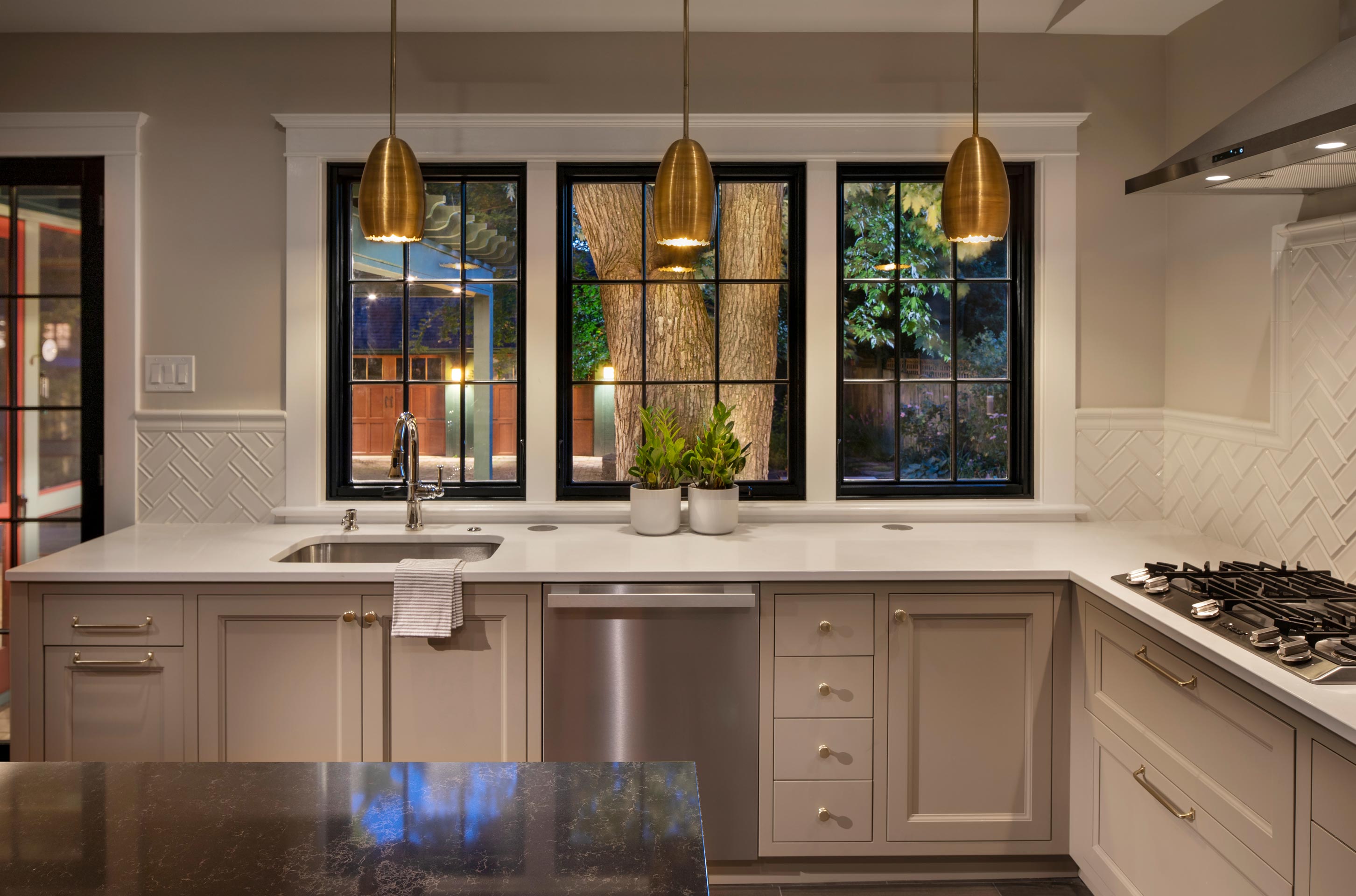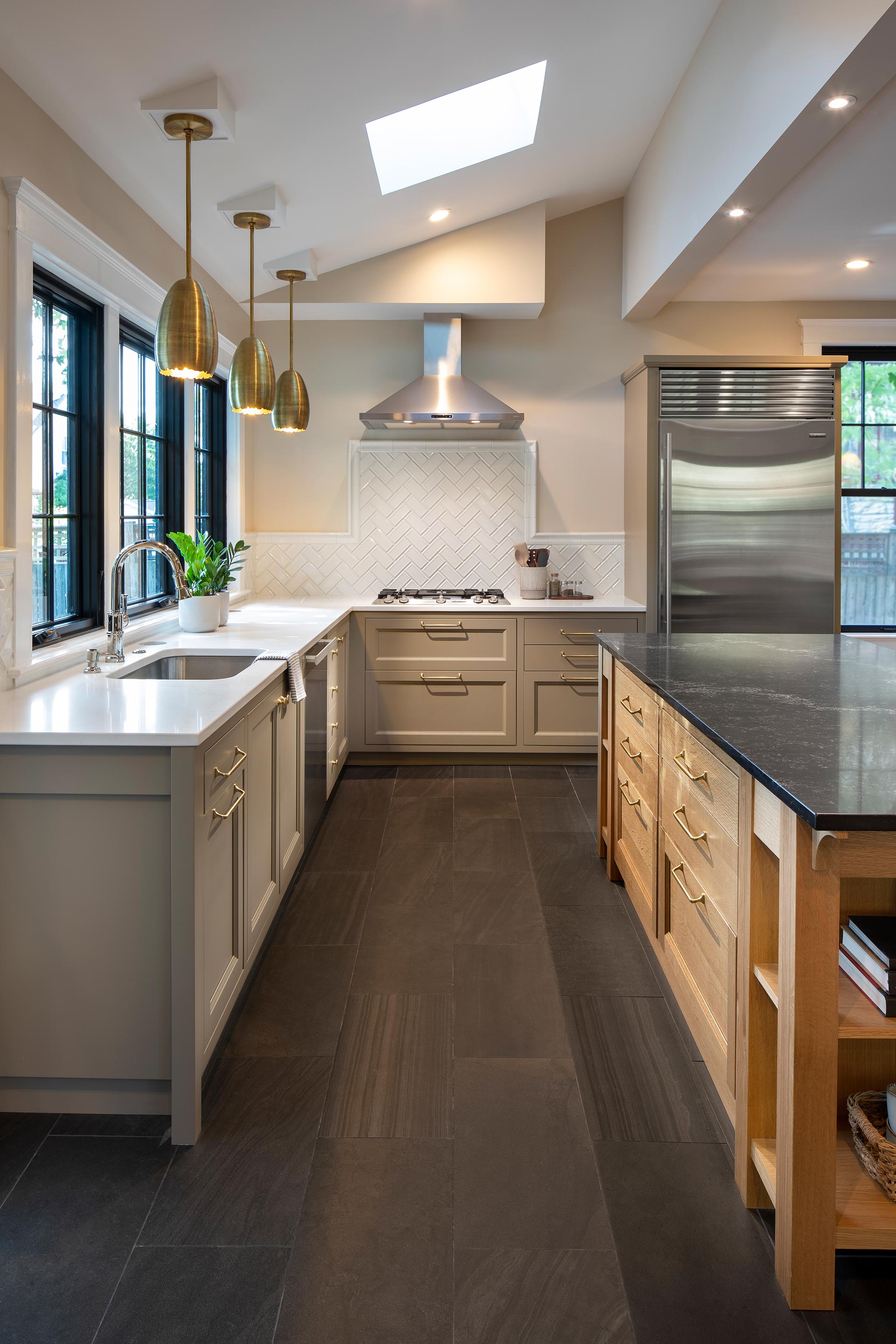 We were careful to match the existing exterior style, using the same cedar shake siding, and extending the trim color to encompass the entire screened-in porch. For durability and a sleek look, we chose standing seam metal roofing for the porch addition. Inside, a heated gray slate floor in the kitchen keeps it comfortable throughout the year, and warm white oak accents complement the soft neutral cabinets. Plenty of windows and a skylight ensure natural light, and the black and white window/trim combination draws attention to the views out to the back. With the porch, we created an accessible and comfortable 3-season outdoor space, which easily links the kitchen and garden.