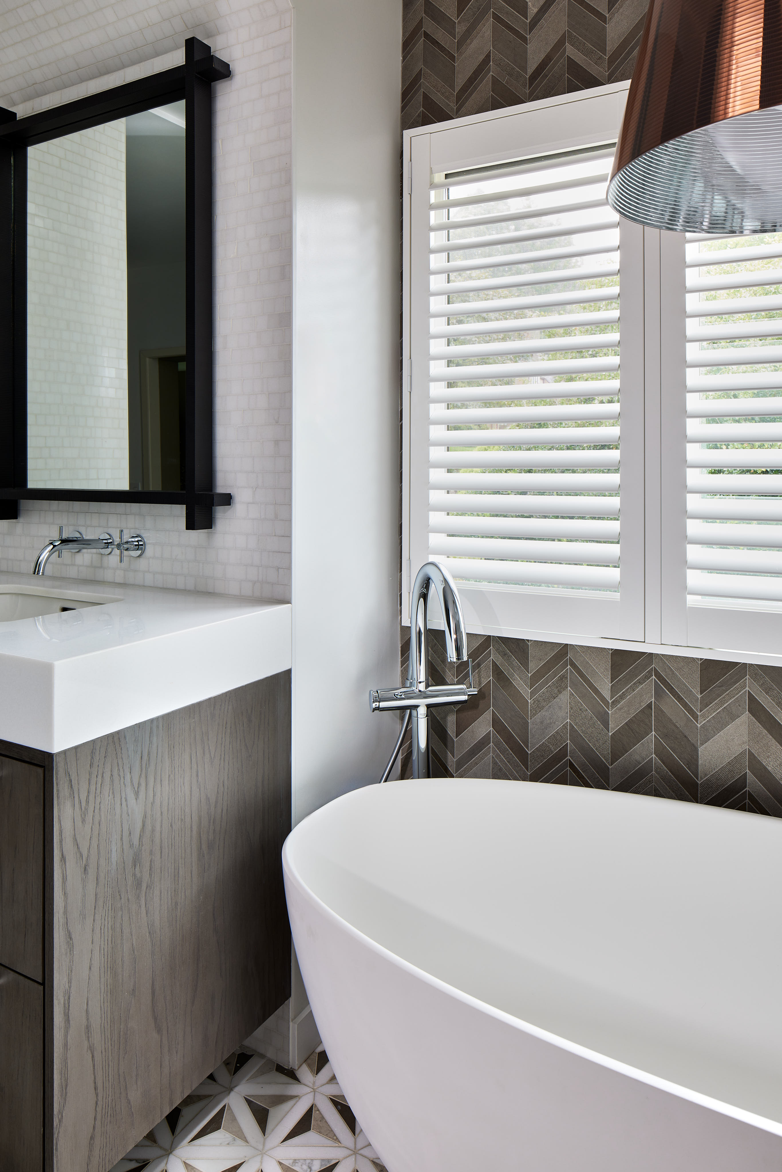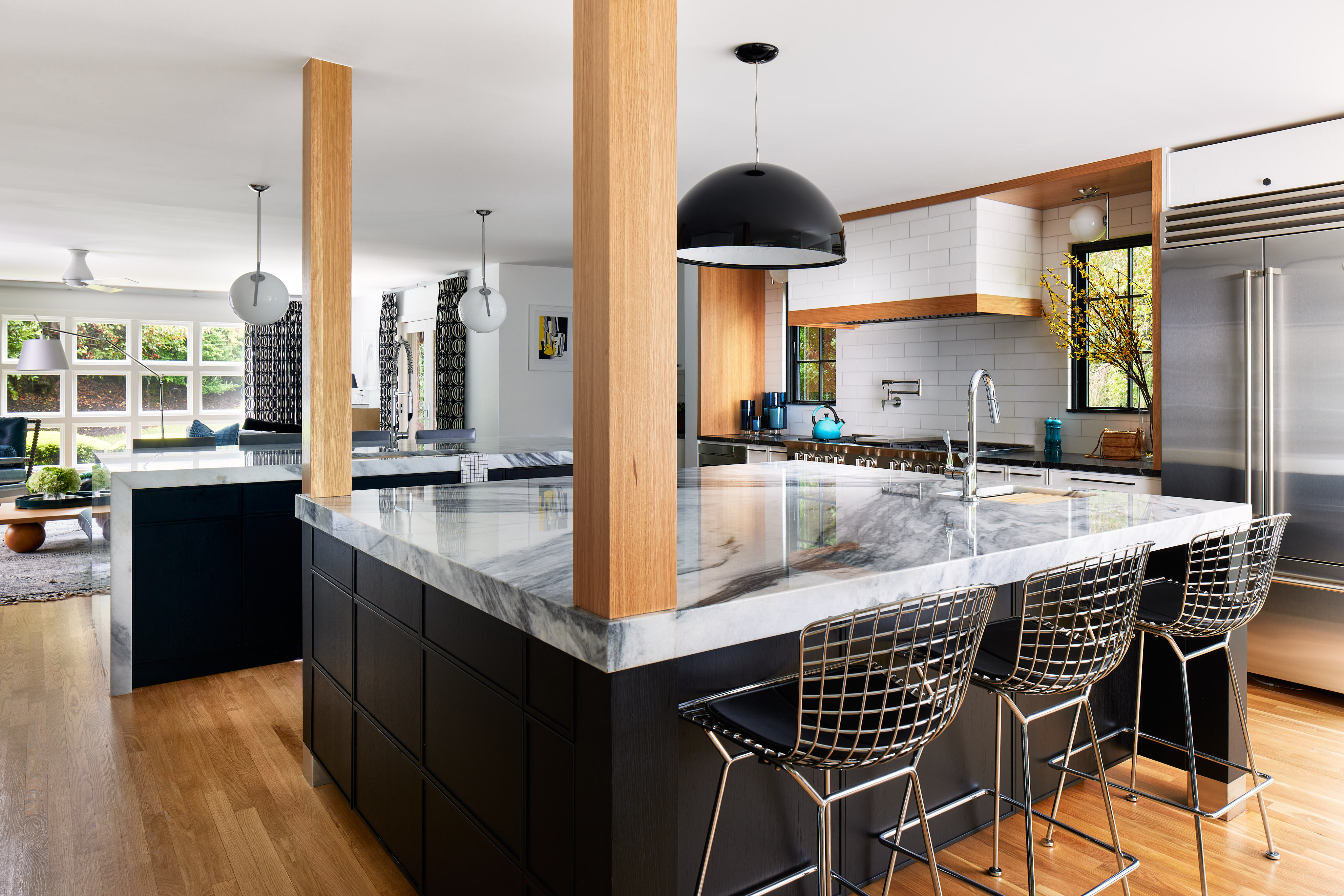 White and gray veined marble, black accents, and wood trim characterize our targeted aesthetic. In the kitchen, polished chrome fixtures add brightness to the look, and the rift-cut oak trim brings a cheery warmth. The fireplace, clad in marble tile with a custom black granite surround and hearth extension brings a solidity to the great room, helping anchor the vaulted ceilings while remaining consistent with the visual theme of the house.