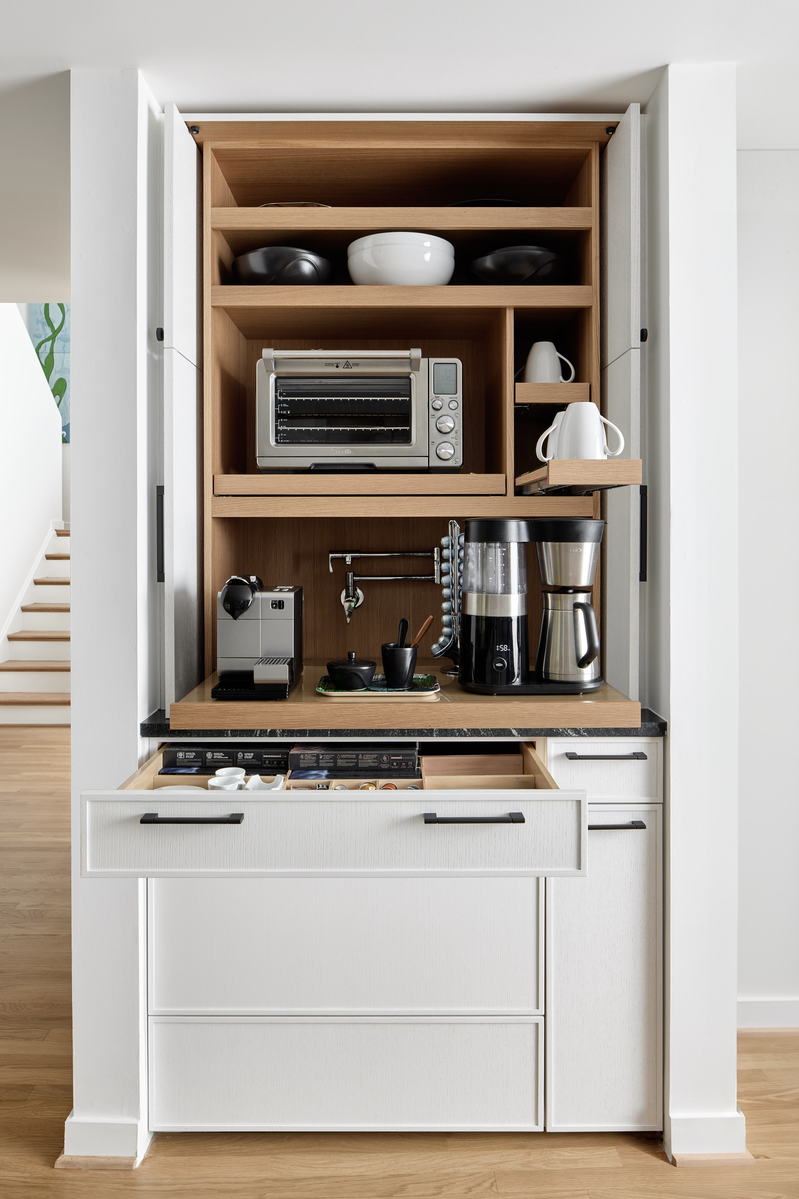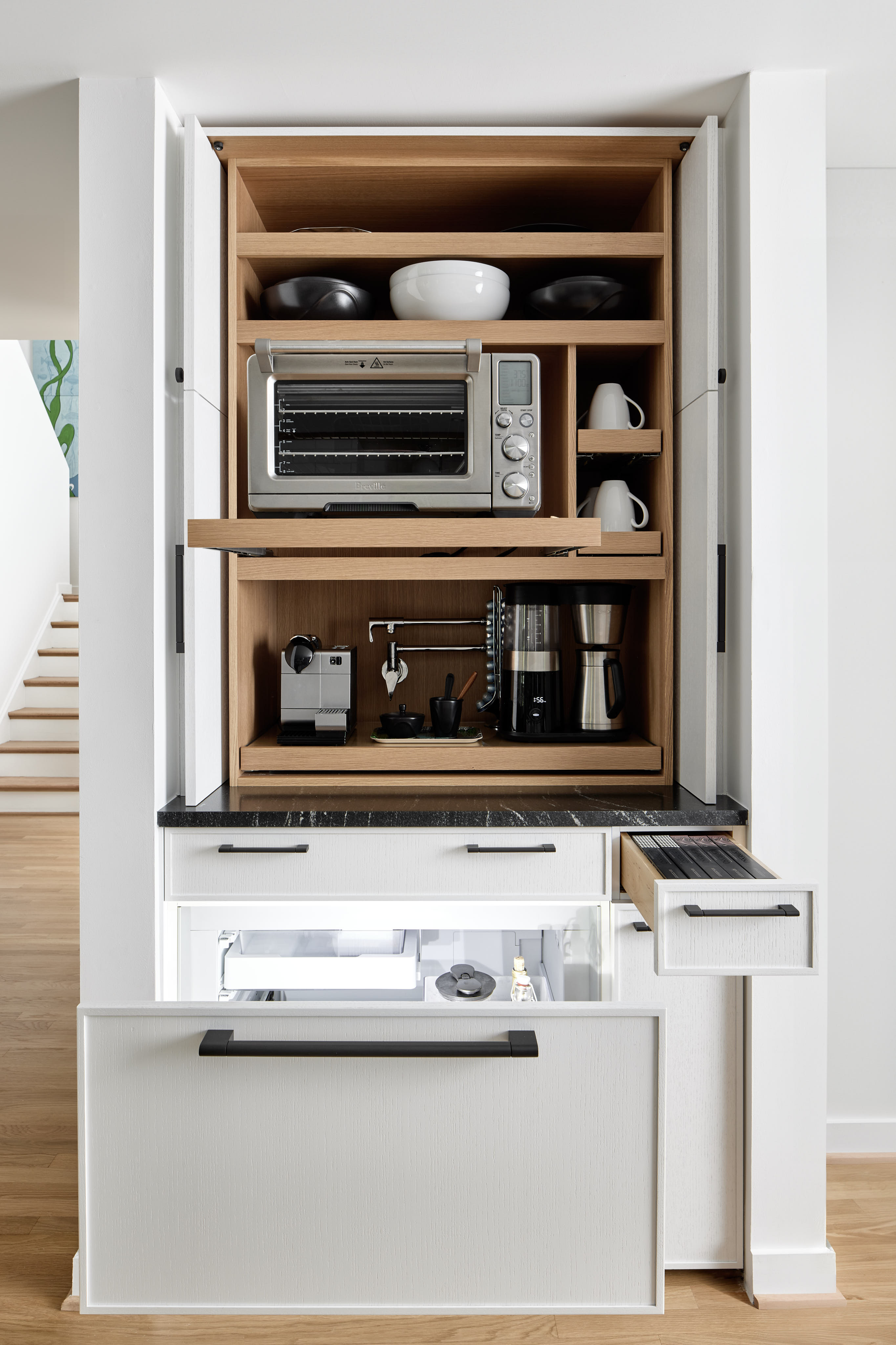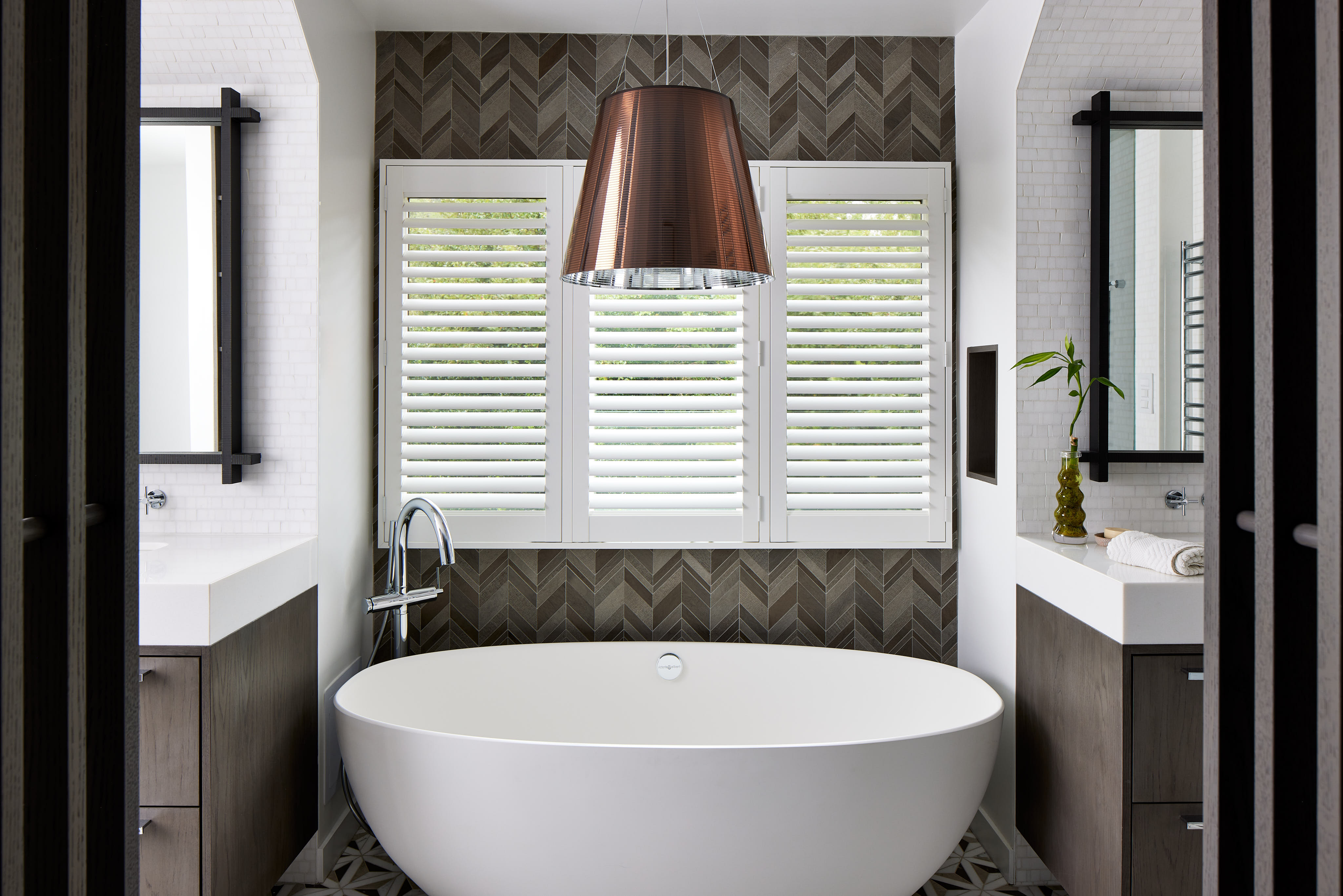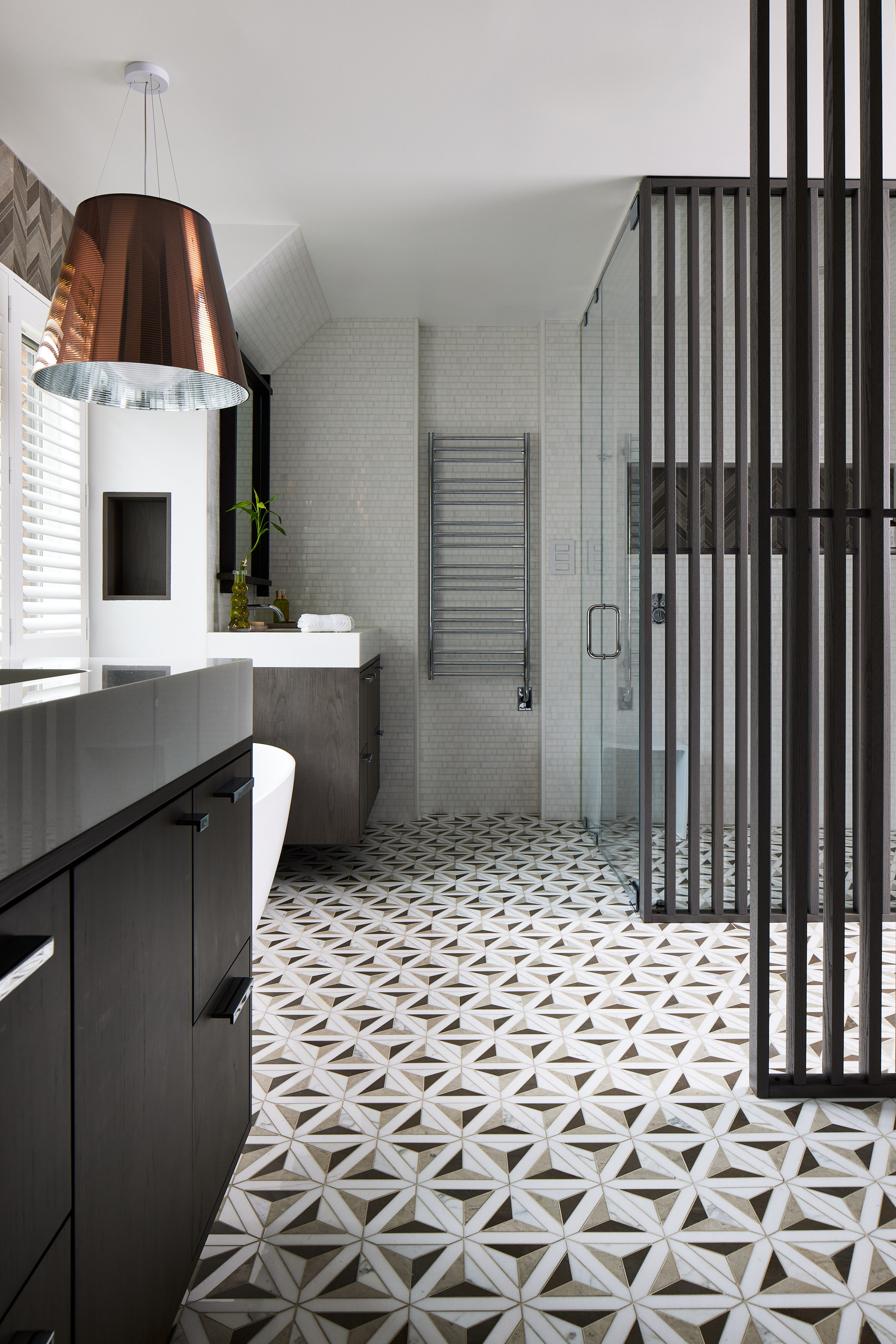 For this home, we kept a consistent visual language throughout. The kitchen, with its thick marble countertops, smooth ceilings, frequent use of stained oak trim, and dark cabinetry, provided inspiration for the laundry room, where the same marble countertops sit beside oak trim and dark cabinets and panels. The stone-clad wood burning fireplace keeps the dark and light theme moving, and the main bath, with its bold dark stained slat walls and copious natural light, carries on in the same direction.