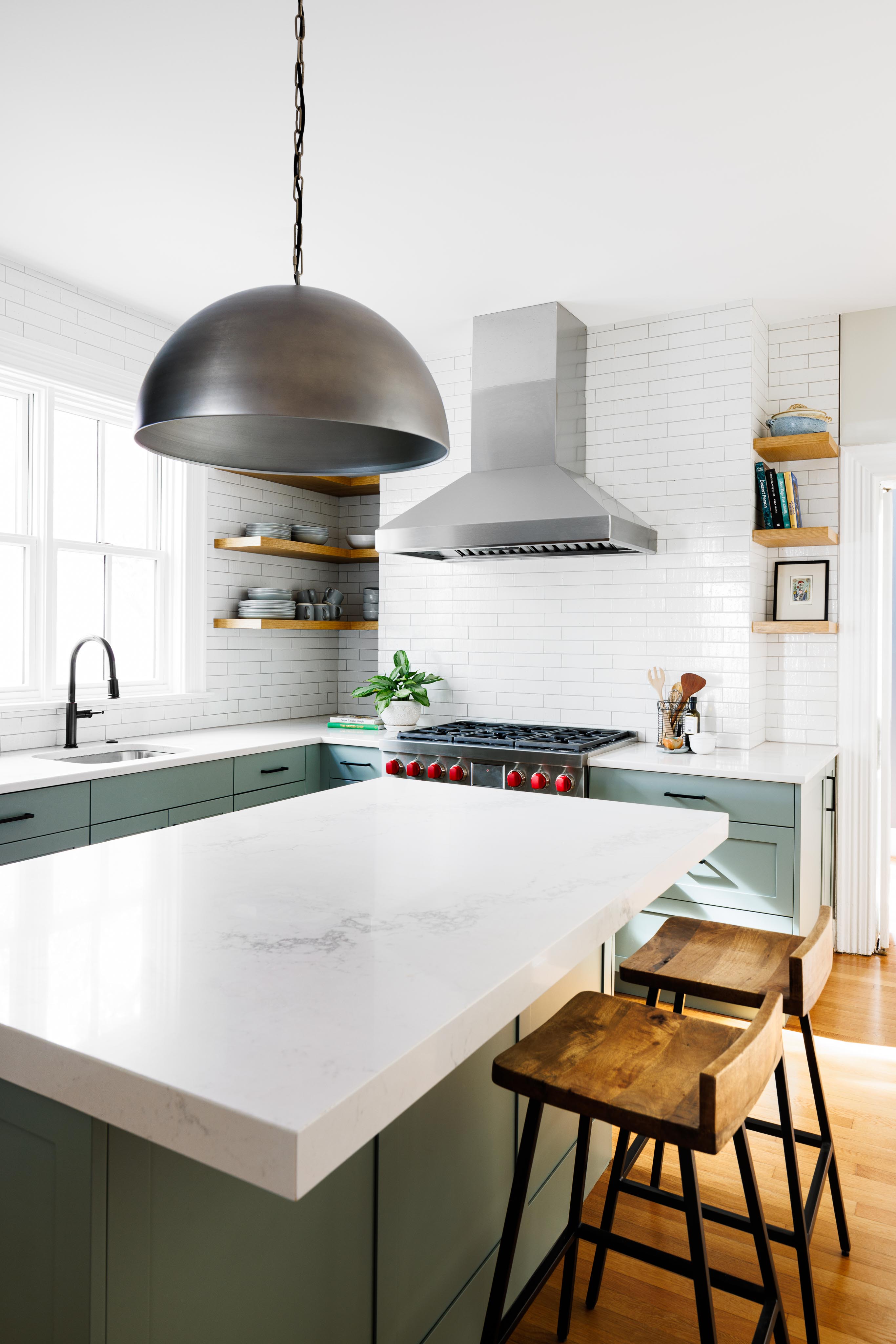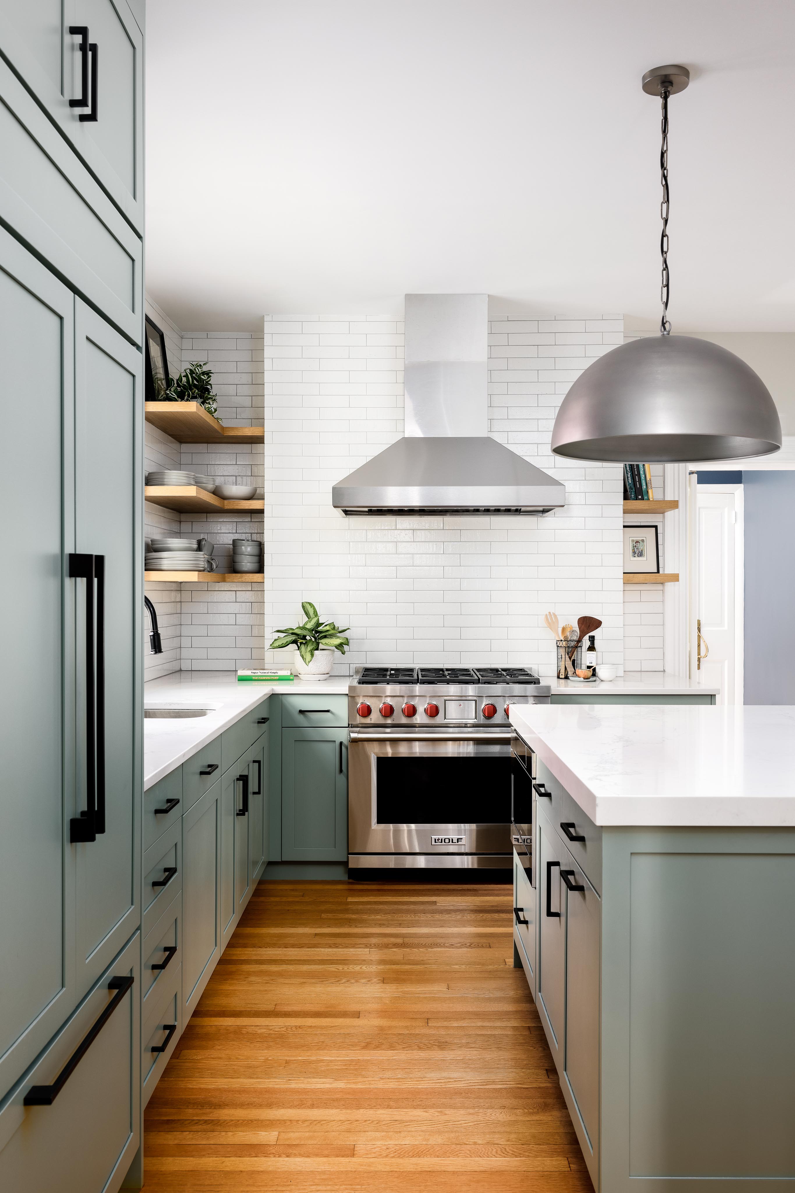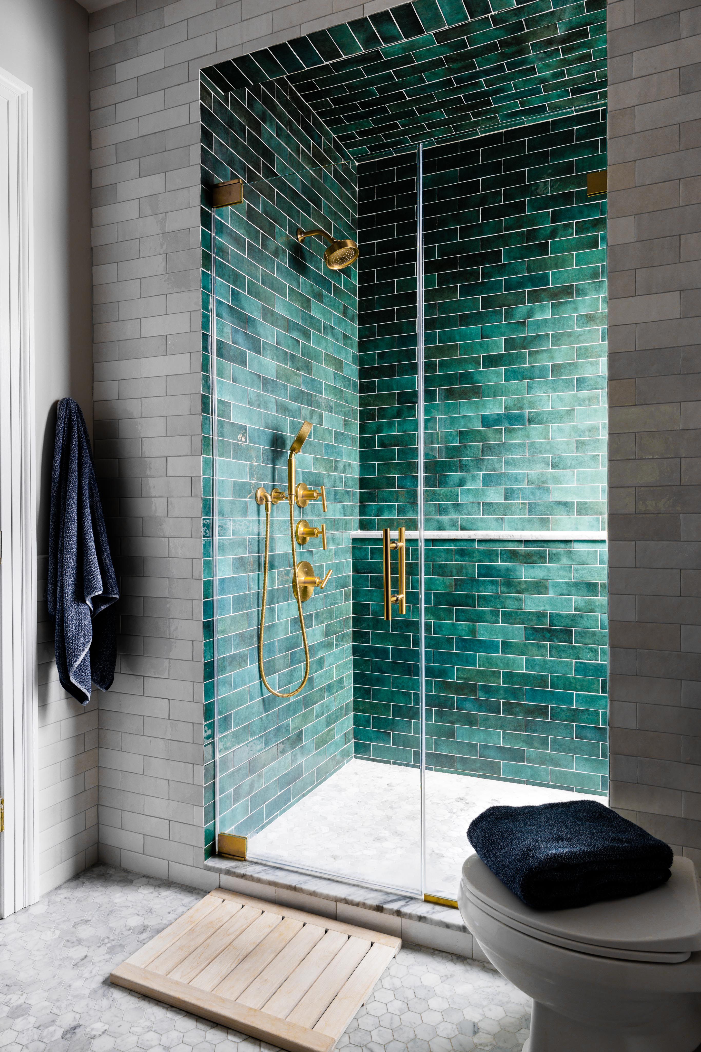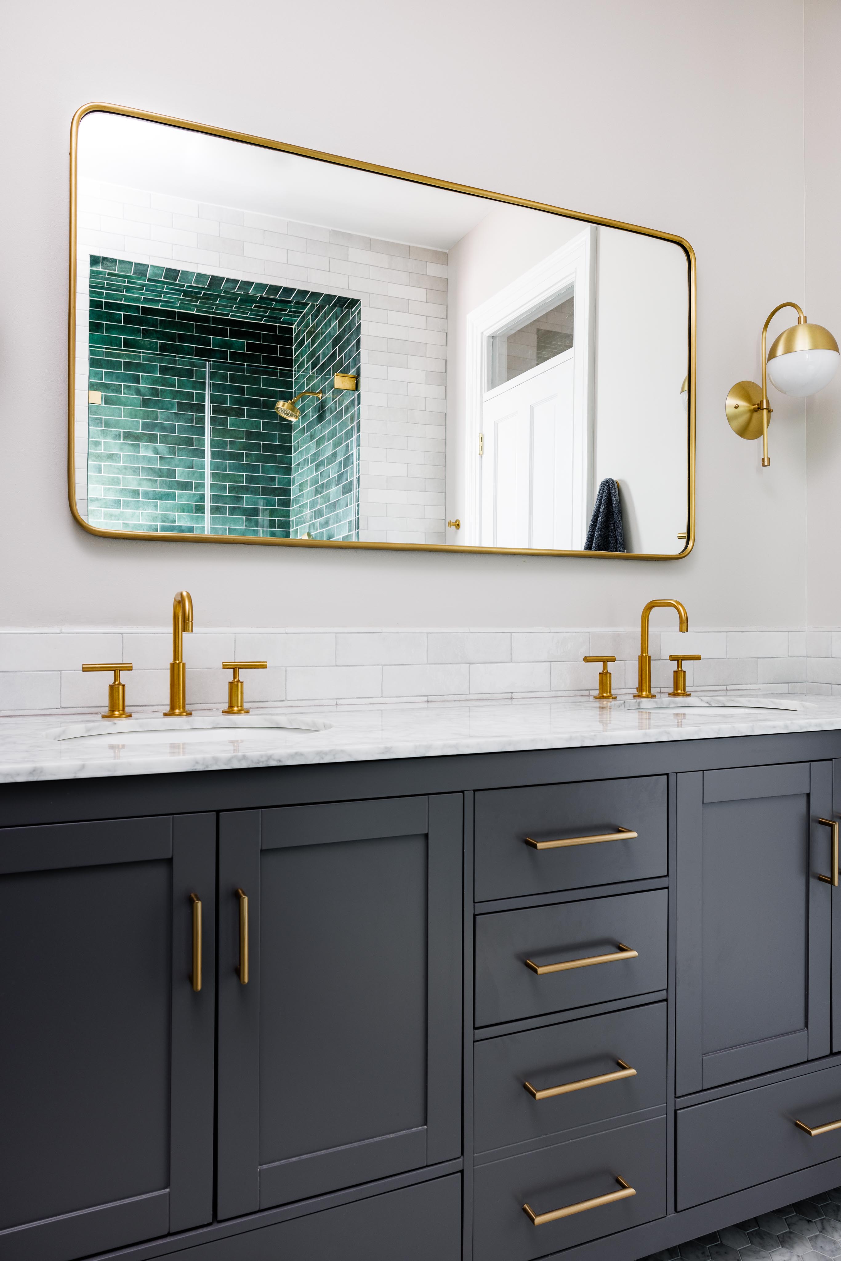 Downstairs in the kitchen, clean shaker cabinets in a soft mint green create a refined and unbothered look, while the brushed stainless steel of the hood vent and half-dome chandelier evoke an industrial setting. Wide Carrara marble countertops provide plenty of prep space and utility. Upstairs in the main suite, the saturated teal subway tile gives the shower an old-school feel, while the brass fixtures, custom built vanity cabinets, and hex floor tiles lean into a modern classic look.