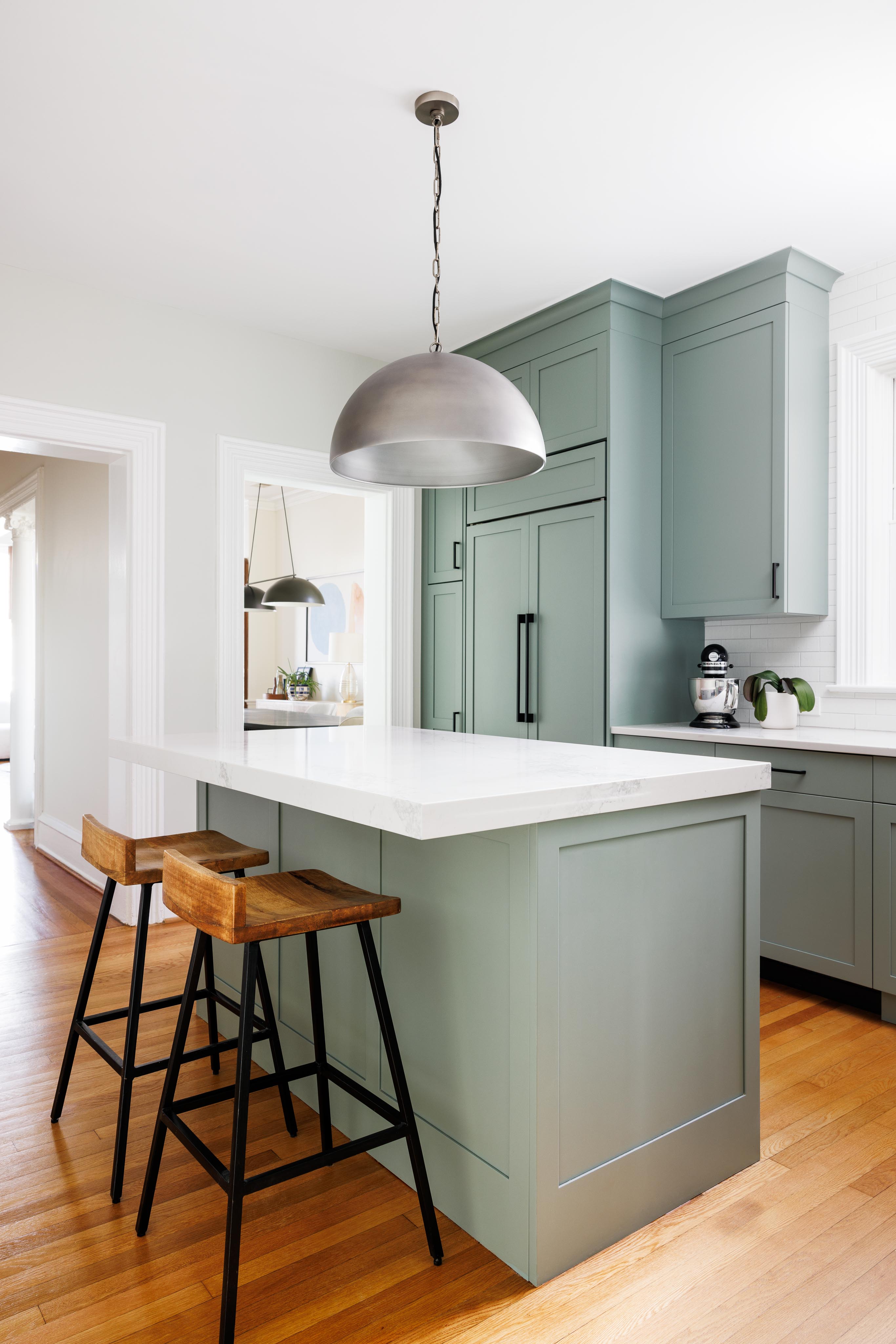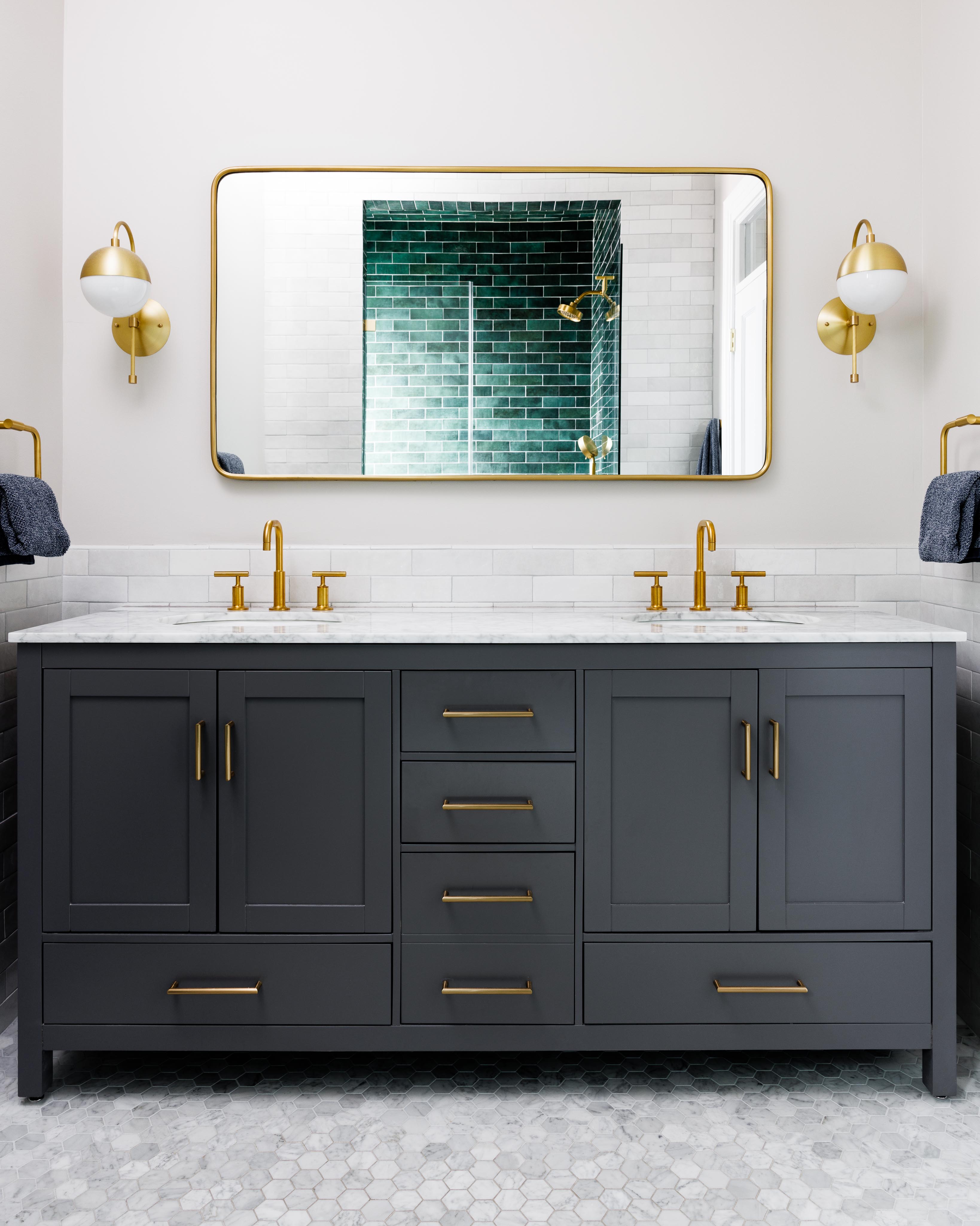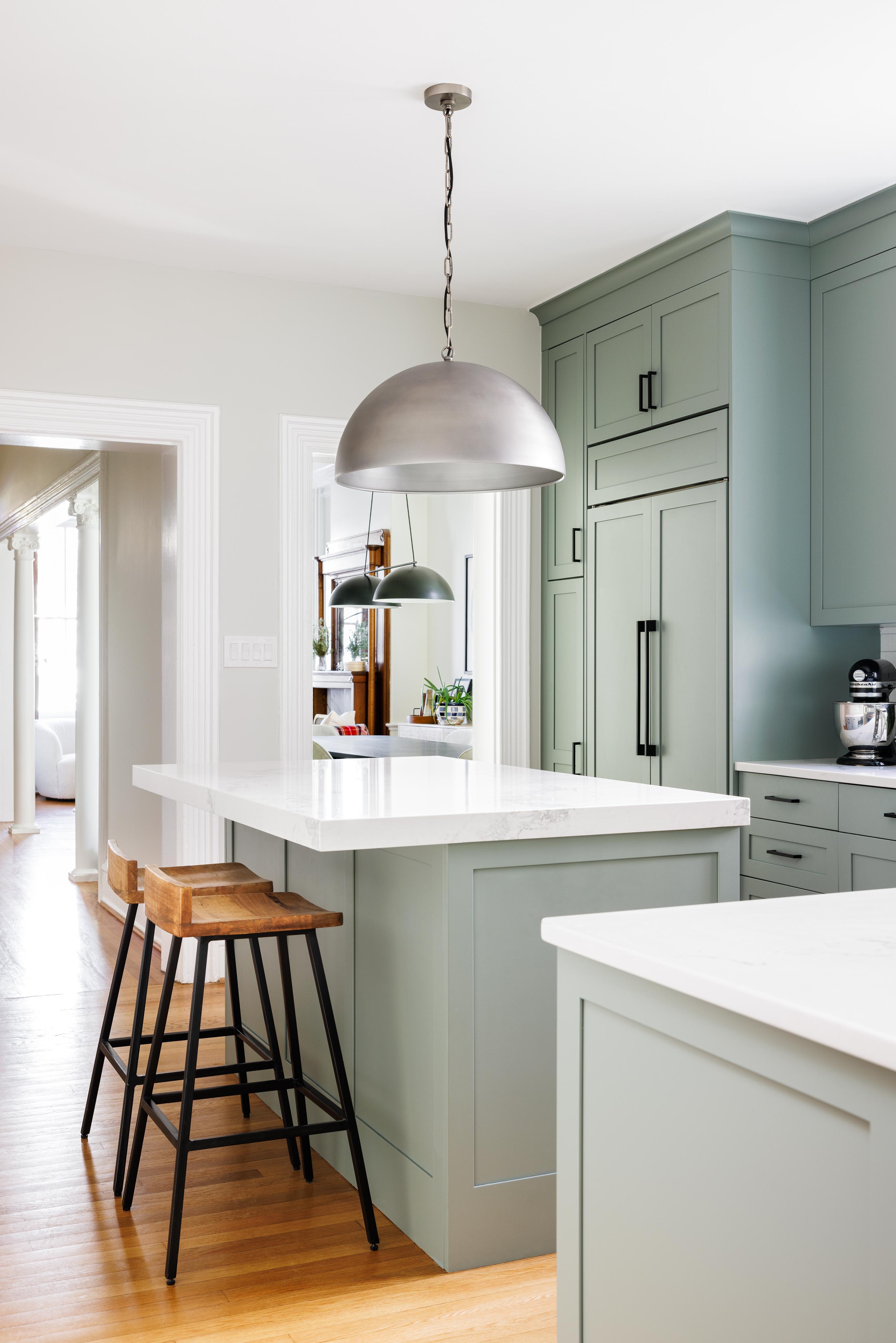 Downstairs in the kitchen, clean shaker cabinets in a soft mint green create a refined and unbothered look, while the brushed stainless steel of the hood vent and half-dome chandelier evoke an industrial setting. Wide Carrara marble countertops provide plenty of prep space and utility. Upstairs in the main suite, the saturated teal subway tile gives the shower an old-school feel, while the brass fixtures, custom built vanity cabinets, and hex floor tiles lean into a modern classic look.
