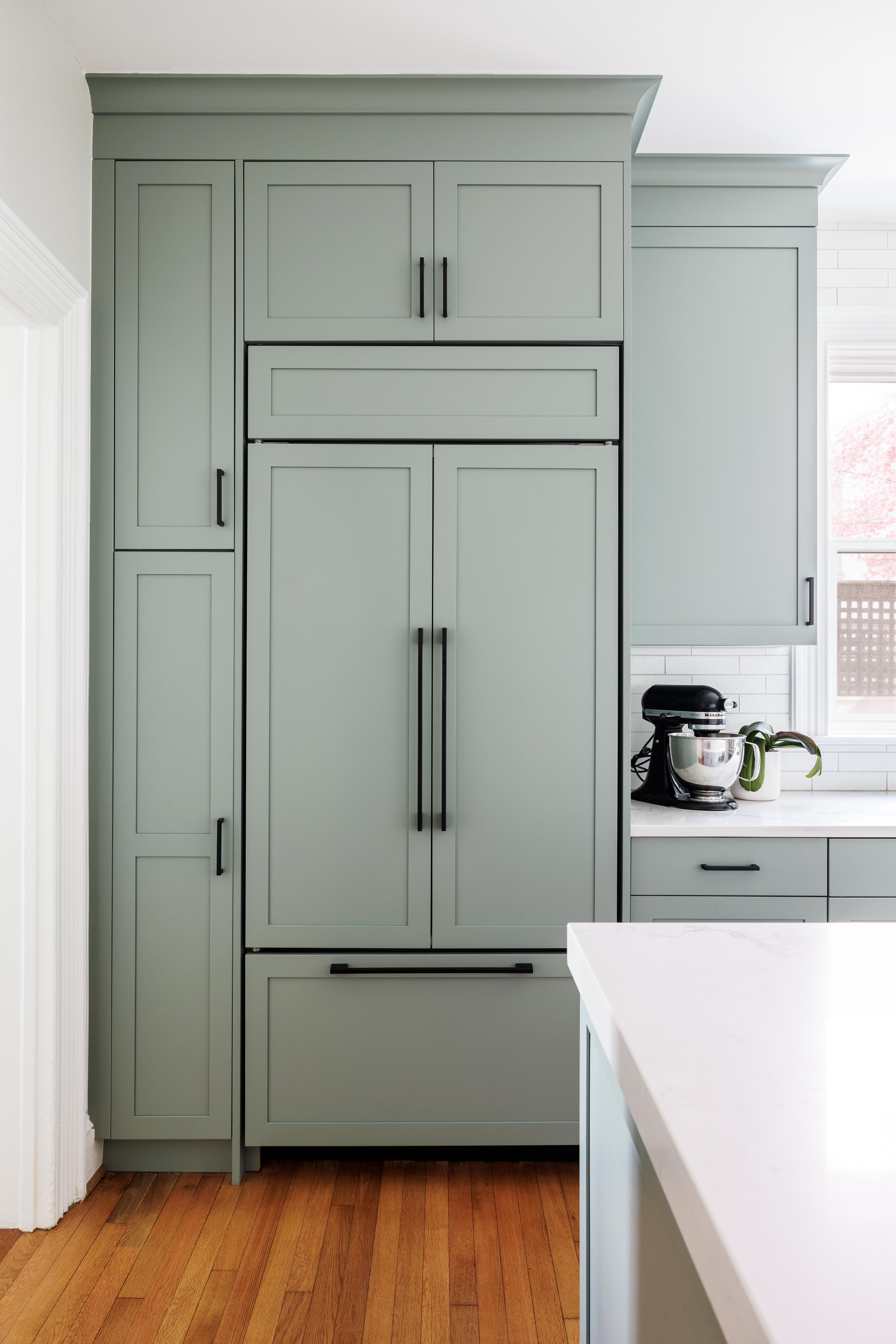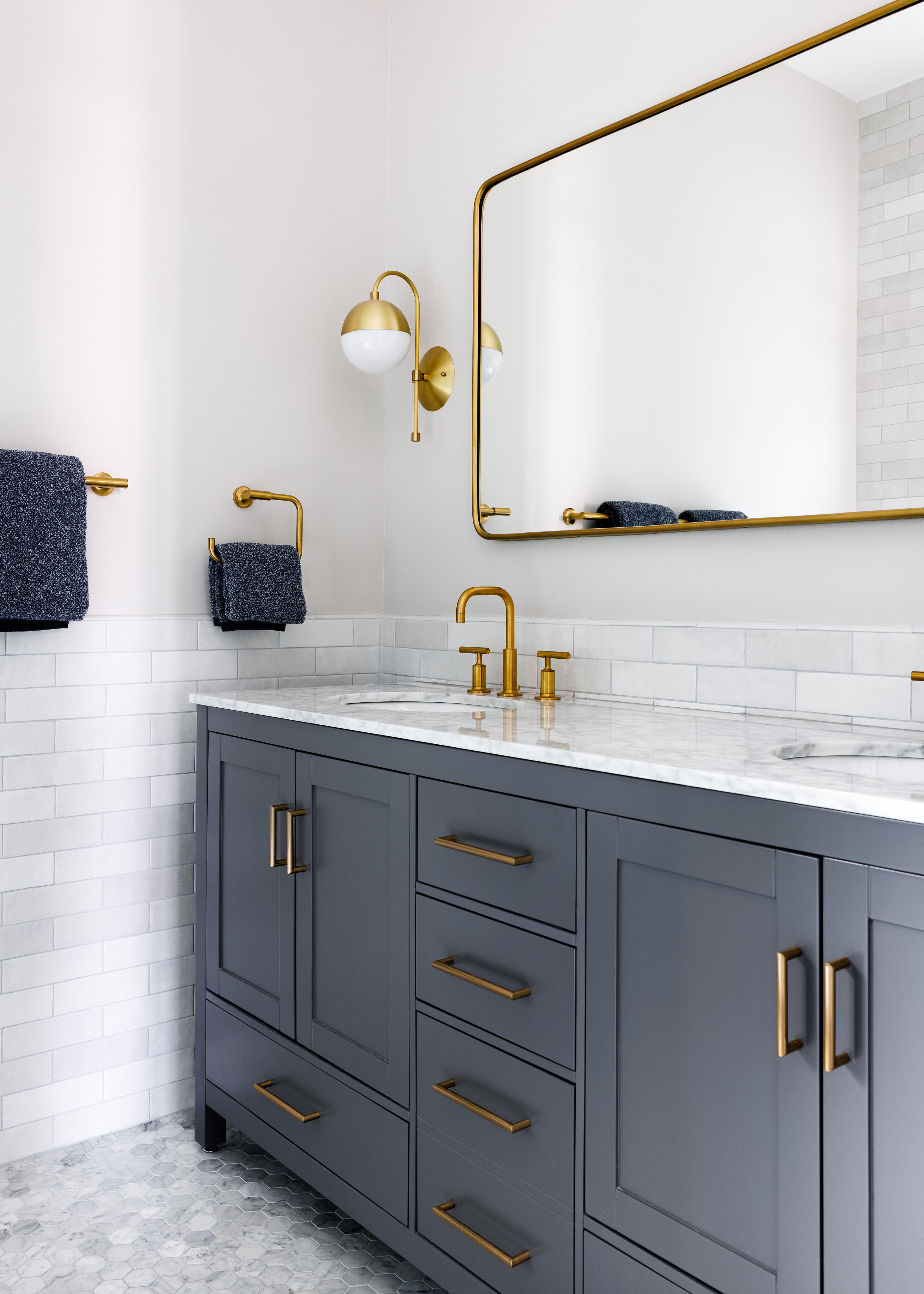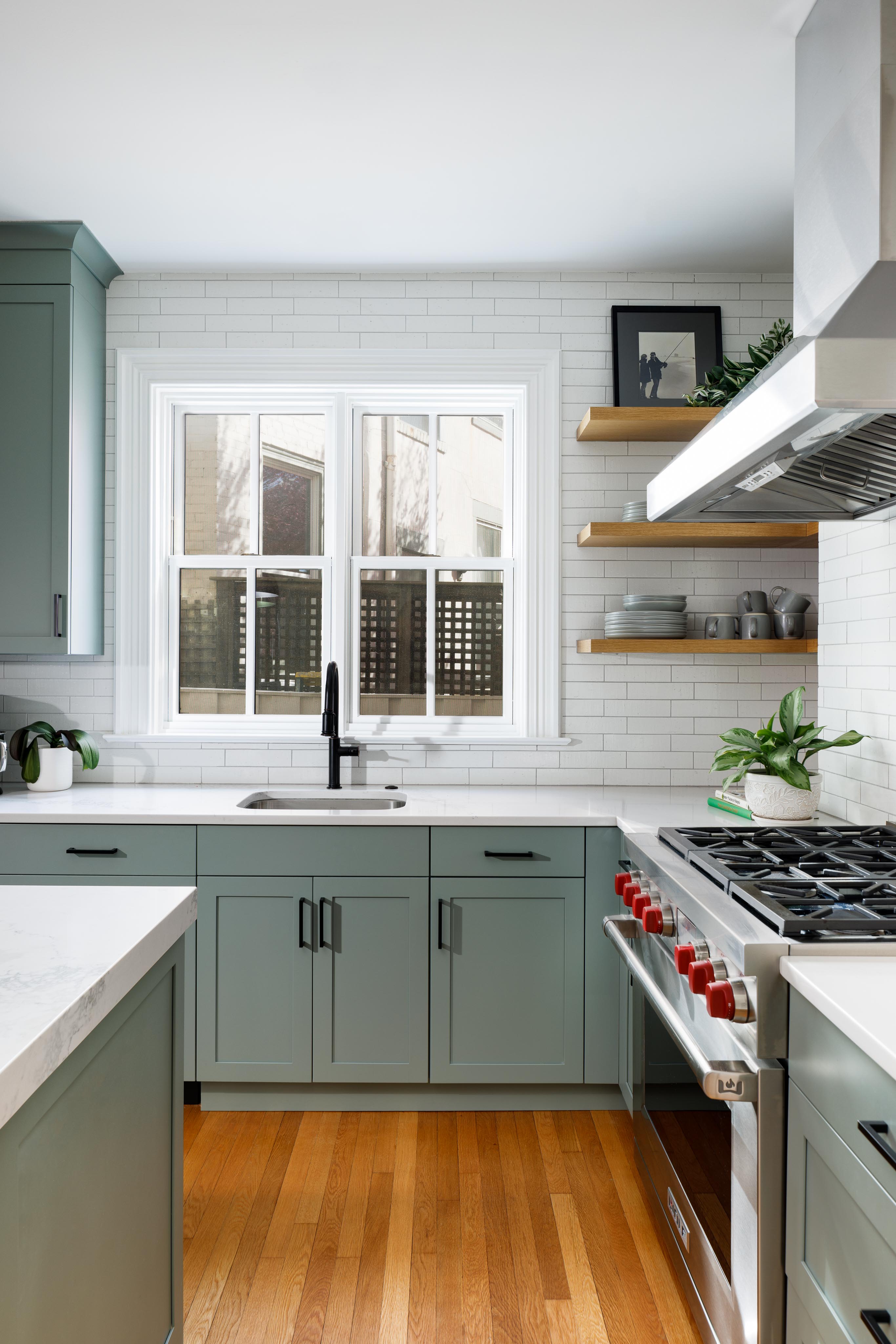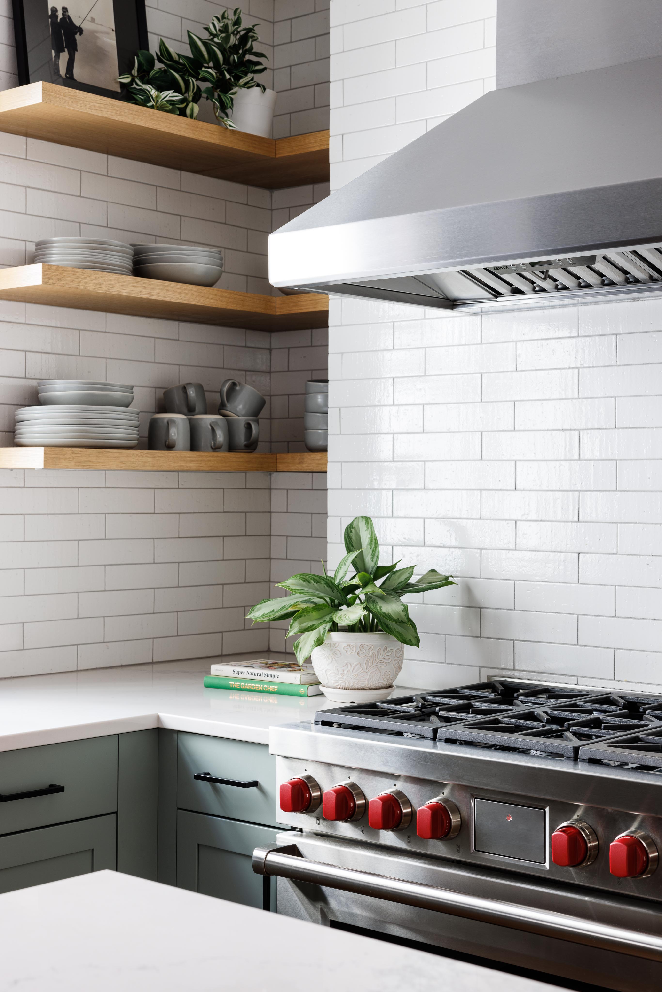 Downstairs in the kitchen, clean shaker cabinets in a soft mint green create a refined and unbothered look, while the brushed stainless steel of the hood vent and half-dome chandelier evoke an industrial setting. Wide Carrara marble countertops provide plenty of prep space and utility. Upstairs in the main suite, the saturated teal subway tile gives the shower an old-school feel, while the brass fixtures, custom built vanity cabinets, and hex floor tiles lean into a modern classic look.