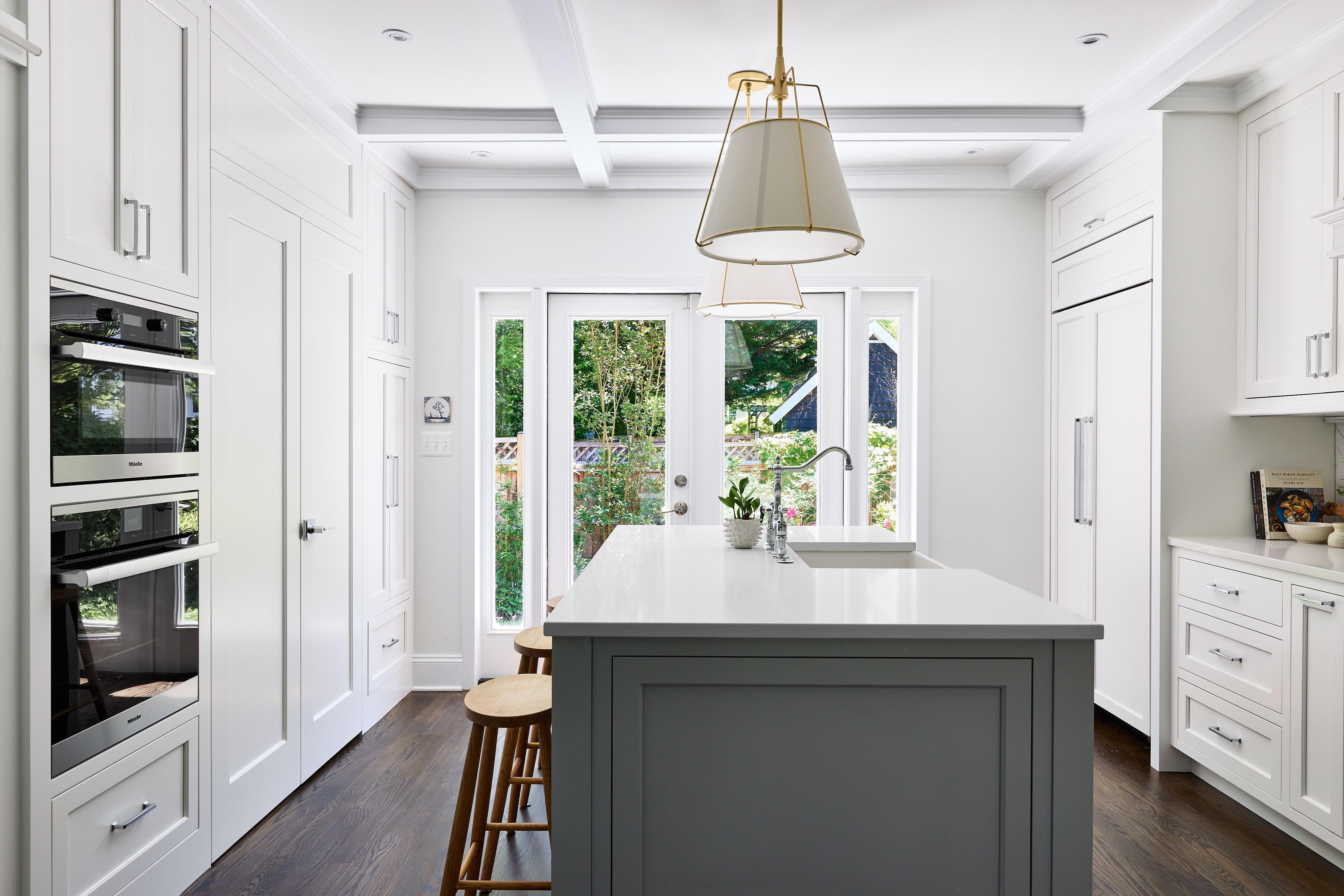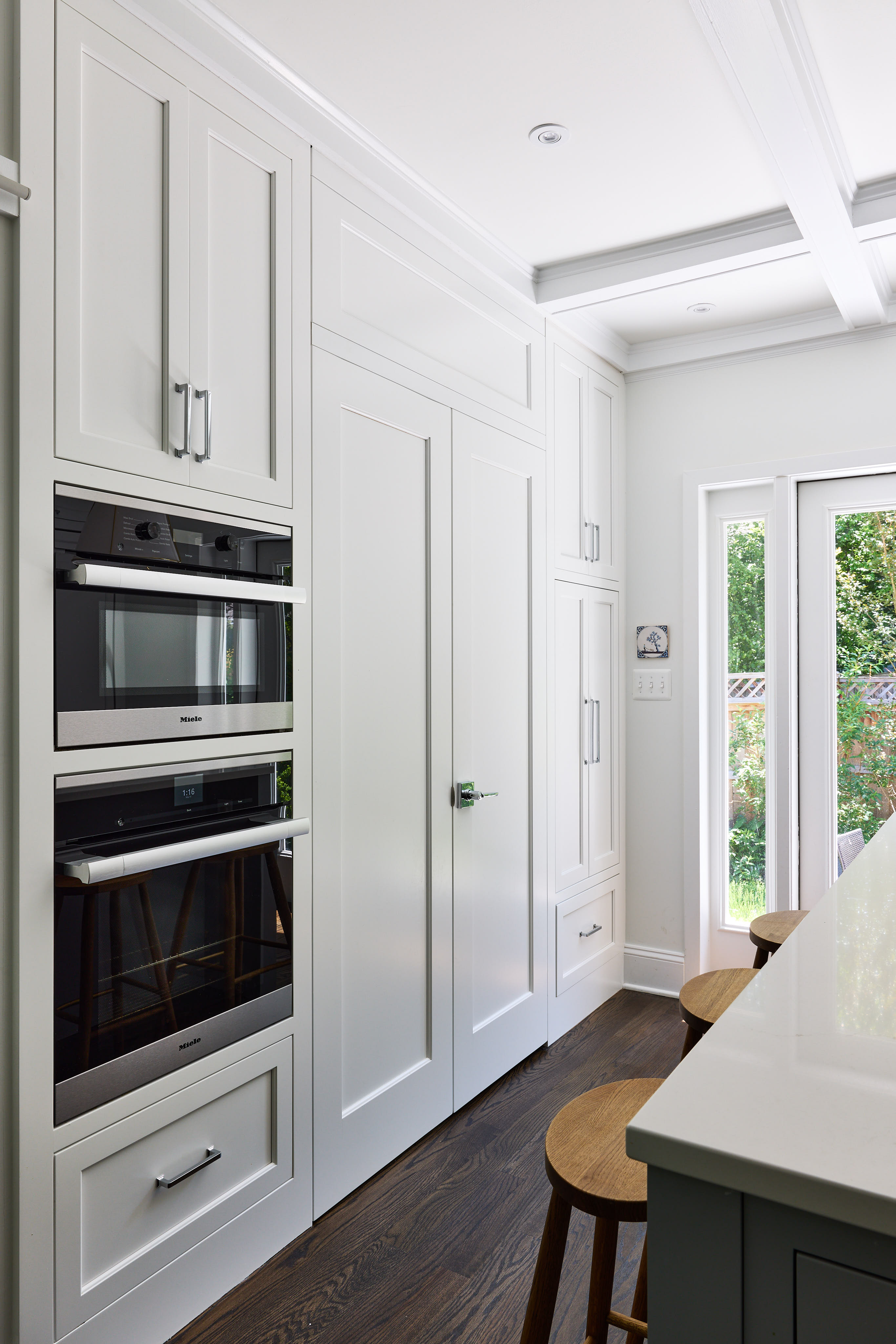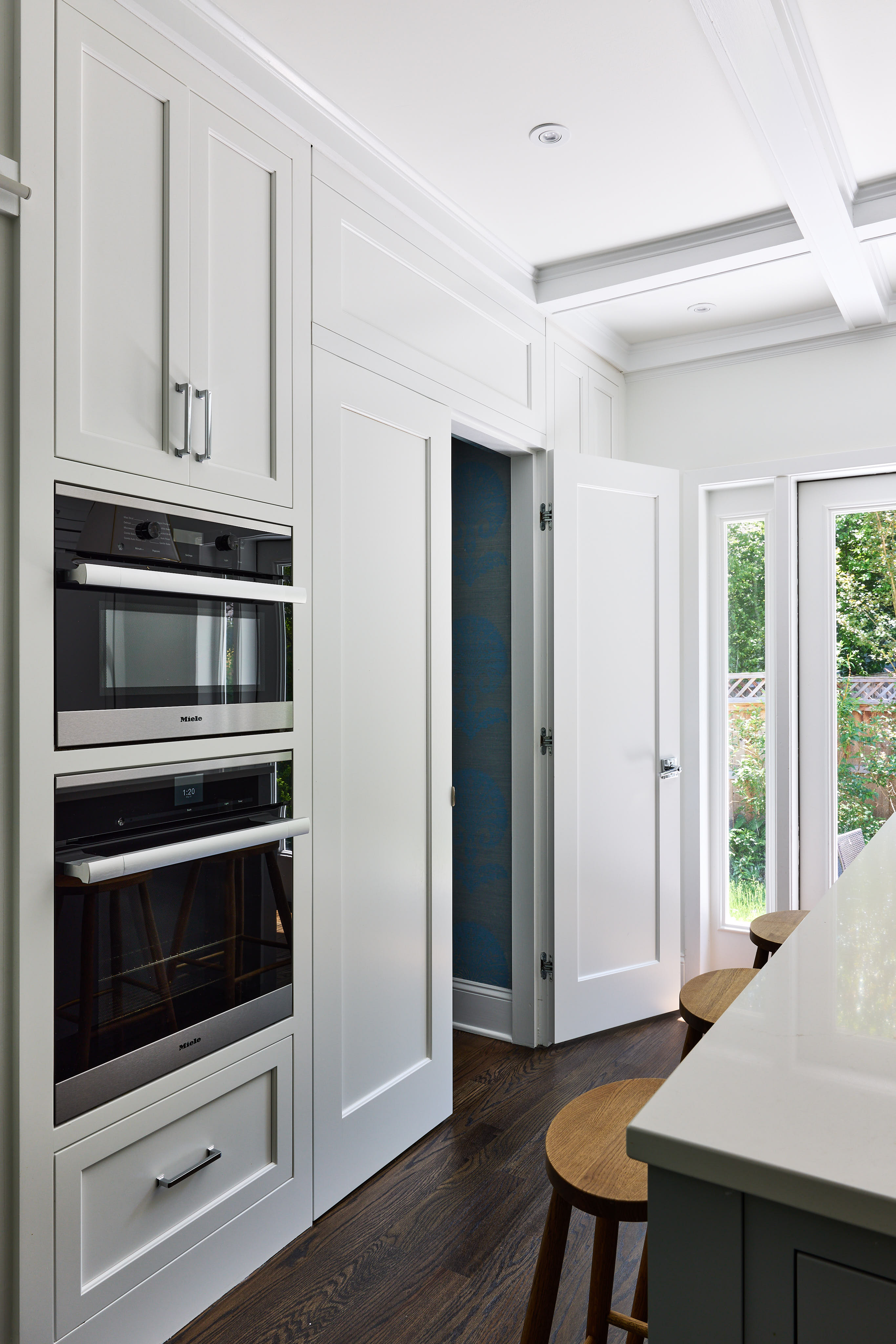 The kitchen embraces a modern farmhouse style. Inset cabinetry from Cabico adds timeless character, while Caesarstone countertops offer durability and elegance. The custom jib door blends seamlessly into the pantry wall, creating a simple, sleek look. The result is a kitchen that beautifully blends practicality with style.