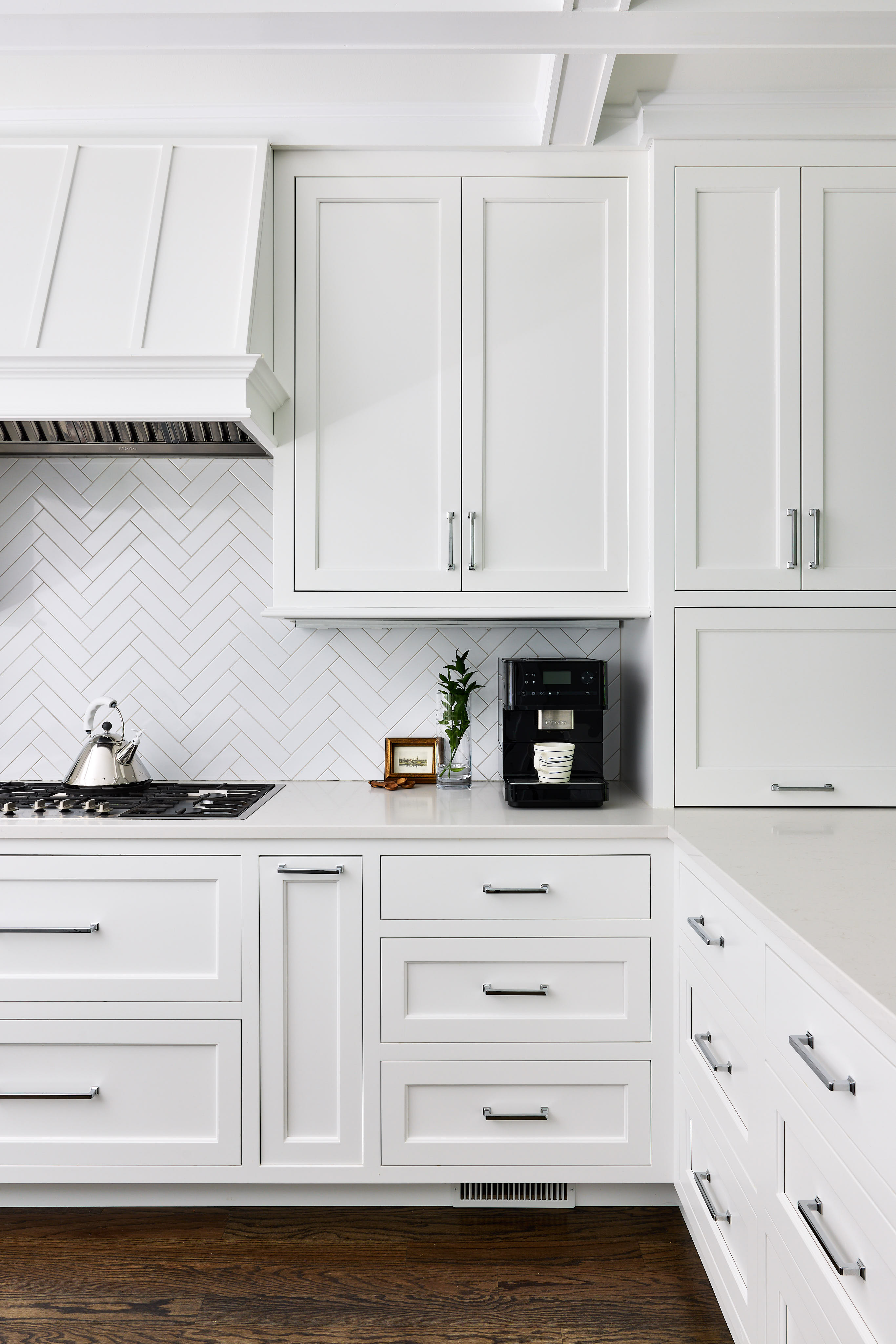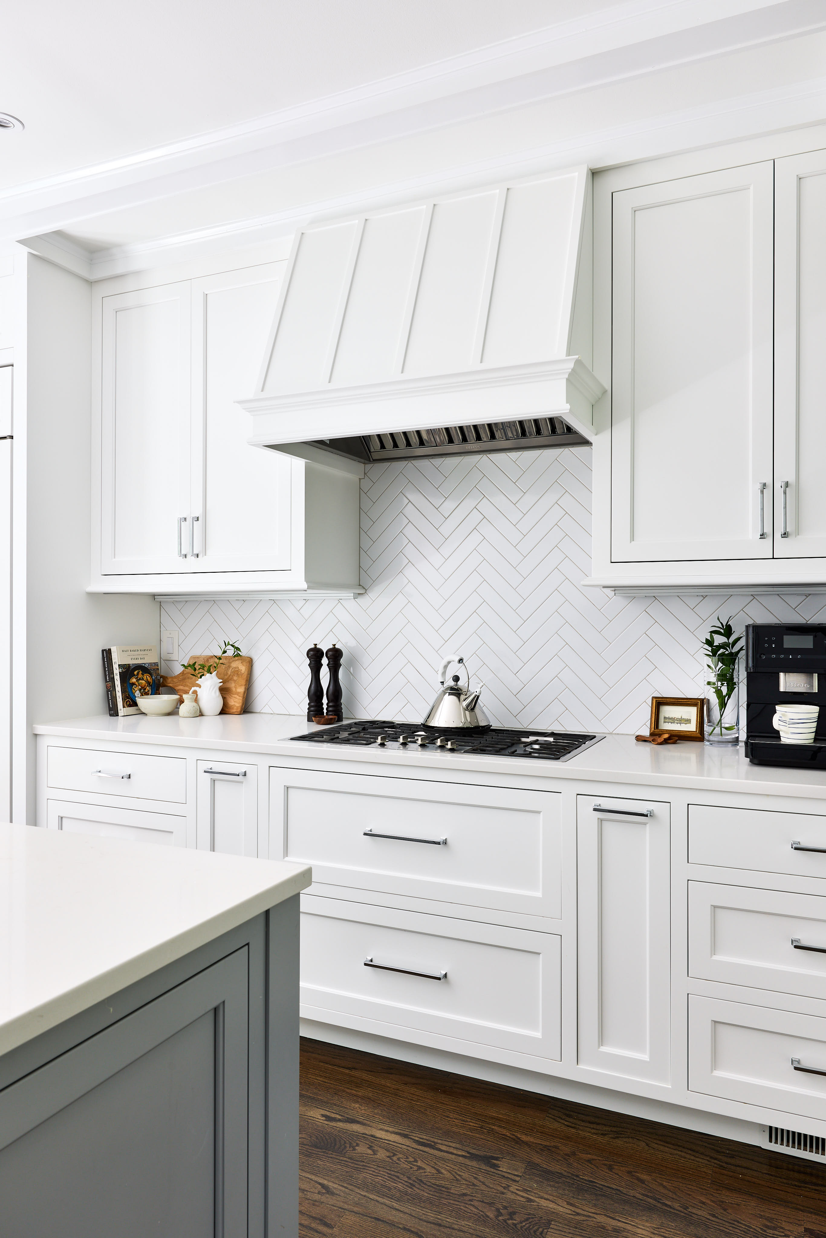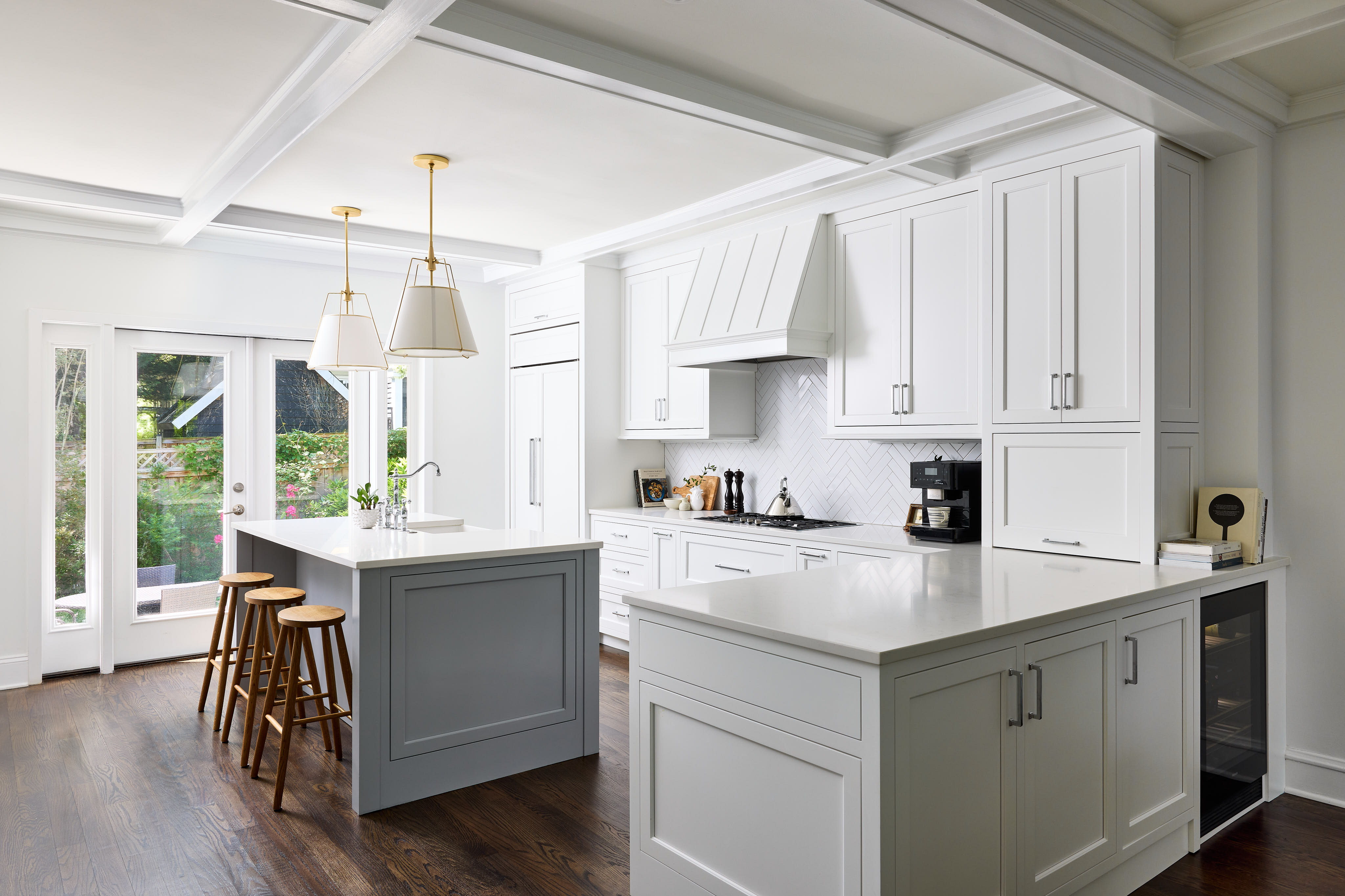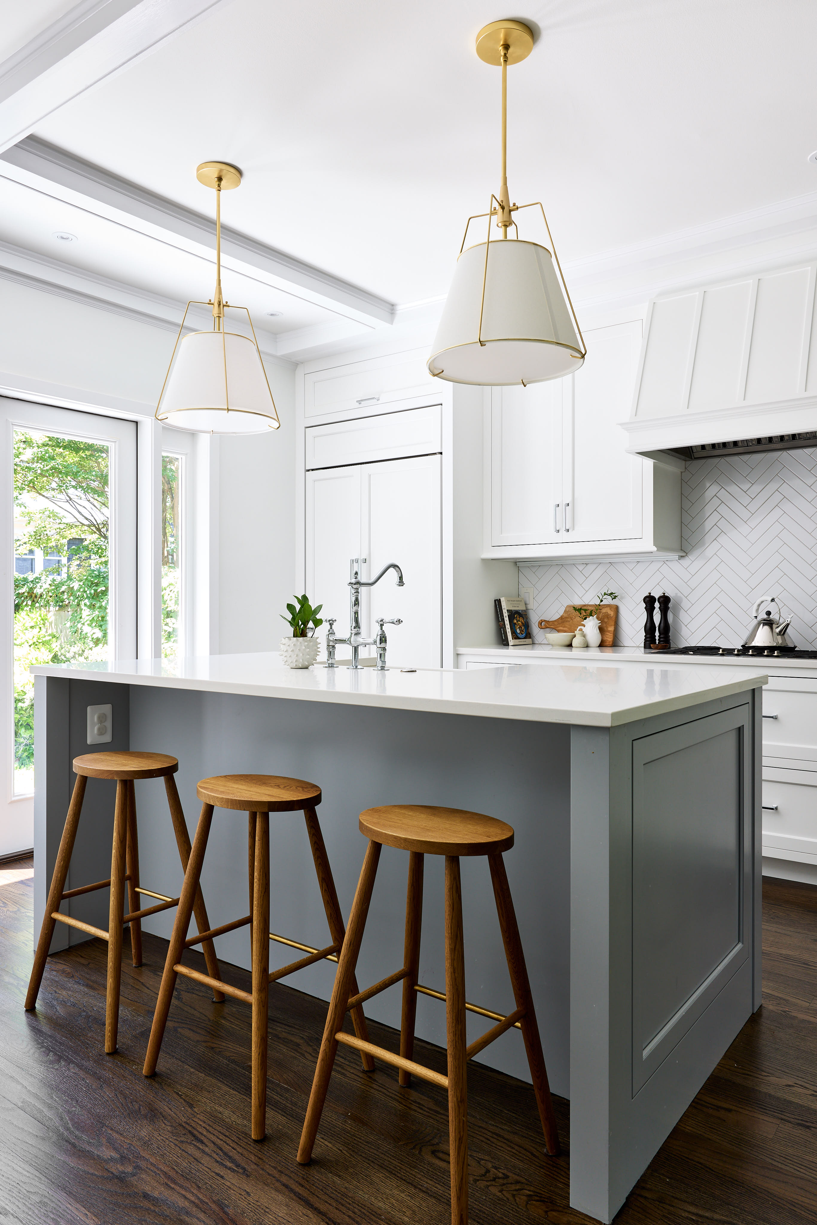 The kitchen embraces a modern farmhouse style. Inset cabinetry from Cabico adds timeless character, while Caesarstone countertops offer durability and elegance. The custom jib door blends seamlessly into the pantry wall, creating a simple, sleek look. The result is a kitchen that beautifully blends practicality with style.