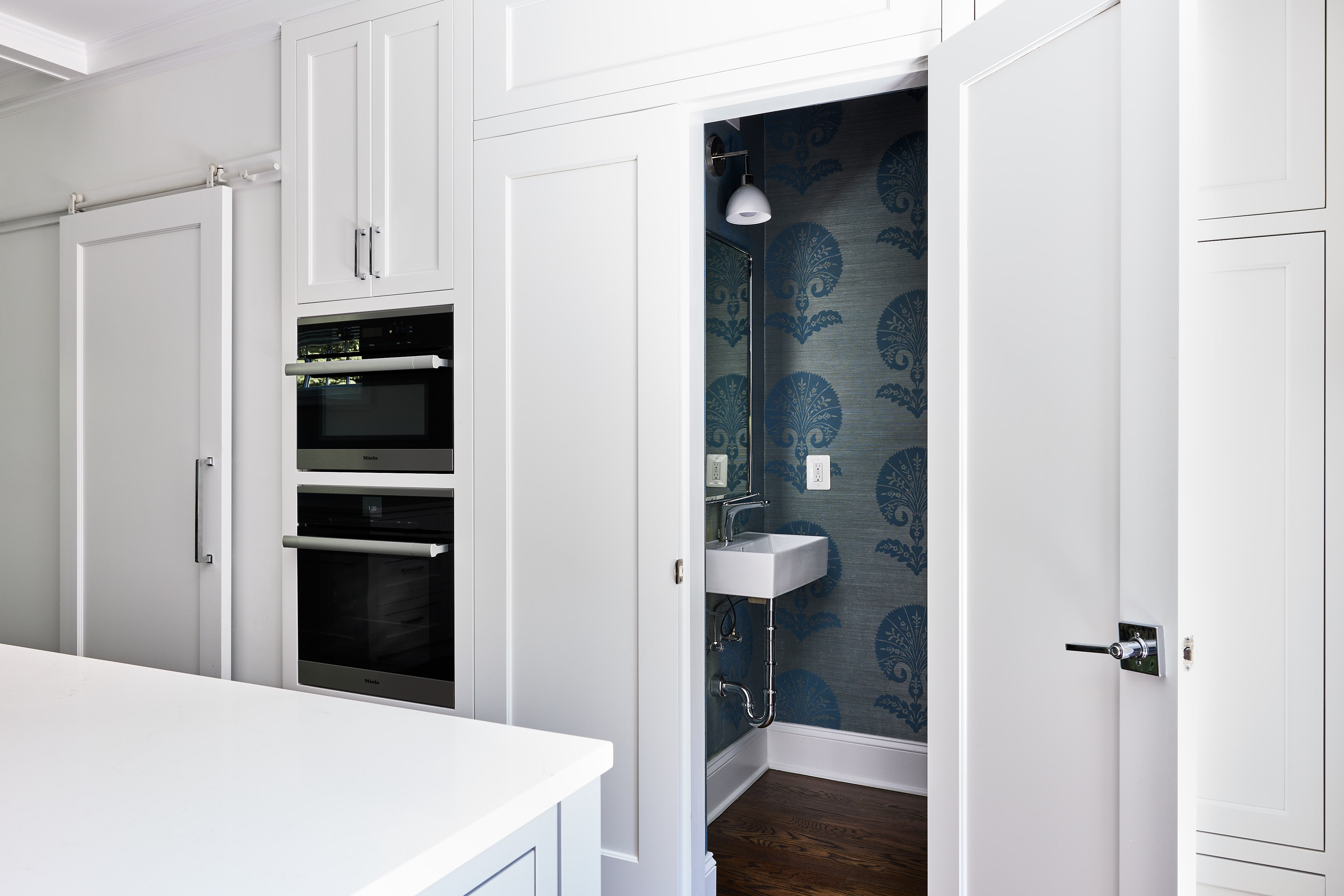 One unique challenge in this project was addressing the homeowners’ desire for a hidden powder room door to enhance both privacy and aesthetics. To achieve this, we integrated a jib door into the pantry wall opposite the kitchen island. This clever solution blends the door seamlessly into the cabinetry, creating a streamlined look.