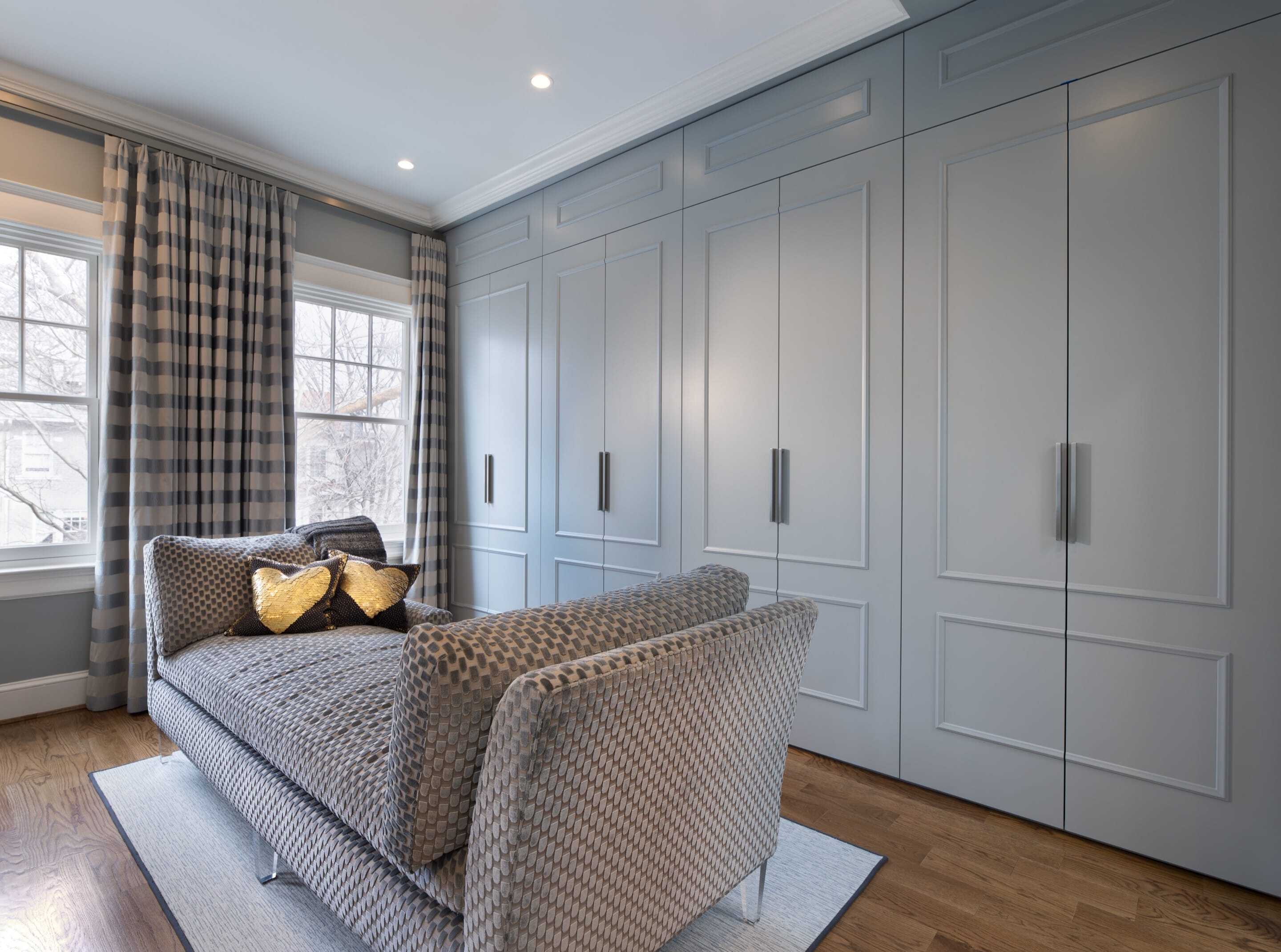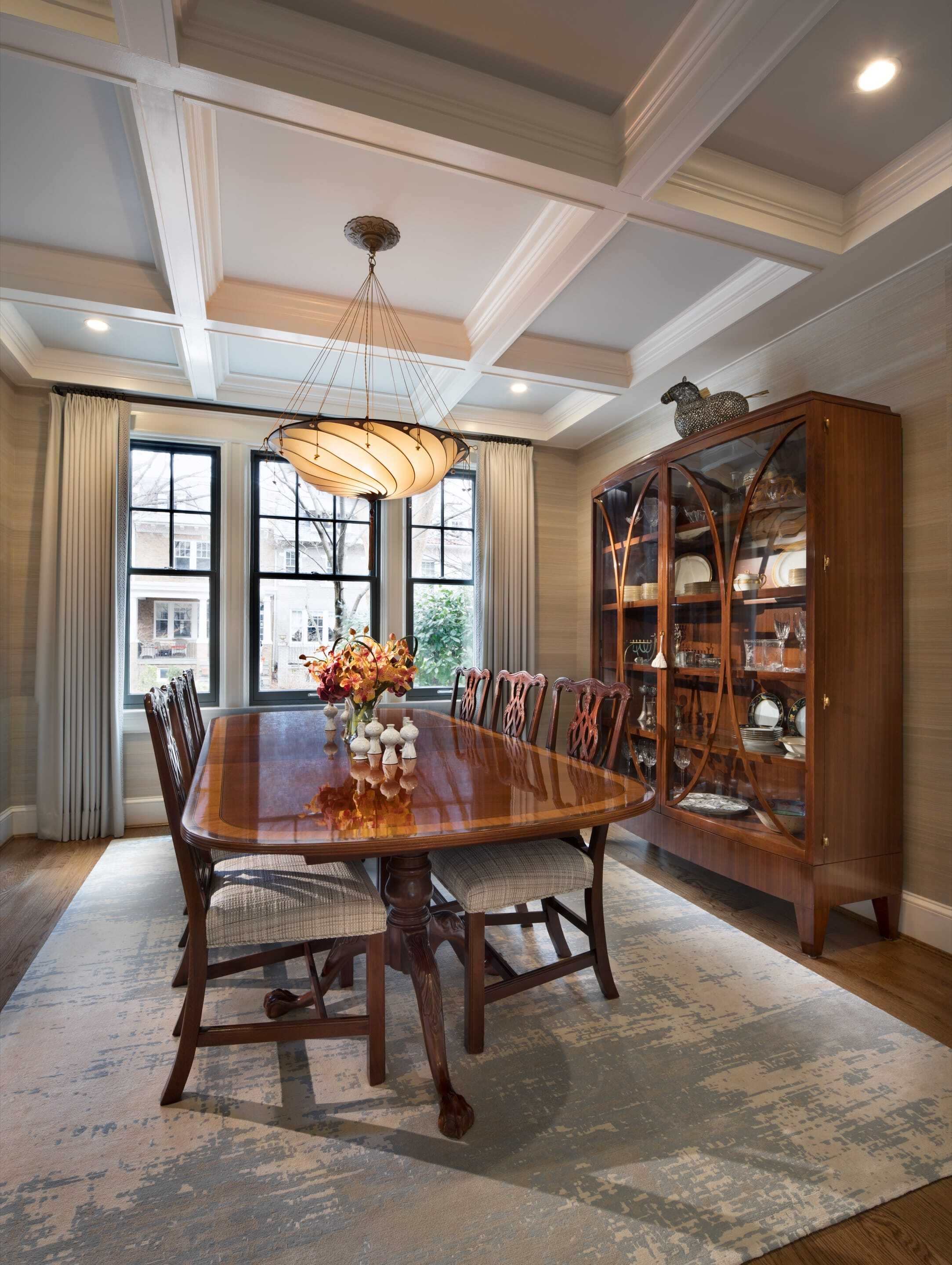 We wanted to create a practical and spacious kitchen, and the best way to achieve that in this space was by stretching most of the pantry and cabinet storage along the back wall, and installing a center island, with extra storage, built in bookshelves, and a breakfast bar. We chose a symmetrical design for the range wall, with tall bookends on either side housing the built-in appliances and ample pantry space, and glass-fronted upper cabinets in the center for extra light and easy visibility. The kitchen opens completely into a living area, with the formal dining room easily accessible as well through an open arch.