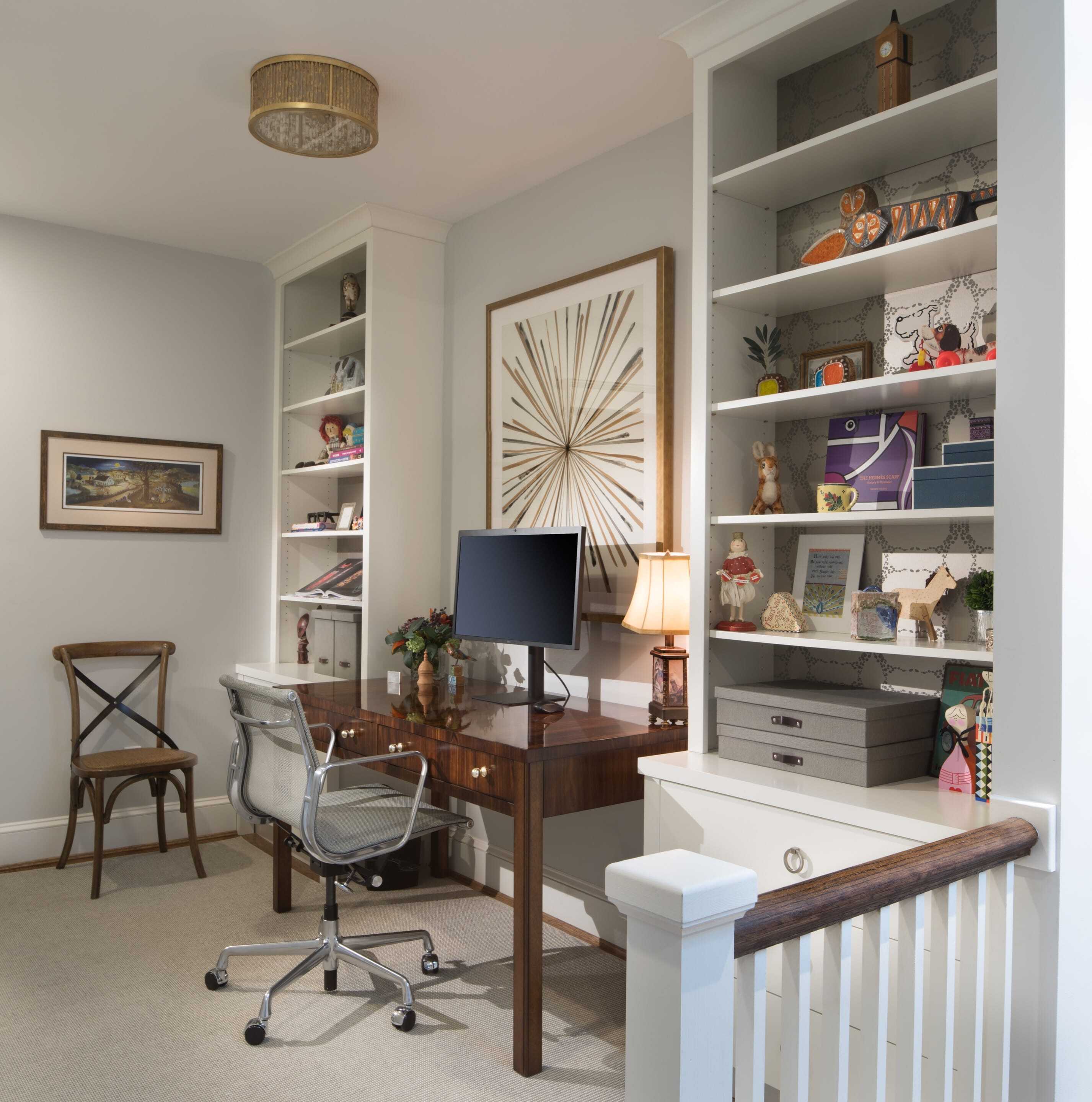 The homeowners wanted a style which remained traditional, to pay homage to the house’s age, but strayed away from the rigid and unwelcoming. For the kitchen, this meant slender white shaker framed cabinets, soft white light, and a textured subway tile backsplash. We opted for a subtle brush of color in the understated blue of the island, which matched the blue tones throughout the rest of the house without drawing undue attention. Oak flooring all throughout the lower level anchors the design with warm earth tones, and the soft light and bright paint finishes in the kitchen create a comfortable atmosphere.