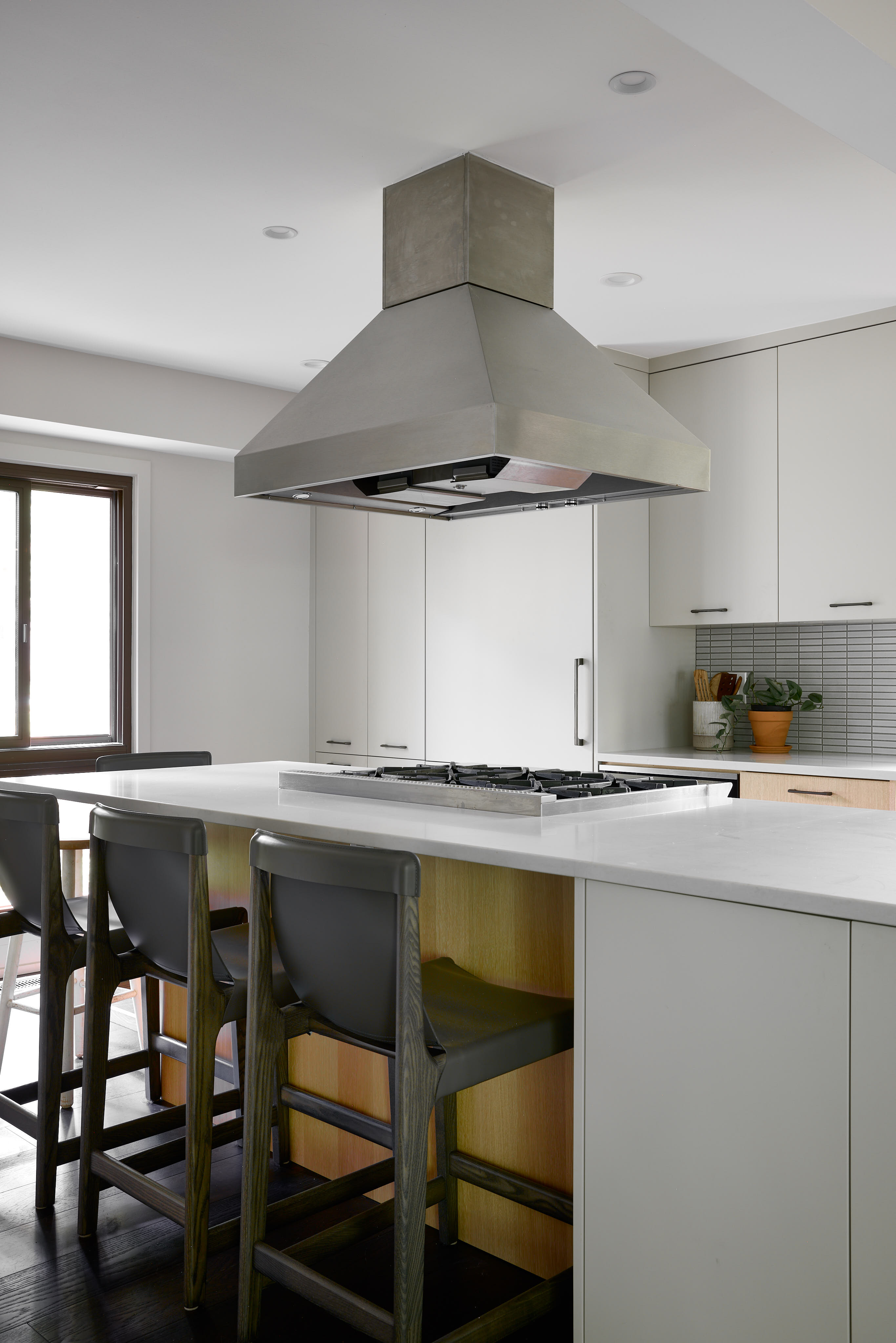 Our clients preferred a modern theme with natural finishes. We relied on natural wood throughout, from the kitchen cabinets to a clad structural pillar, to conjure warmth in the space. Other cabinetry in off-white kept the palette light, without tending towards the austerity or starkness of a sharper white. In the butler’s pantry, we opted for dark blue statement cabinets and panels. We finished the mudroom with natural soapstone, and used soft quartz for the kitchen countertops.