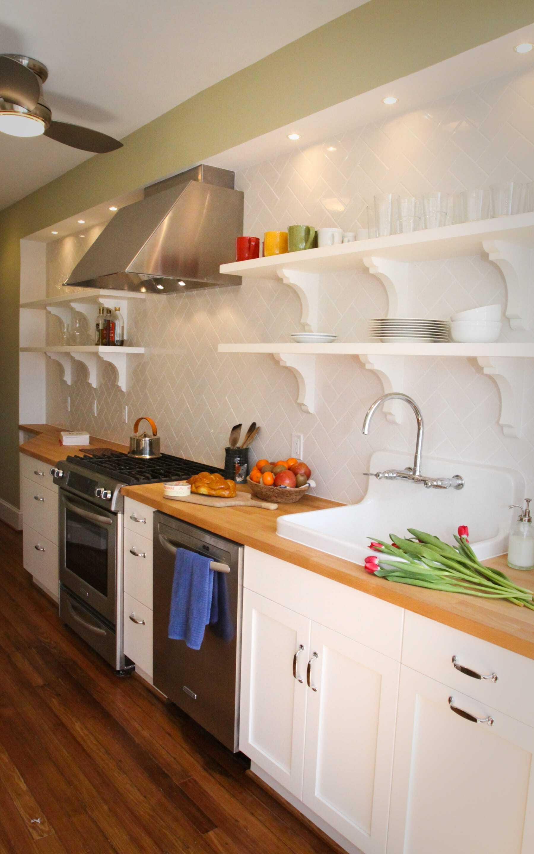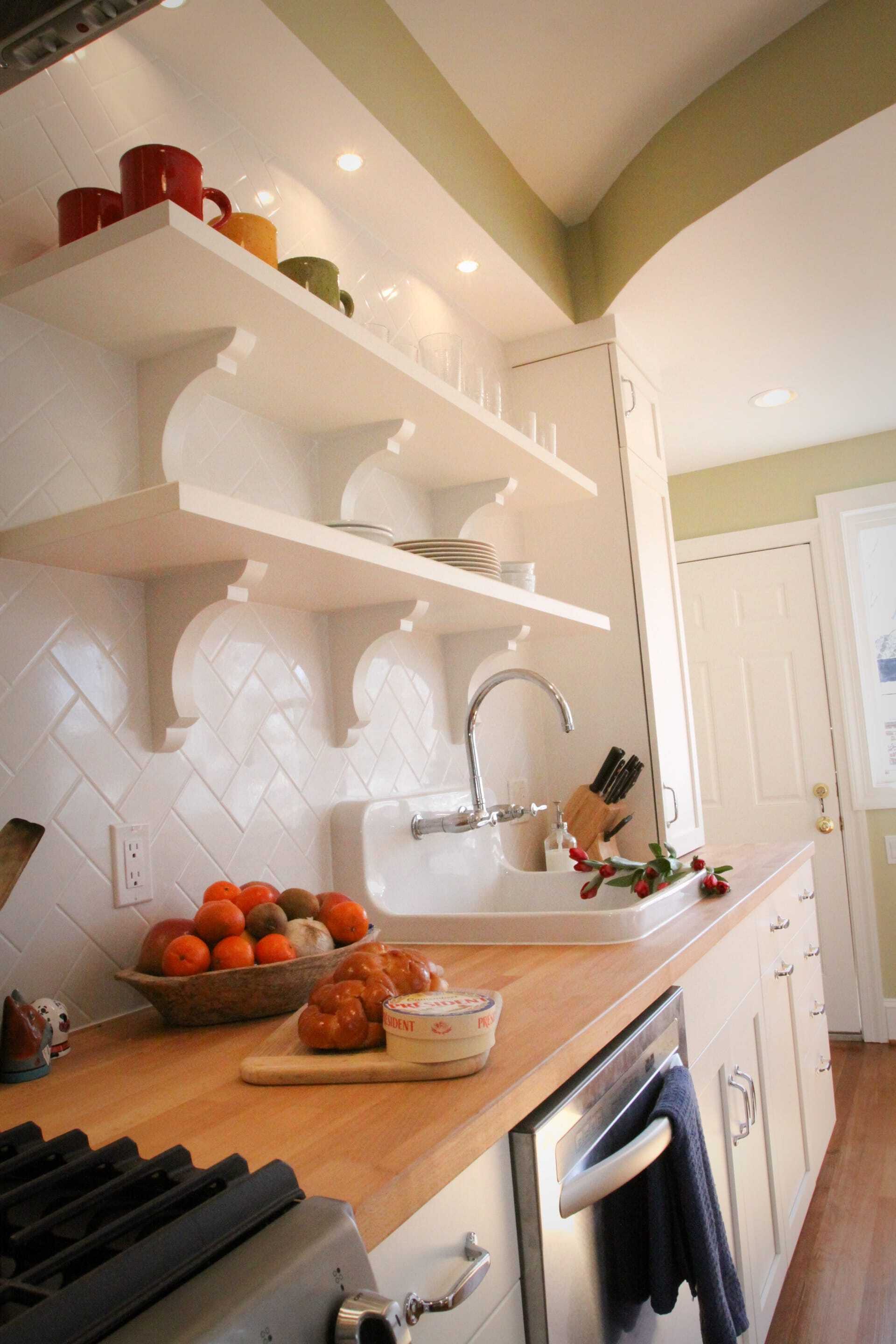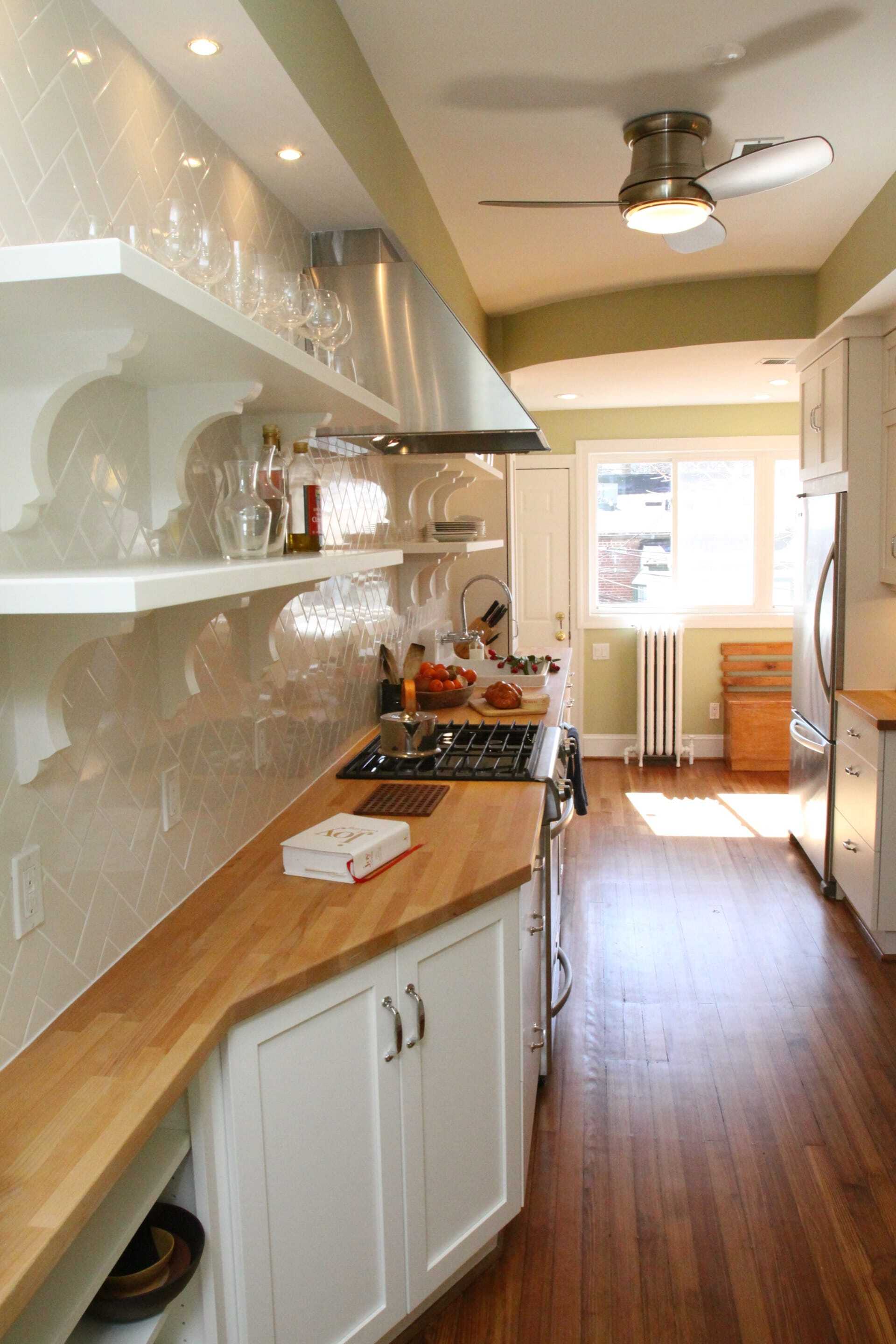 The footprint of the original kitchen was galley style, similar to most of the row houses in the neighborhood. At some point someone had converted the old screened porch at the back of the house into living space, which served as a sort of breakfast nook at the back of the kitchen. It was not well integrated however, and looked more like an afterthought. One popular option for these narrow kitchens is to remove the wall between the kitchen and dining room to create an open kitchen that flows into the adjoining room. The homeowners were not interested in this – they wanted the kitchen to be its own separate space (in the galley format), but we needed to find a way to alleviate the cramped feeling. This was achieved by installing custom open shelves (as opposed to upper cabinets) with accent lighting at the main wall, and extending the kitchen around the corner of the breakfast nook to include a hidden coat closet. Because the ceiling at the add-on had been bumped down for HVAC ducts, we designed a curved soffit that made the transition look deliberate. The backsplash was installed in a herring-bone pattern and extended from the counter top to the bottom of the soffits on the main wall.