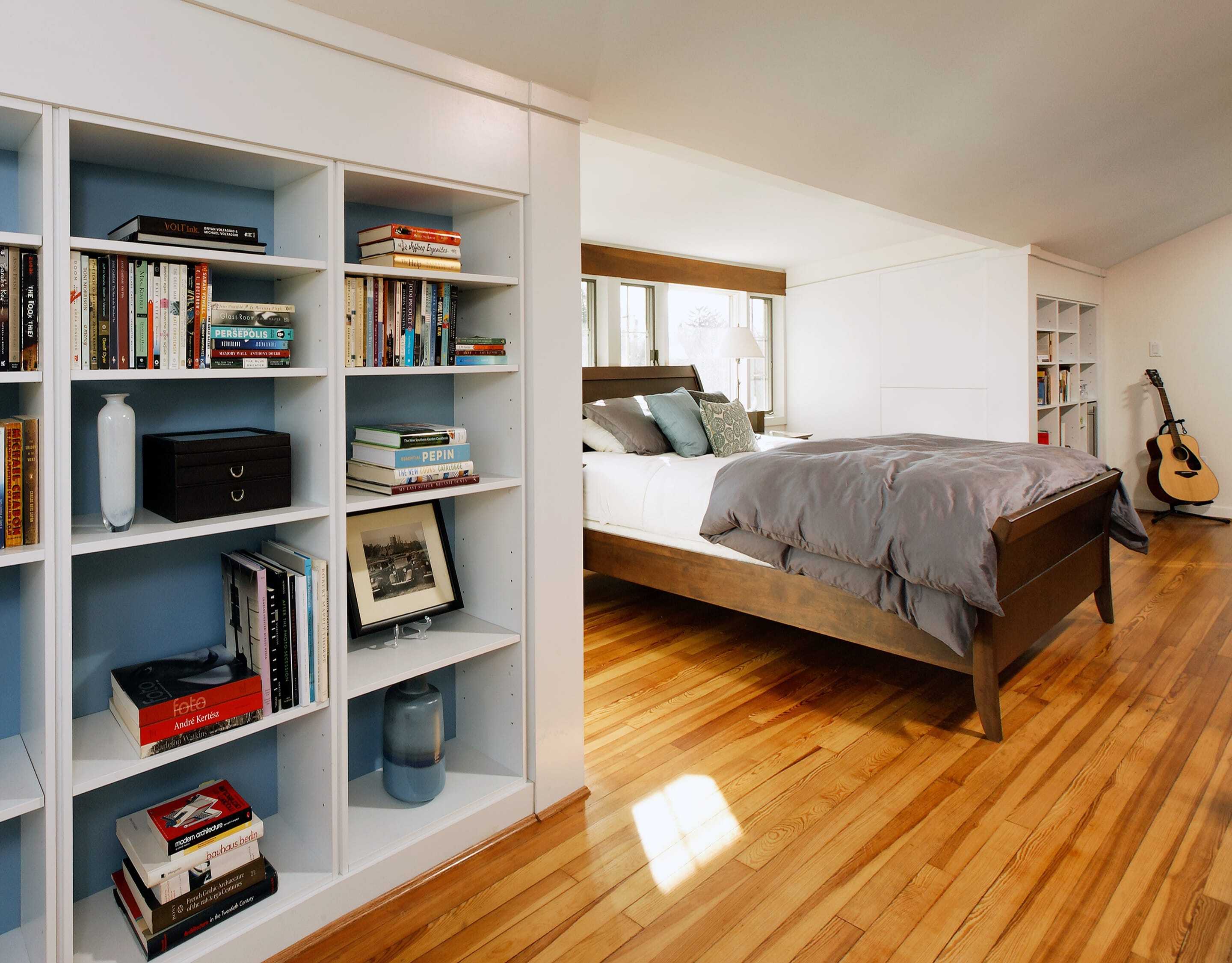 The goal of the project was to create an open, spacious master suite, where the couple would want to spend more of their time. We explored several concepts; one of which looked at the idea of a shower as a pass through from the closet to the bathroom. After several rounds, we settled on a large shower and toilet room separating an otherwise open bathroom from the closet. The bed changed location to allow the clients to take advantage of better sight lines; from the bed, the house feels like it is in a forest because of the trees surrounding it. We also added a reading area with a coffee center and beverage fridge, and custom shelving for books with hidden suitcase storage behind them. The TV swivels so as to be visible from both the bed and the seating area.