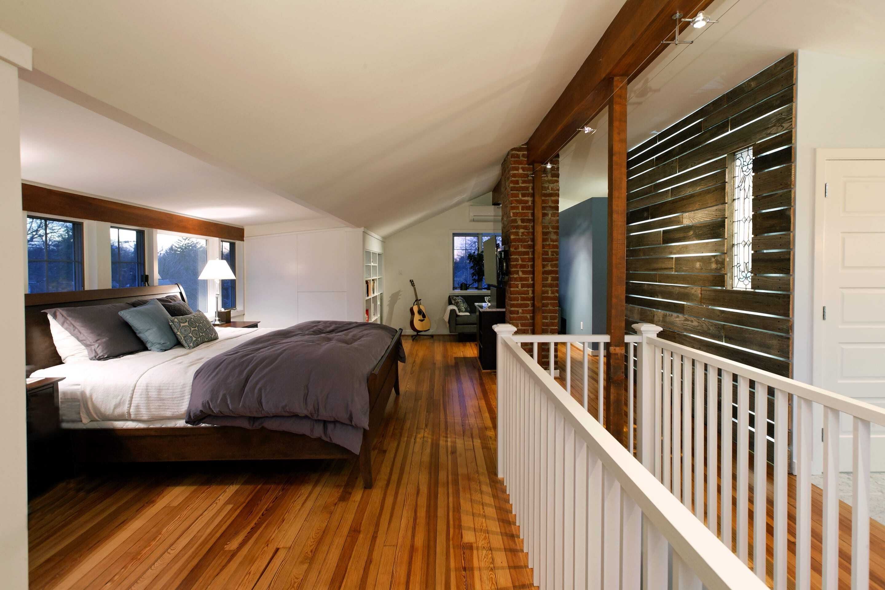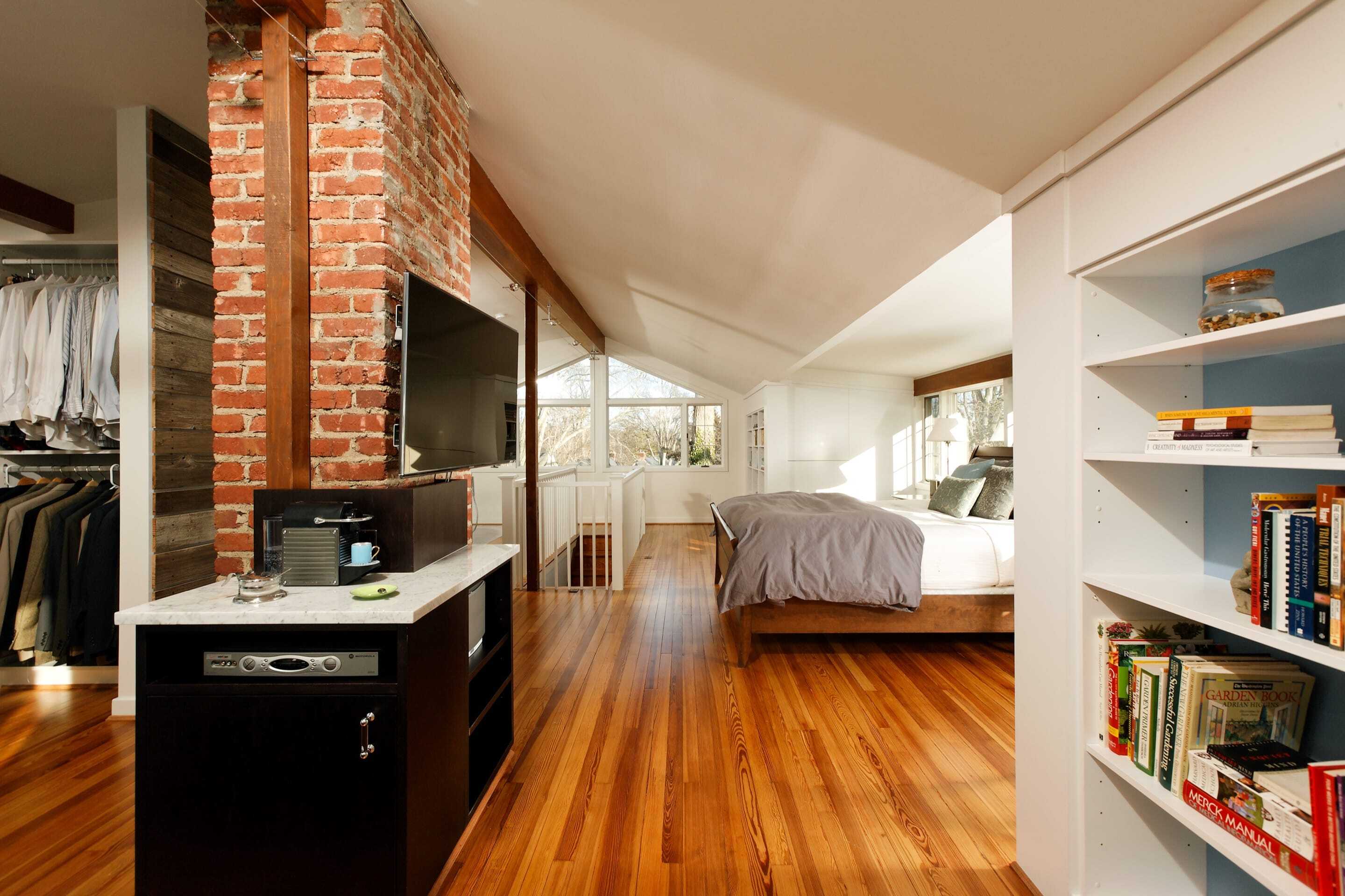 When the clients approached us about remodeling their attic into a master suite, they had been living in the house for several years. After interviewing five other firms, they settled on Four Brothers, and we began to document the existing space. The attic had one redeeming quality – the heart pine floors. Other than that, it was a dark, dated room with a kitchenette and tiny bathroom.