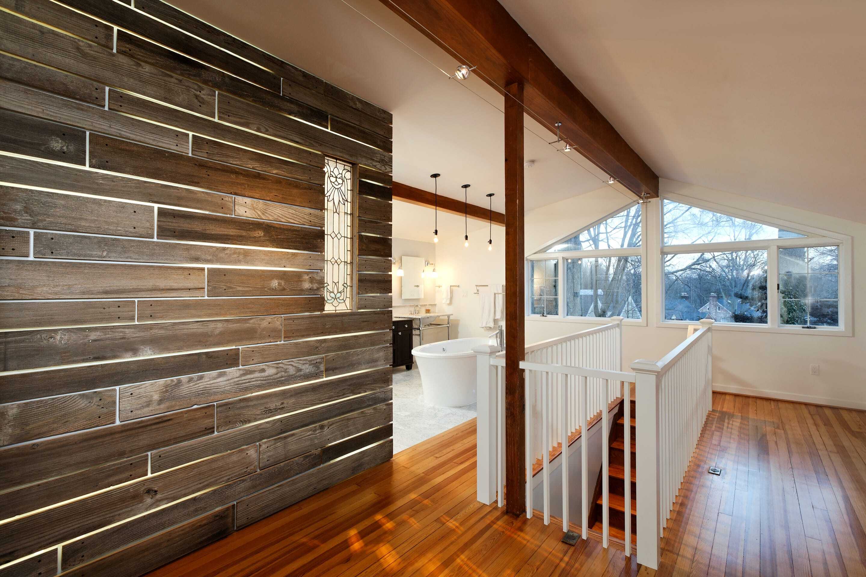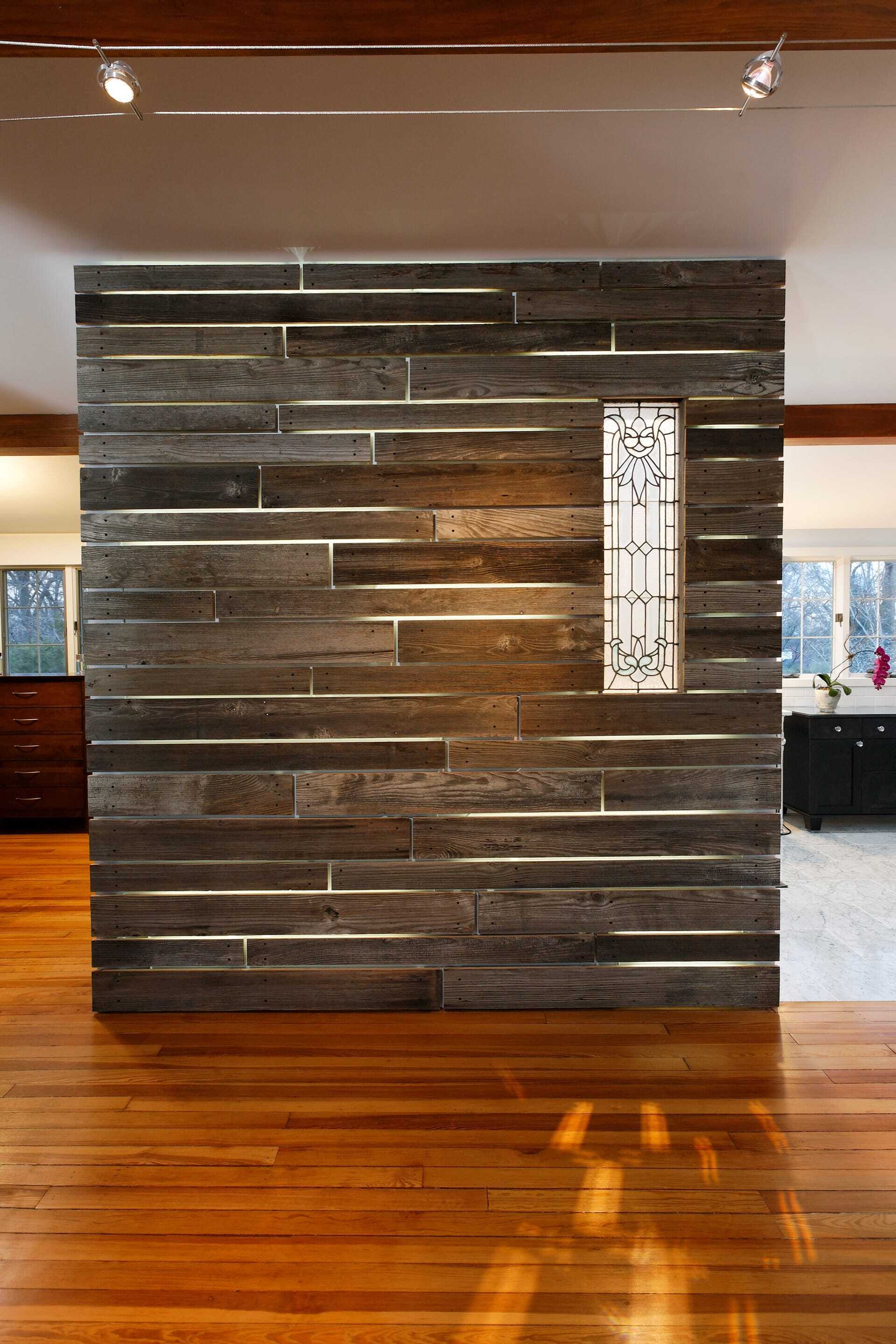 Together with the clients, we settled on an eclectic combination of classic and contemporary for a timeless, clean look. A salvaged wood wall from West Virginia and a stained glass window from Chicago add texture and interest.