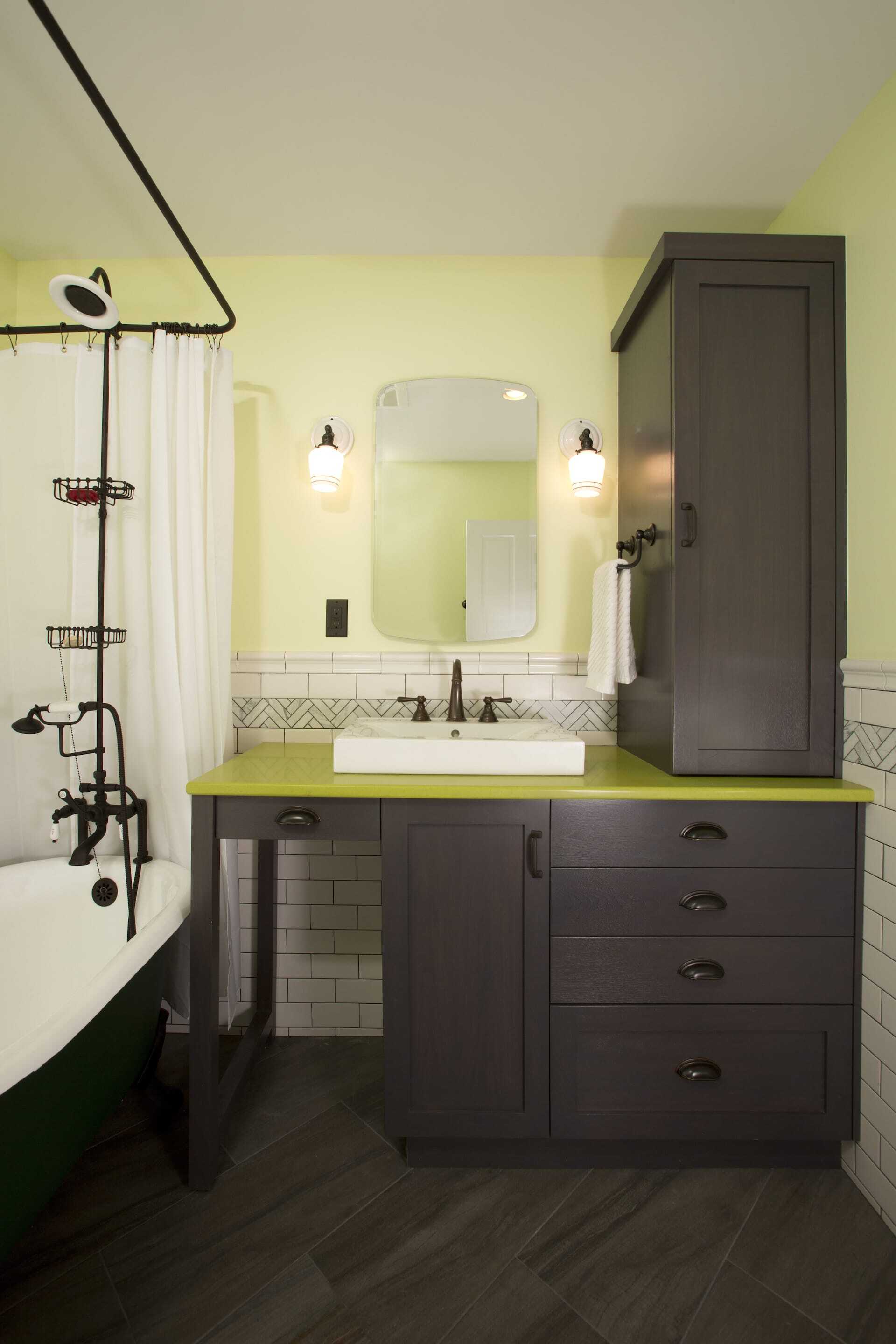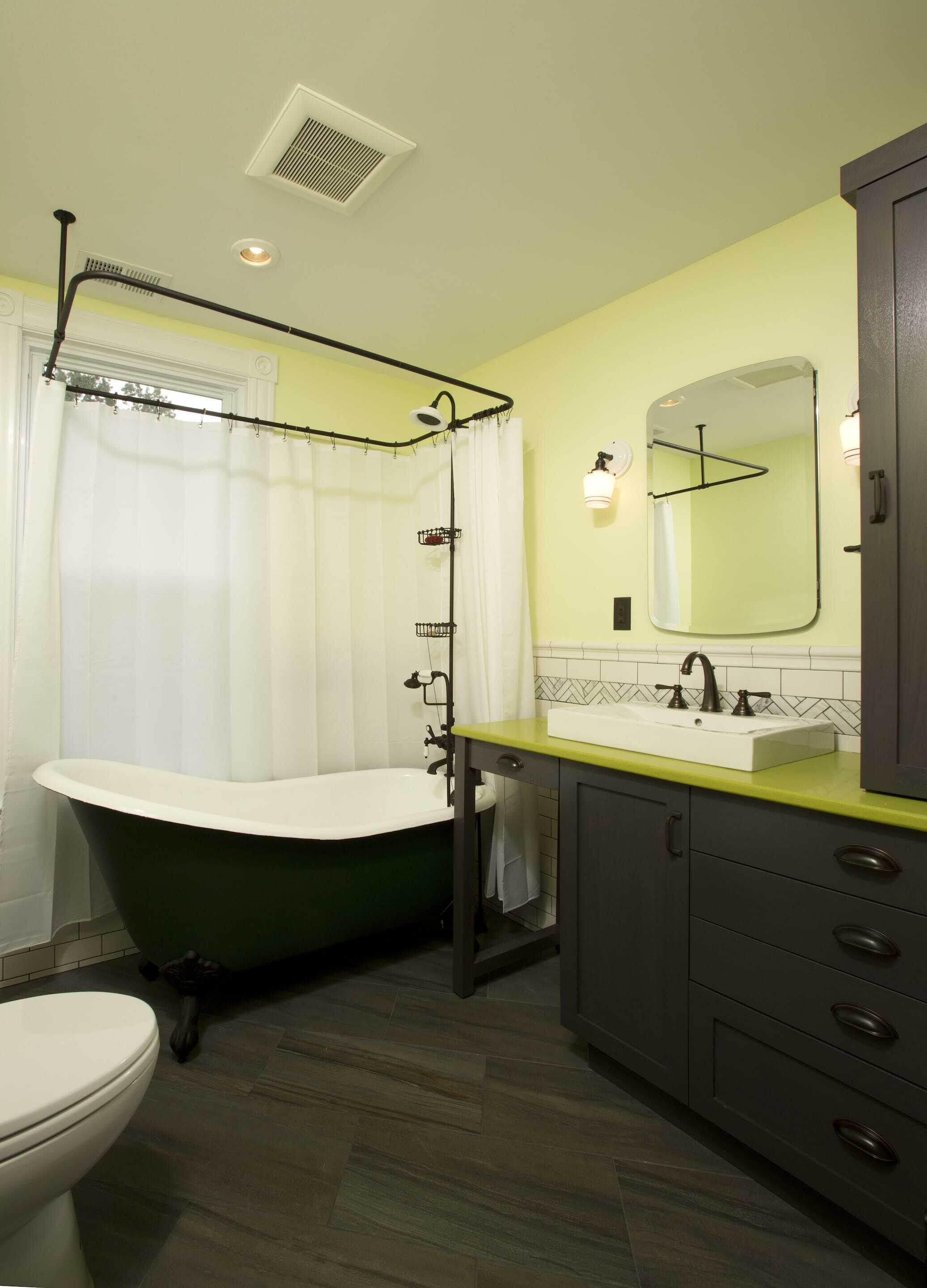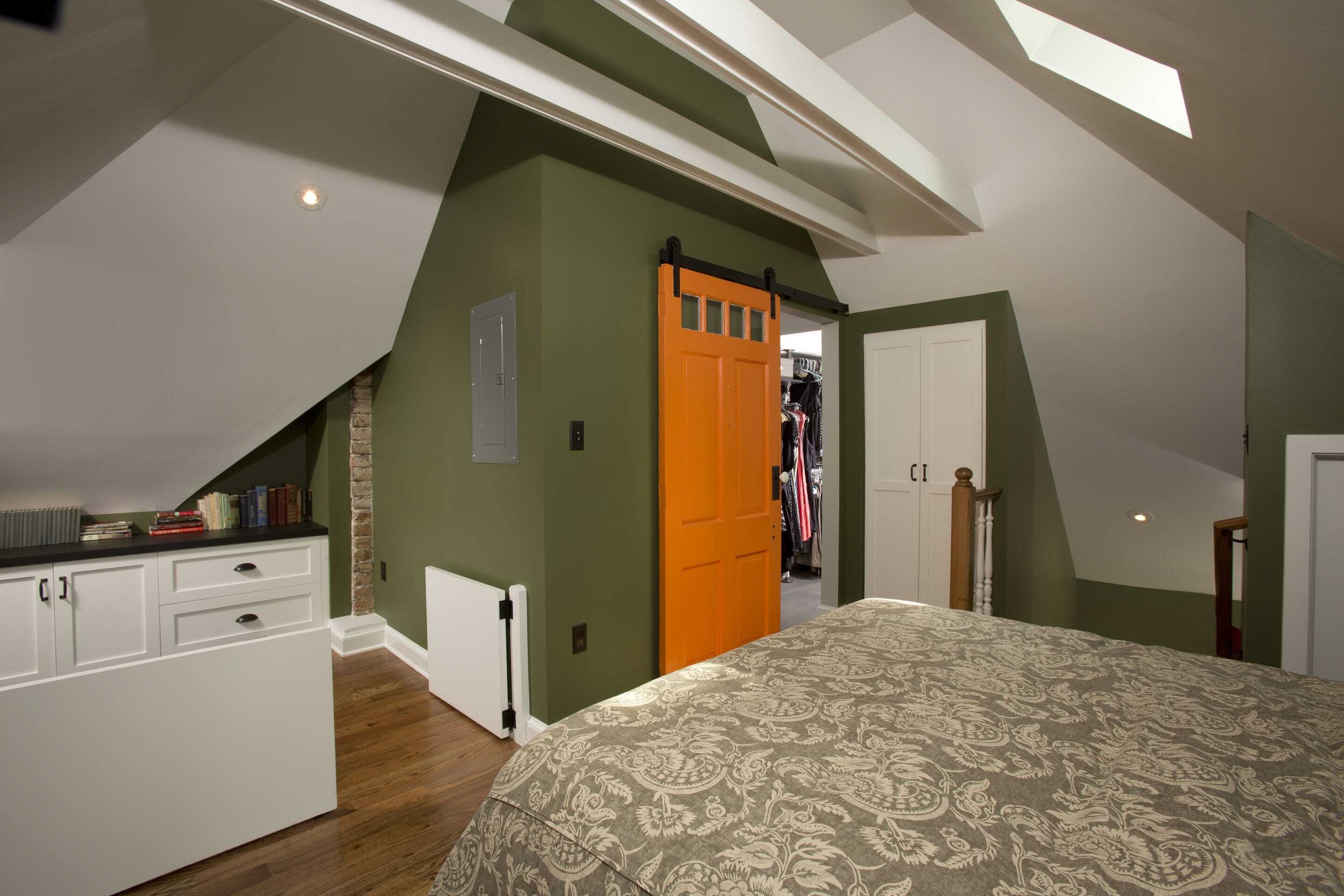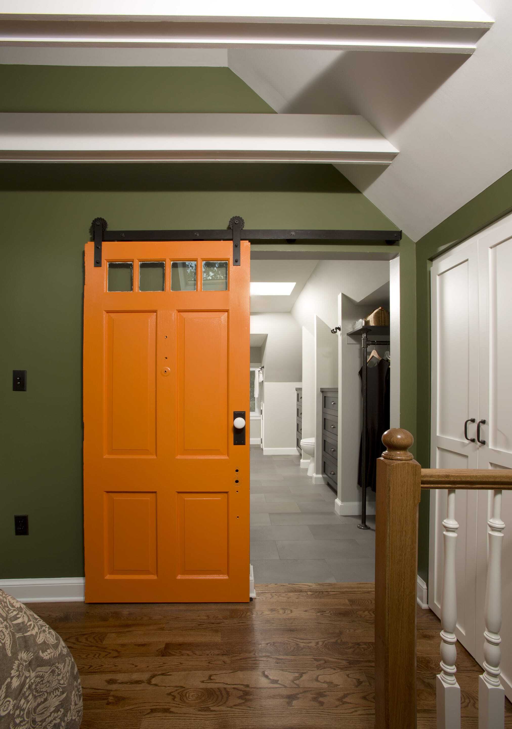 Just as it had been during the kitchen renovation, selecting fixtures and finishes was an exciting prospect. Much as in the kitchen design, the homeowners wanted the aesthetic of the second floor bathroom to honor the period in which the home was built. Selections included subway tile with a traditional chair-rail cap and marble herring bone accent strip, oil-rubbed bronze fixtures, a claw-foot tub, push-button light switches and dark wooden cabinetry. The custom green finish on the tub and Apple Martini Caesarstone countertop add a touch of fun. The master suite is separated from the rest of the home, which presented some flexibility to deviate from the traditional theme of the floors below. The starting point was a Brockway sink from Kohler, which was mounted on a custom steel vanity. Since none of the faucets compatible with this particular sink are produced with an oil-rubbed bronze finish, we shipped the chrome faucets to California to be custom plated – consistency between the shower and sink fixtures was important. A combination of wood grain and white porcelain tile were installed in the shower, along with a sleek linear drain. Paperstone countertops were used for the cabinetry and bathroom vanity, with matching honed granite for the shower bench and niches. Lighting was important, so a combination of recessed and pendants were included in the design, along with accent lighting that was installed on top of the decorative beams in the bedroom. The orange accent paint on the bathroom door (rescued from a local salvage yard), makes the master suite “pop” when you walk up the stairs.