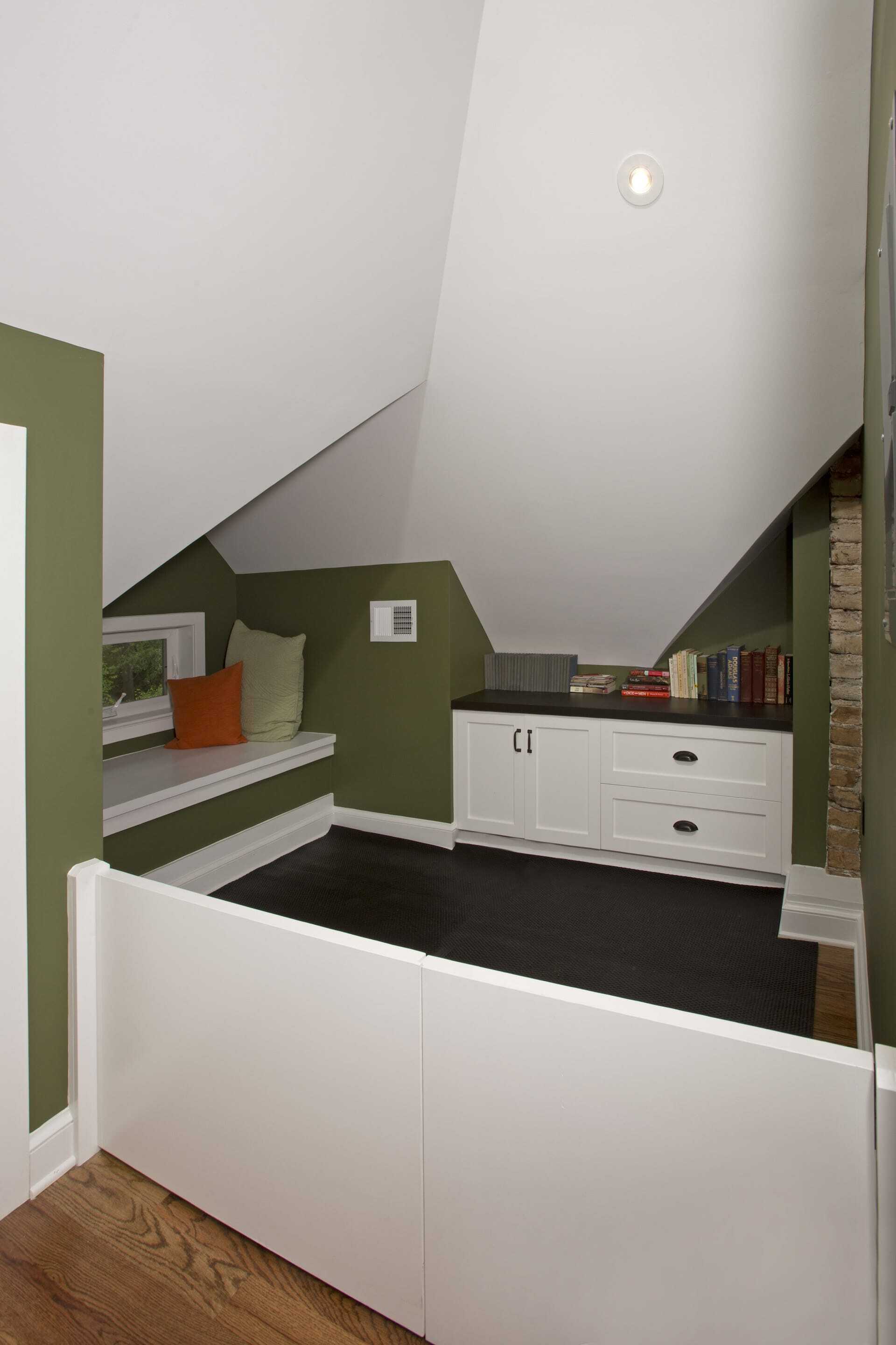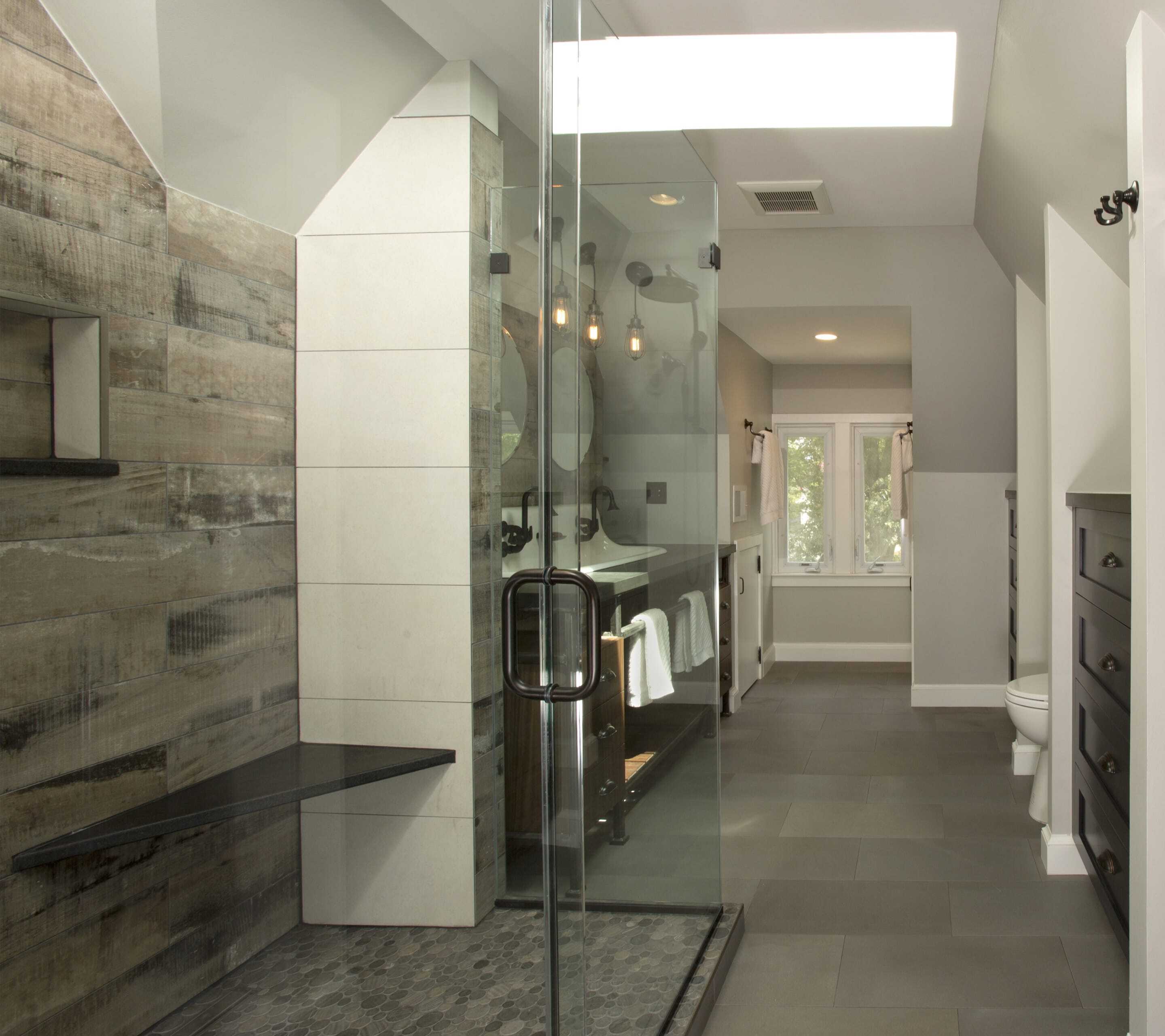 Our clients had very clear ideas for the elements to be included in the design of the new master suite: a spacious bathroom to include two faucets, built-in storage, a large walk-in shower and some privacy at the commode. It was important to maximize clothing storage (both hanging and concealed), and adding natural light was imperative. Finally, there needed to be a designated sitting area that could double as a secure home for two pet ferrets. Looking at the attic floor plan on paper, the space appeared large, but our project architect quickly realized that the floor plans were deceiving. The converging roof angles and required height clearances for living space posed a challenge to incorporating all the clients’ requests. After presenting several options, we settled on the floor plan with the largest bathroom, to include an open closet at an existing dormer. The ceiling throughout the master suite was vaulted to open the space, skylights were added in the bathroom and above the bed, and storage carved out of every space available. At the second floor bathroom, the tub was turned to sit under an existing window, the commode moved to the opposite side of the room, and a vanity with storage above the countertop installed.