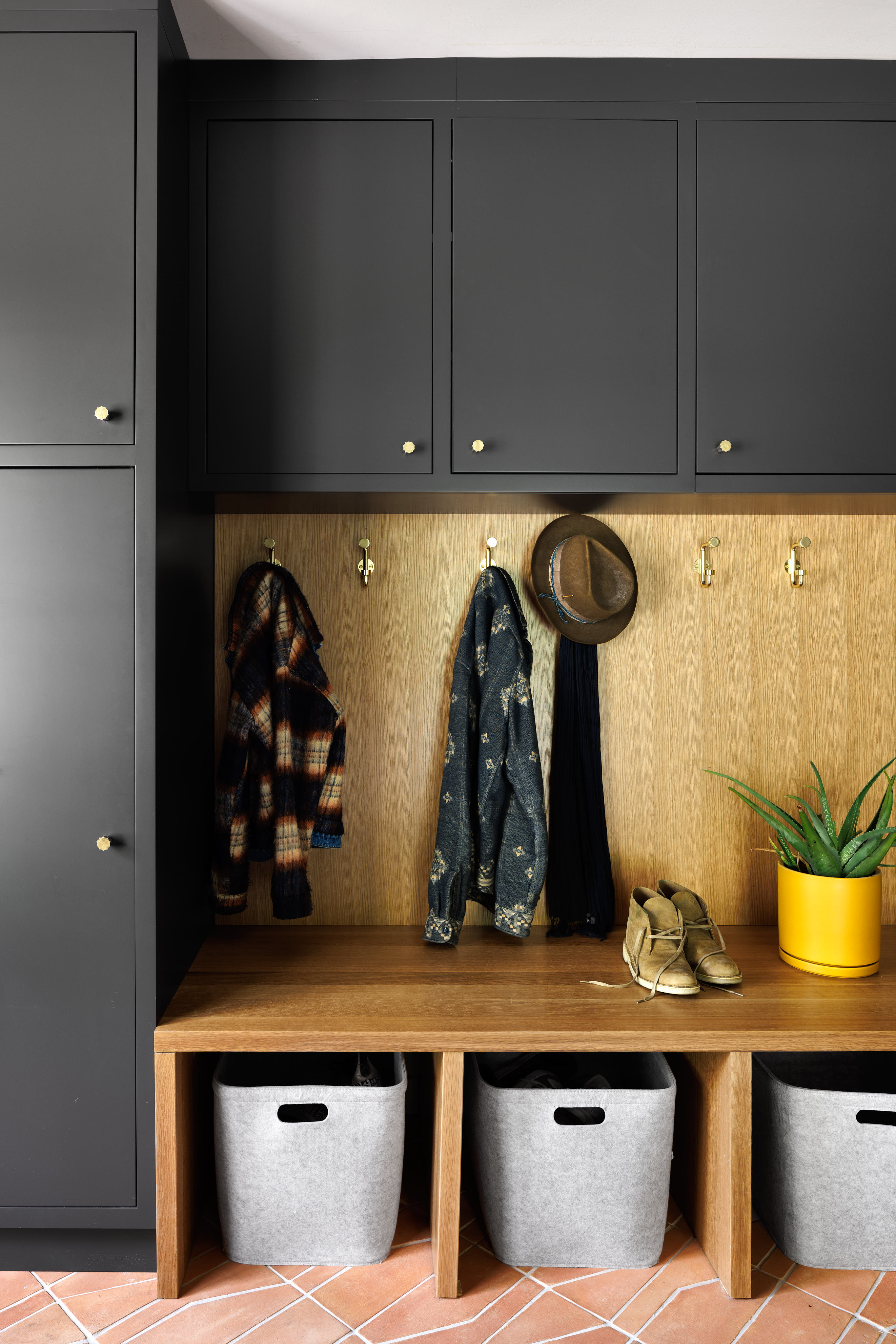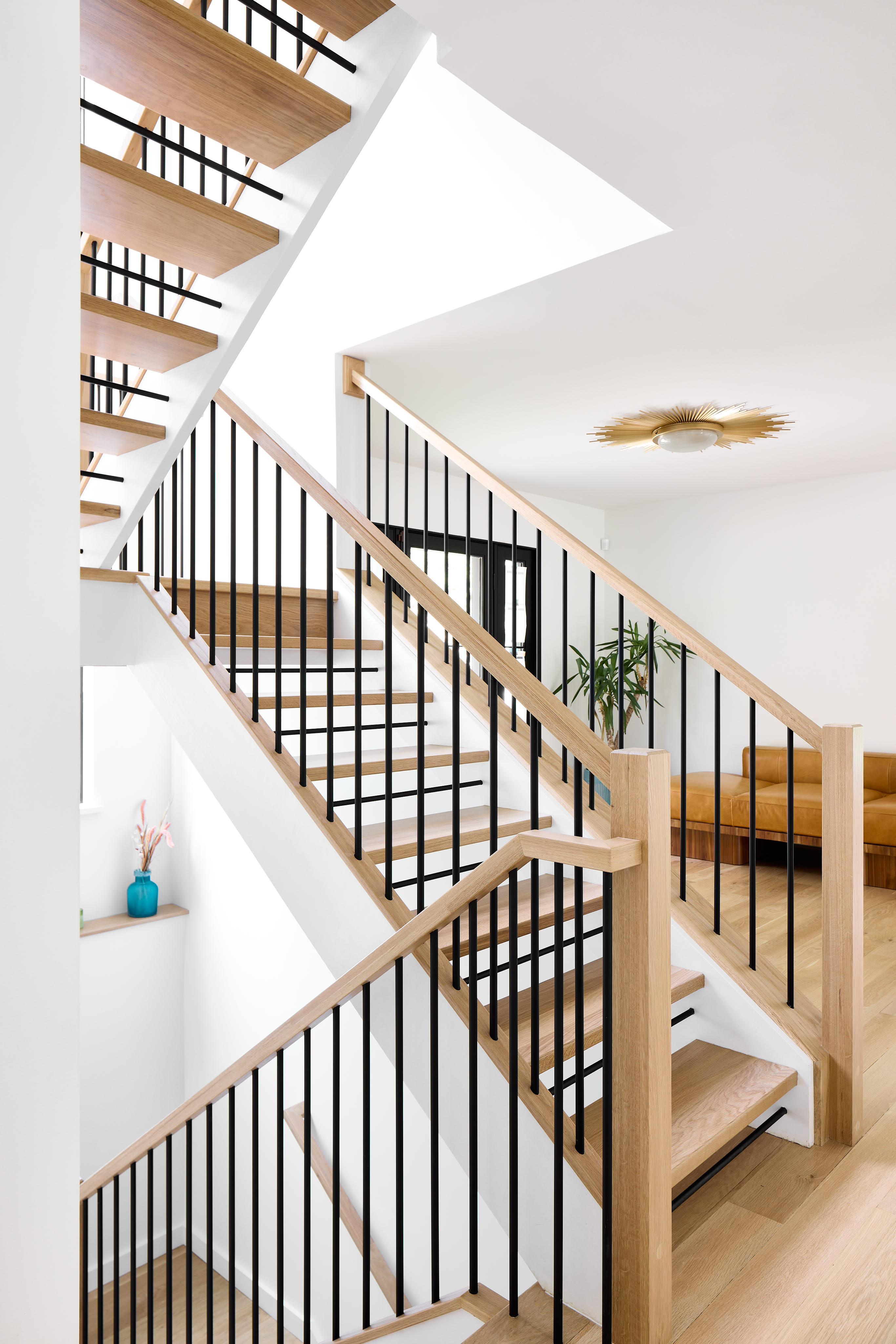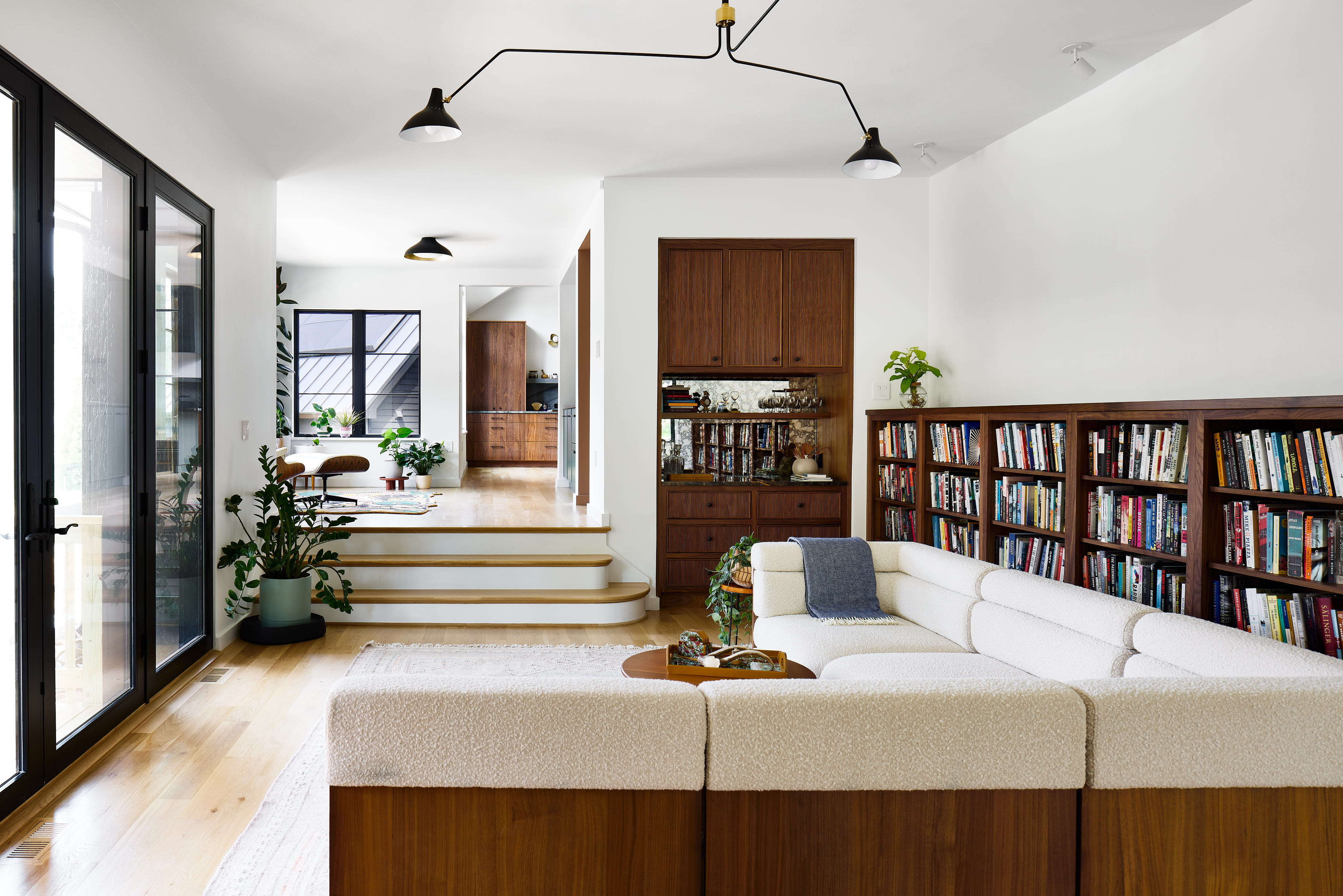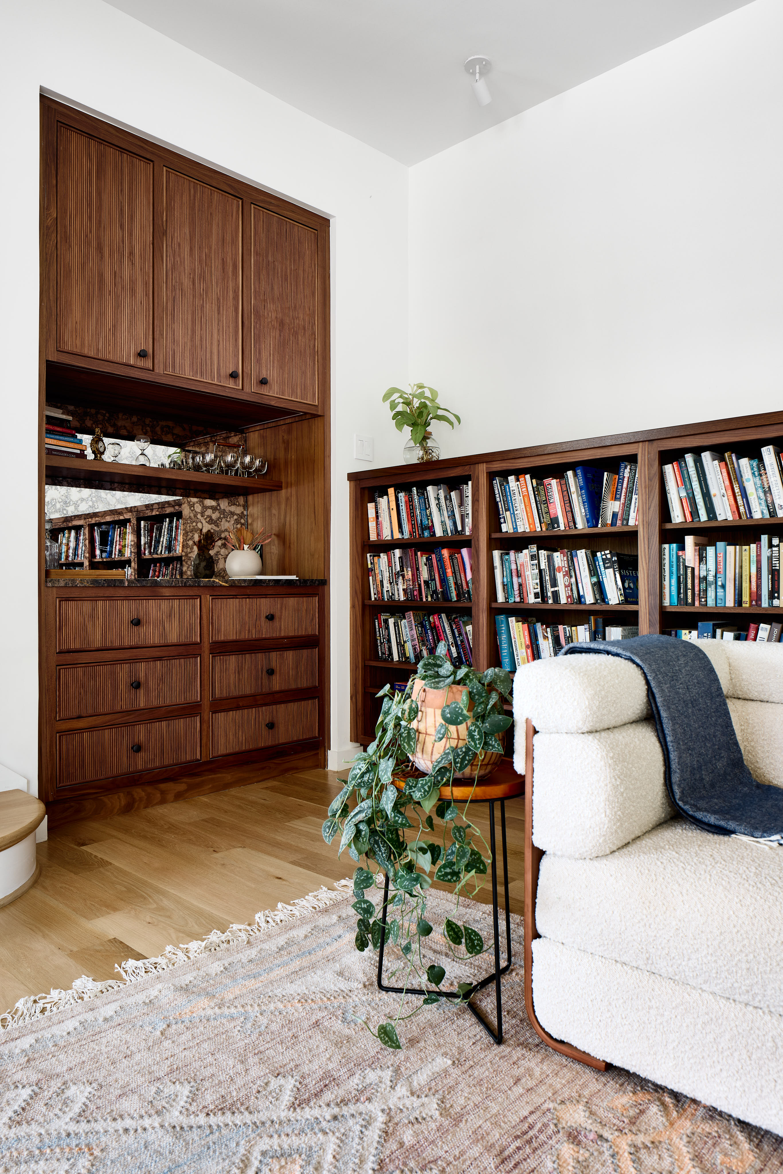 On the first floor, our clients requested larger functional rooms, so we reorganized the butler’s pantry, washroom, and mudrooms to capture more space. On the other side of the house, we needed to address some structural issues left behind from the original construction, shoring up an exterior den wall to replace water-damaged floor joists, and weather-sealing the foundation to prevent further ingress. In the kitchen, we expanded their storage areas and in the living room, we found space to highlight their art collection above a set of custom-built walnut bookcases.