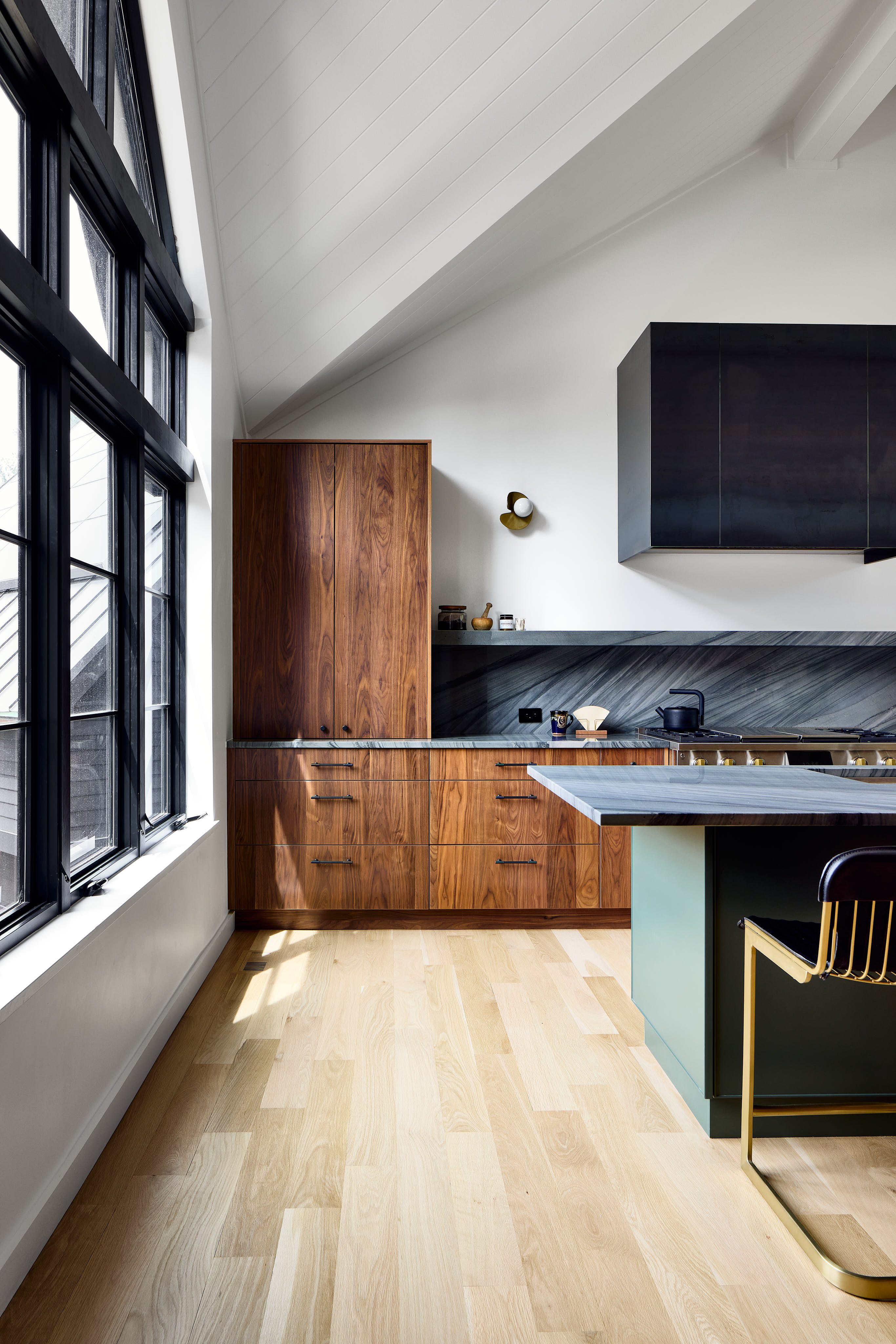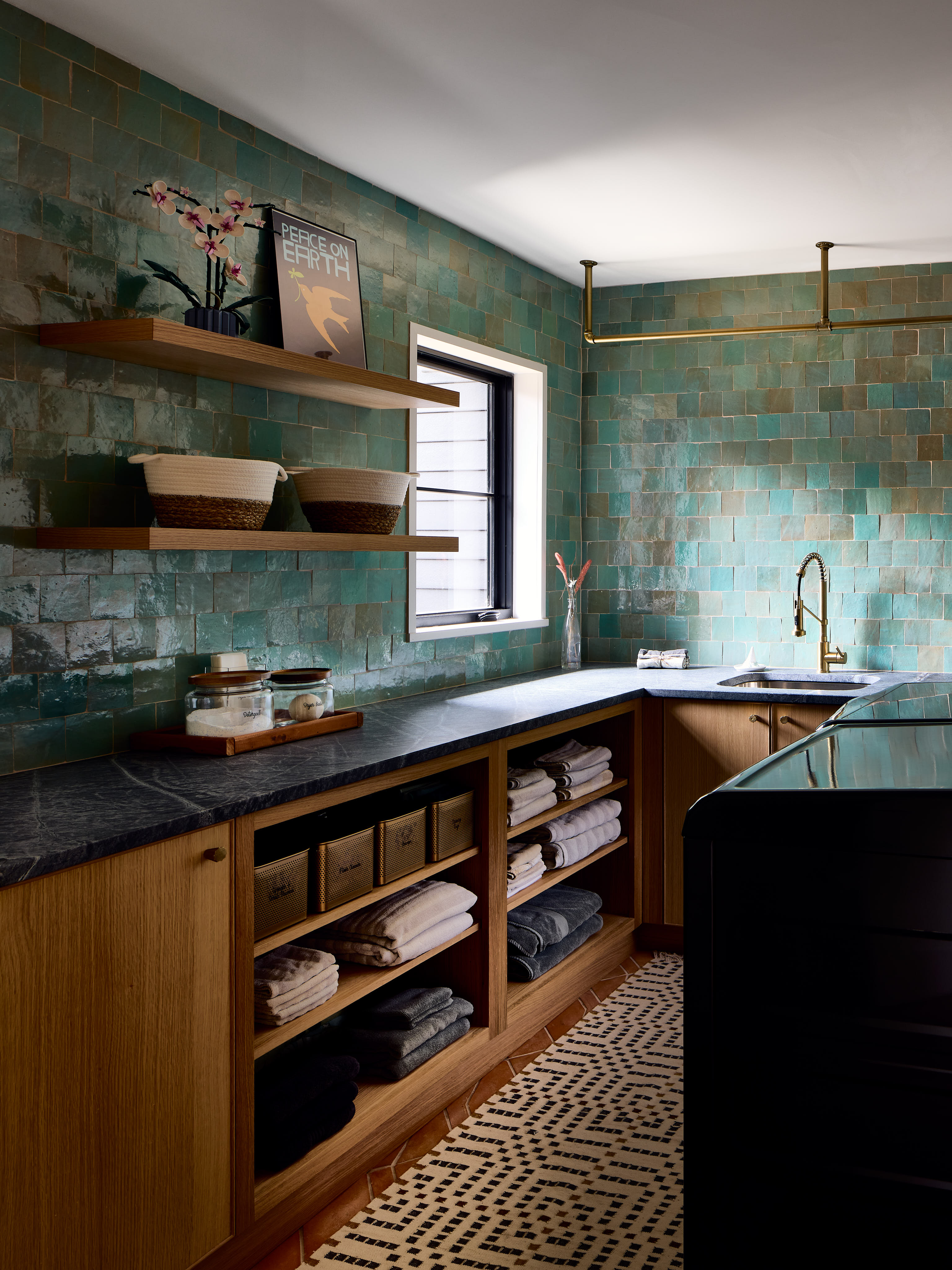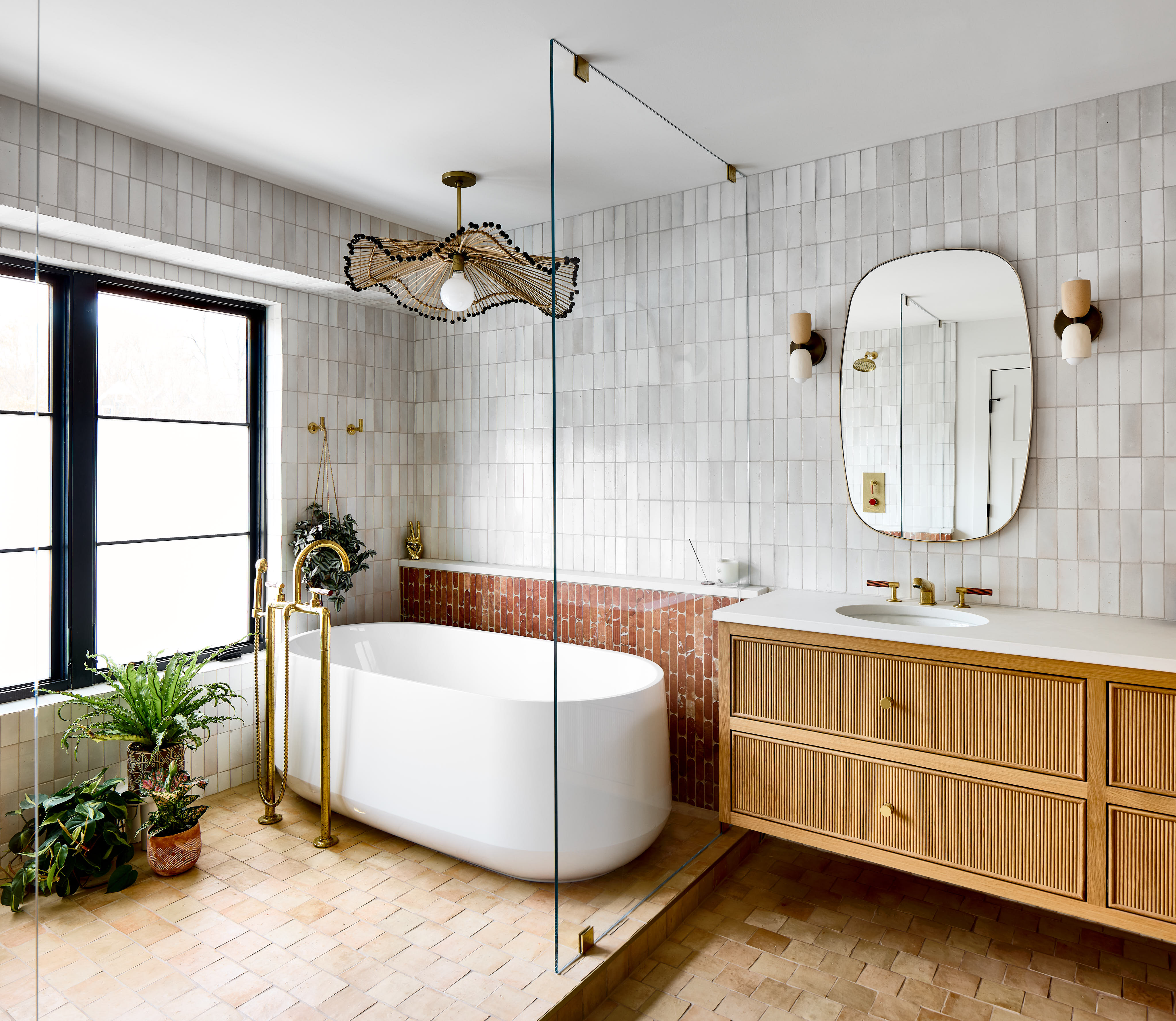To fit our client’s modern aesthetic, we wrapped their kitchen in clean custom cabinets, with a walnut-accented island. Monogram appliances and Quartzite countertops add beauty and functionality to the space, while the high ceilings create an open and airy feel, completed by the two-story farmhouse peaked windows on either end. In the laundry and mudrooms, a terracotta floor tile lends a comfortable warmth, carried up with white oak cabinets and soapstone countertops. The primary bath on the second floor reflects our client’s earth-tone sensibilities as well, with hand-glazed terracotta tile throughout, and a beautiful modern light fixture hanging over the soaking tub on a small dais.