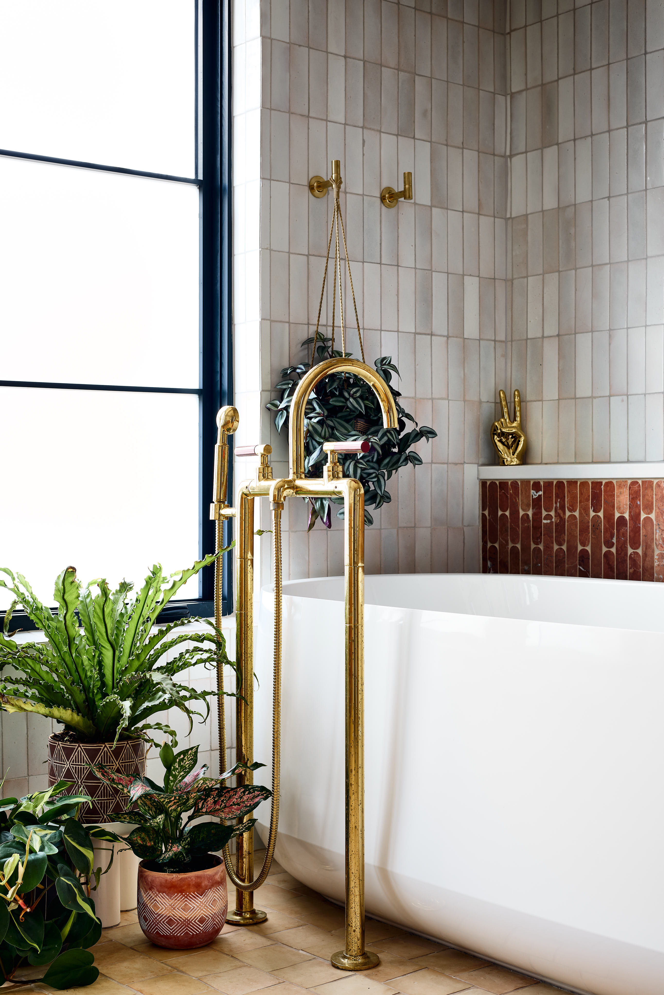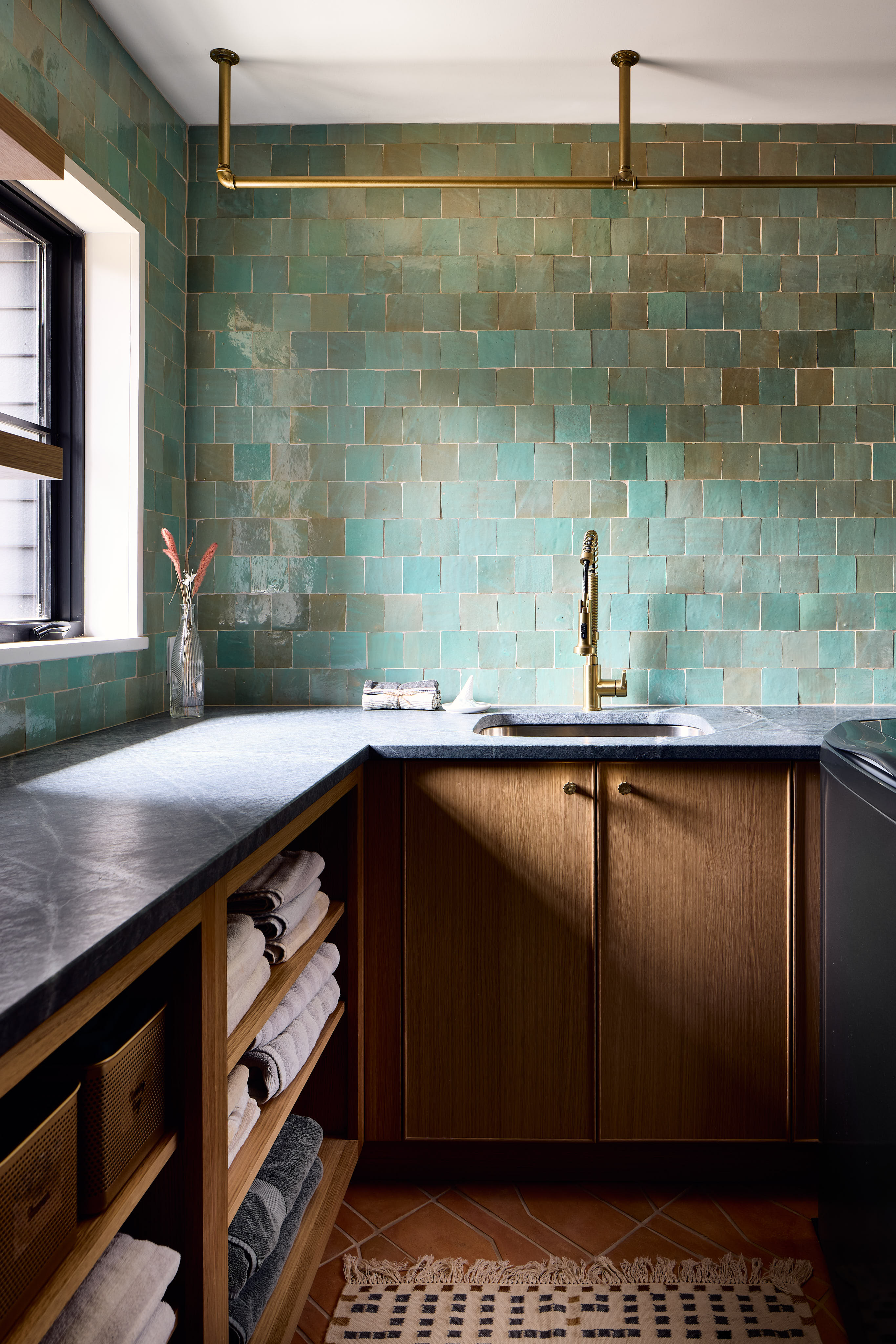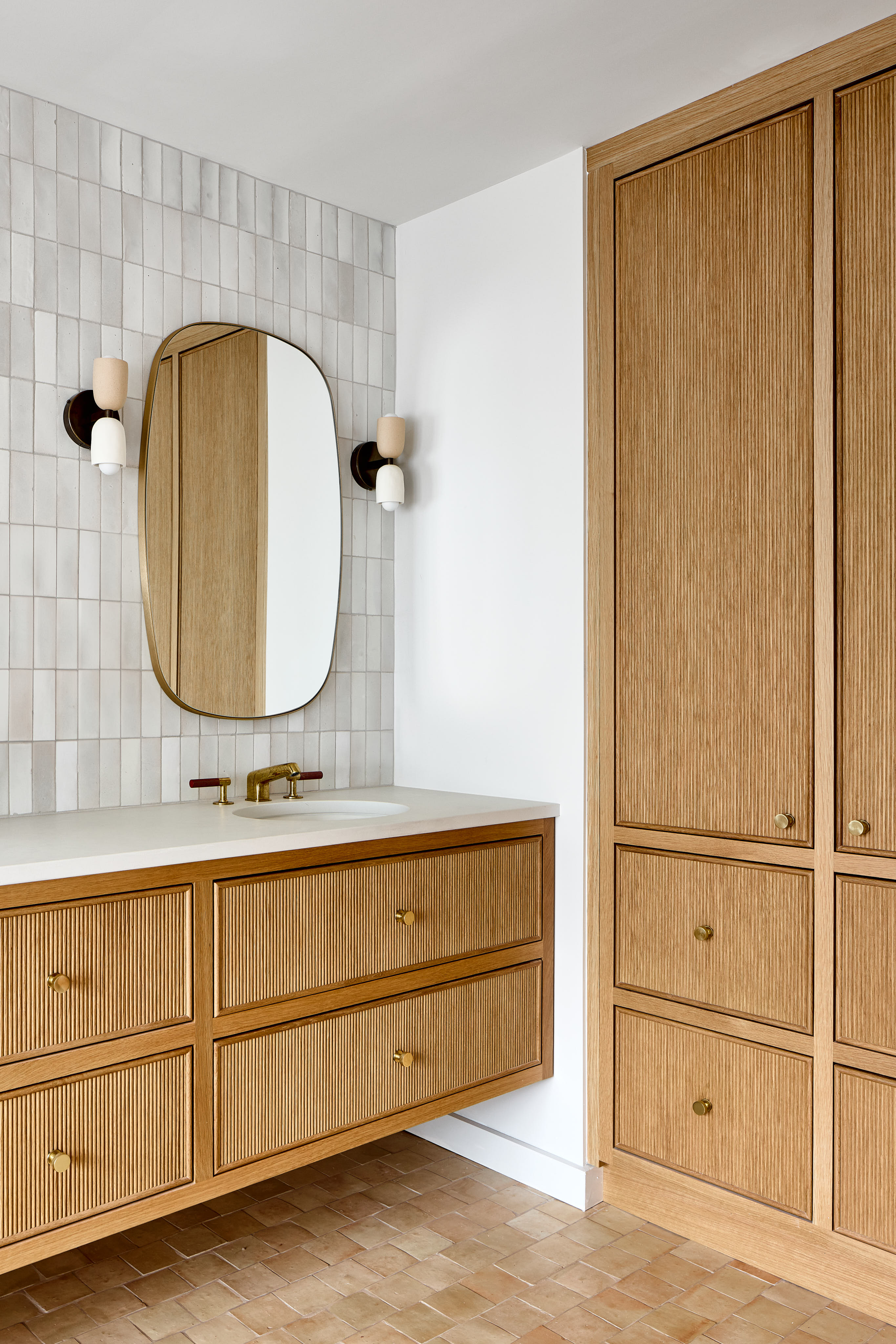 To fit our client’s modern aesthetic, we wrapped their kitchen in clean custom cabinets, with a walnut-accented island. Monogram appliances and Quartzite countertops add beauty and functionality to the space, while the high ceilings create an open and airy feel, completed by the two-story farmhouse peaked windows on either end. In the laundry and mudrooms, a terracotta floor tile lends a comfortable warmth, carried up with white oak cabinets and soapstone countertops. The primary bath on the second floor reflects our client’s earth-tone sensibilities as well, with hand-glazed terracotta tile throughout, and a beautiful modern light fixture hanging over the soaking tub on a small dais.