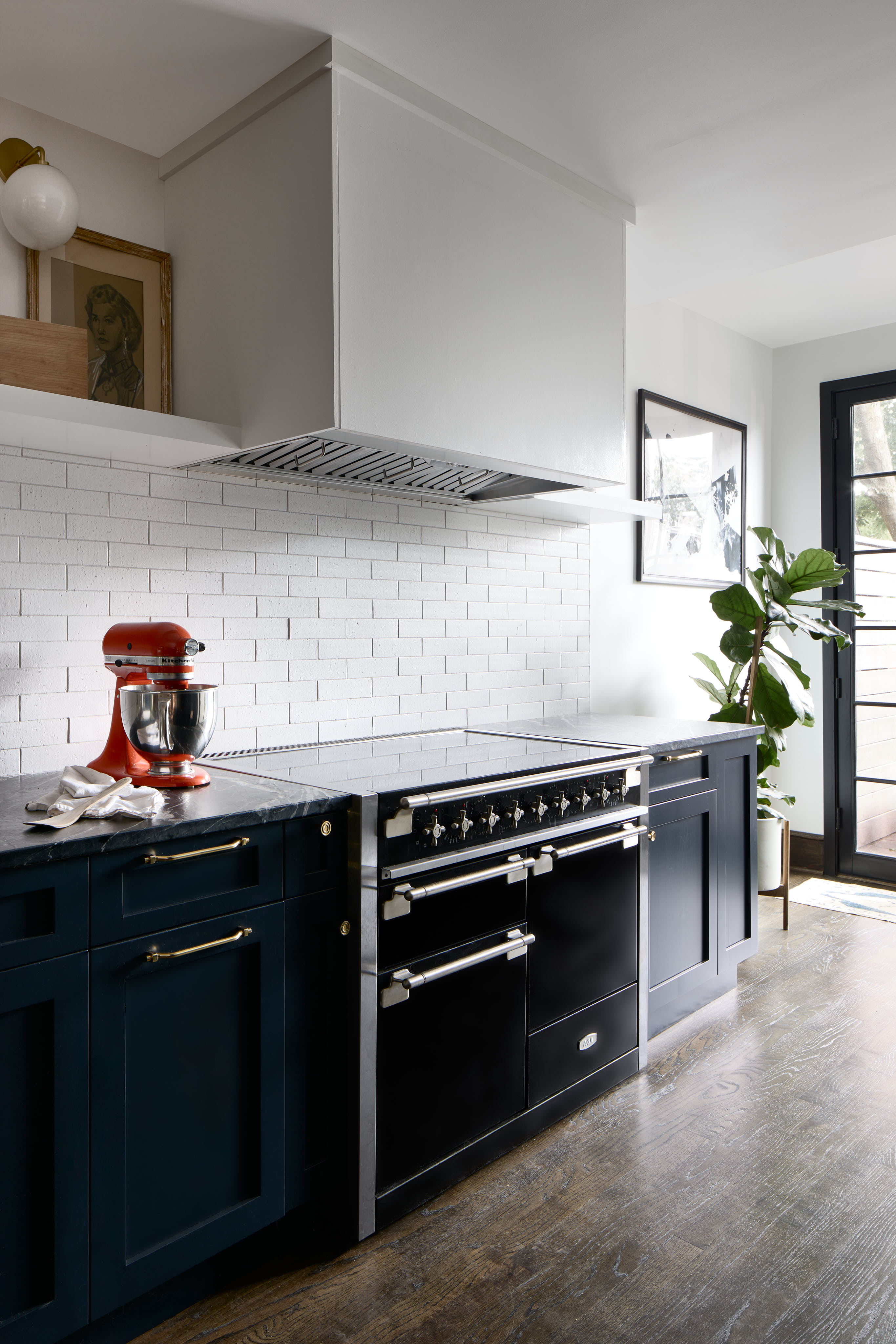 Our clients’ self stated “traditional-eclectic” aesthetic shines through in the finished product. To match their collection of mid-century and traditional furniture pieces and decorations, we selected a classic shaker cabinet from Elmwood in a custom color modeled after Benjamin Moore’s “Soot.” Black leathered soapstone countertops add a soft presence at waist height, and the aged brass hardware play up the vintage look. The mirrored bar adds depth to the space, echoing traditional bar architecture. The range hood was designed and built on site by one of our skilled carpenters.